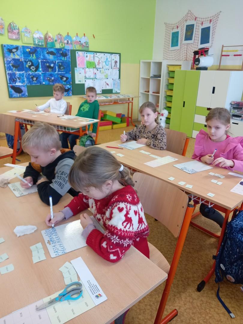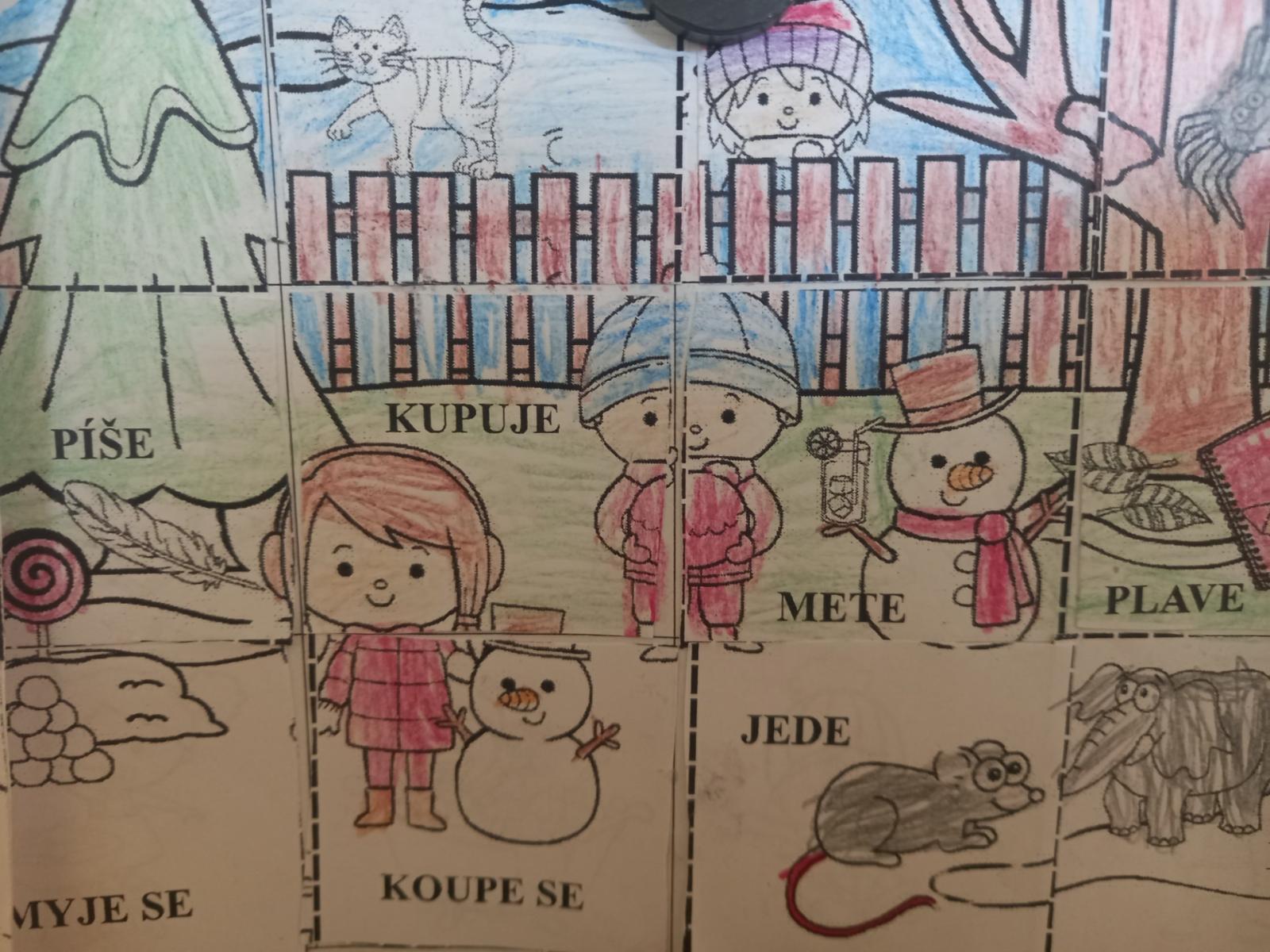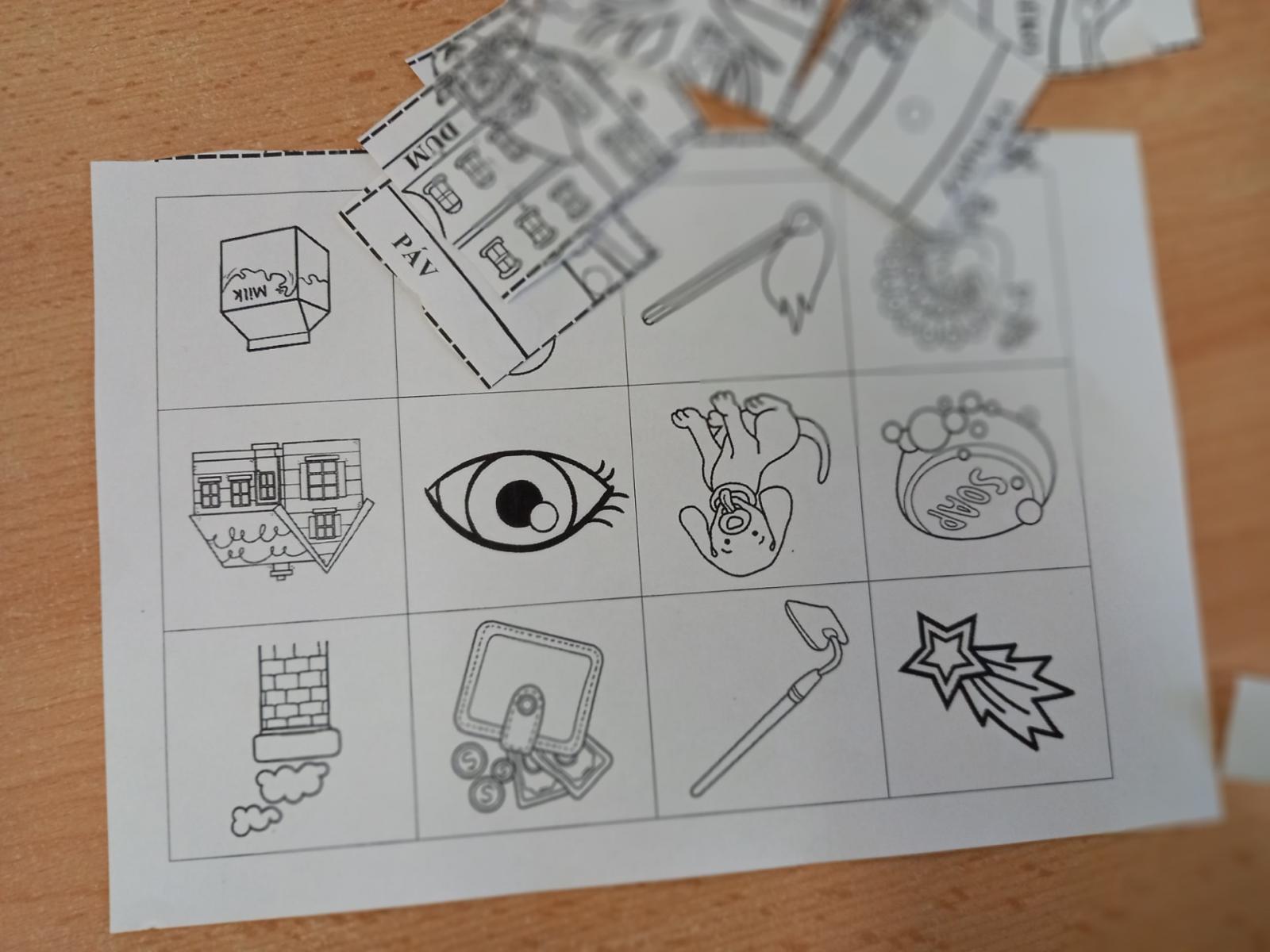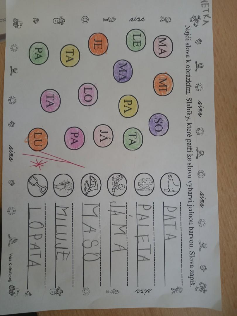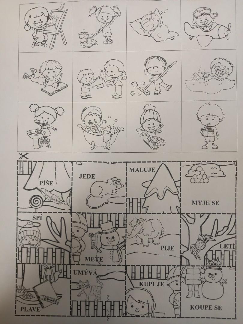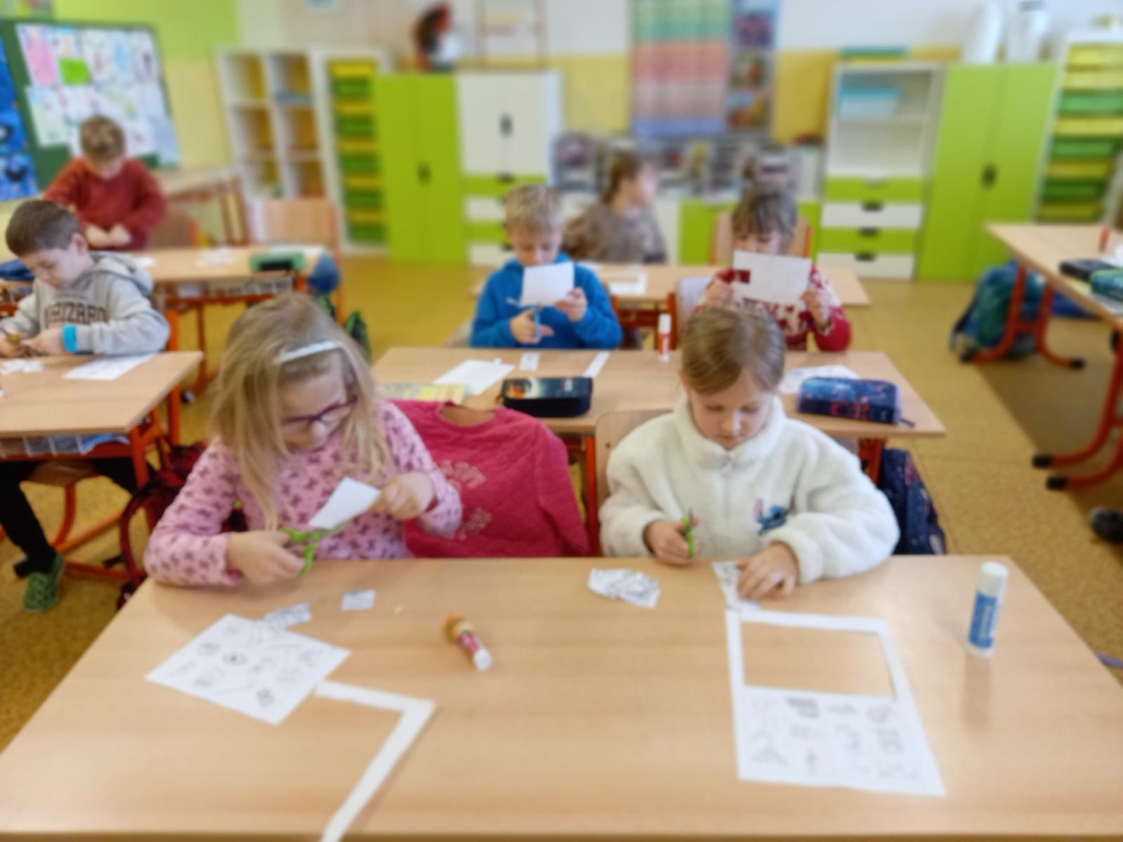 Lepili jsme OBRÁZKOVKY podle slov, skládali, rozkládali slova, opisovali slova, která jsme poskládali. A přitom jsme procvičovali jemnou motoriku. Stříhali, lepili.]