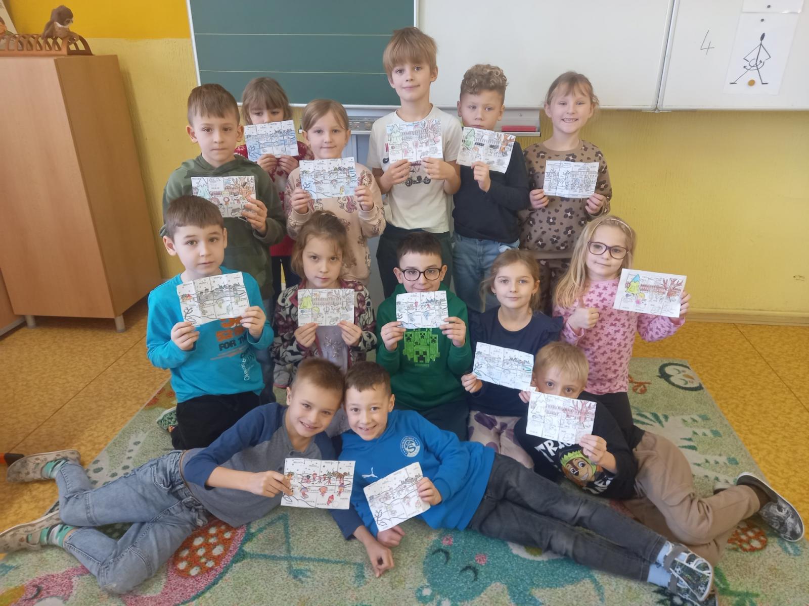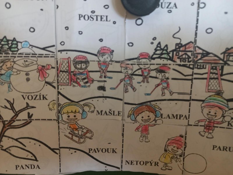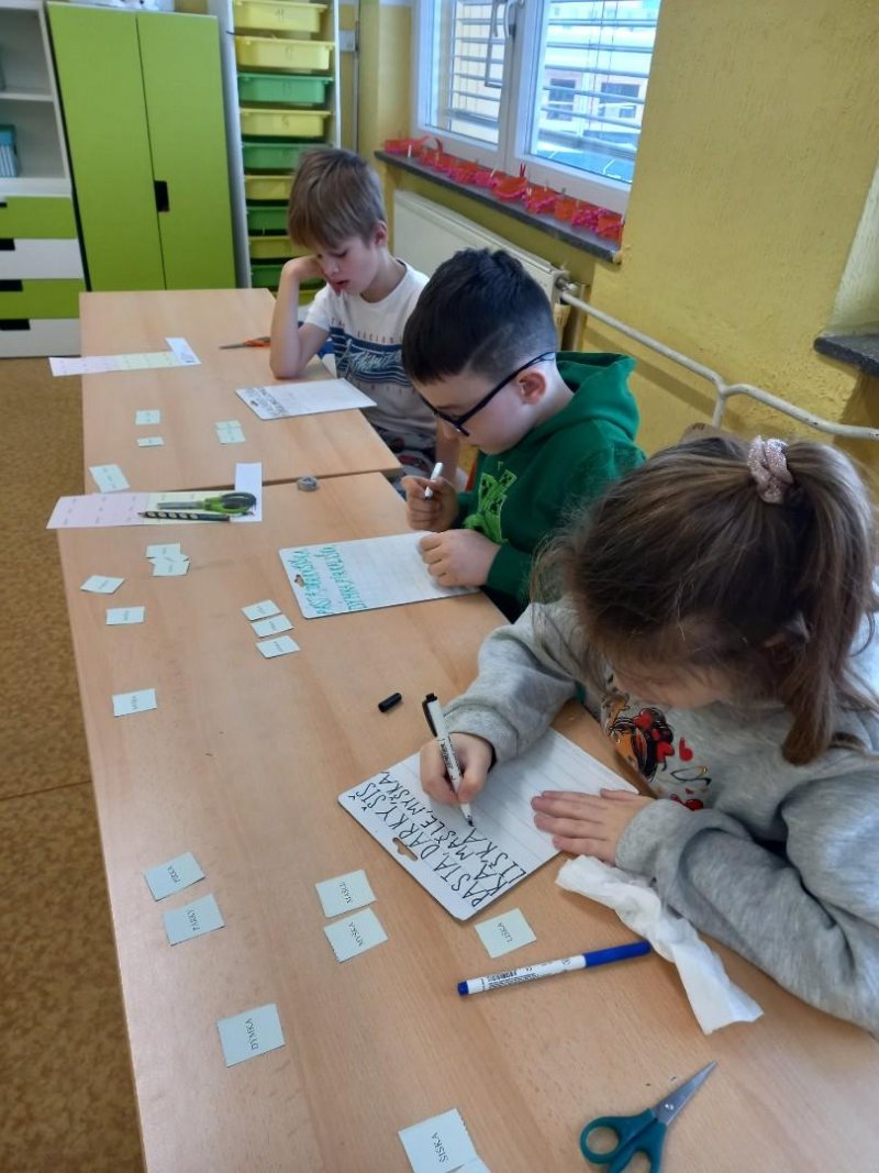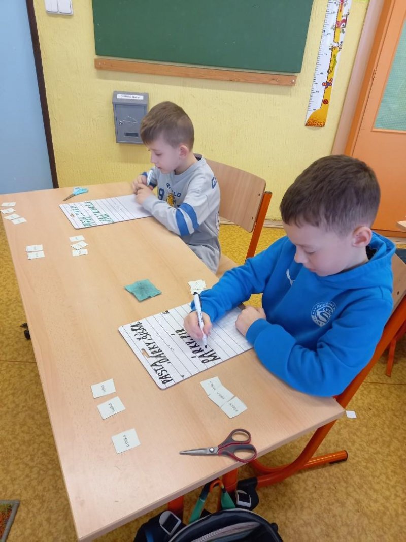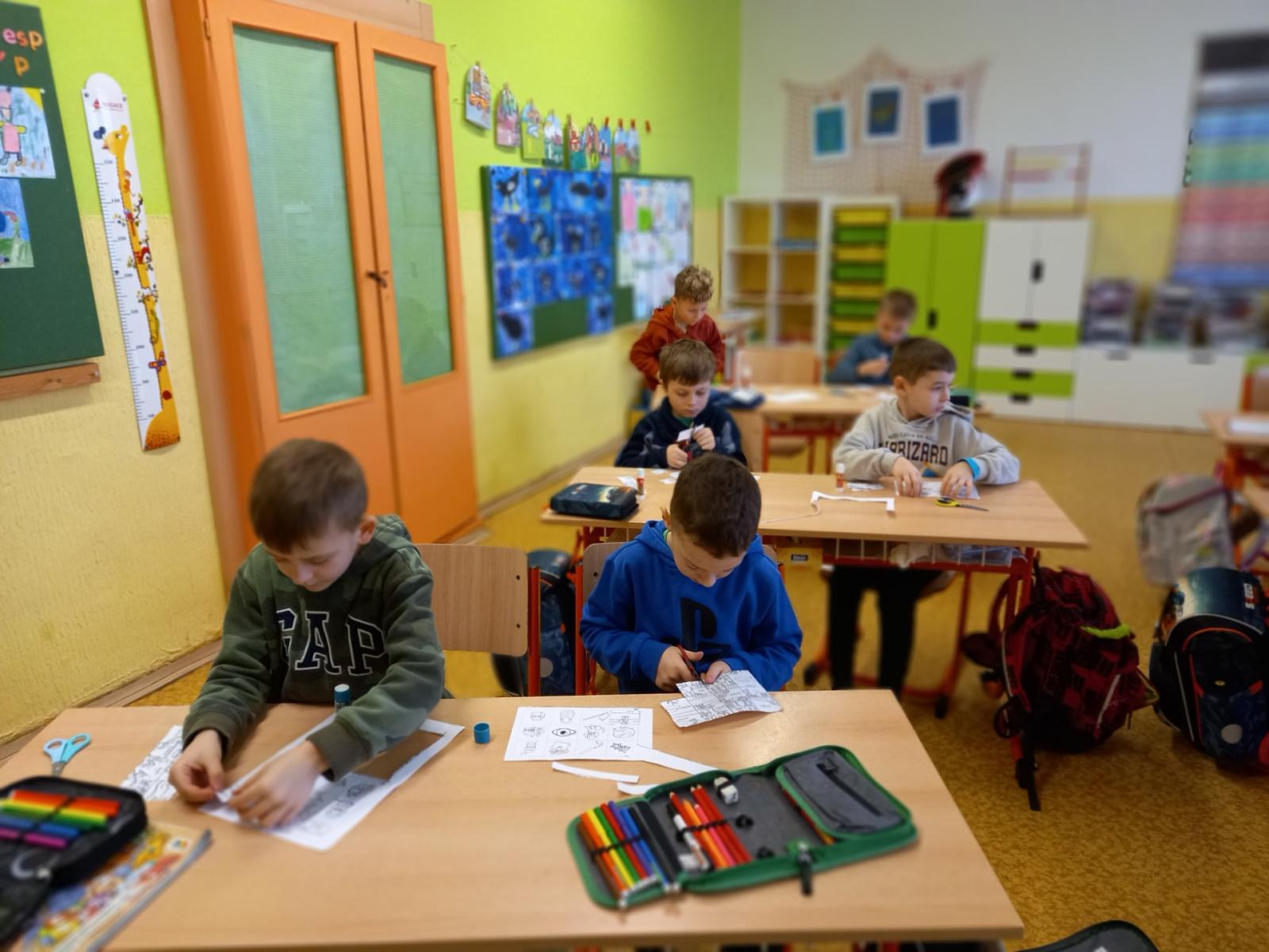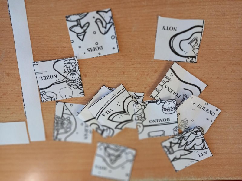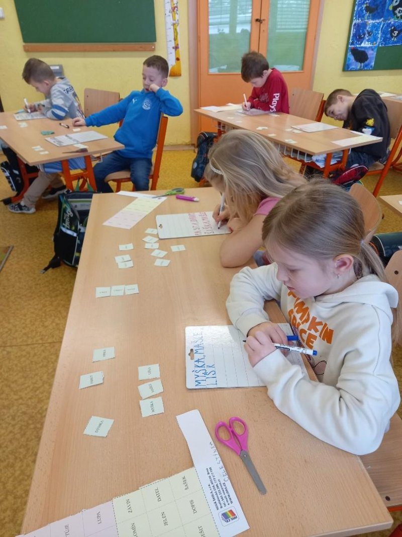 Lepili jsme OBRÁZKOVKY podle slov, skládali, rozkládali slova, opisovali slova, která jsme poskládali. A přitom jsme procvičovali jemnou motoriku. Stříhali, lepili.]