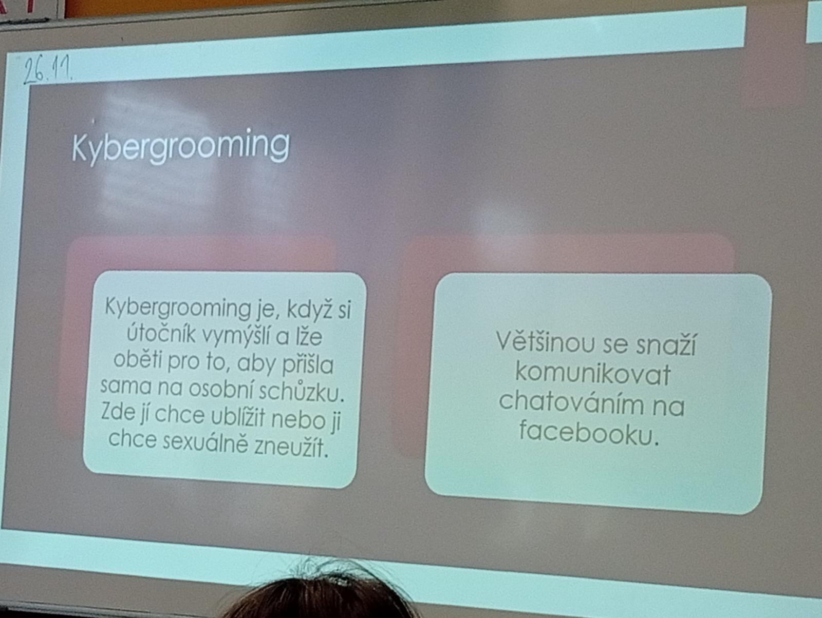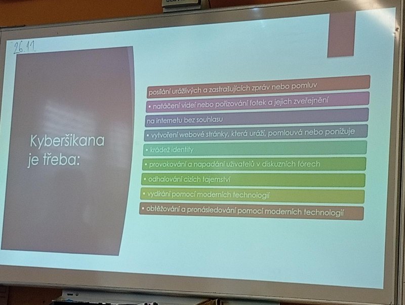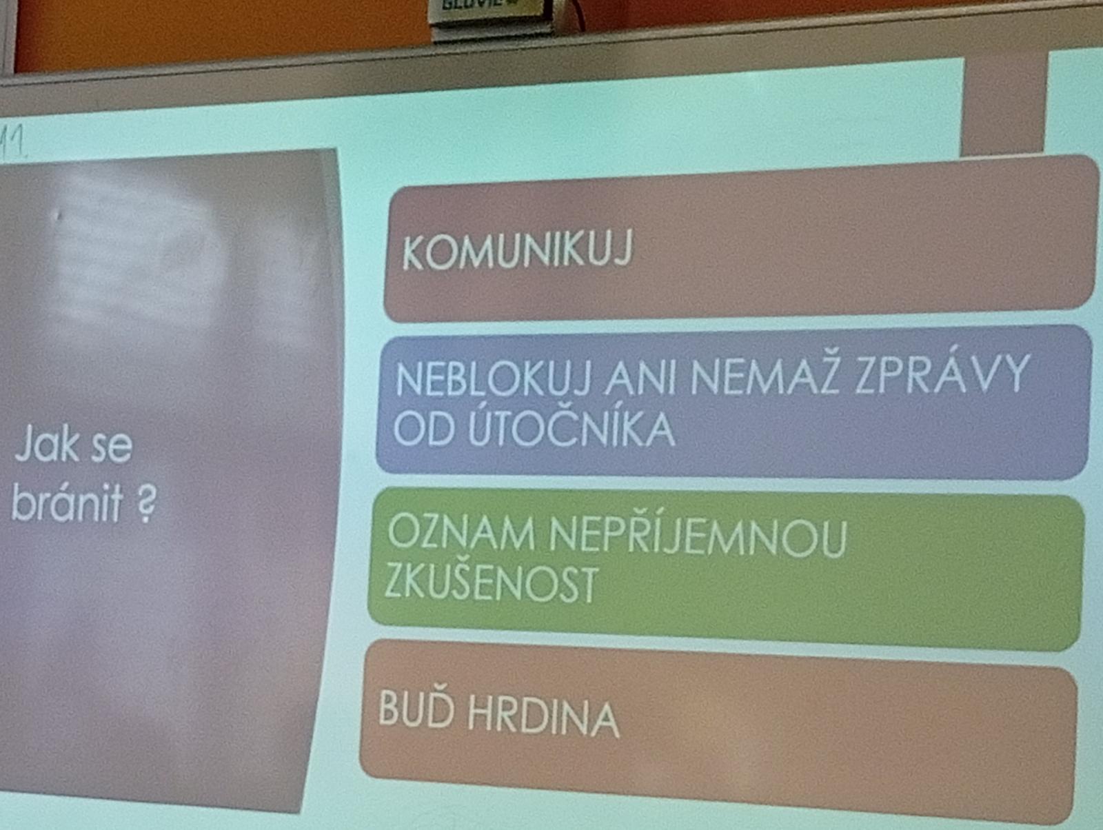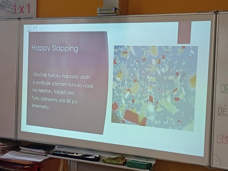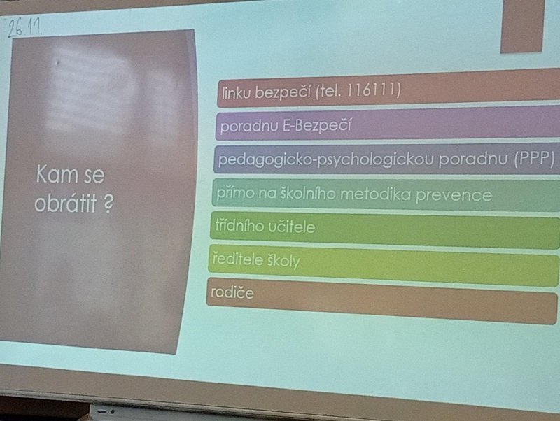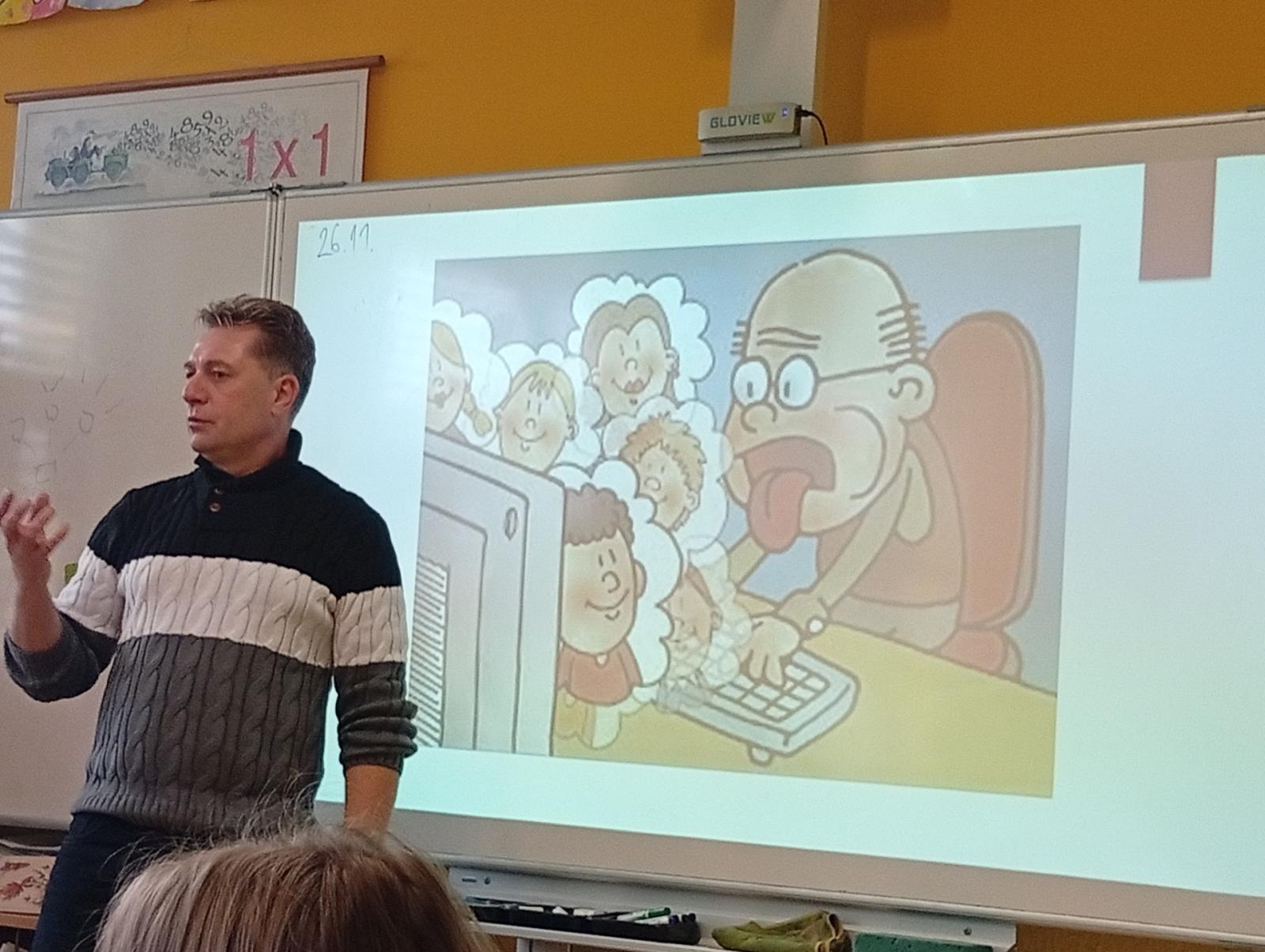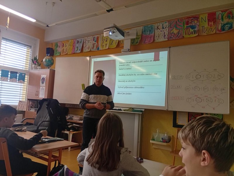 Dnes naši třídu navštívil pan Radek Kusák z ped. psychol. poradny. Poučil a seznámil děti s možným nebezpečím na internetu. Vysvětlil dětem pojmy jako je kyberšikana, sexting, kybergrooming nebo kyberstalking. Důležité pro nás je, nenechat se nikým zlákat a nachytat, nevěřit nikomu na druhé straně počítače, nenaletět. Pokud se však s takovou situací někdo setká, ví, že se má svěřit dospělé osobě (rodičům, rodinným příslušníku, paní psycholožce, třídnímu učiteli atp.). Protože všechny tyto situace jsou trestné a nepřípustné!