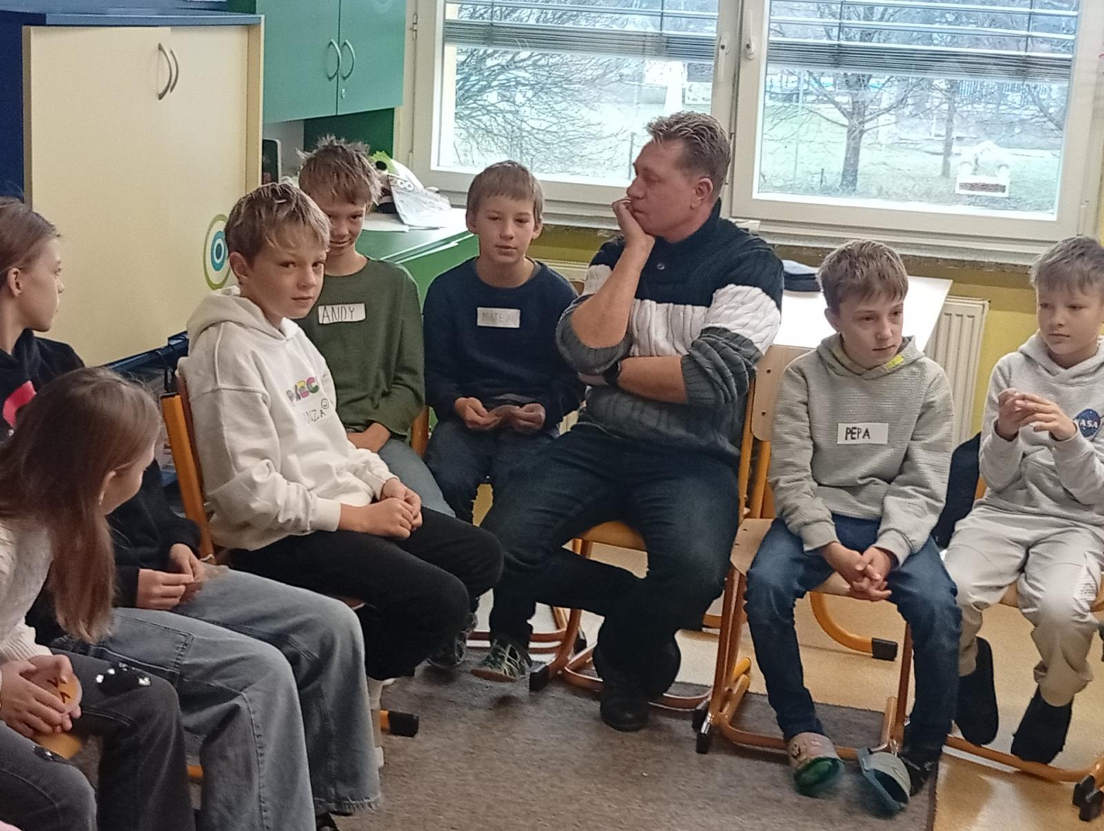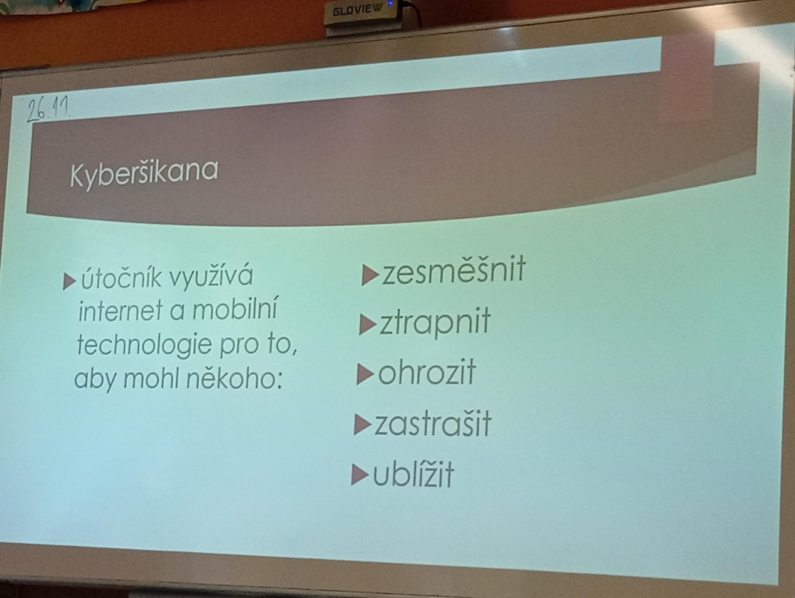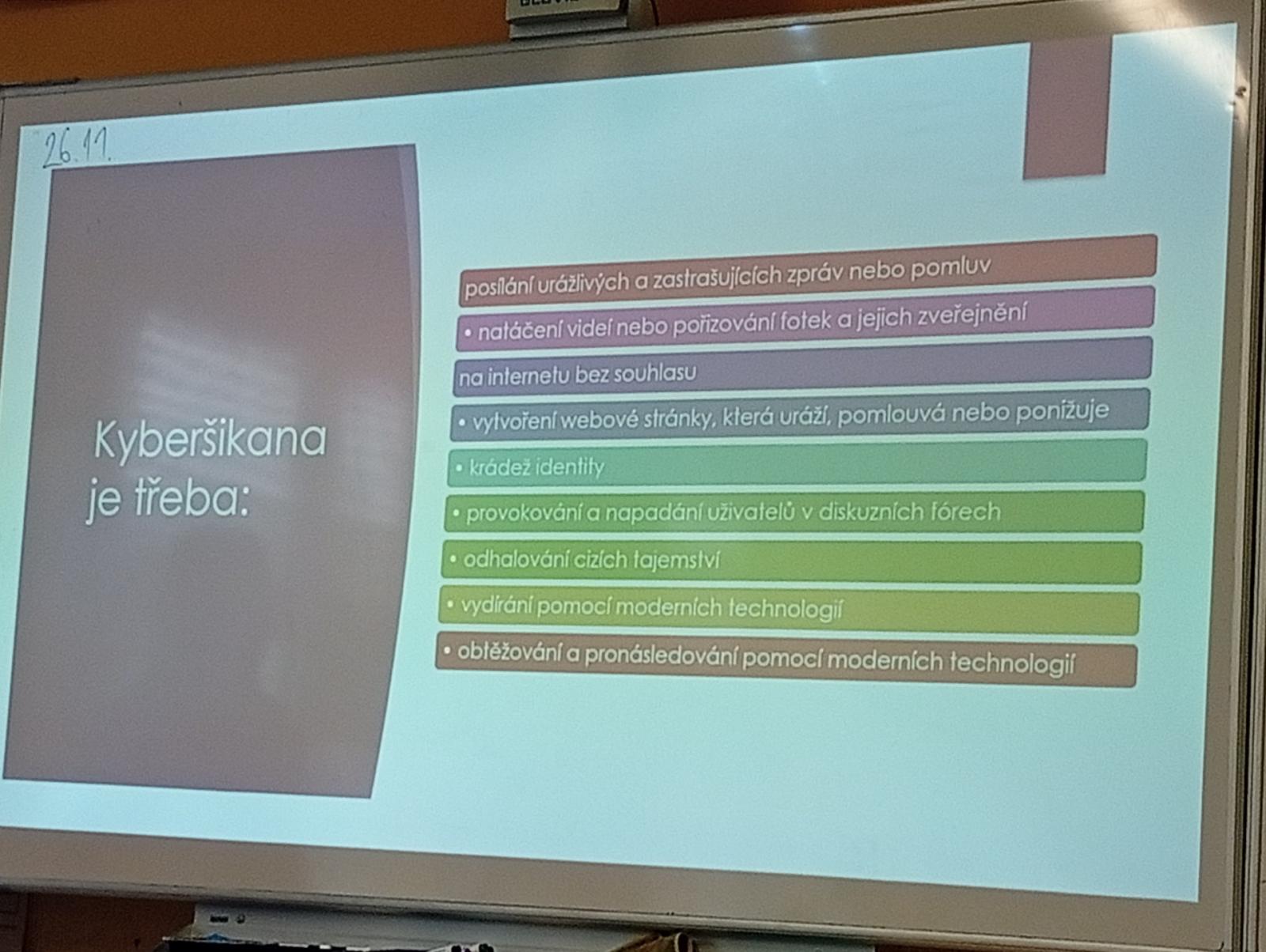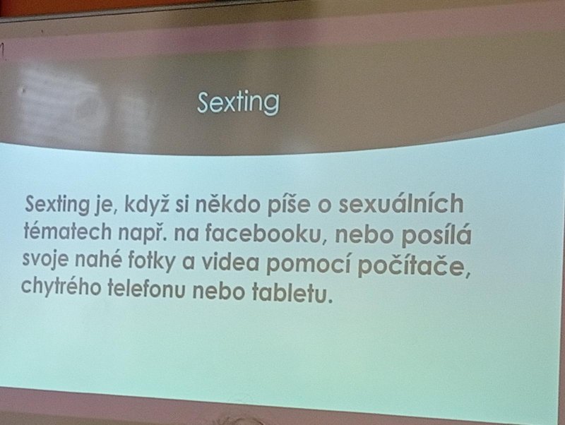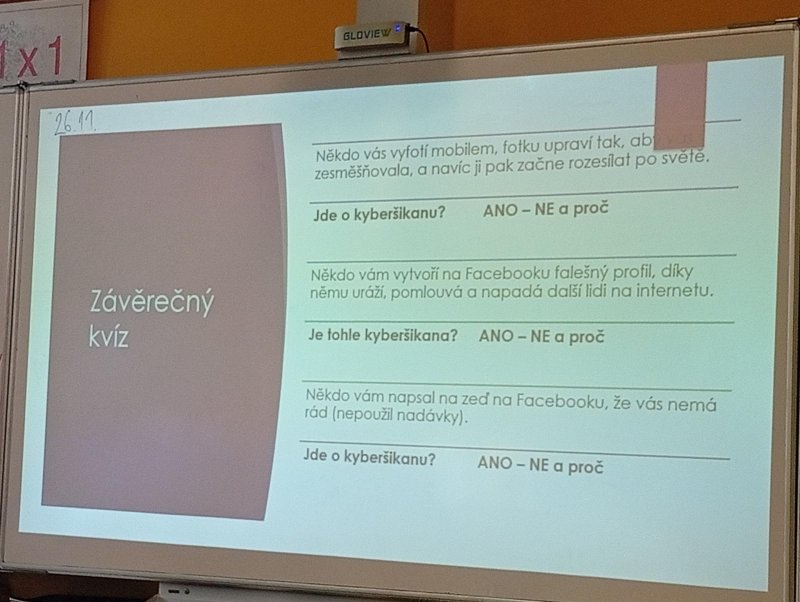 Dnes naši třídu navštívil pan Radek Kusák z ped. psychol. poradny. Poučil a seznámil děti s možným nebezpečím na internetu. Vysvětlil dětem pojmy jako je kyberšikana, sexting, kybergrooming nebo kyberstalking. Důležité pro nás je, nenechat se nikým zlákat a nachytat, nevěřit nikomu na druhé straně počítače, nenaletět. Pokud se však s takovou situací někdo setká, ví, že se má svěřit dospělé osobě (rodičům, rodinným příslušníku, paní psycholožce, třídnímu učiteli atp.). Protože všechny tyto situace jsou trestné a nepřípustné!