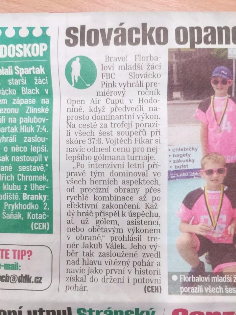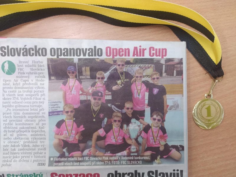 Náš Dany je hráčem mladších žáků FBC Slovácko Pink. Svým excelentním výkonem vyhráli premiérový ročník Open Air Cupu v Hodoníně. Na cestě k vítězství porazili všech šest soupeřů při skóre 37:6. A současně získali cenu pro nejlepšího gólmana turnaje.