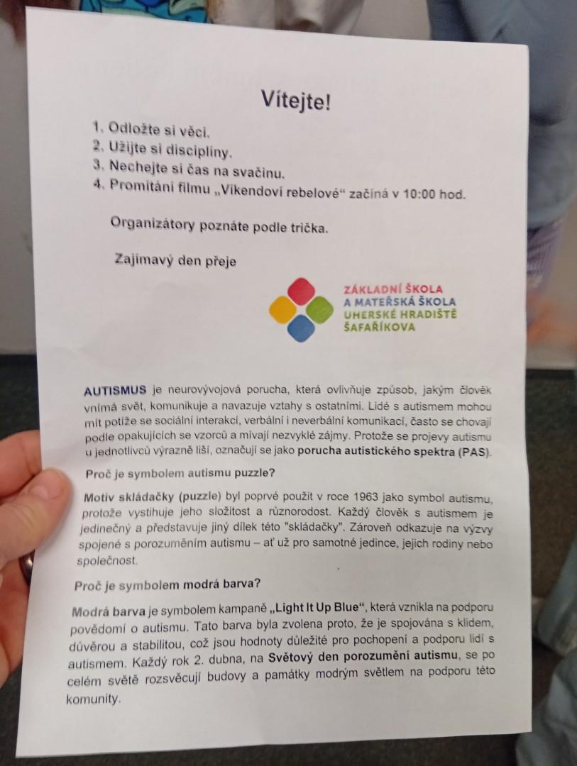 V aule kina si děti vyzkoušely různé situace, které mohou děti s autismem zažívat a nakonec zhlédly film natočen podle skutečné události s názvem Víkendoví rebelové. V něm byl krásně zachycen příběh chlapce s poruchou autismu, jeho vnímání světa, přijímání i nepřijímání jeho chování ve společnosti a hlavně soužití celé jeho nejbližší rodiny. Příběh byl velmi poutavý a dojemný a věřím, že děti již nyní chápou, jak se projevuje porucha autismu a jak se máme k takovým lidem chovat.