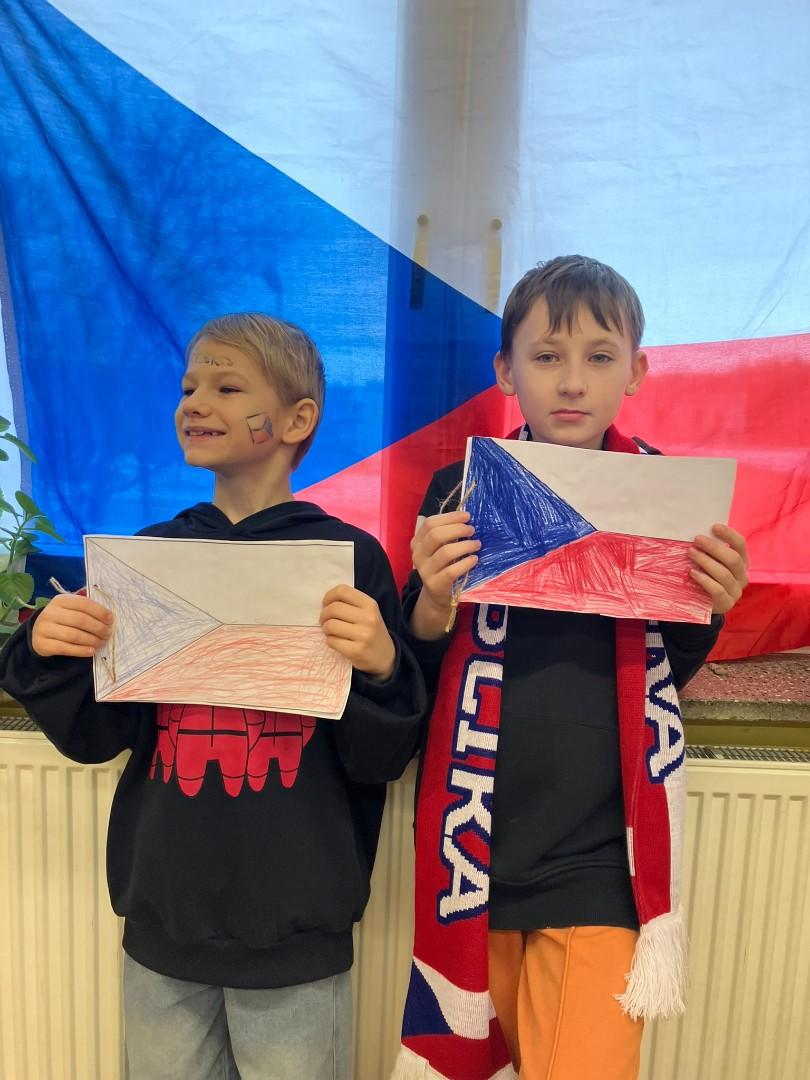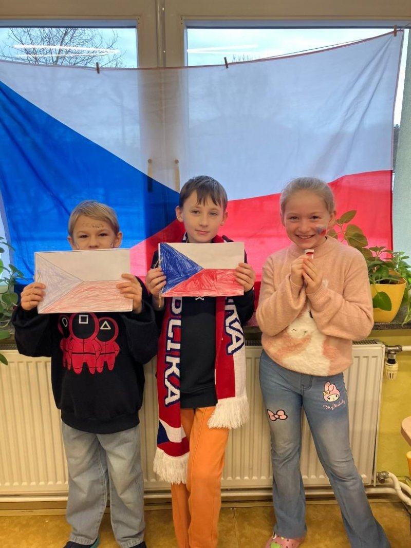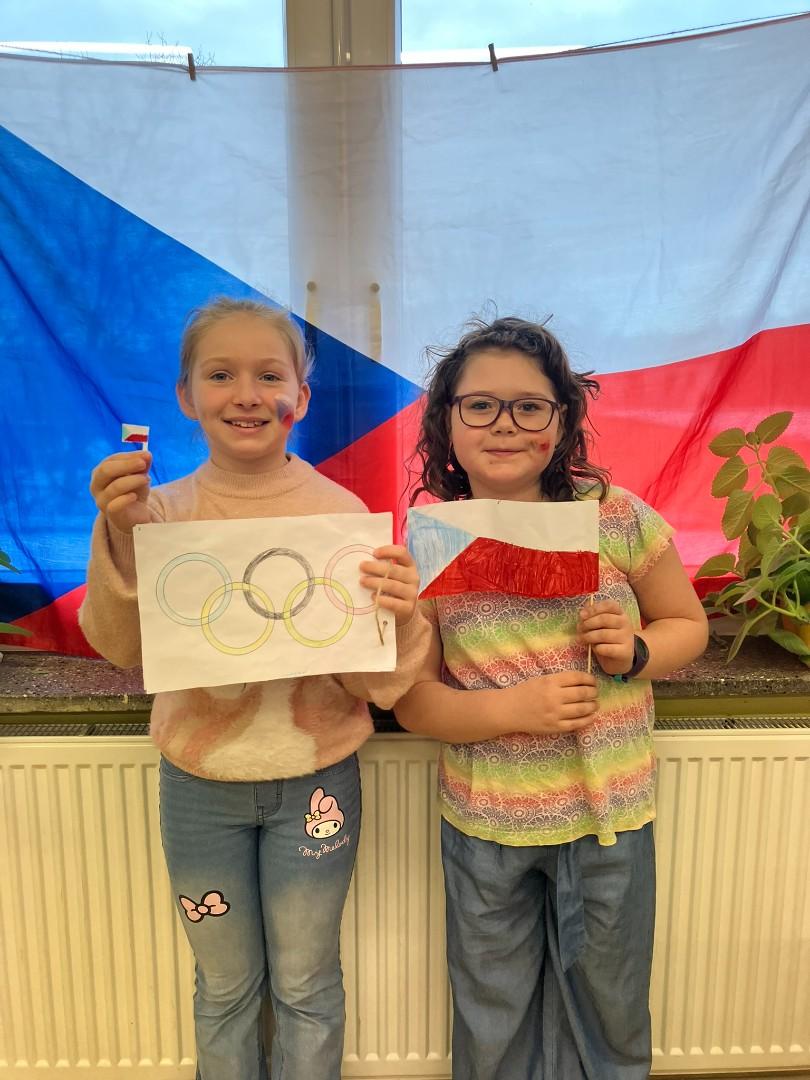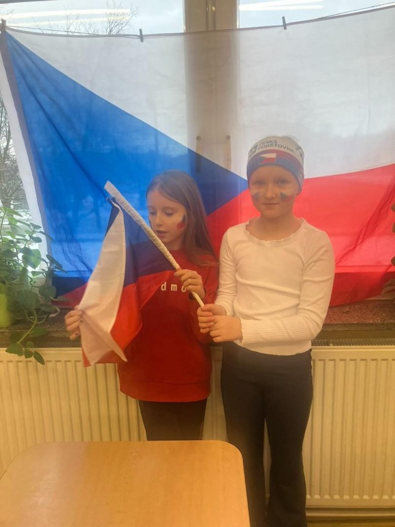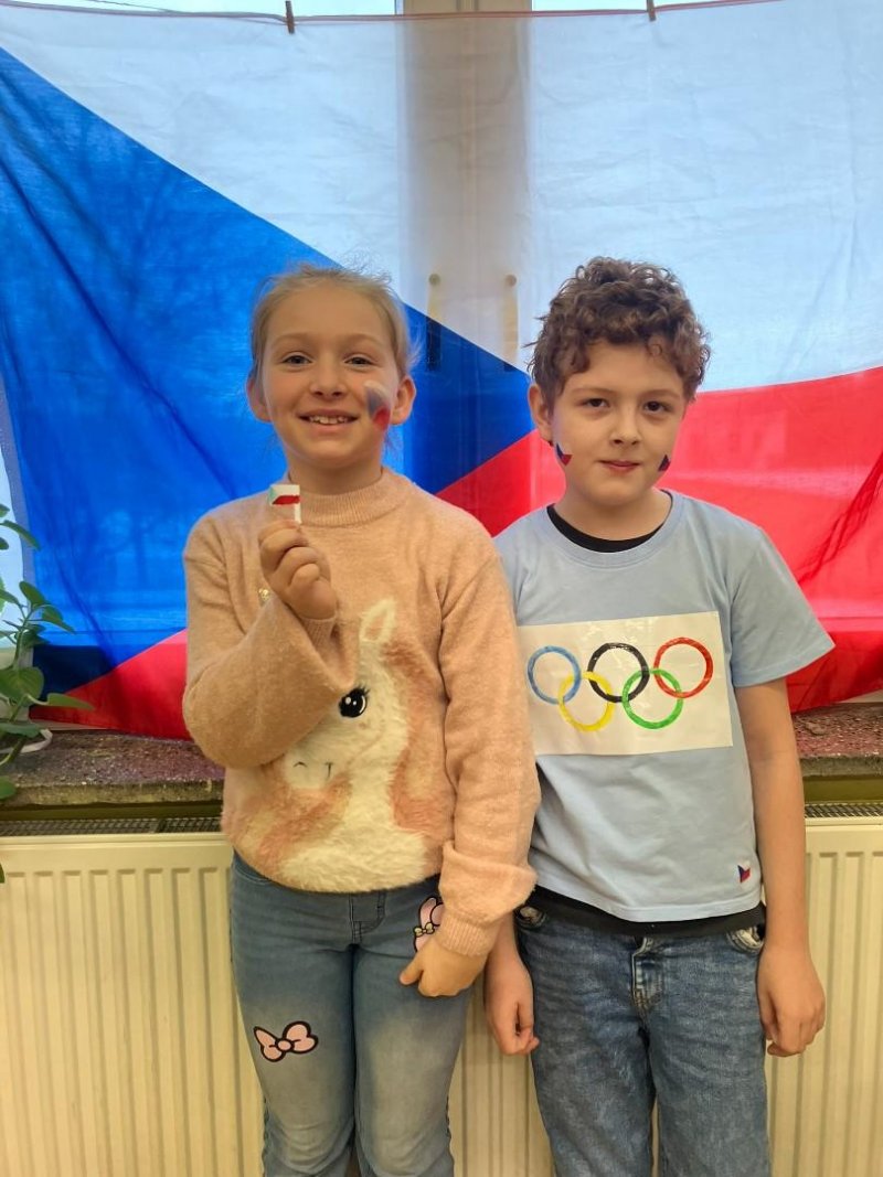 |ve středu 18. února jsme si zažili také olympijskou atmosféru, sounáležitost a národní hrdost. S pečlivostí jsme si připravili české a olympijské vlajky, oblékli se do fanouškovského a mohutně zaskandovali s ostatními žáky 1. stupně v tělocvičně.