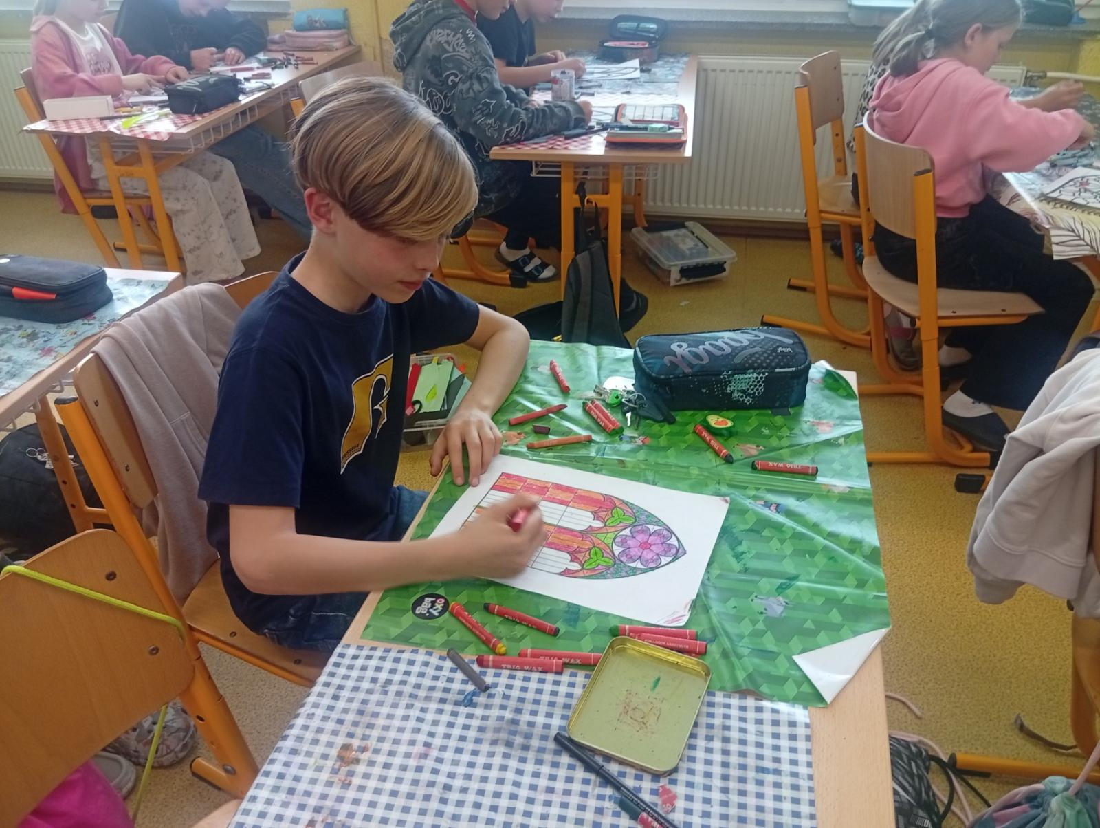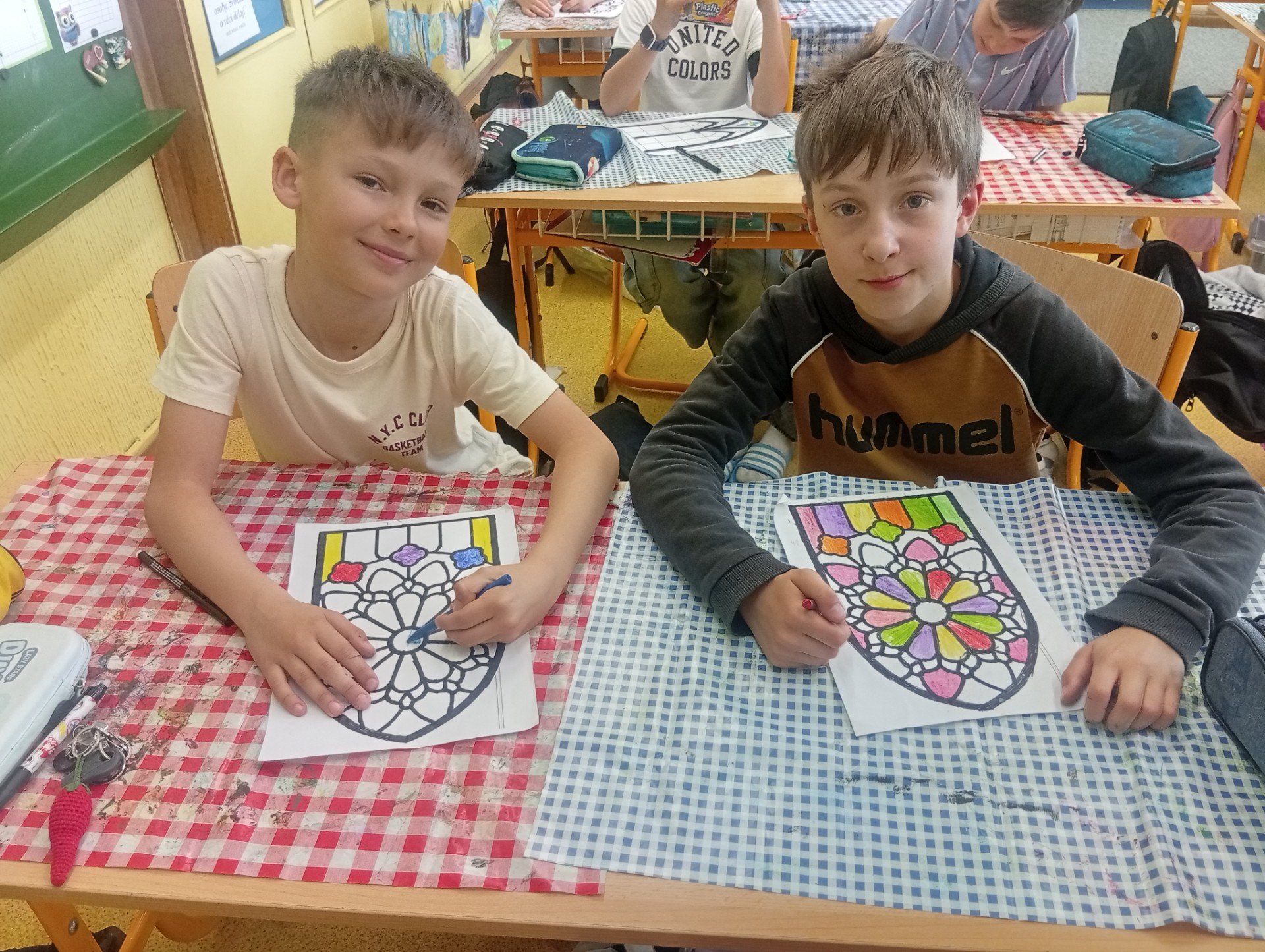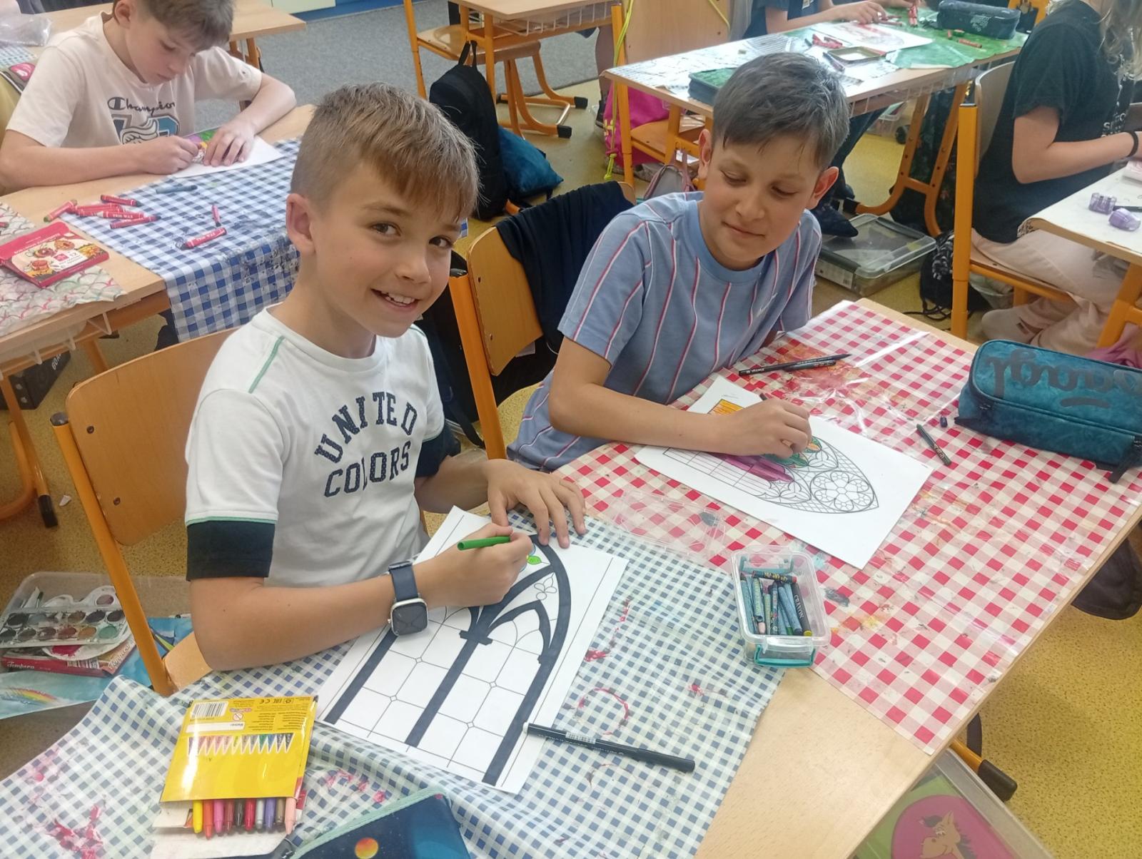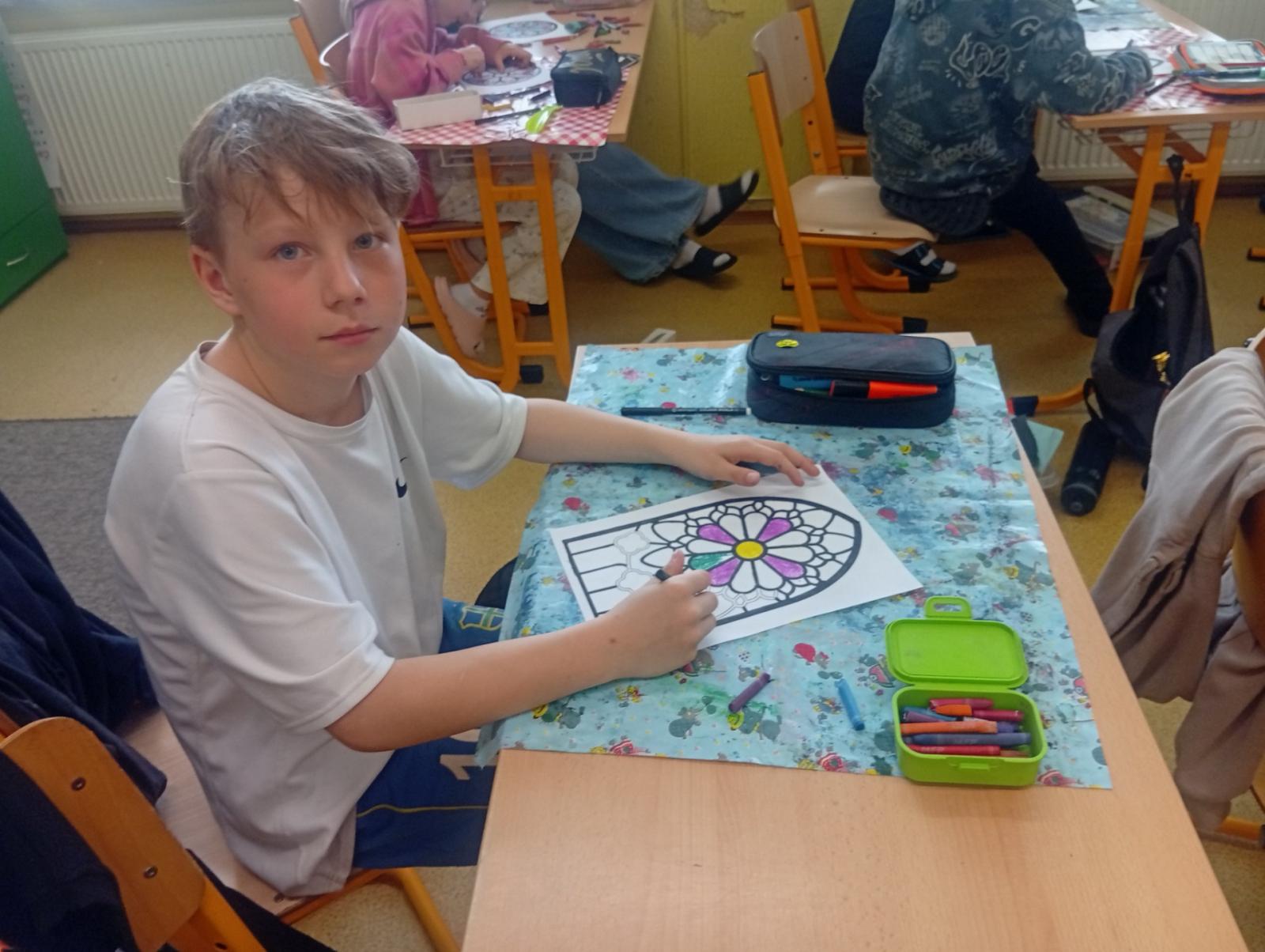 V období přemyslovských knížat a králů převládal umělecký směr GOTIKA. Tak jsme si ve výtvarce zkusili olejovou metodou gotická okna a rozety. A myslím, že se nám to povedlo. Už stačí jen vše zalaminovat a vystavit do našeho novodobého okna :)