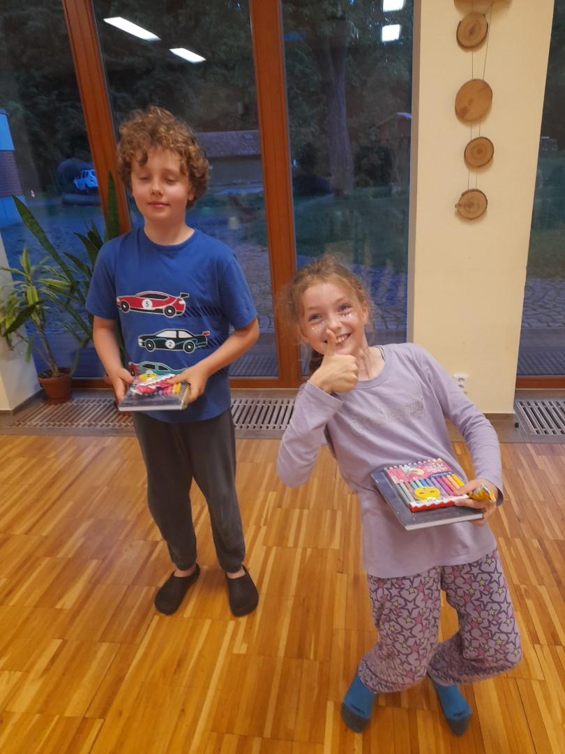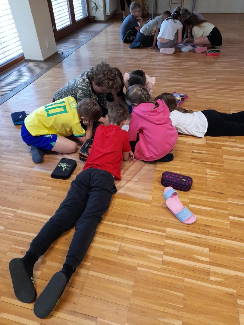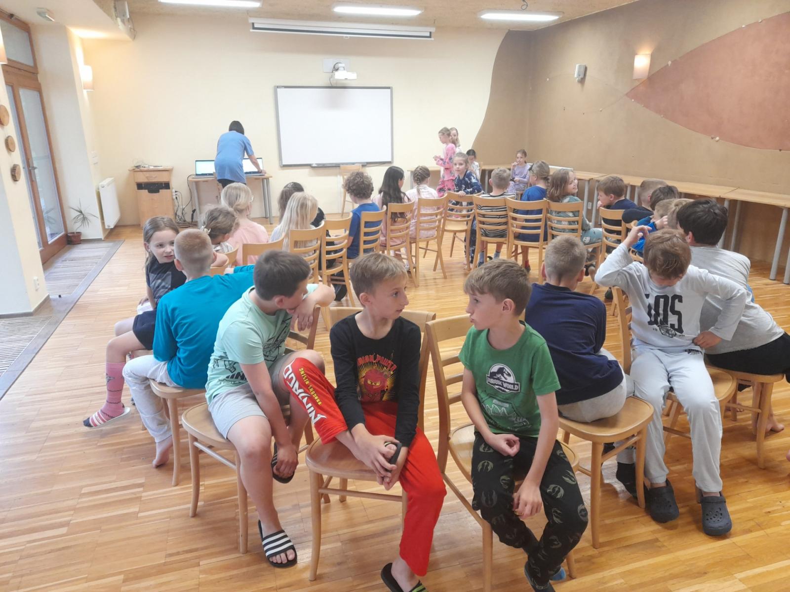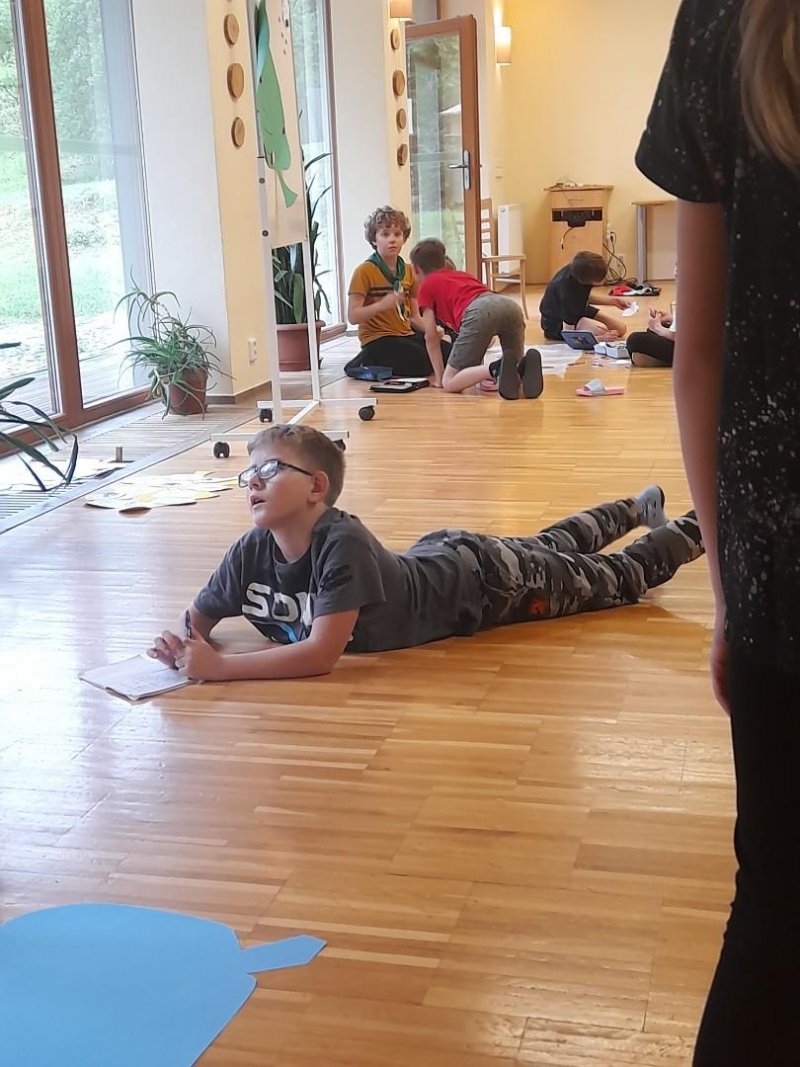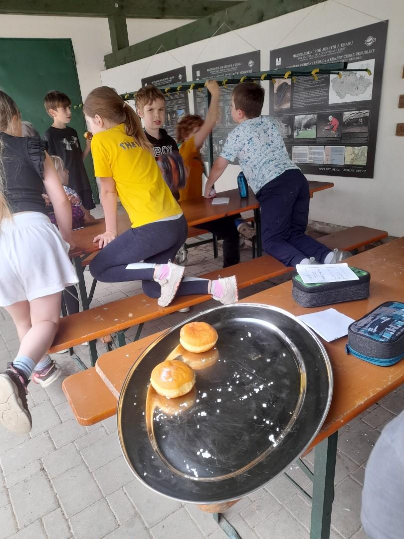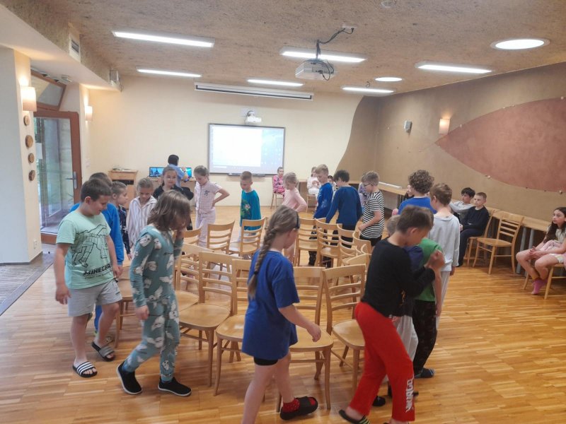 Středa byla ve znamení bádání a zkoumání živočichů, které jsme si sami vylovili v nedalekém potoce. Vylovili jsme chrostíky, blešivce či jepice a pod lupou je pak pozorovali. Po obědě a krátkém odpočinku nás čekal orientační běh podle fáborků s 15 otázkami učiva třetího ročníku. Nešlo tedy jen o rychlost, ale i o vědomosti. Odpoledne nás počasí zahnalo na sál, kde jsme hráli různé hry a večer jsme si užili pyžamovou party.