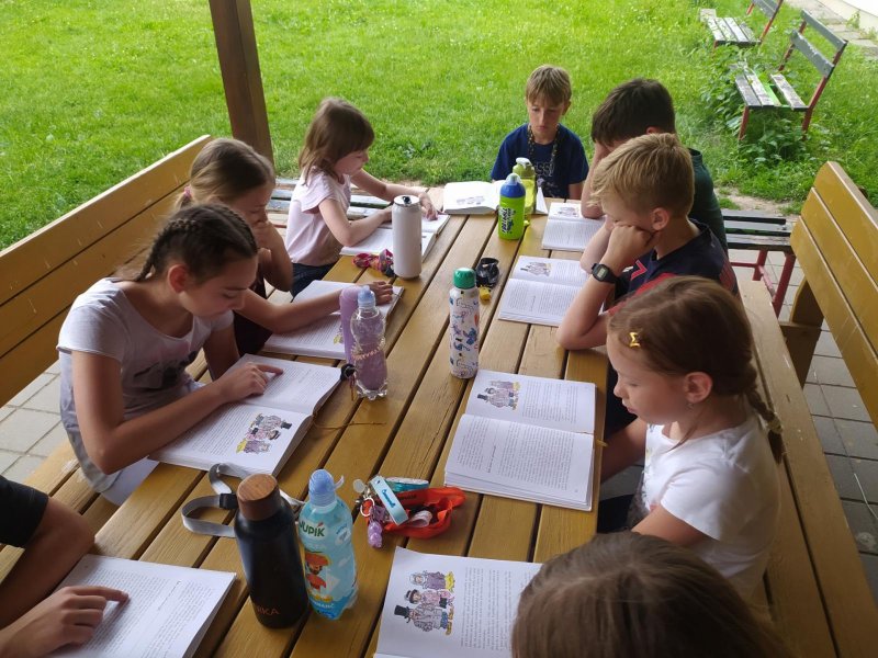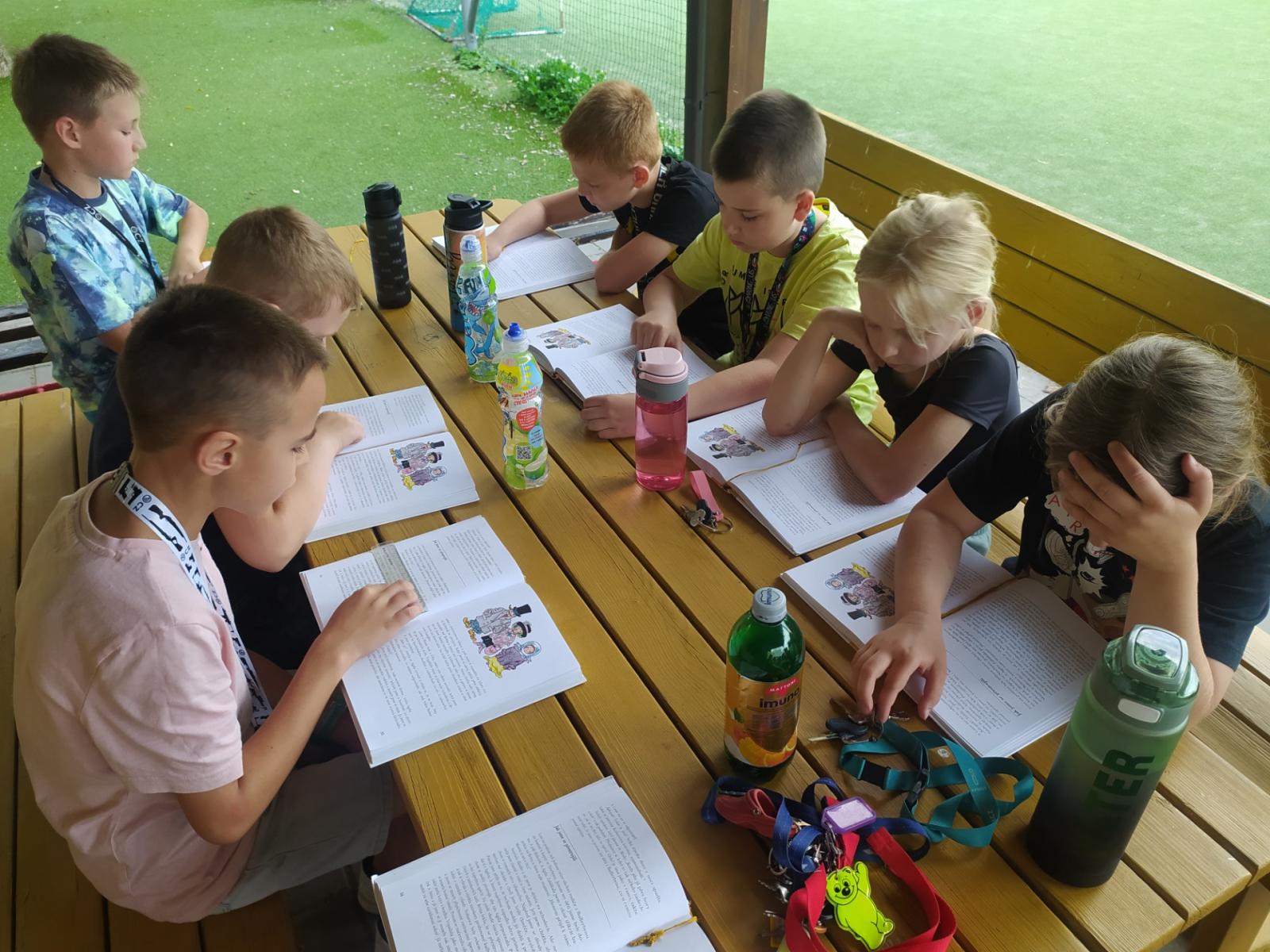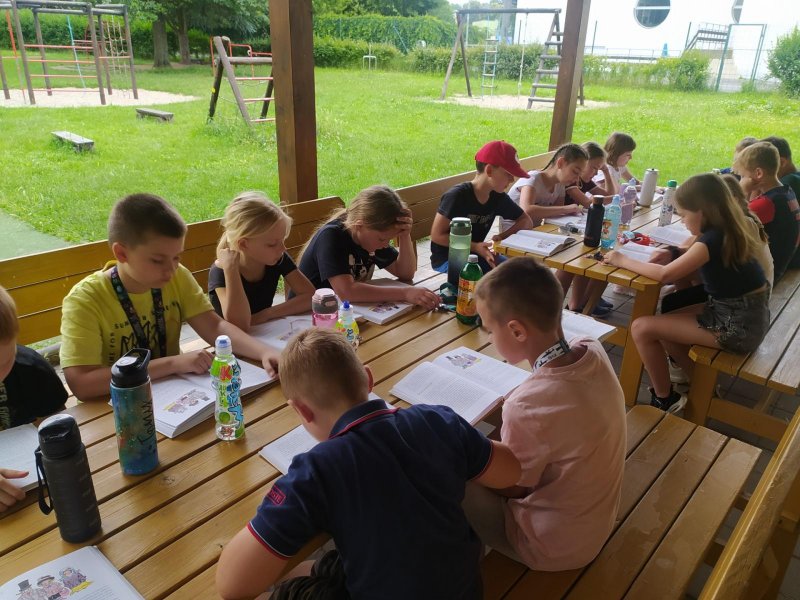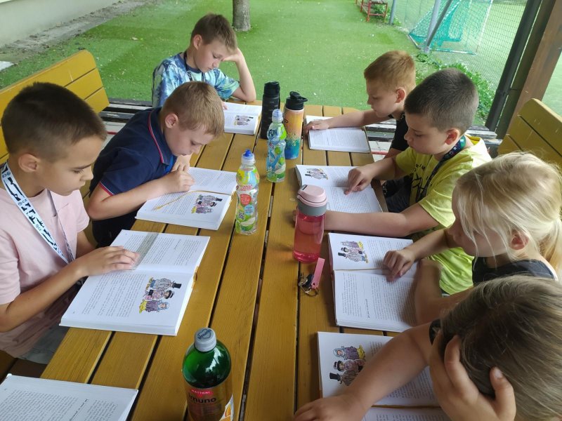 Aby nám nebylo ve třídě moc horko, vzali jsme si knihy a šli jsme číst pod pergolu na hřiště školní družiny. Za odměnu si kluci zahráli fotbal a děvčata řádila na prolézačkách.