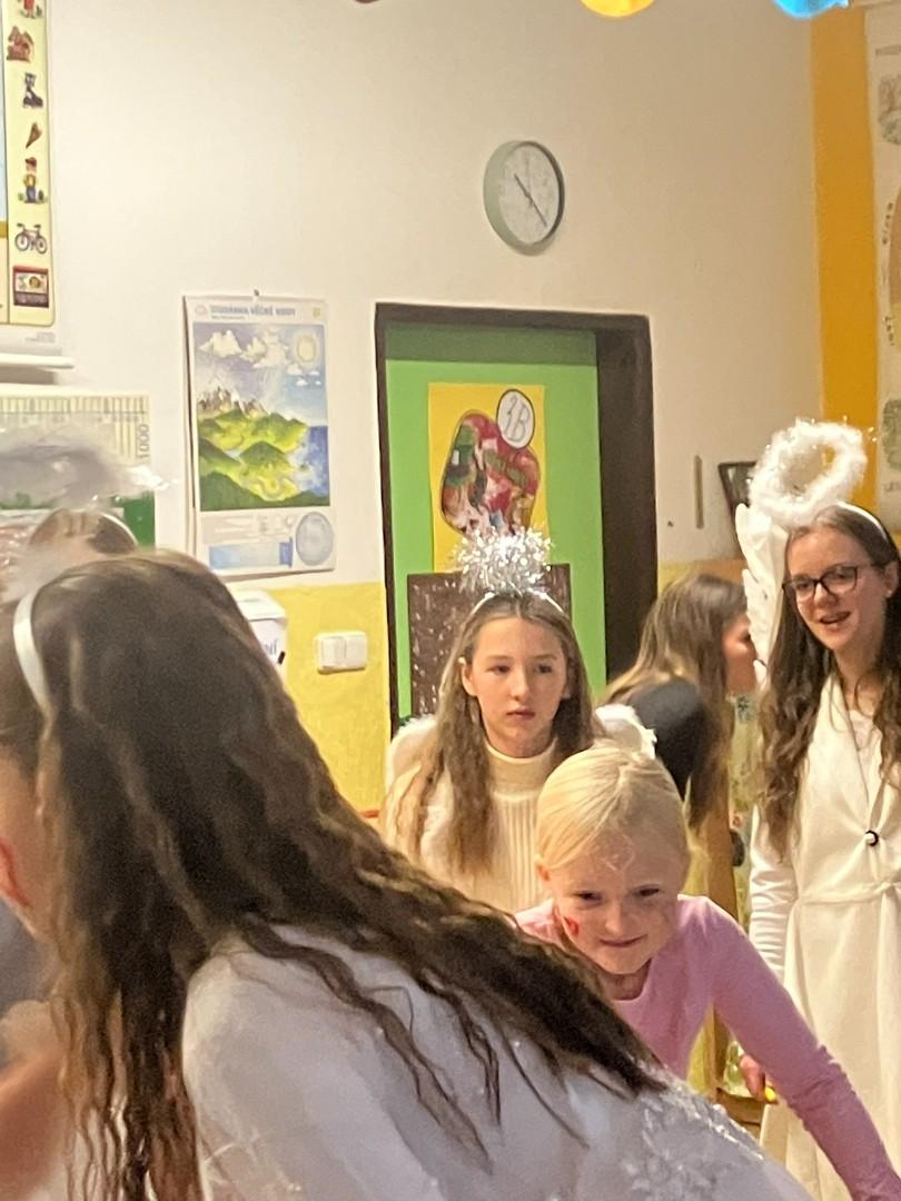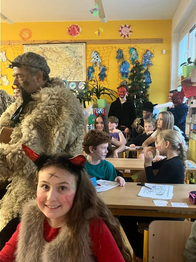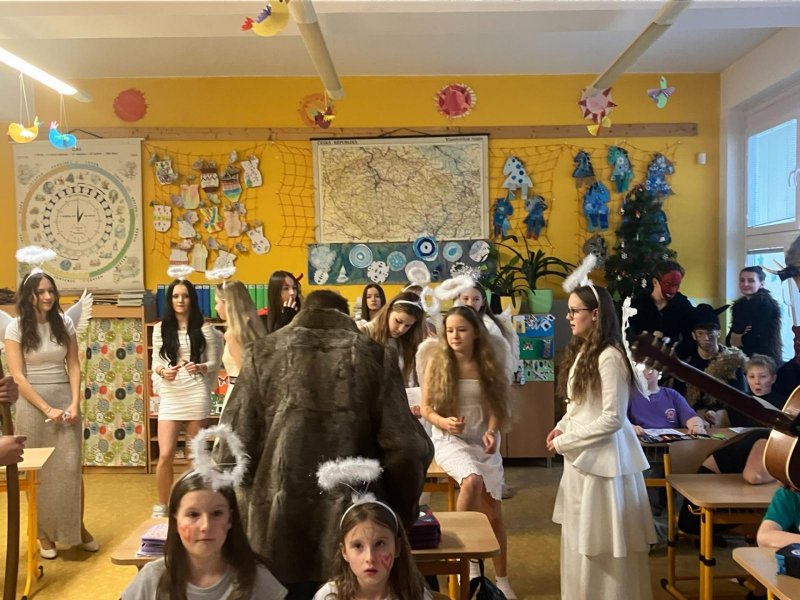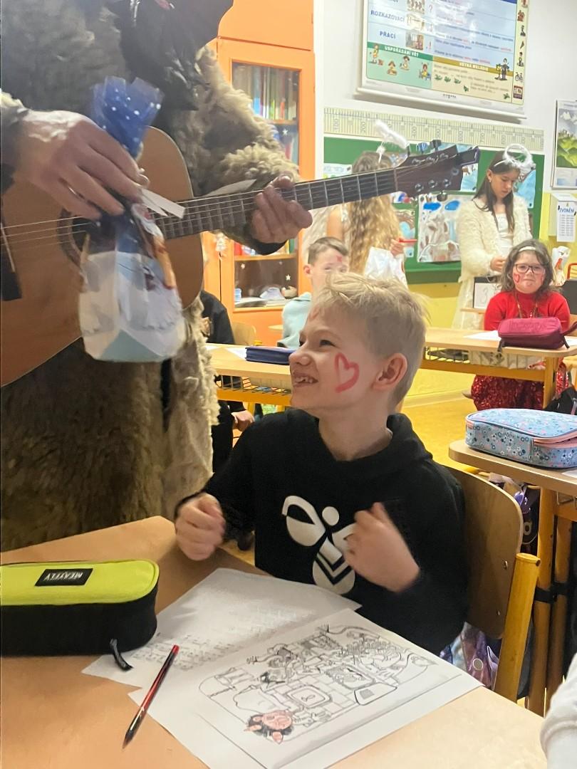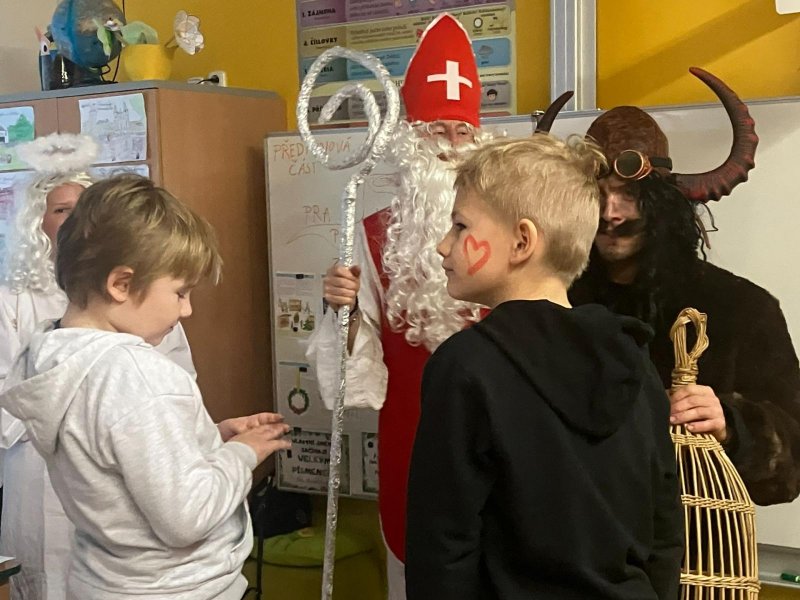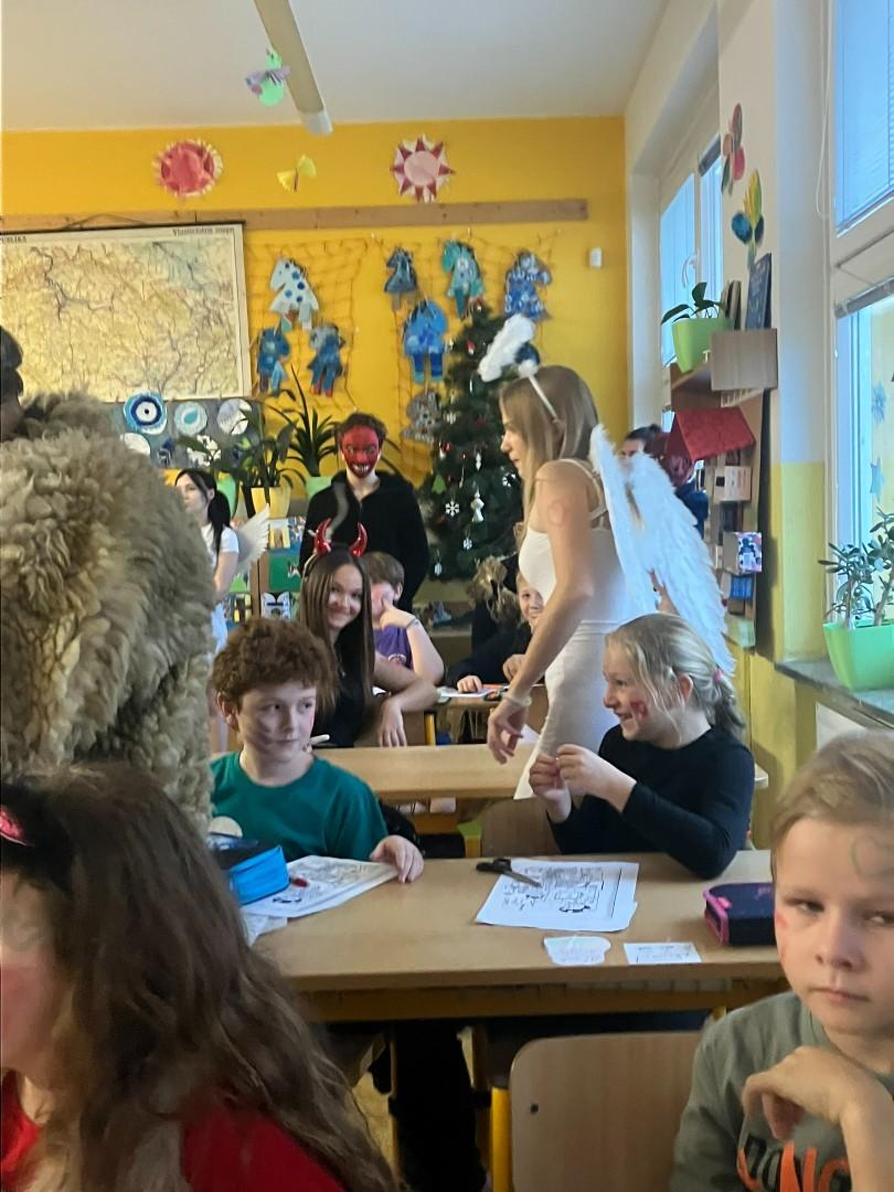 Konečně k nám přišli....Třetí hodinu se rázem třída zaplnila vyslanci nebe i pekla. Andělé rozdávali srdcové podpisy, čerti očichávali hříšníky a Mikuláš spravedlivě obdarovával. Zazpívali jsme a plni emocí jsme se pustili do rozbalování nadílky...