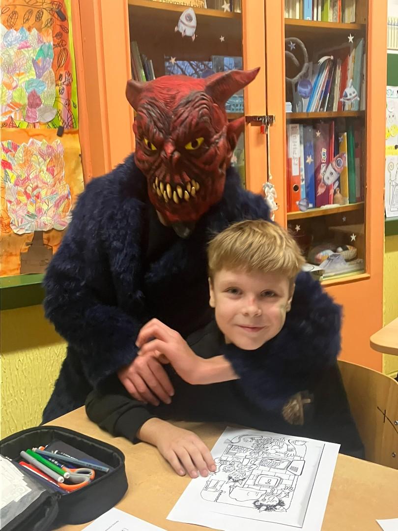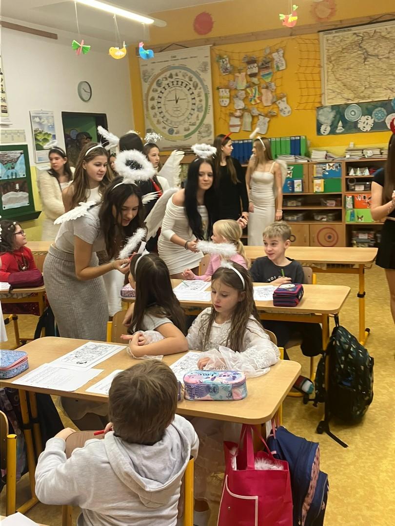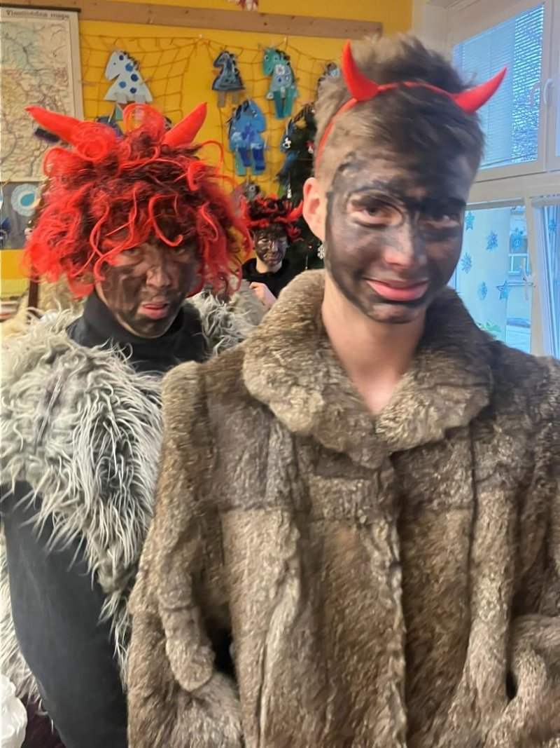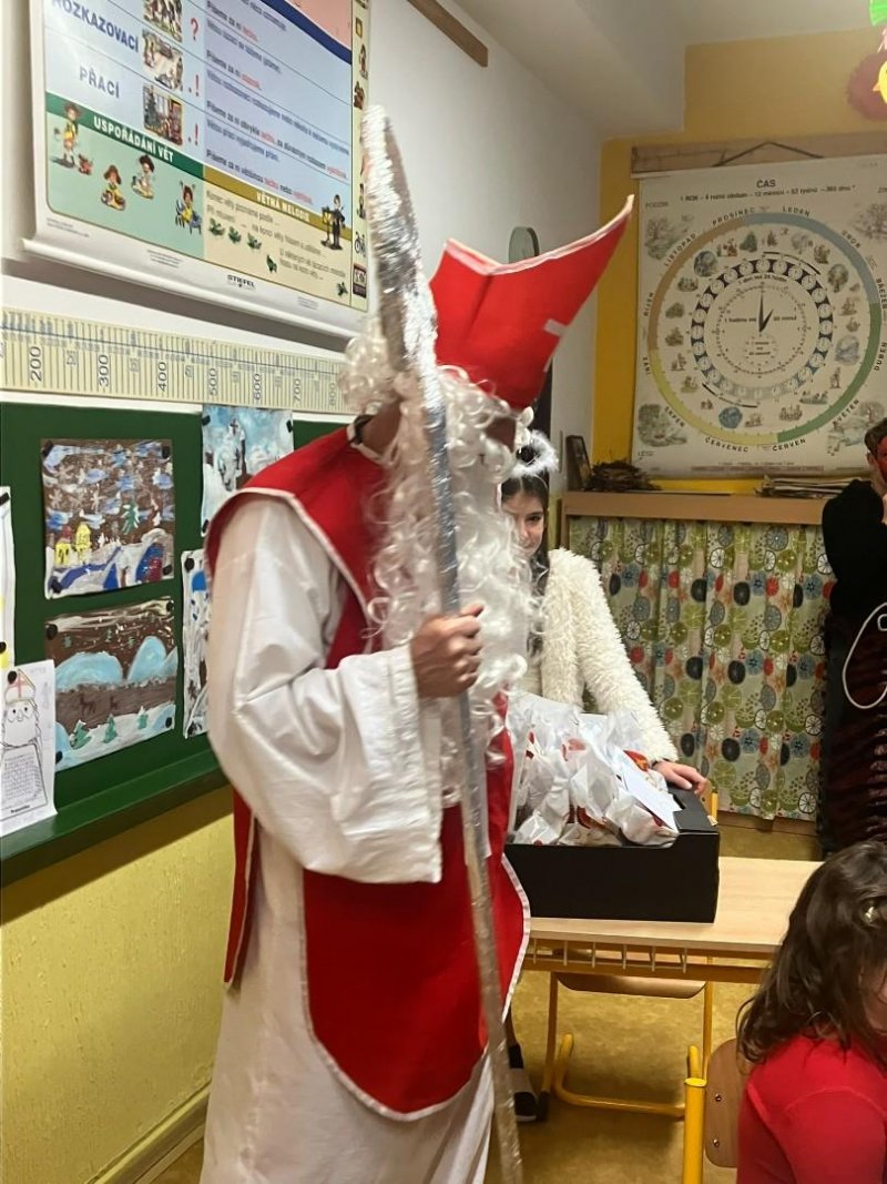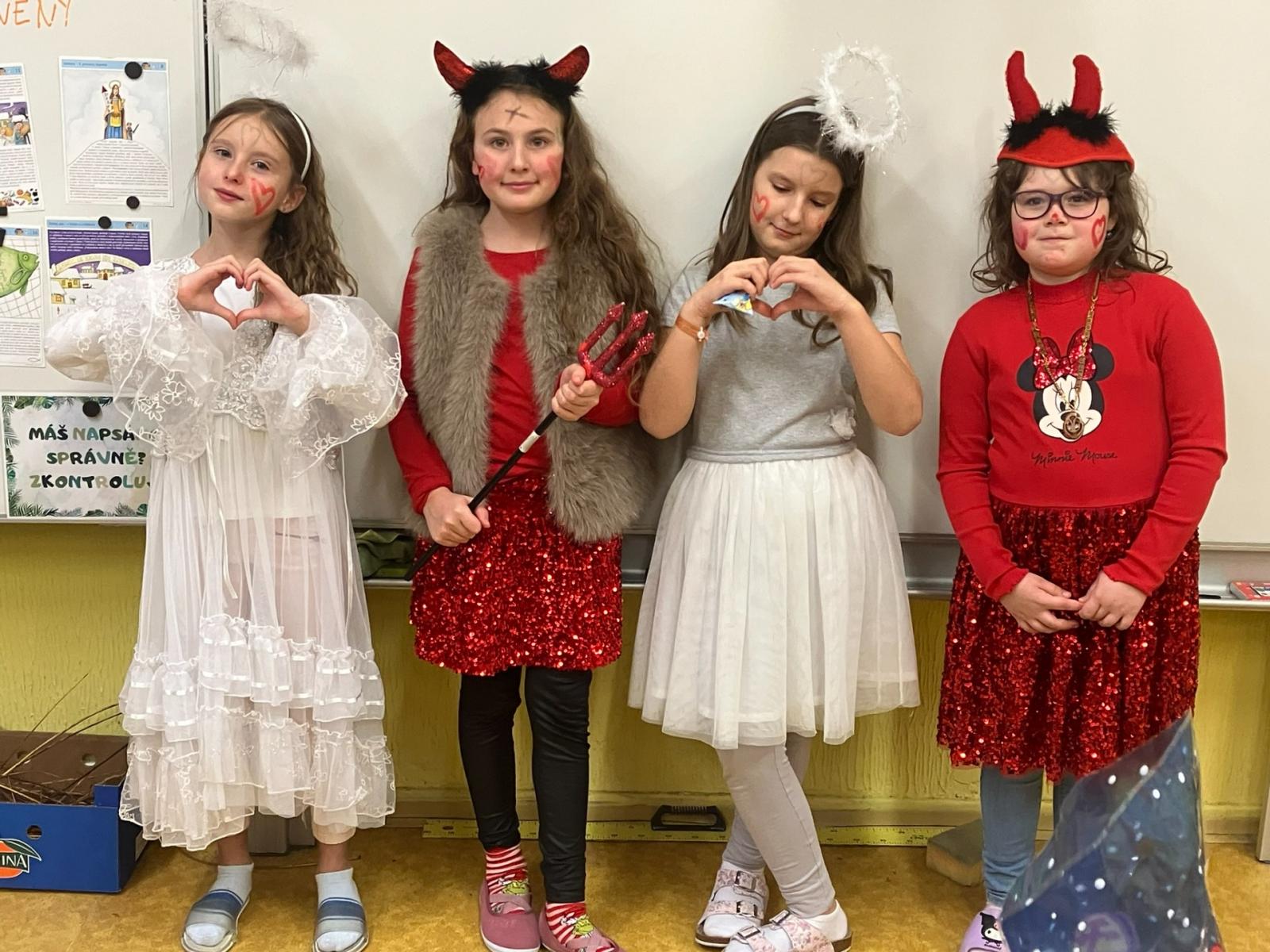Konečně k nám přišli....Třetí hodinu se rázem třída zaplnila vyslanci nebe i pekla. Andělé rozdávali srdcové podpisy, čerti očichávali hříšníky a Mikuláš spravedlivě obdarovával. Zazpívali jsme a plni emocí jsme se pustili do rozbalování nadílky...