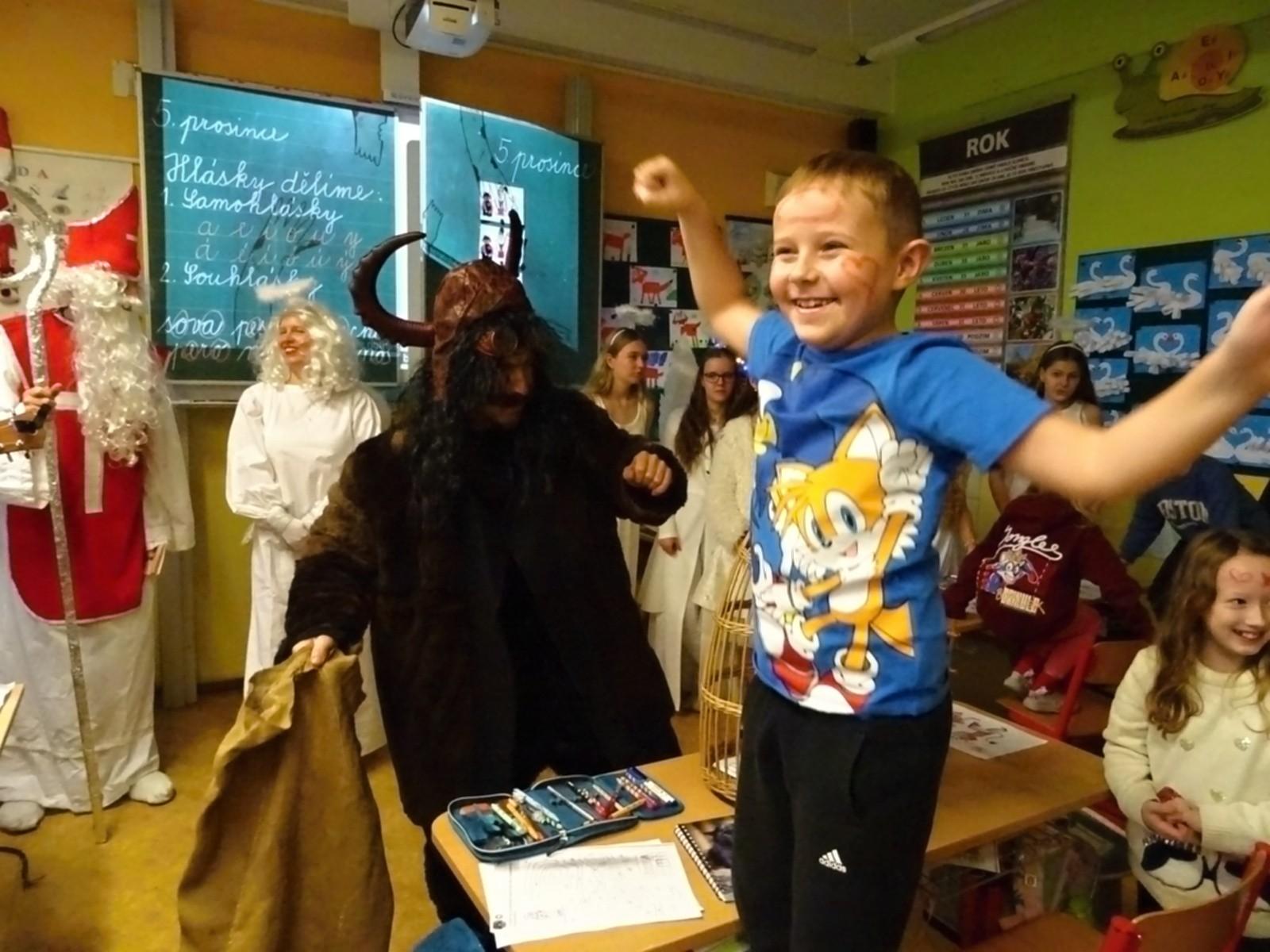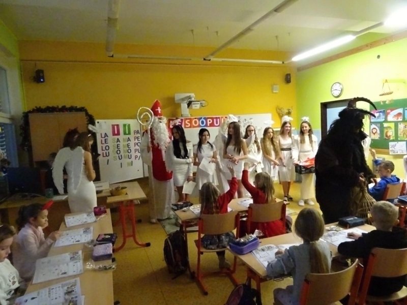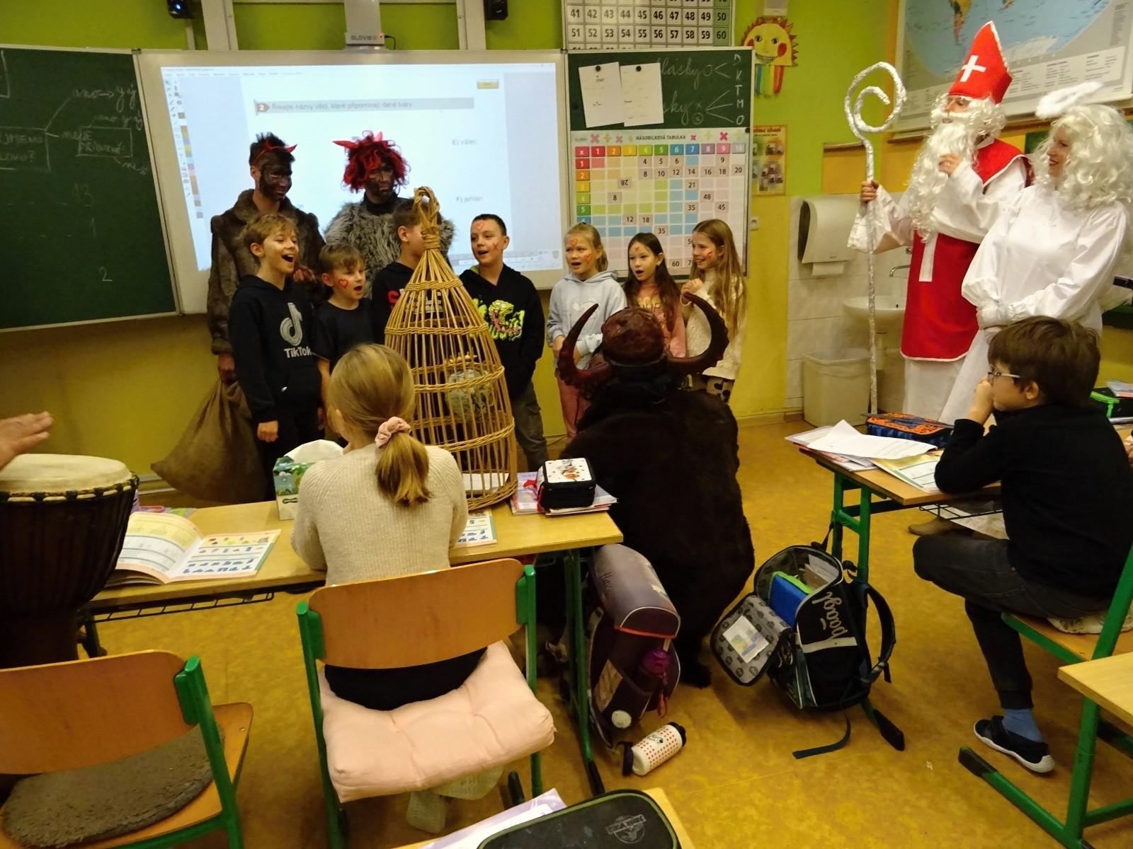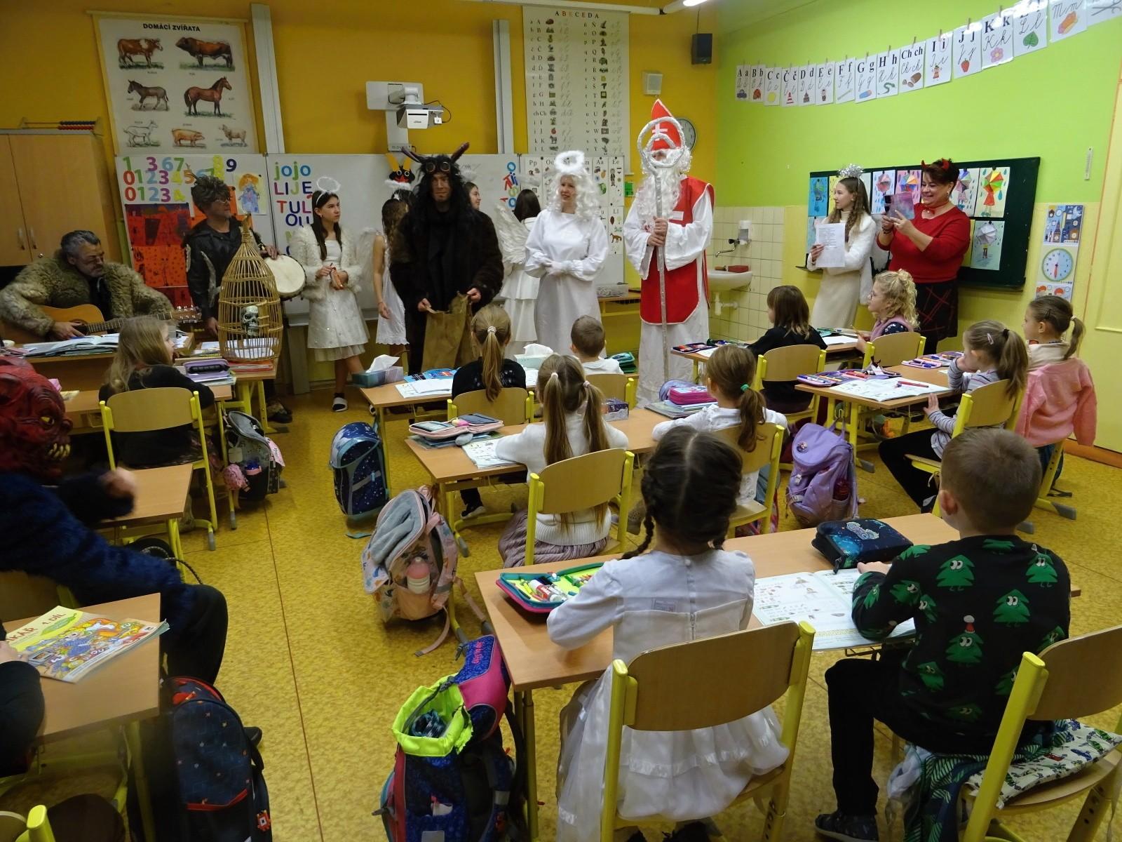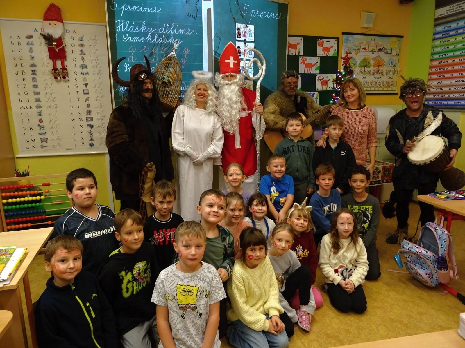V pátek 5. prosince zavítal do naší školy Mikuláš se svou andělskou i čertovskou družinou, aby potěšil žáky a zpříjemnil jim dopoledne. Navštívil 1., 2. a 3. třídu a neplánovaně se zastavil také u čtvrťáků, kteří jeho příchod nadšeně uvítali. V každé třídě otevřel svou „Knihu hříchů“ a vyhledal několik největších hříšníků, kteří se museli vykoupit písničkou. Děti se úkolu ujaly s úsměvem a statečně zazpívaly před svými spolužáky. Atmosféra byla veselá, přátelská a naplněná očekáváním. Na závěr návštěvy předal Mikuláš každému žákovi malý dáreček.
