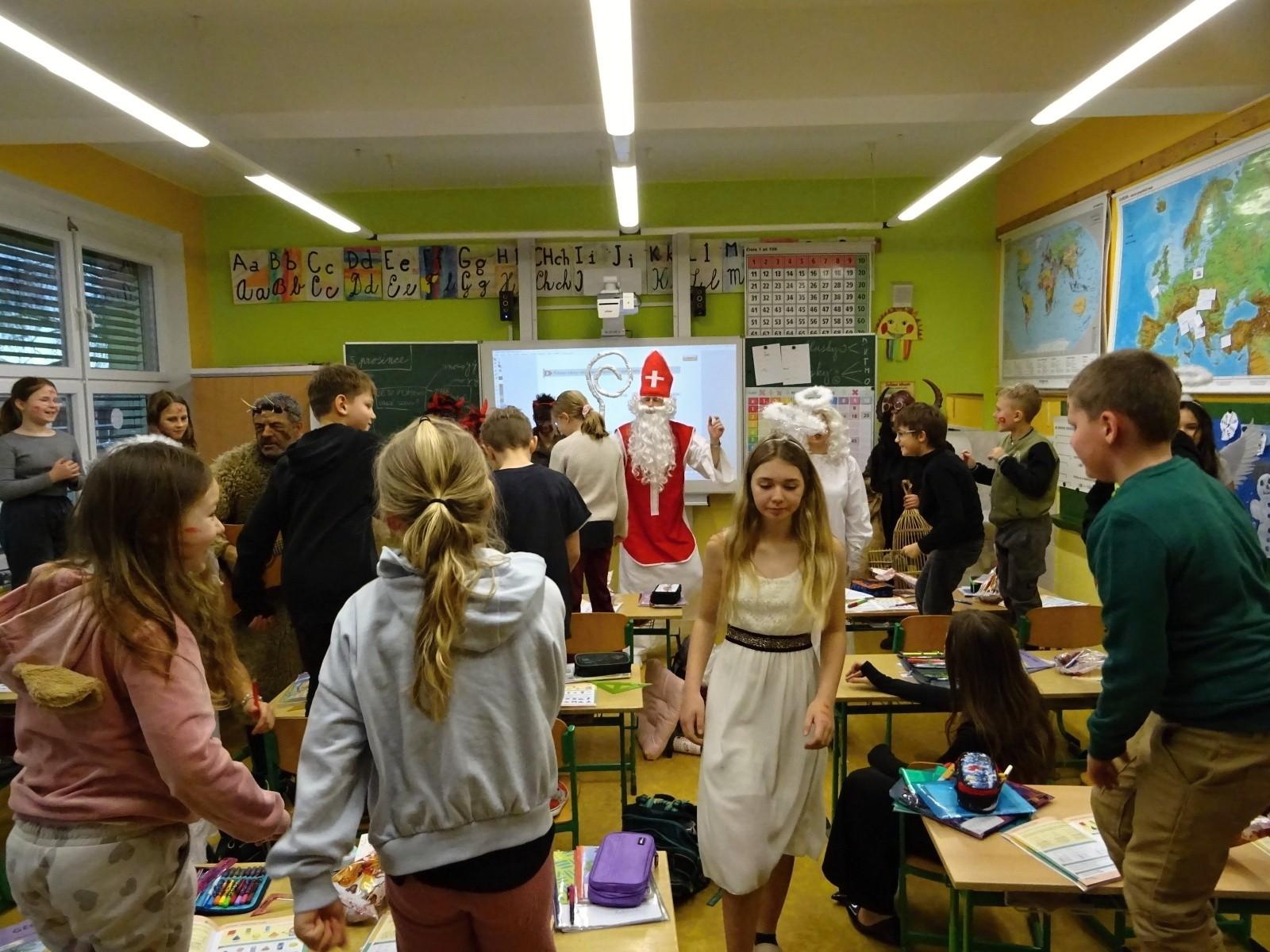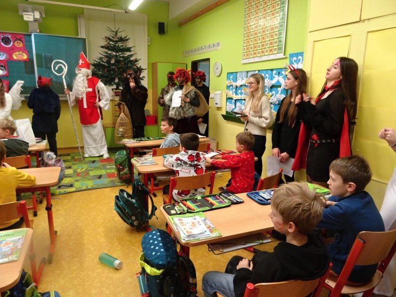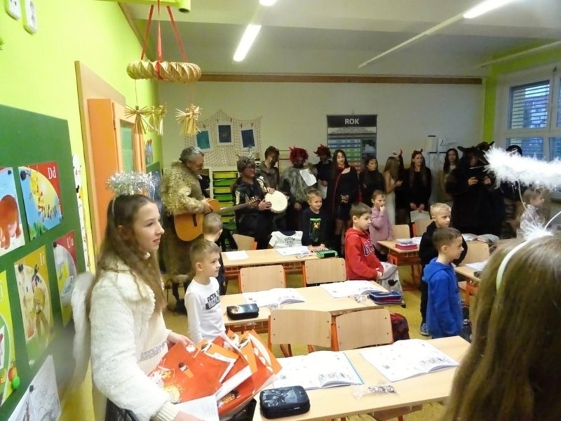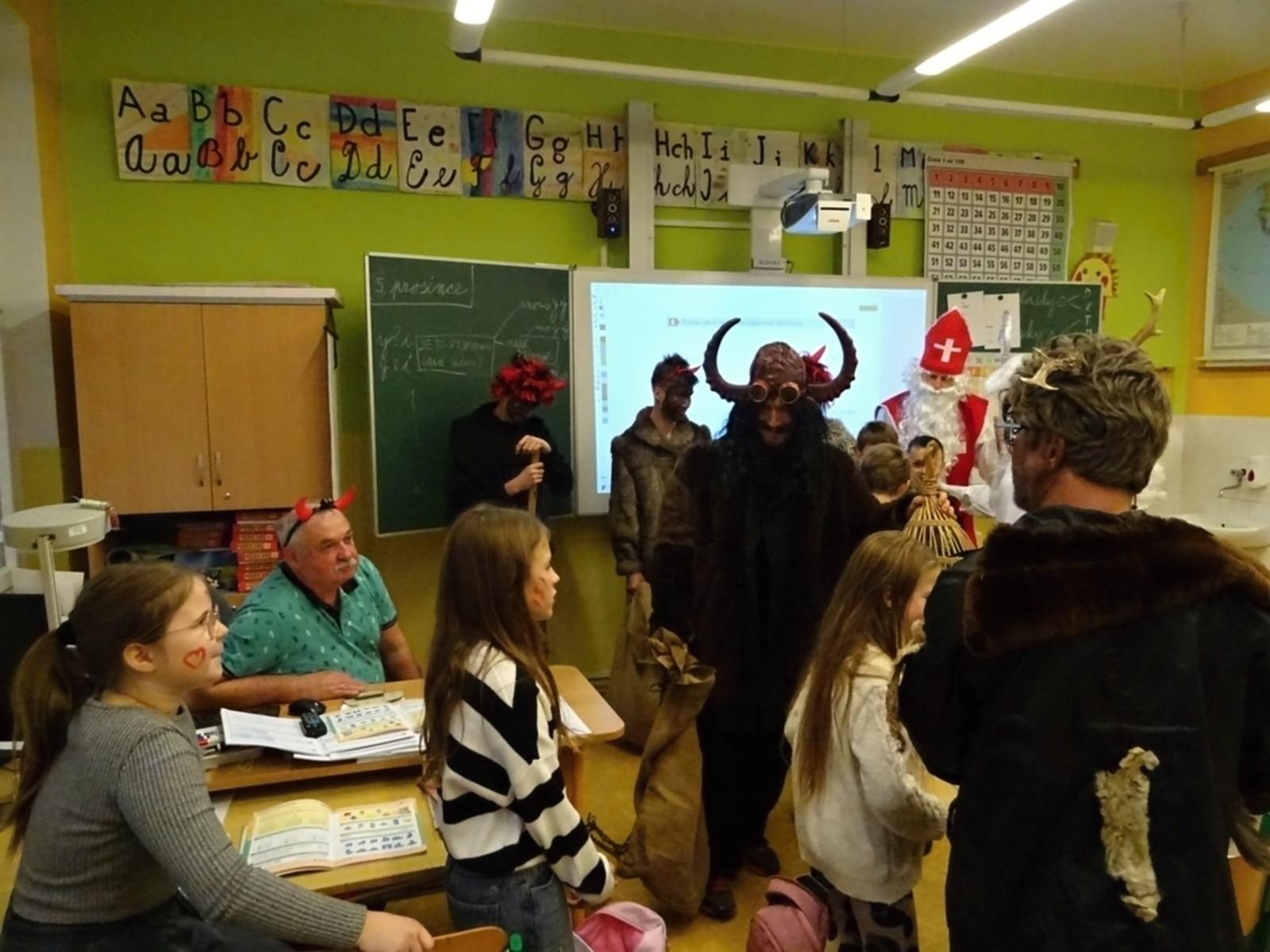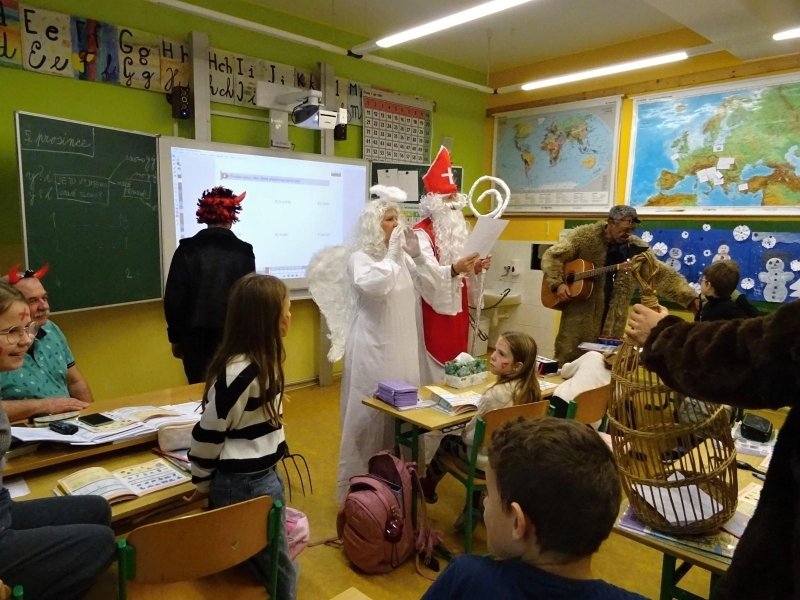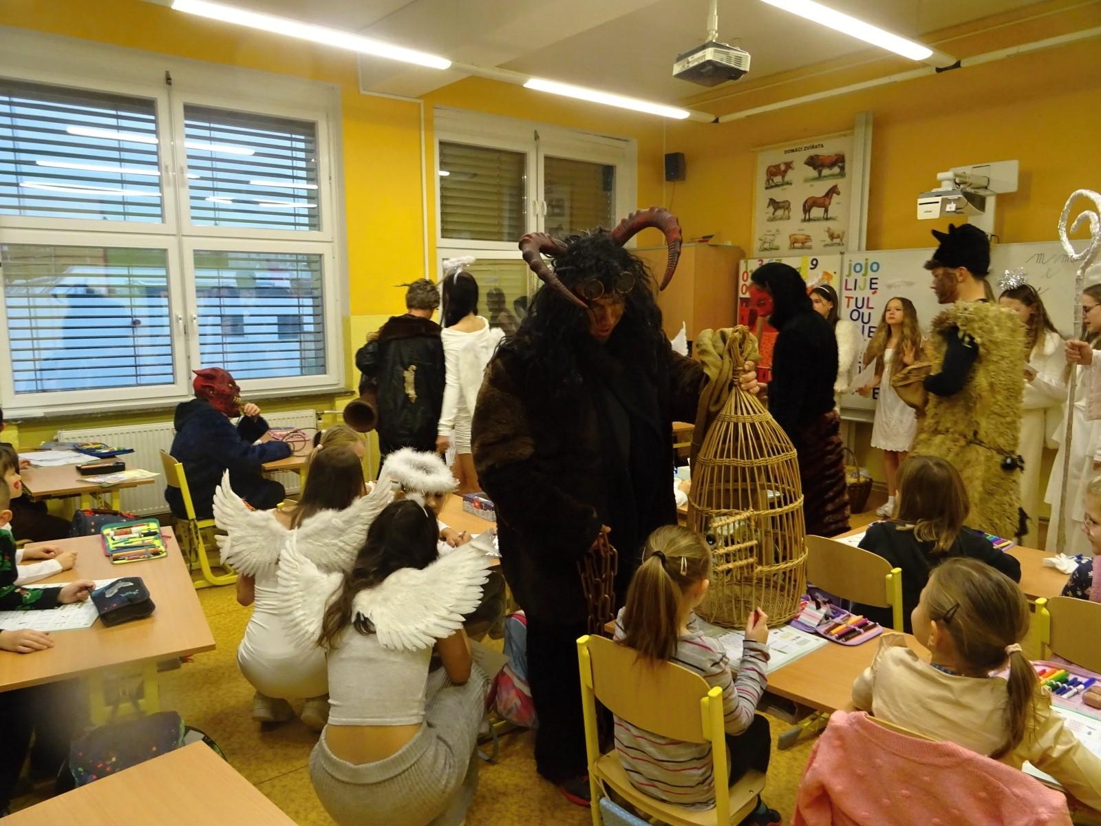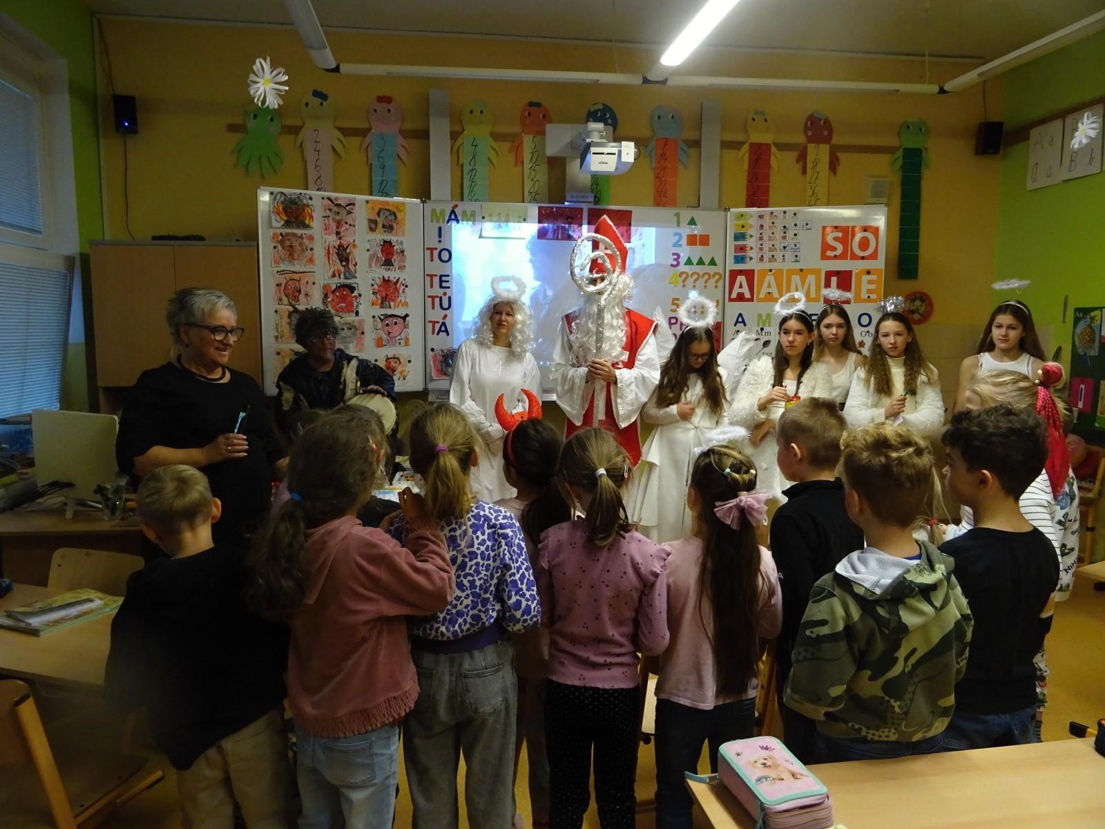 V pátek 5. prosince zavítal do naší školy Mikuláš se svou andělskou i čertovskou družinou, aby potěšil žáky a zpříjemnil jim dopoledne. Navštívil 1., 2. a 3. třídu a neplánovaně se zastavil také u čtvrťáků, kteří jeho příchod nadšeně uvítali. V každé třídě otevřel svou „Knihu hříchů“ a vyhledal několik největších hříšníků, kteří se museli vykoupit písničkou. Děti se úkolu ujaly s úsměvem a statečně zazpívaly před svými spolužáky. Atmosféra byla veselá, přátelská a naplněná očekáváním. Na závěr návštěvy předal Mikuláš každému žákovi malý dáreček.