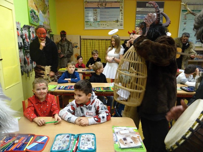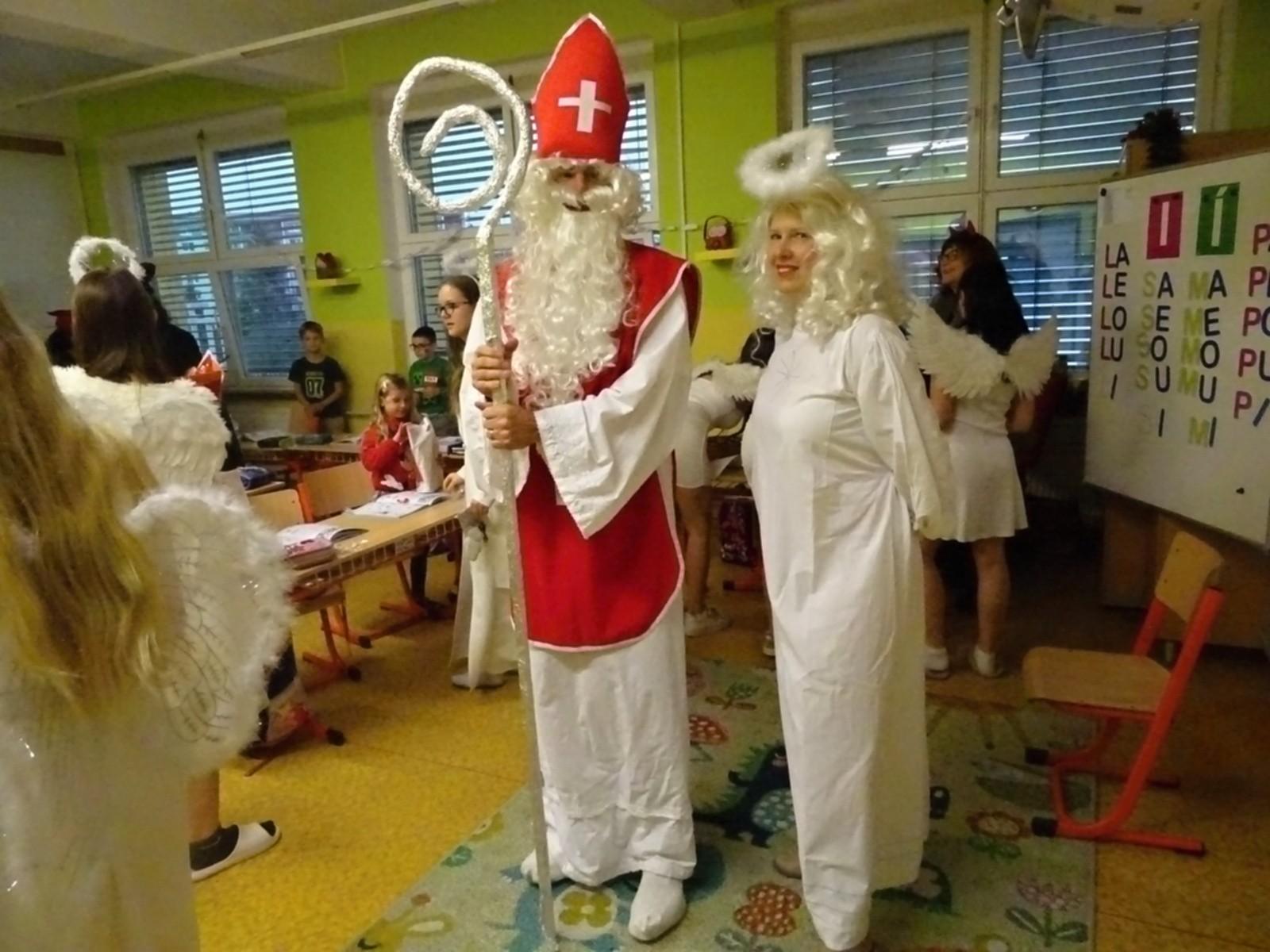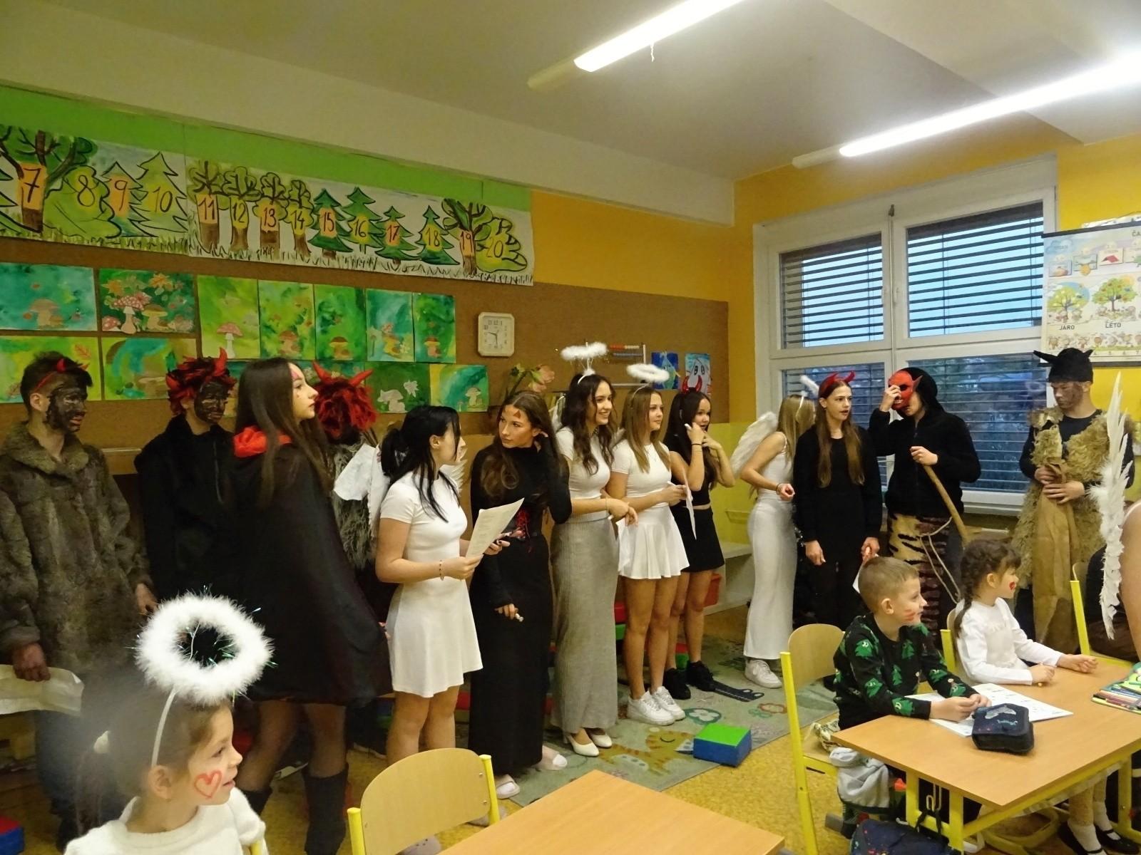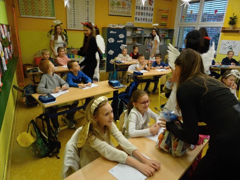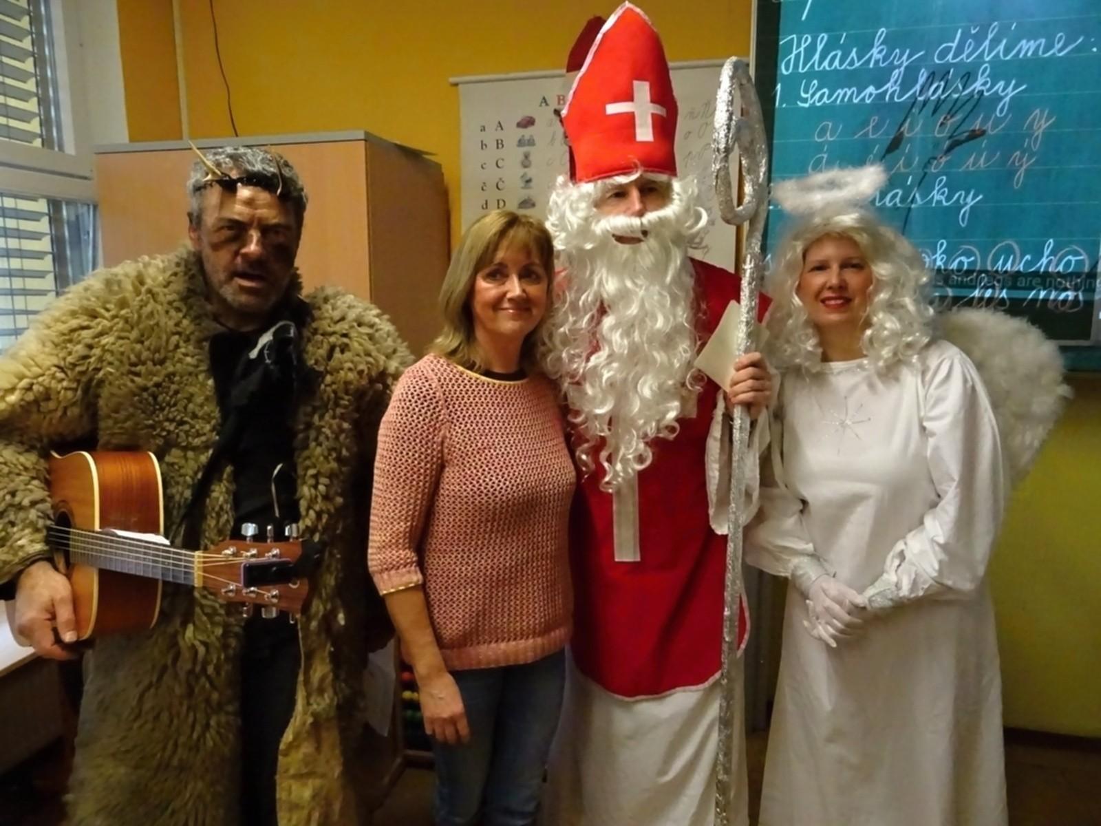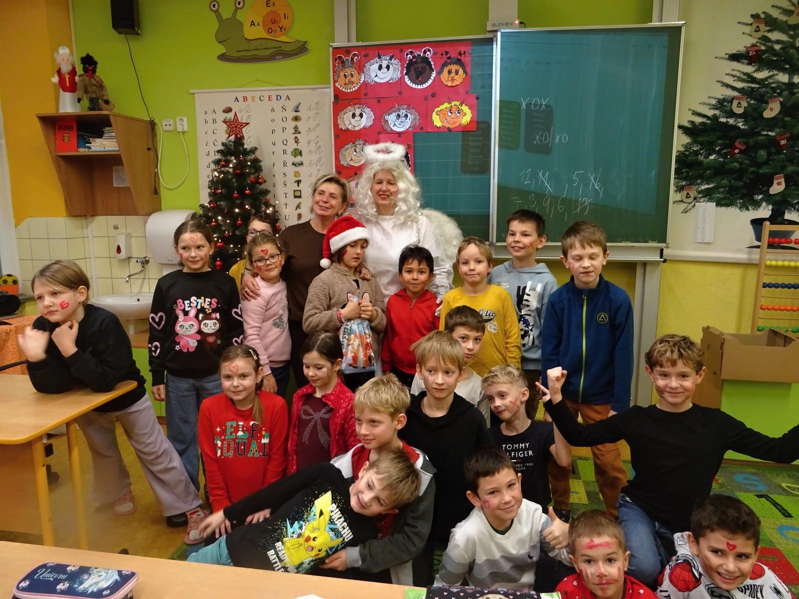 V pátek 5. prosince zavítal do naší školy Mikuláš se svou andělskou i čertovskou družinou, aby potěšil žáky a zpříjemnil jim dopoledne. Navštívil 1., 2. a 3. třídu a neplánovaně se zastavil také u čtvrťáků, kteří jeho příchod nadšeně uvítali. V každé třídě otevřel svou „Knihu hříchů“ a vyhledal několik největších hříšníků, kteří se museli vykoupit písničkou. Děti se úkolu ujaly s úsměvem a statečně zazpívaly před svými spolužáky. Atmosféra byla veselá, přátelská a naplněná očekáváním. Na závěr návštěvy předal Mikuláš každému žákovi malý dáreček.