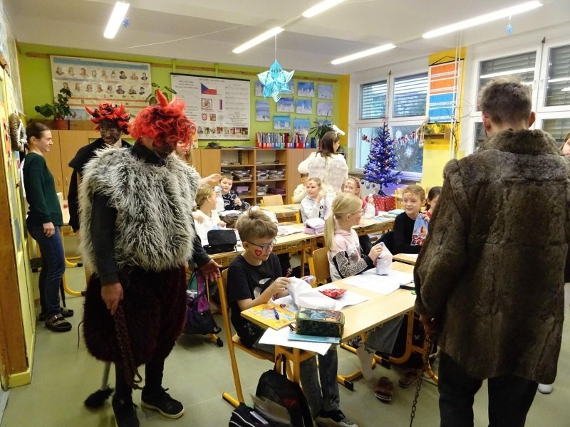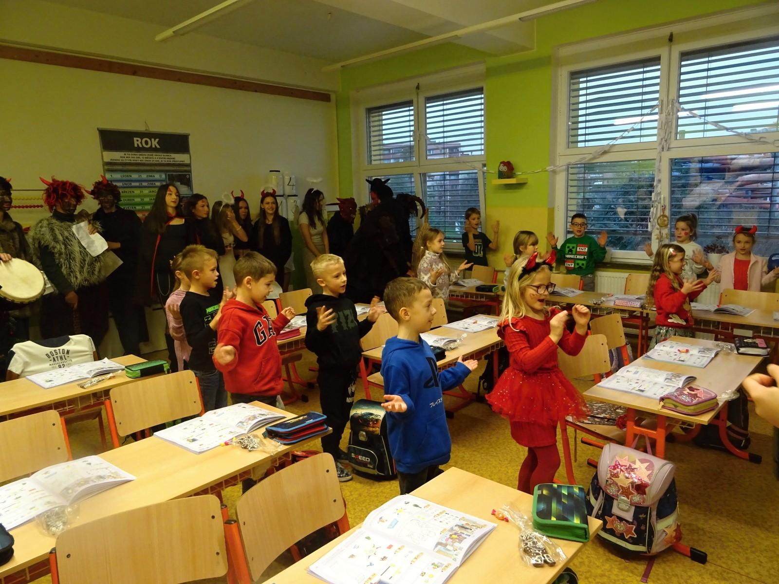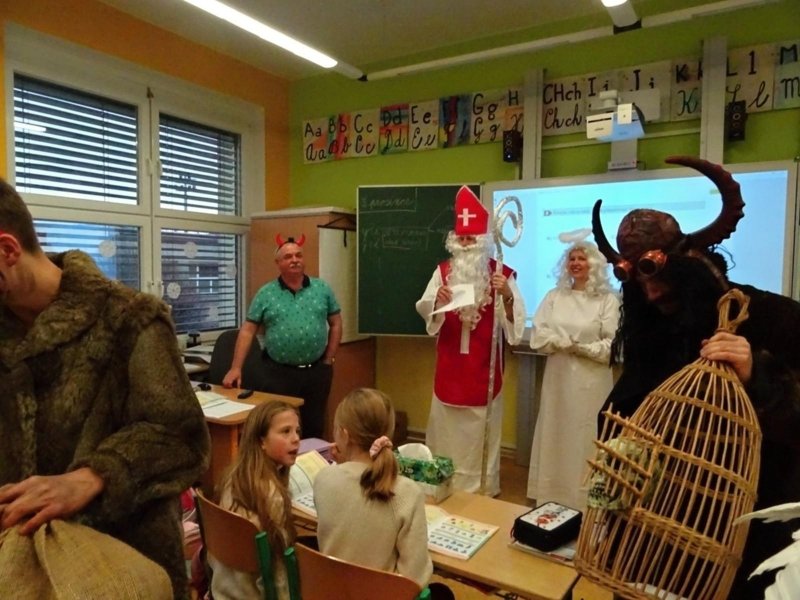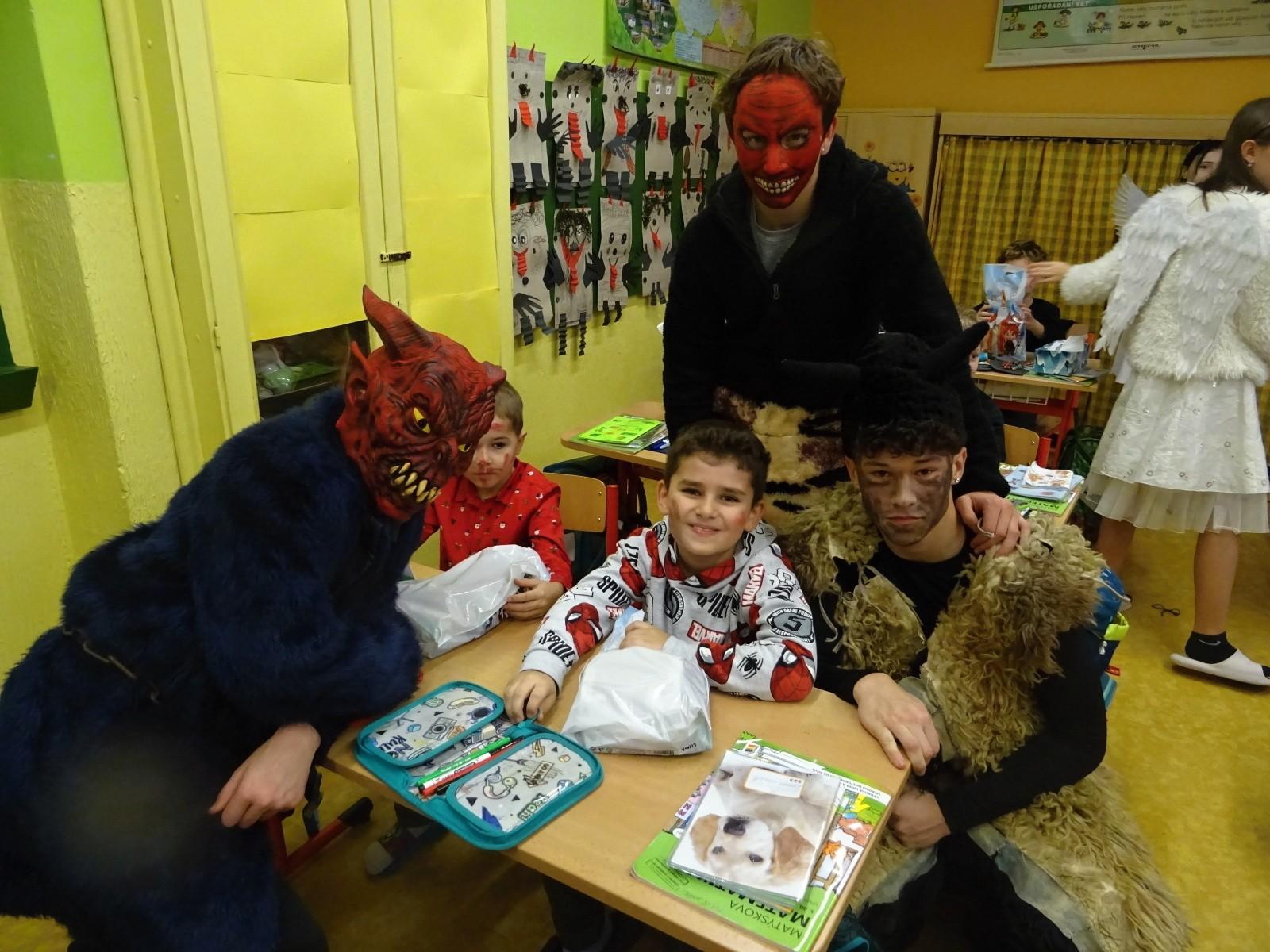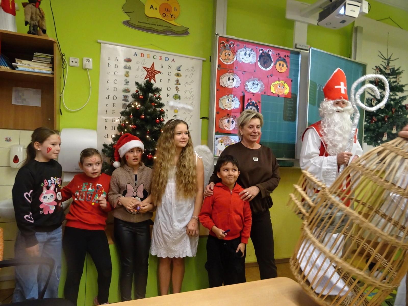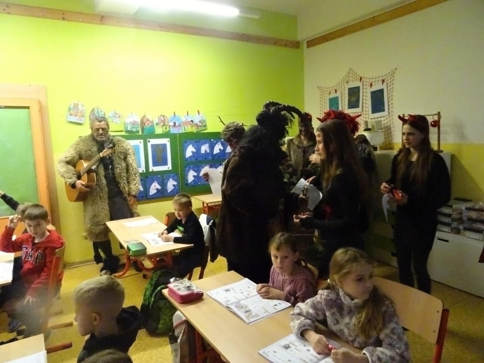 V pátek 5. prosince zavítal do naší školy Mikuláš se svou andělskou i čertovskou družinou, aby potěšil žáky a zpříjemnil jim dopoledne. Navštívil 1., 2. a 3. třídu a neplánovaně se zastavil také u čtvrťáků, kteří jeho příchod nadšeně uvítali. V každé třídě otevřel svou „Knihu hříchů“ a vyhledal několik největších hříšníků, kteří se museli vykoupit písničkou. Děti se úkolu ujaly s úsměvem a statečně zazpívaly před svými spolužáky. Atmosféra byla veselá, přátelská a naplněná očekáváním. Na závěr návštěvy předal Mikuláš každému žákovi malý dáreček.