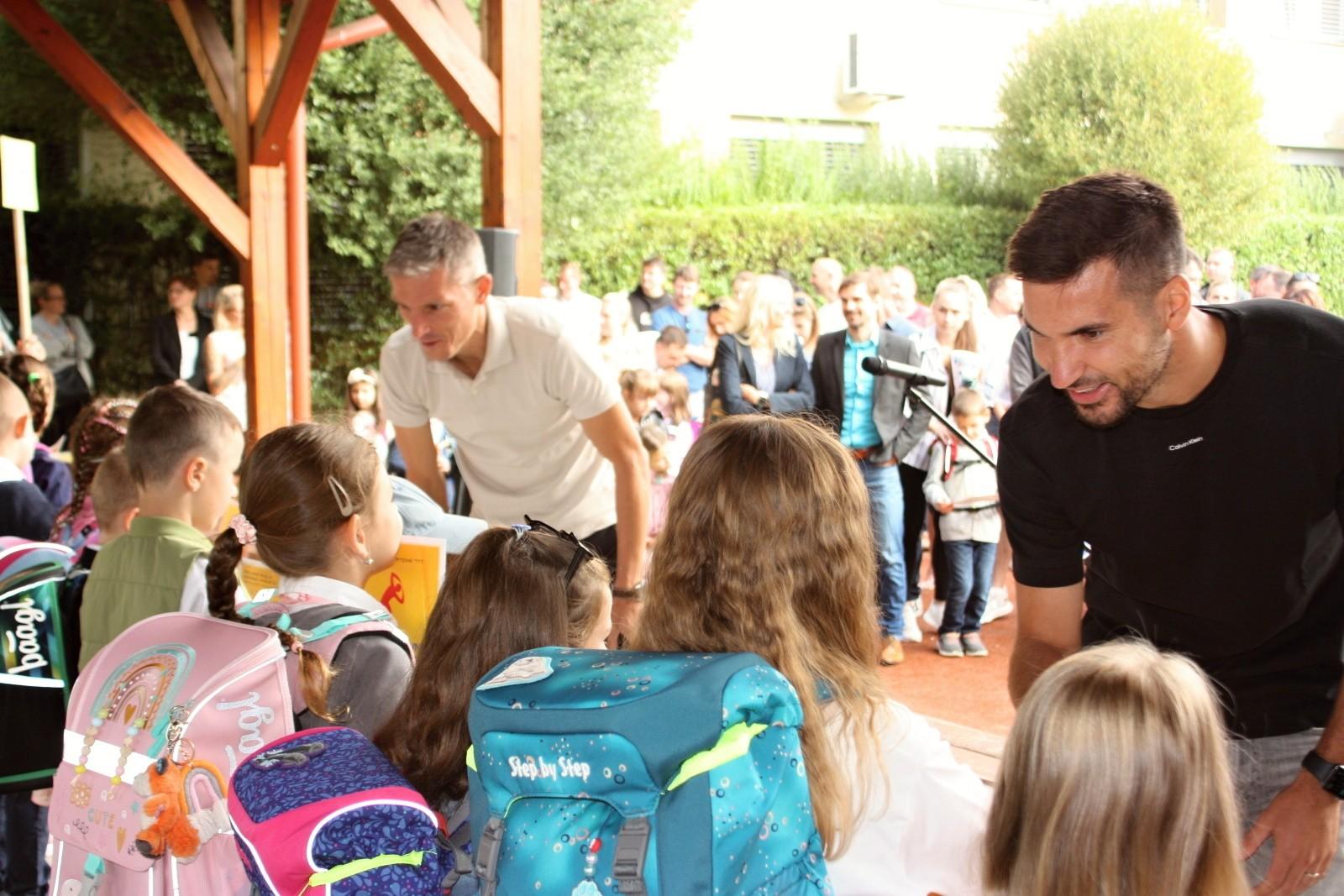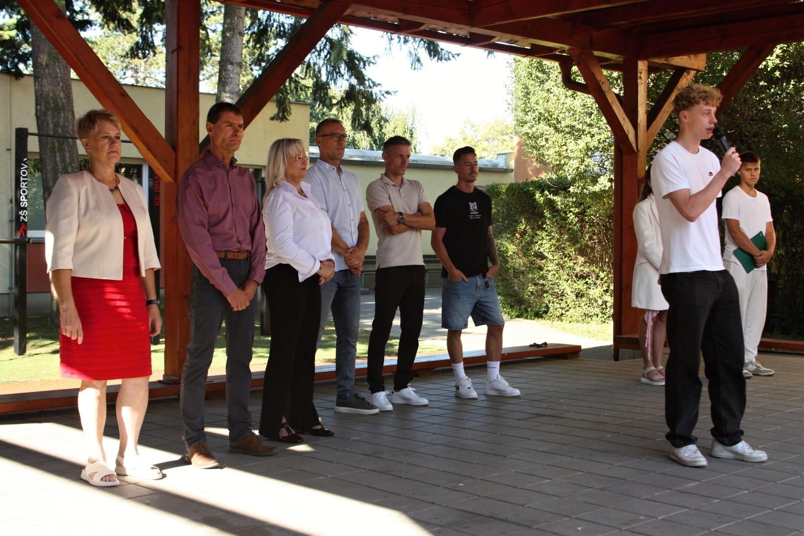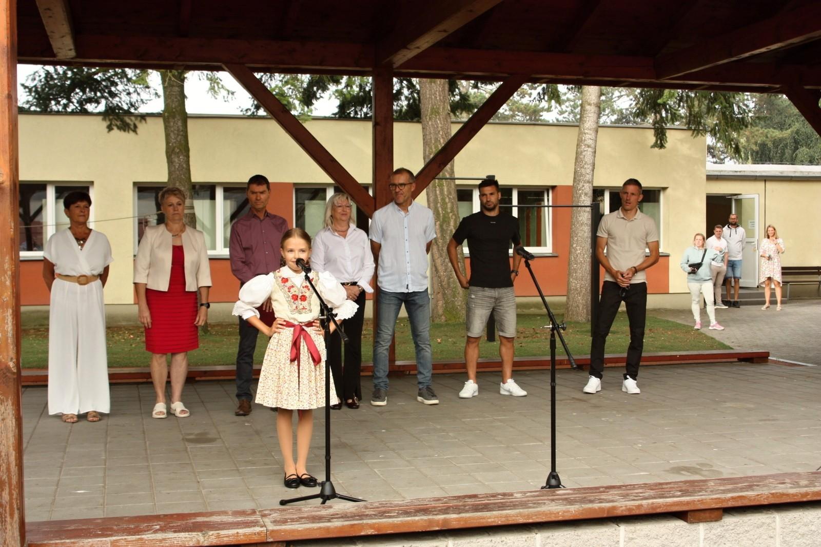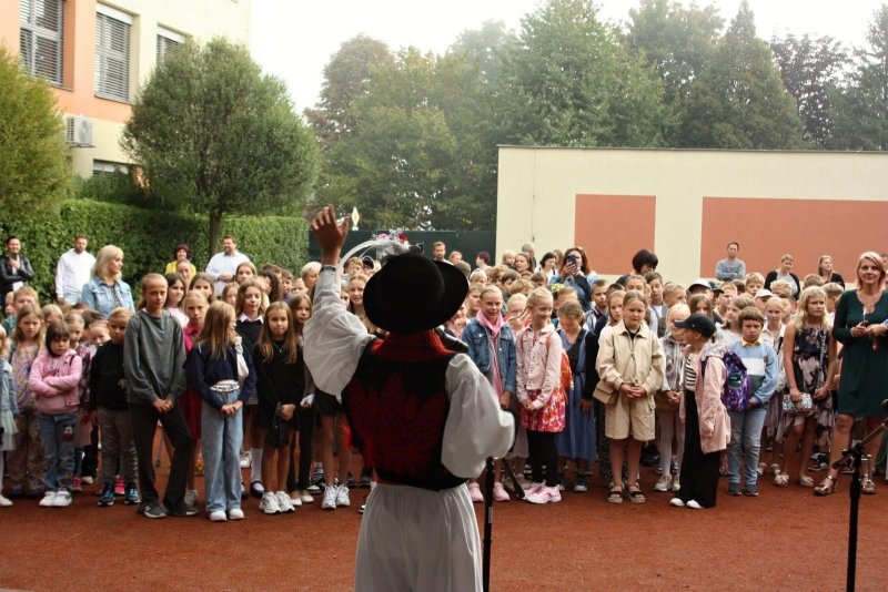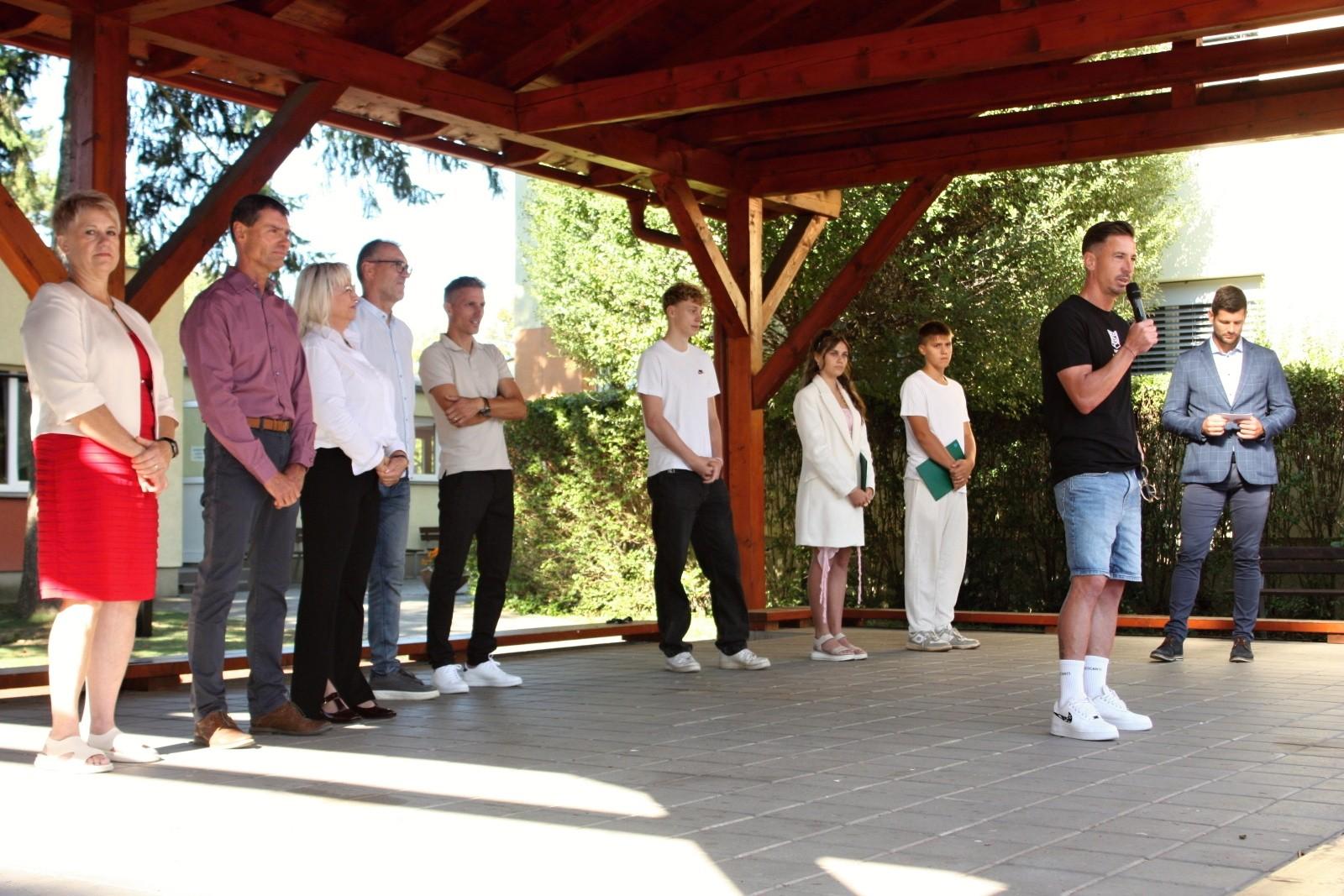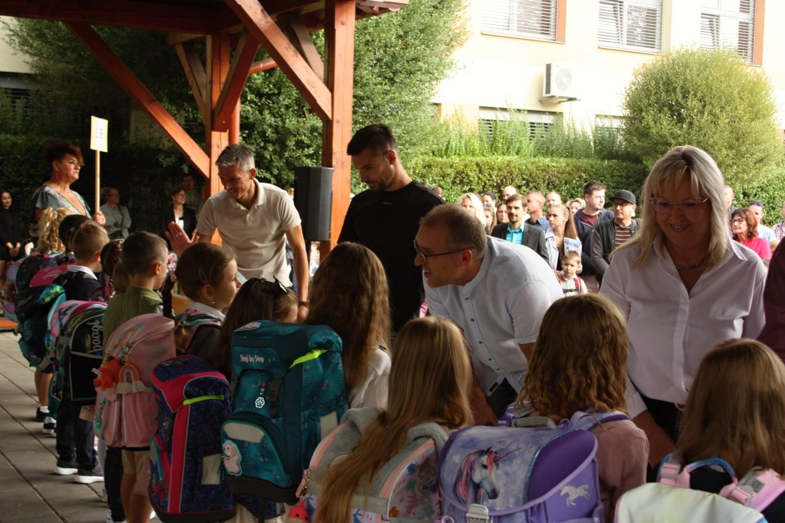Barunka Janků a Damián Prášek v úvodu zazpívali na lidovou notu. Poté již všechny žáky a pedagogy přivítala paní místostarostka Pavlína Jagošová, pan ředitel a zástupci 1. FC Slovácko – trenér Jan Kameník, šéftrenér mládeže pan Marek Hábl, kapitán mužů Michal Trávník a hráč Milan Petržela. Letos se poprvé našeho zahájení zúčastnil i vynikající atlet, odchovanec uherskohradišťské atletiky a náš bývalý žák, Petr Meindlschmid, který se stal nedávno juniorským mistrem Evropy ve skoku do dálky.