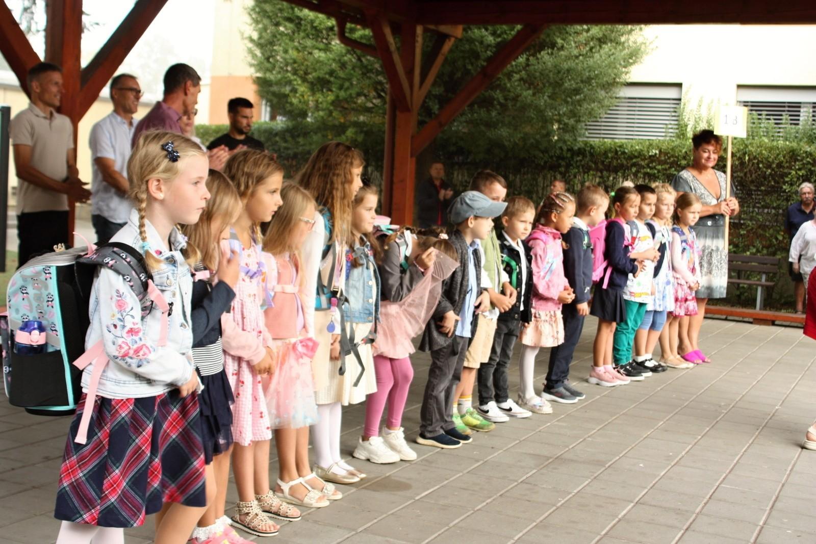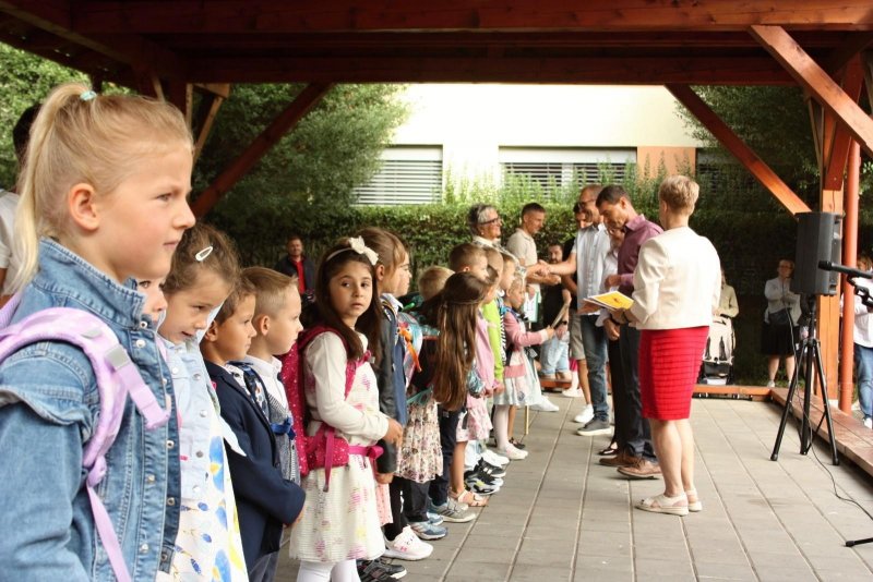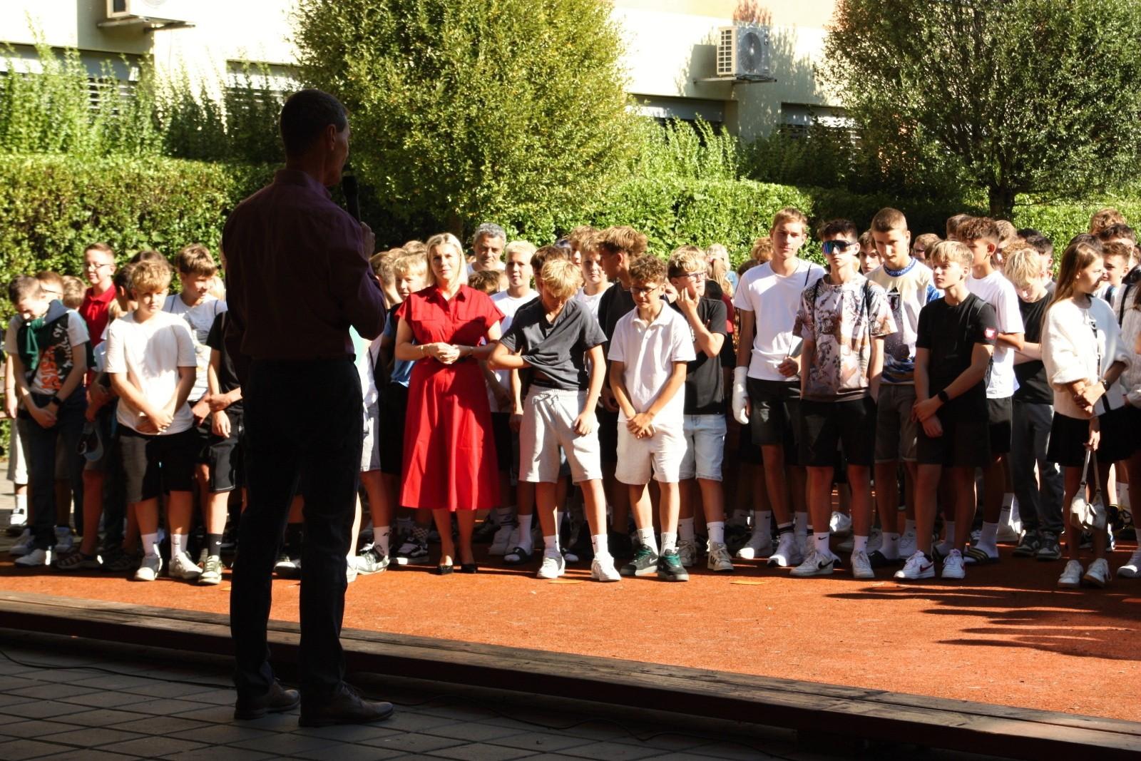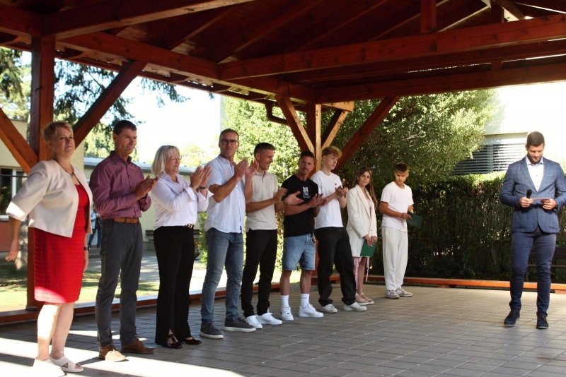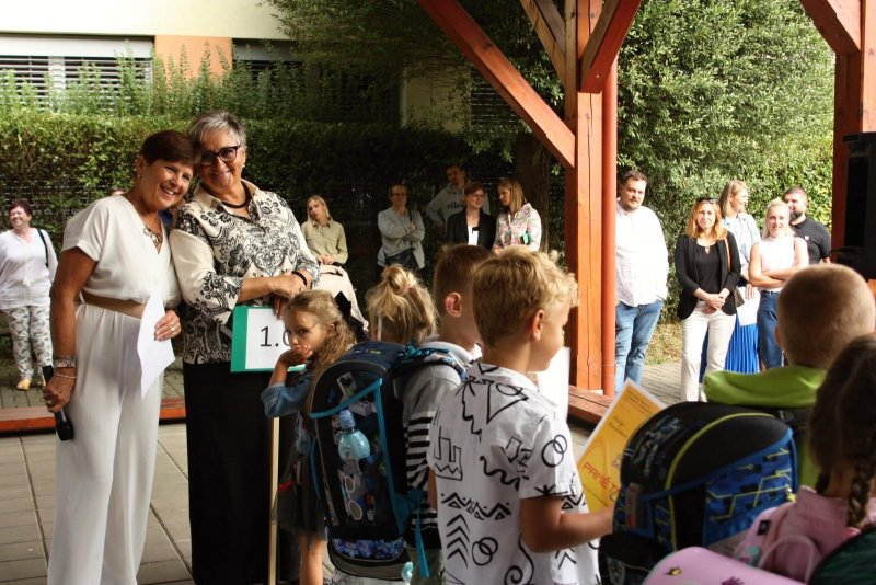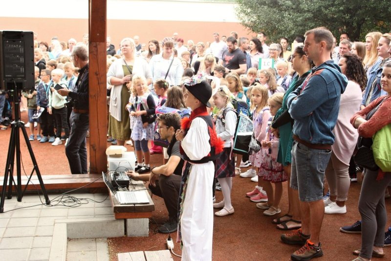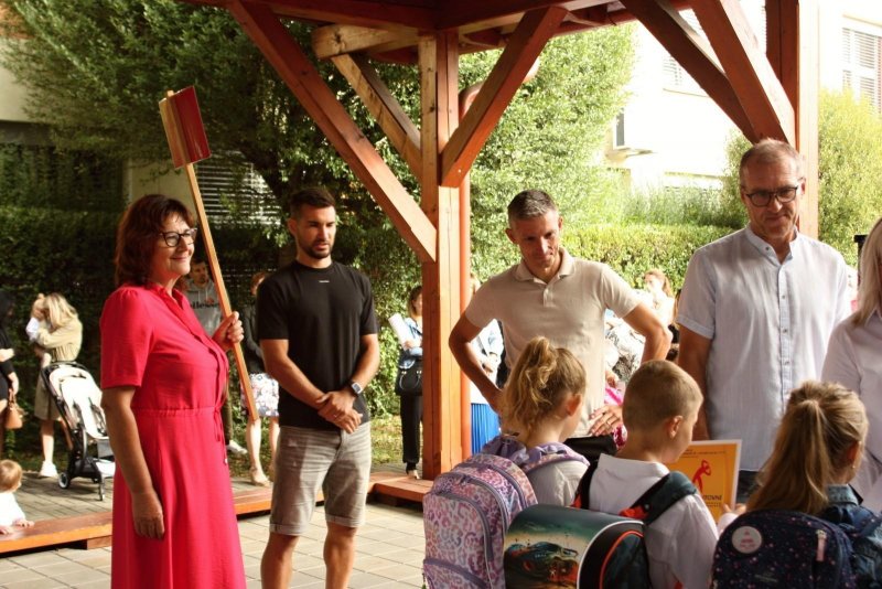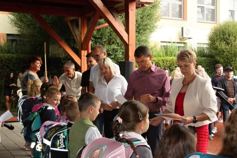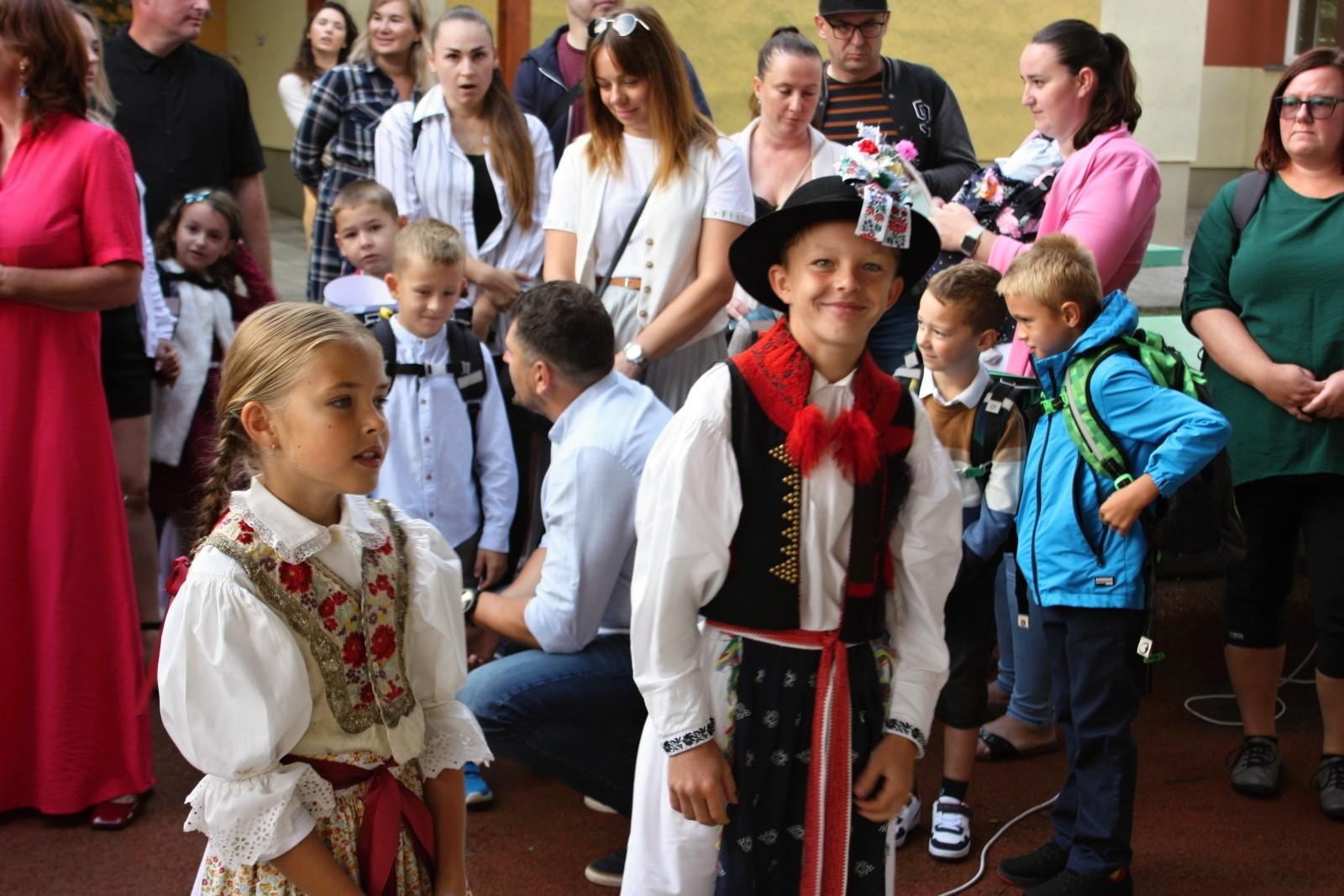 Barunka Janků a Damián Prášek v úvodu zazpívali na lidovou notu. Poté již všechny žáky a pedagogy přivítala paní místostarostka Pavlína Jagošová, pan ředitel a zástupci 1. FC Slovácko – trenér Jan Kameník, šéftrenér mládeže pan Marek Hábl, kapitán mužů Michal Trávník a hráč Milan Petržela. Letos se poprvé našeho zahájení zúčastnil i vynikající atlet, odchovanec uherskohradišťské atletiky a náš bývalý žák, Petr Meindlschmid, který se stal nedávno juniorským mistrem Evropy ve skoku do dálky.