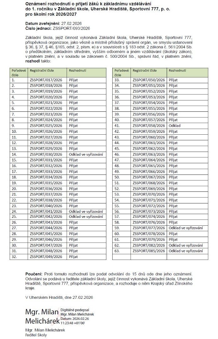 Oznámení rozhodnutí o přijetí žáků k základnímu vzdělávání do 1. ročníku v Základní škole, Uherské Hradiště, Sportovní 777, p. o. pro školní rok 2026/2027