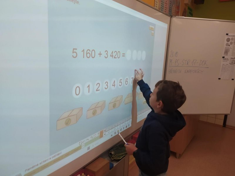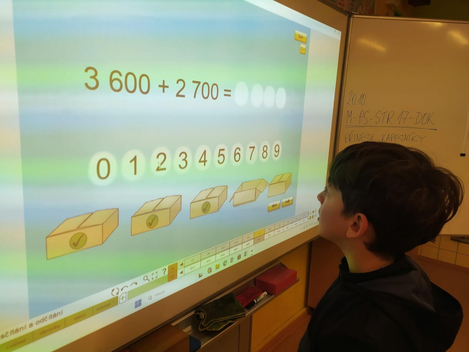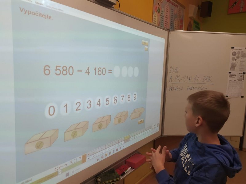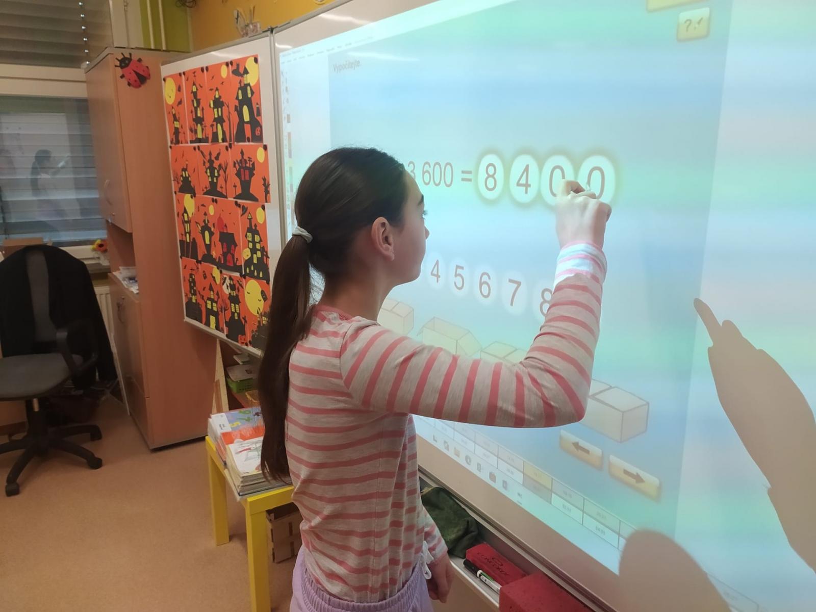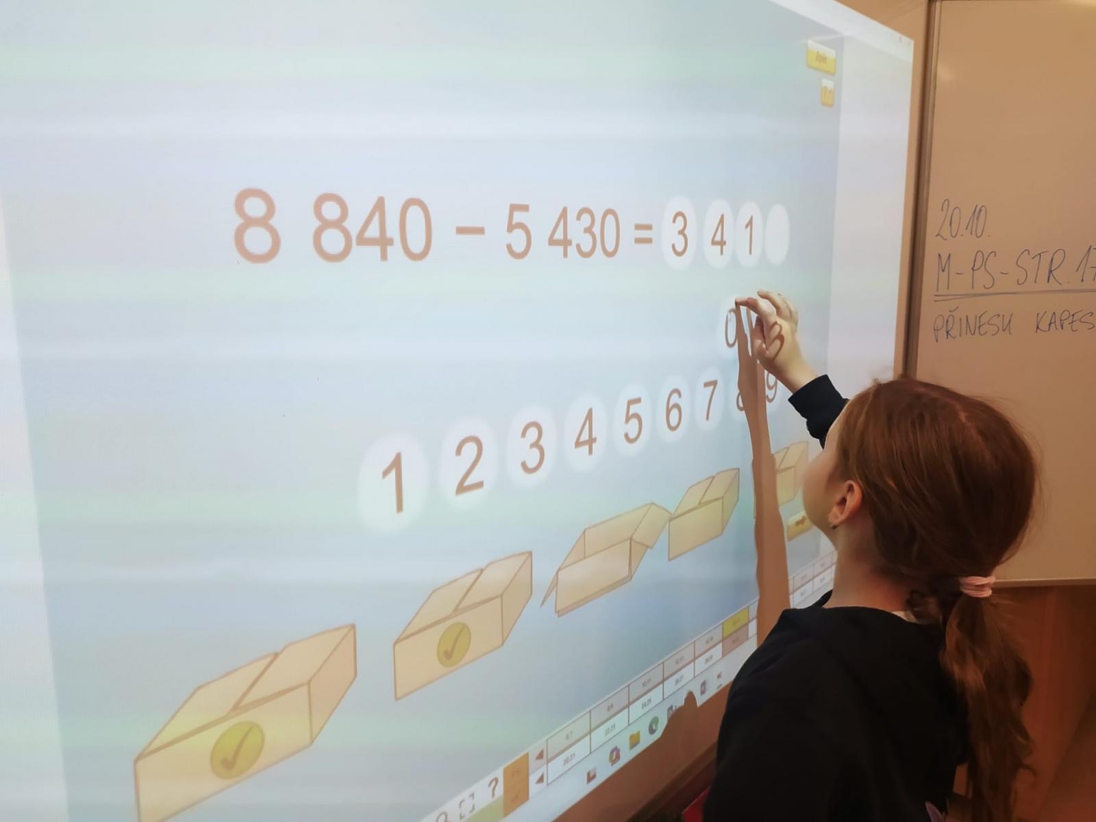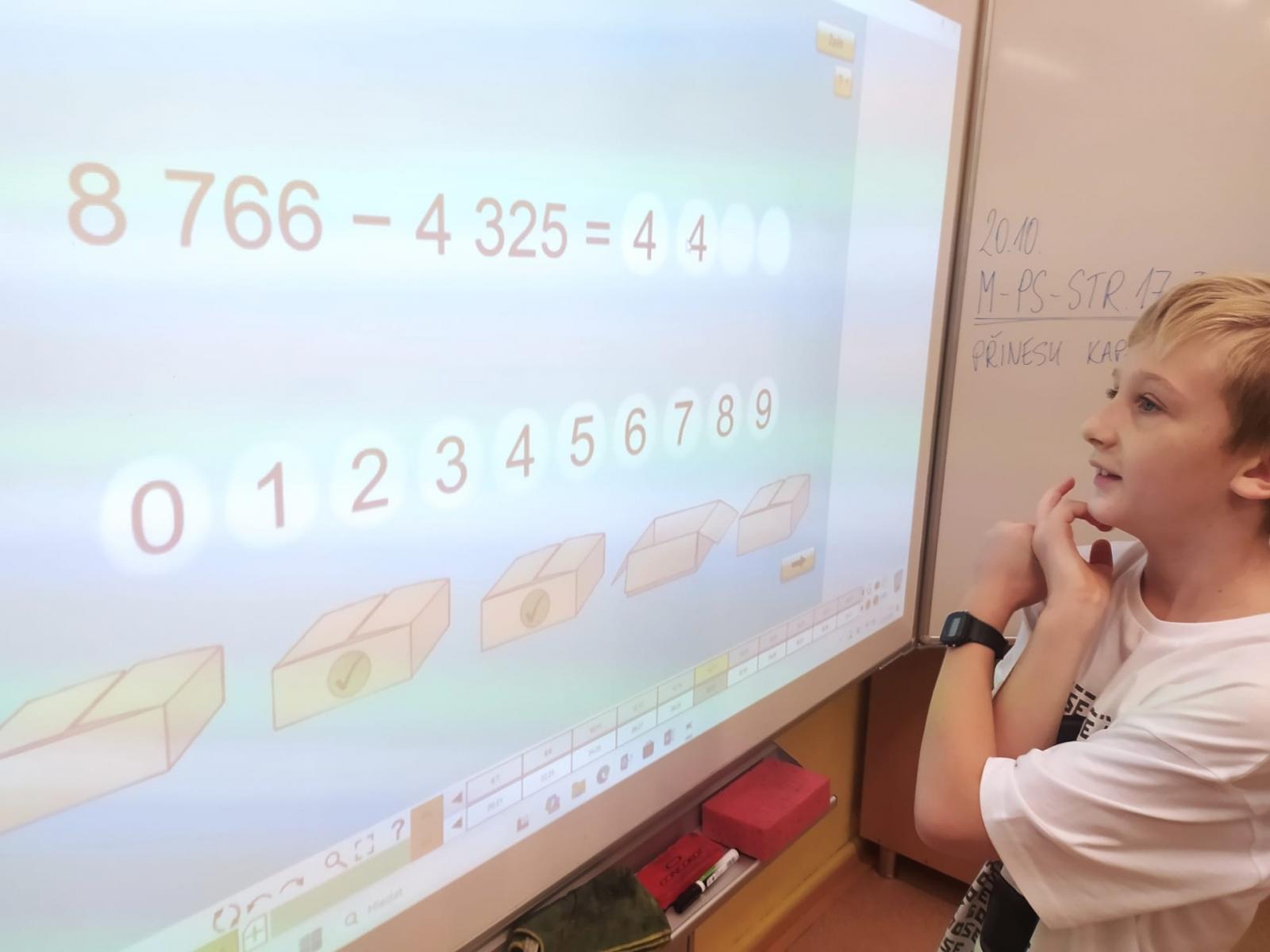 Radost nám dělá zprovozněná dotyková tabule, tak směle procvičujeme počítání do 10 000. Předháníme se, kdo půjde k tabuli a to je plno radosti z práce. Jen tak dál, moji čtvrťáci.