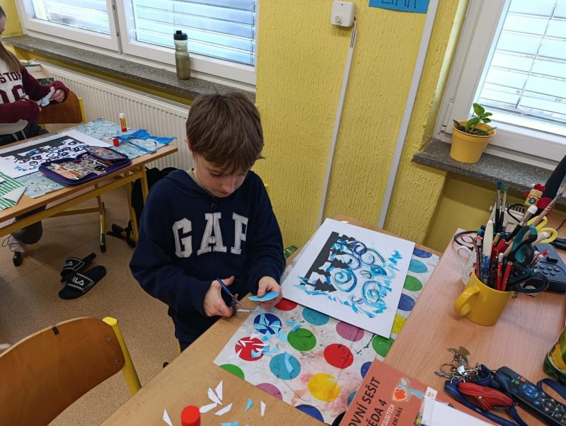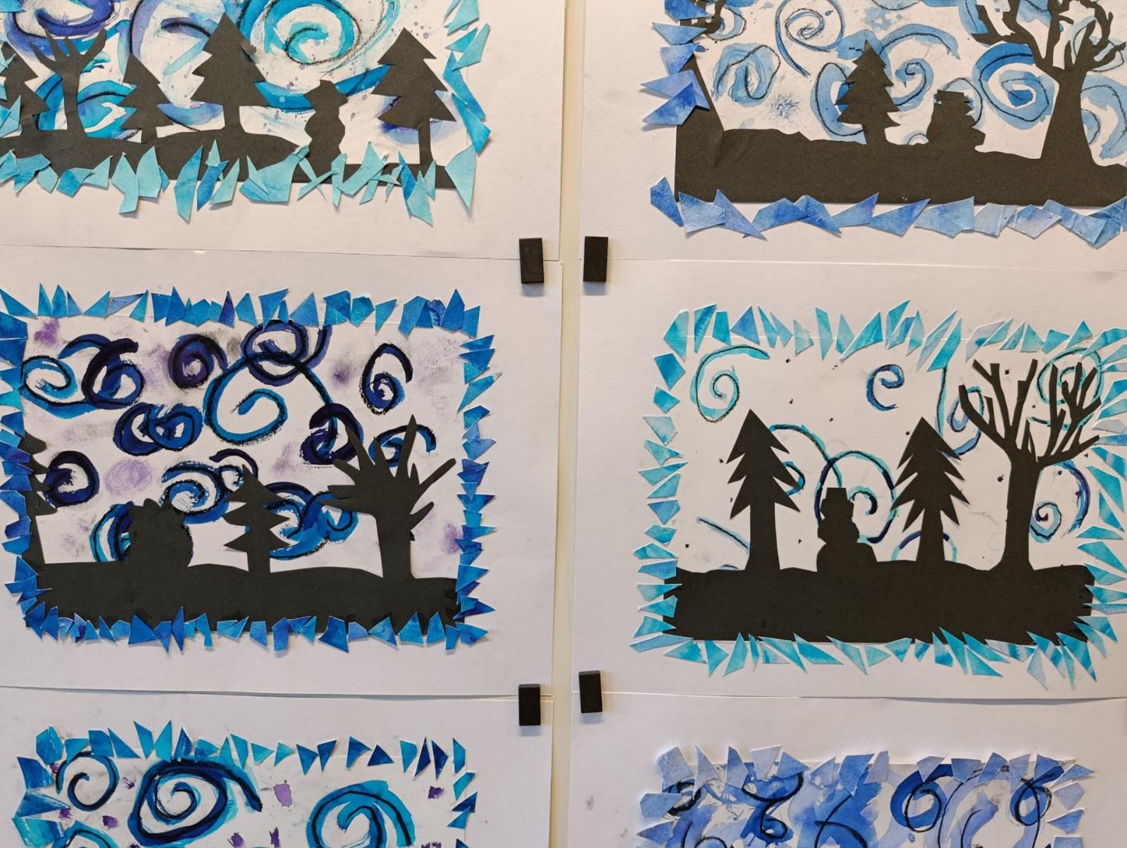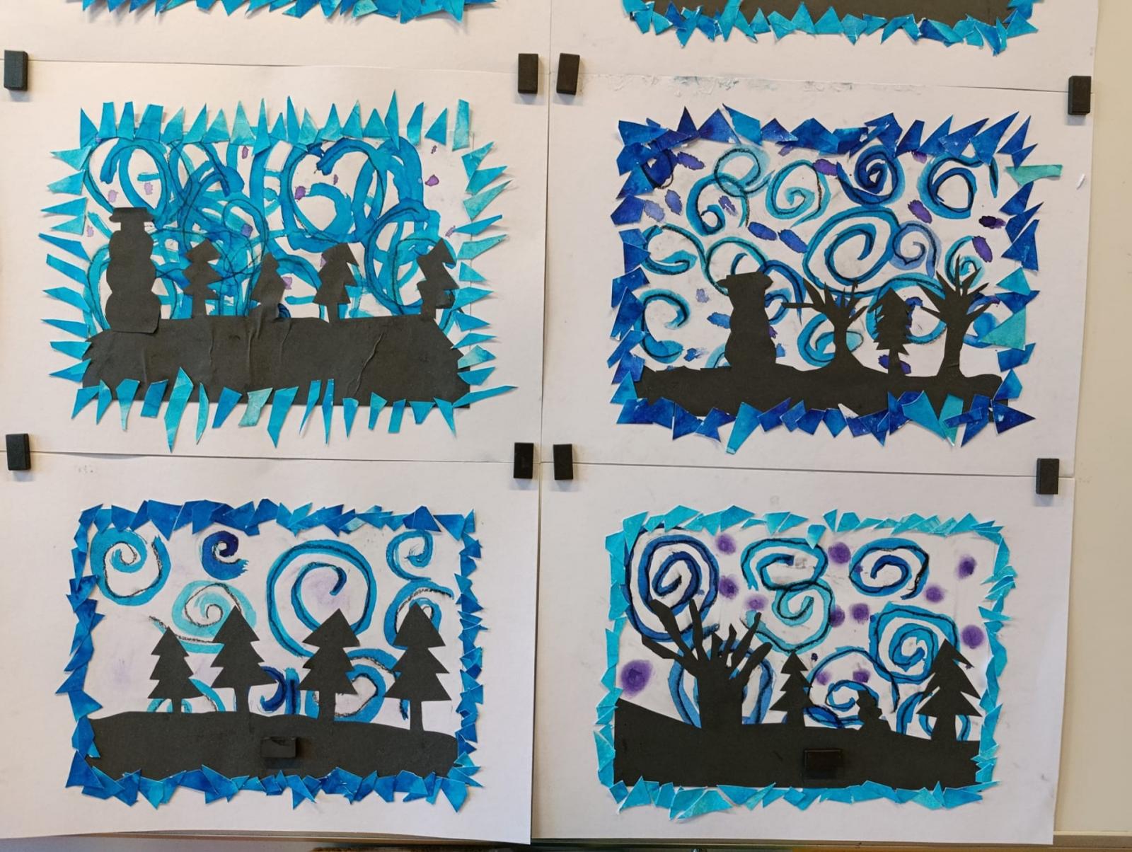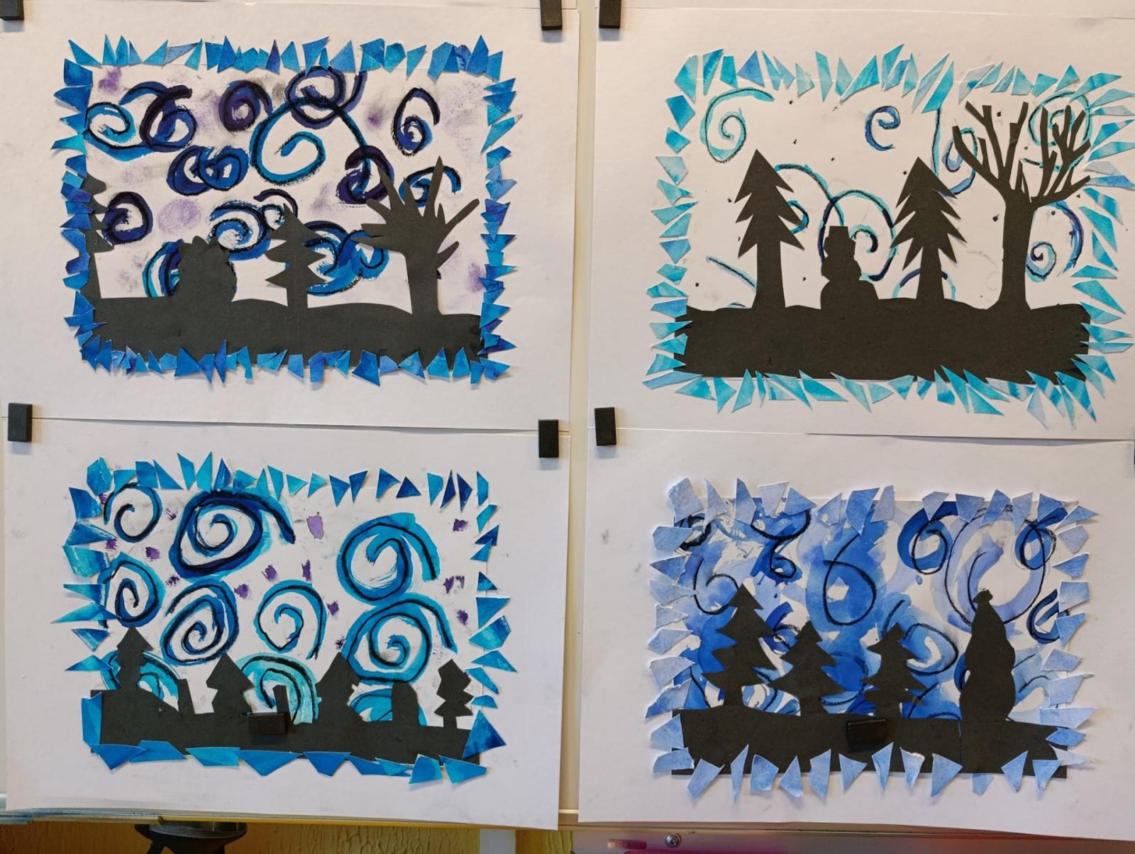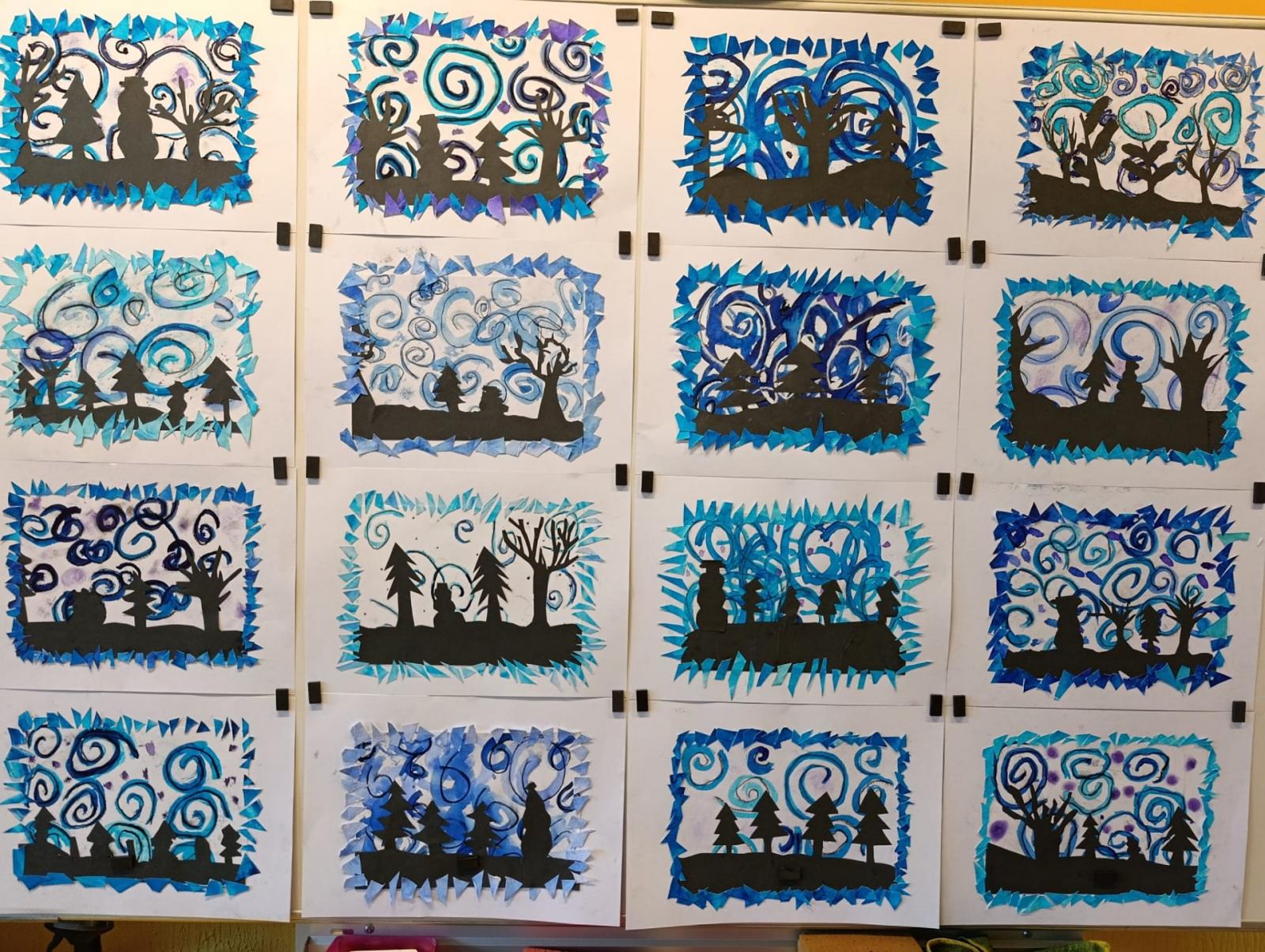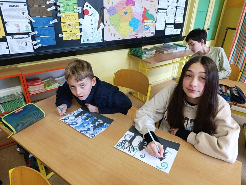 Silných studených větrů jsme si užili v poslední době dost a dost. Napadlo nás nakreslit si takovou nefalšovanou zimní bouři v lese. Na závěr jsme nalepili na paspartu a kolem přilepili ledové krystaly. Snad se nás už zima trochu lekne a jaro se přiblíží.