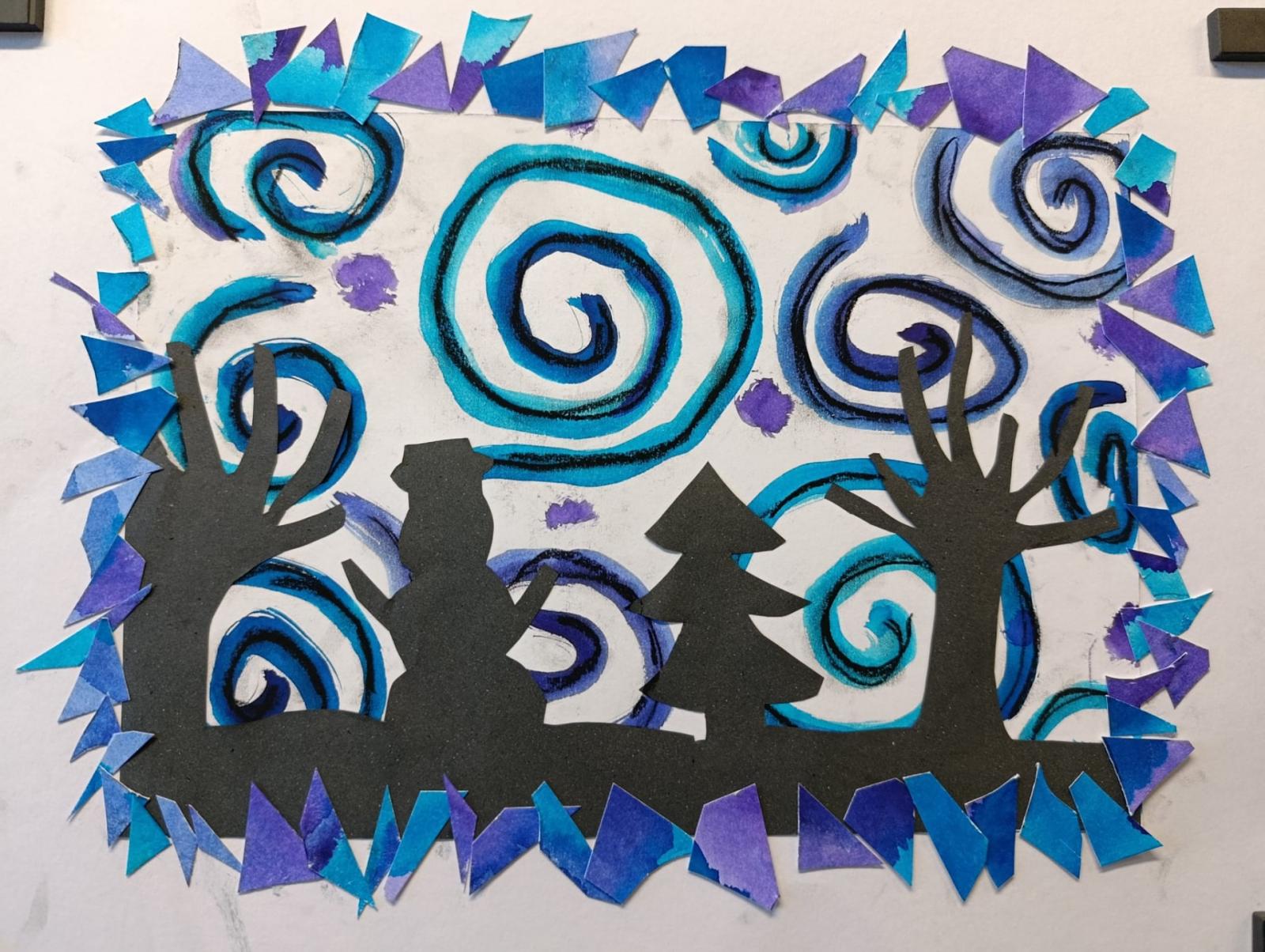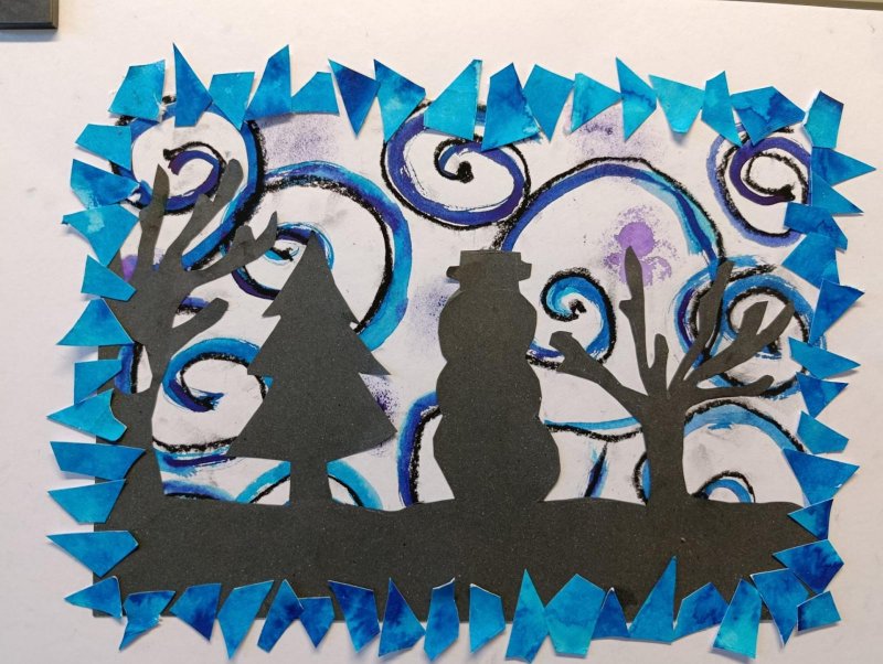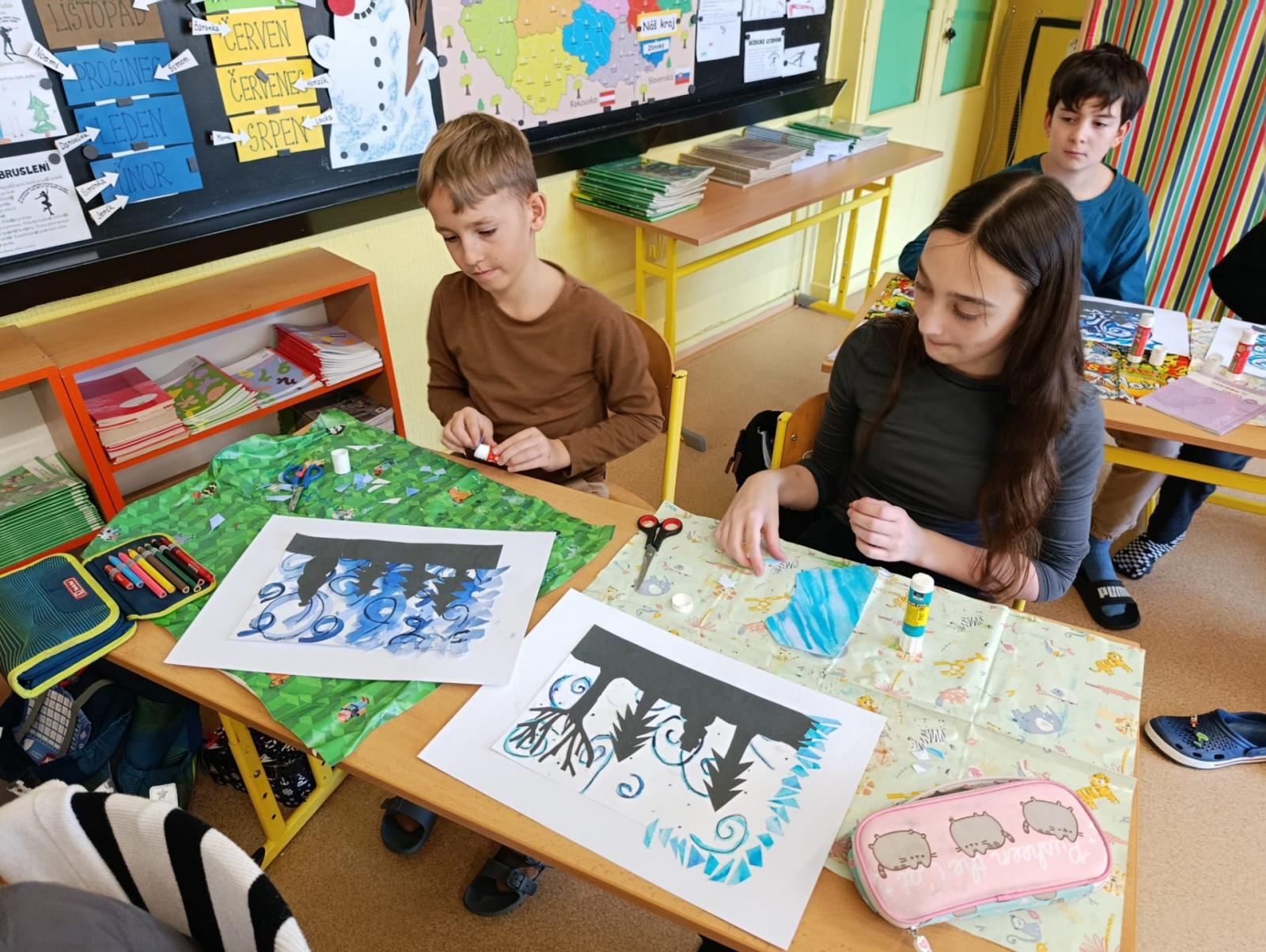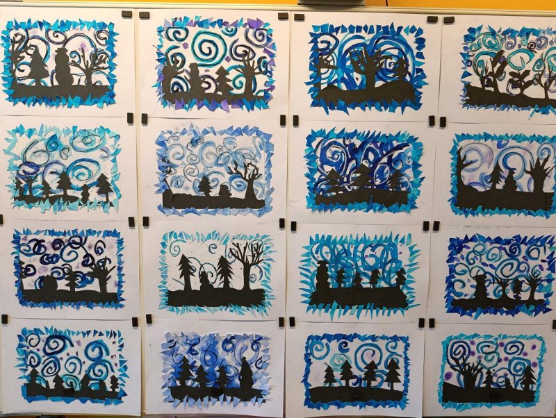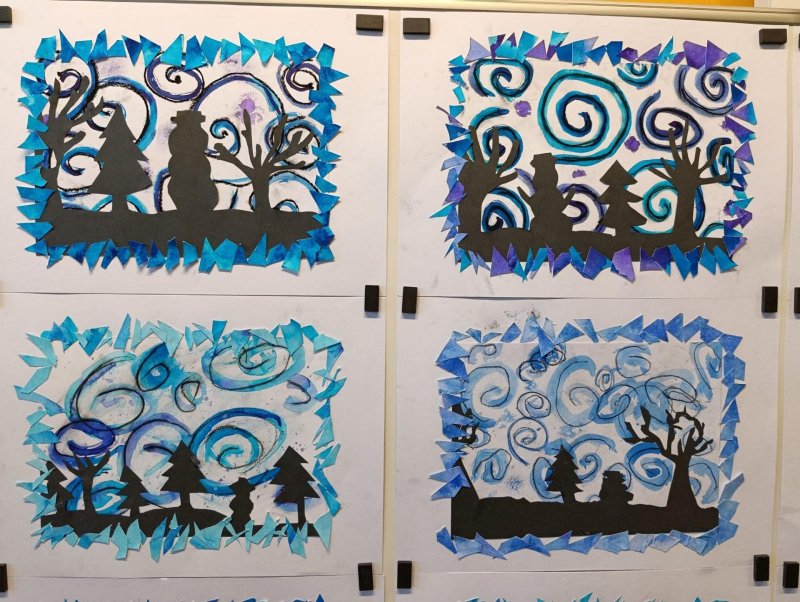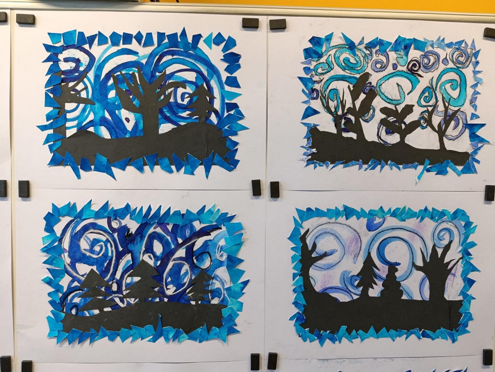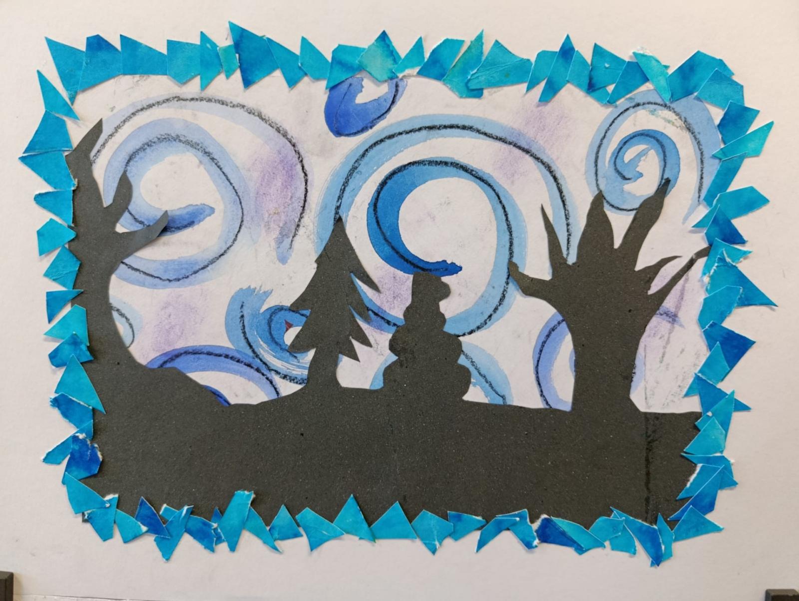 Silných studených větrů jsme si užili v poslední době dost a dost. Napadlo nás nakreslit si takovou nefalšovanou zimní bouři v lese. Na závěr jsme nalepili na paspartu a kolem přilepili ledové krystaly. Snad se nás už zima trochu lekne a jaro se přiblíží.