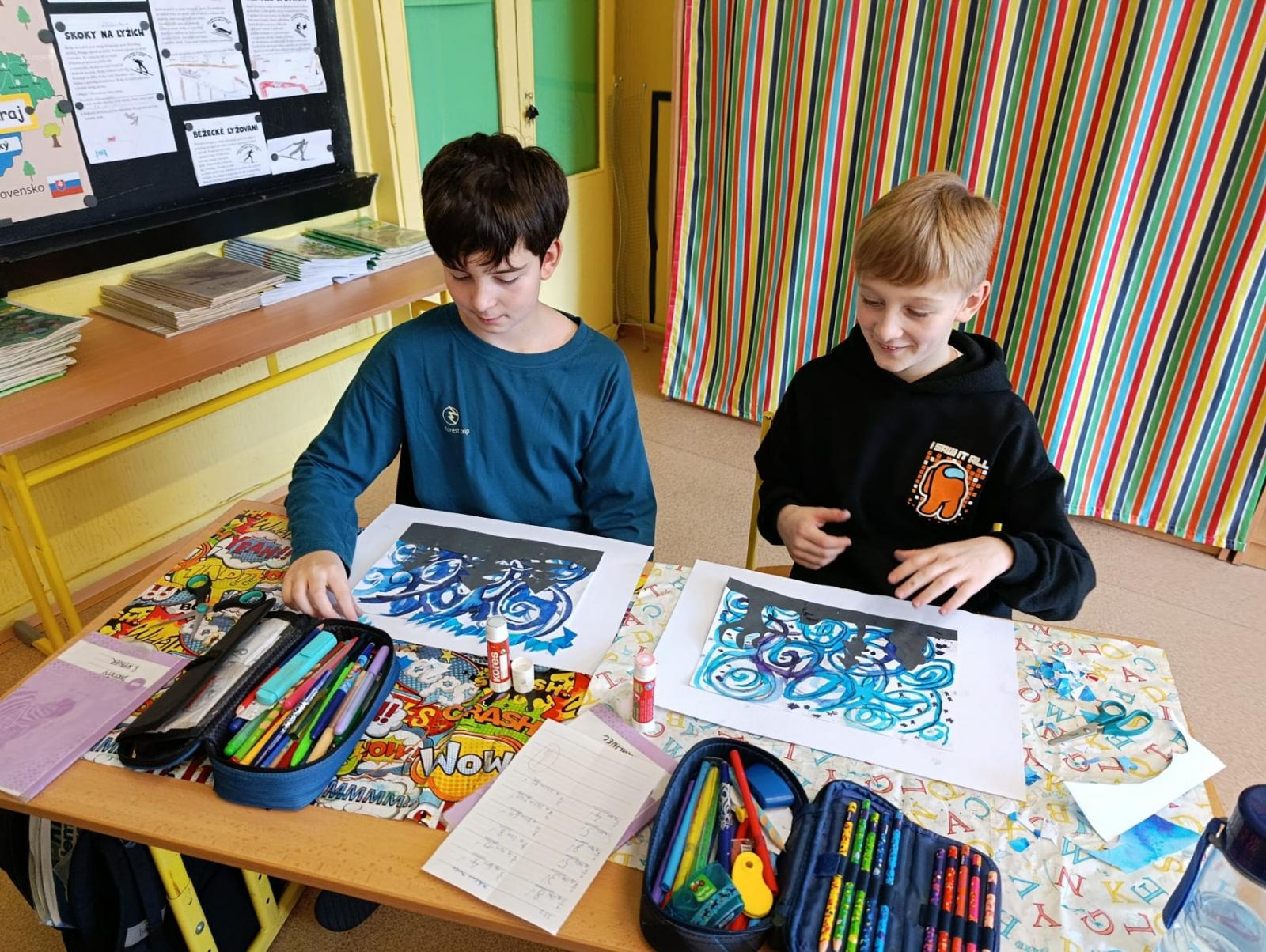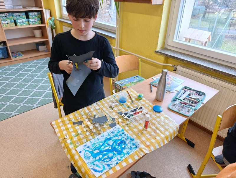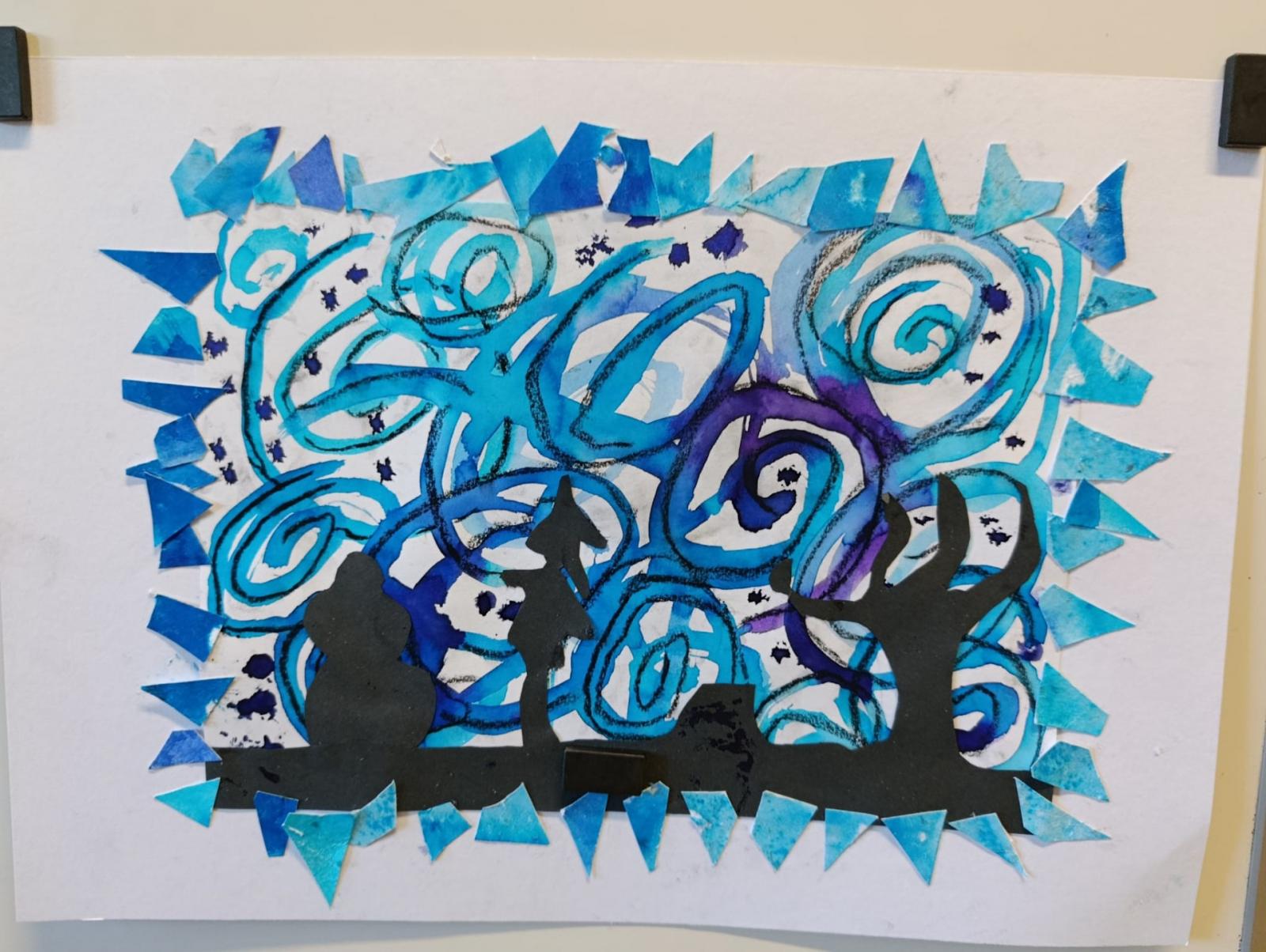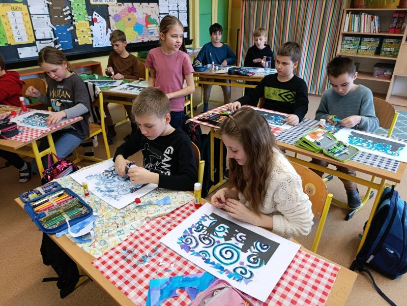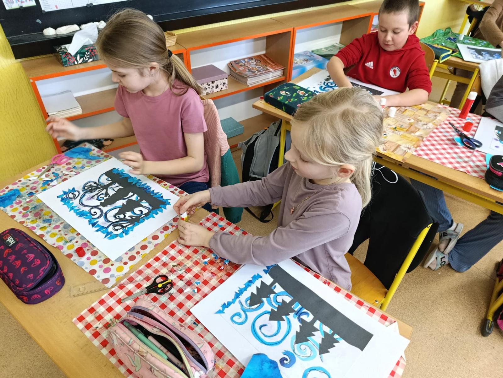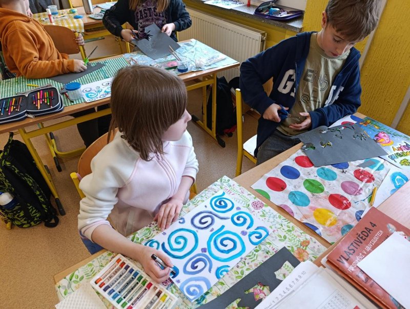 Silných studených větrů jsme si užili v poslední době dost a dost. Napadlo nás nakreslit si takovou nefalšovanou zimní bouři v lese. Na závěr jsme nalepili na paspartu a kolem přilepili ledové krystaly. Snad se nás už zima trochu lekne a jaro se přiblíží.