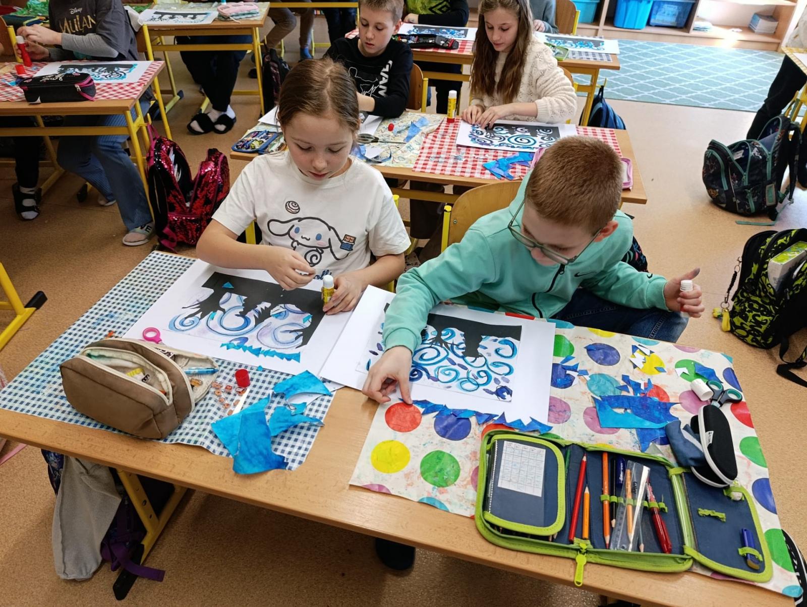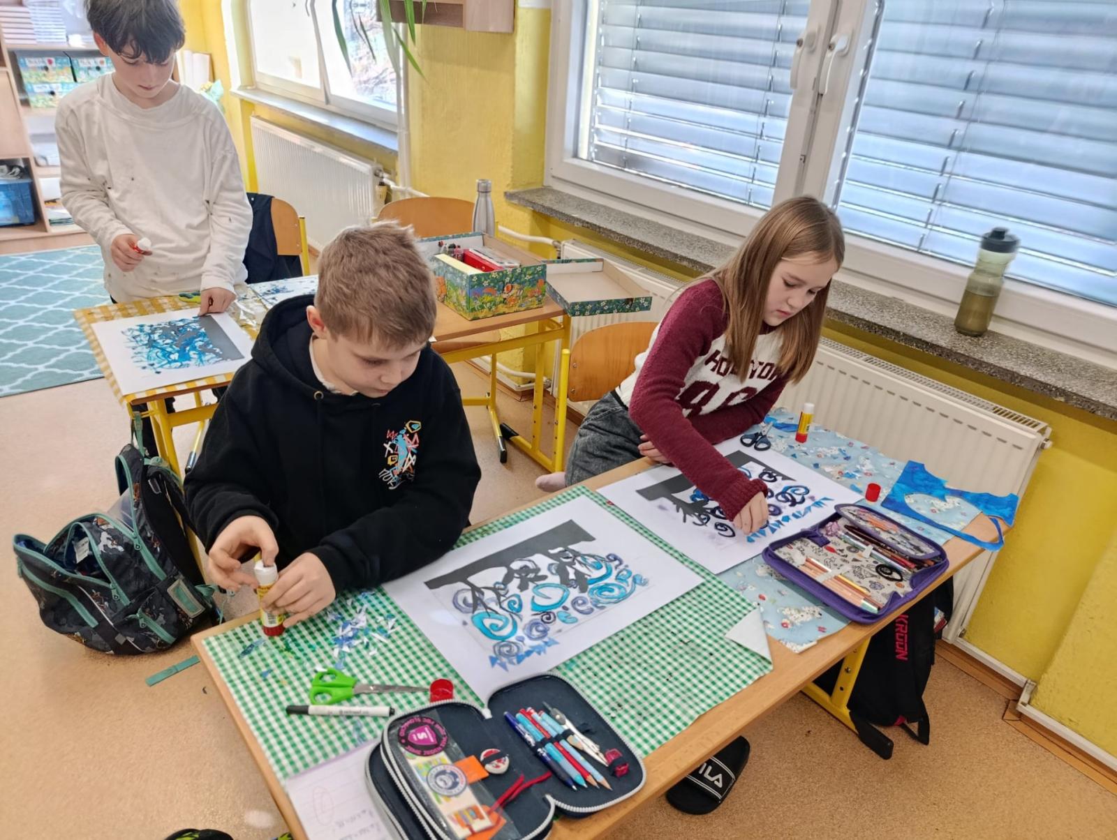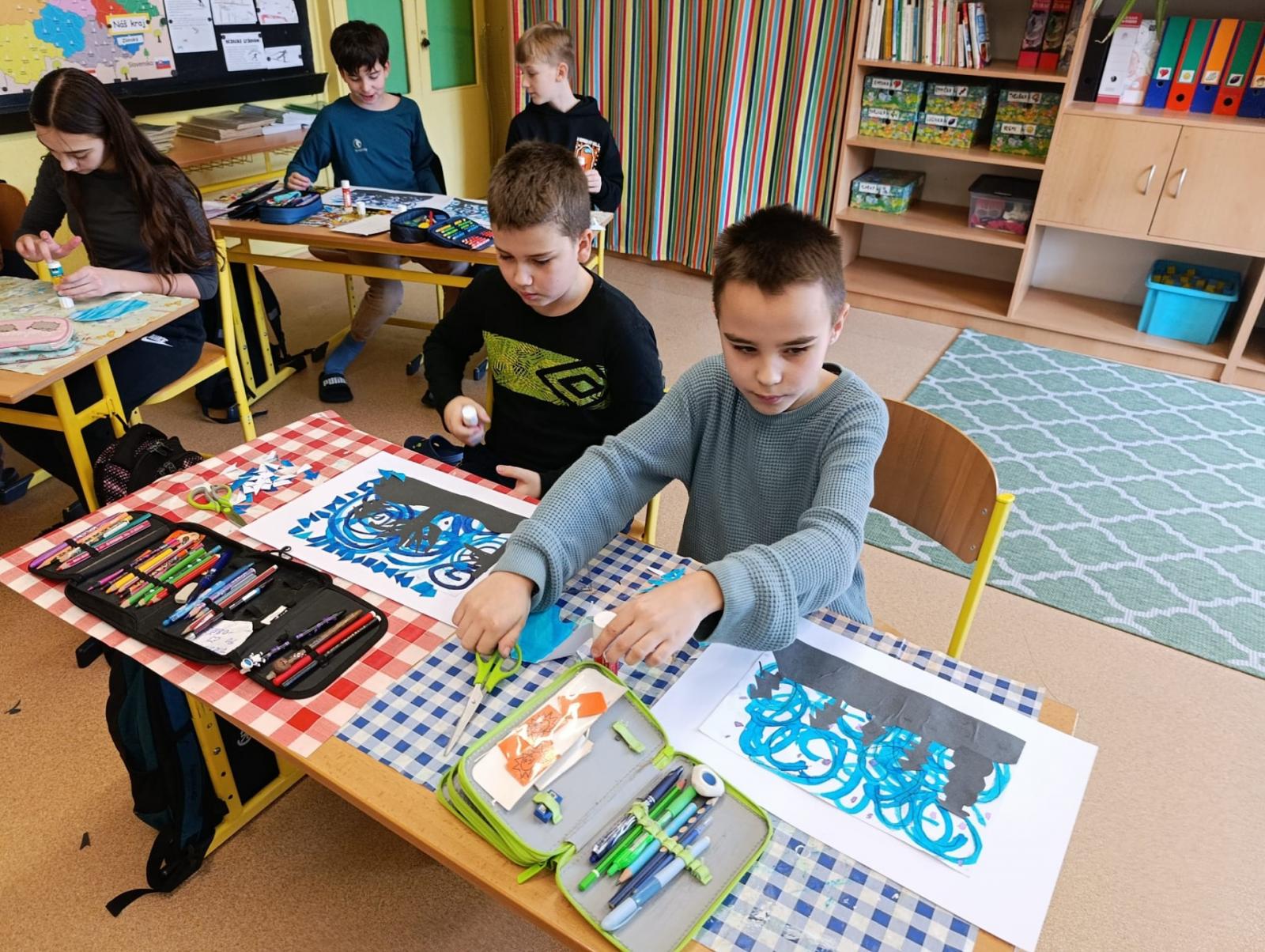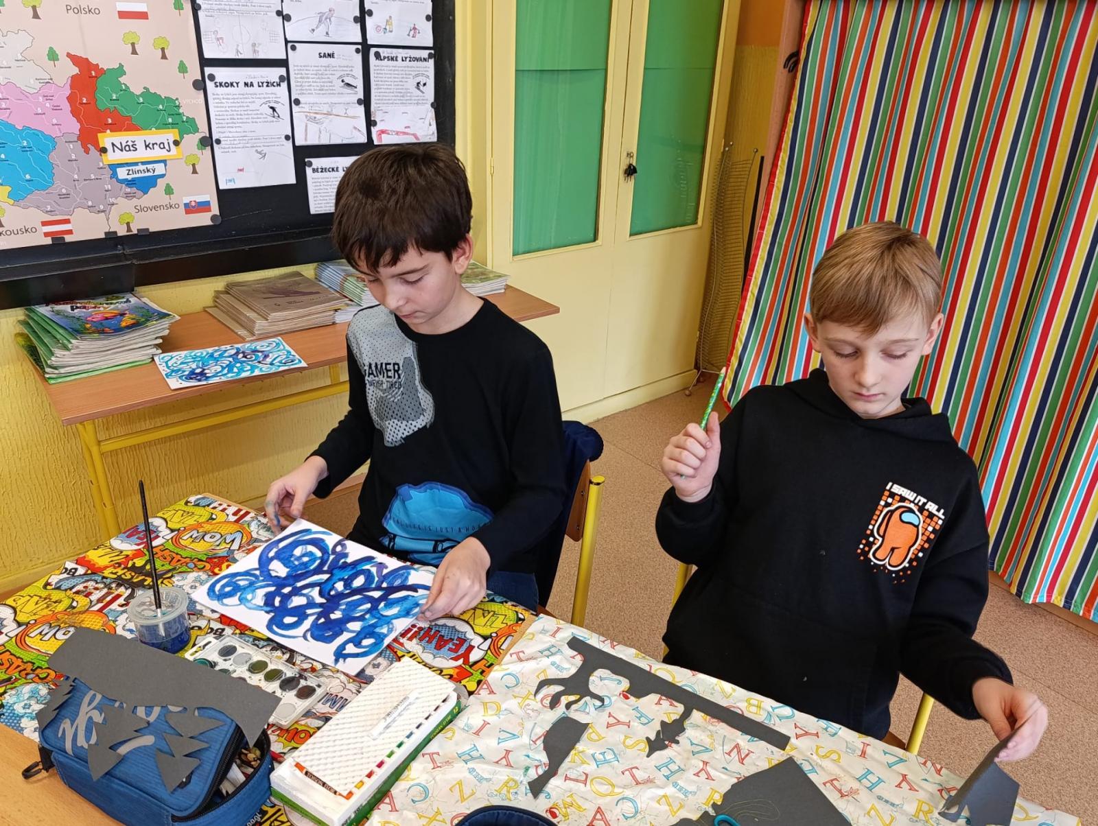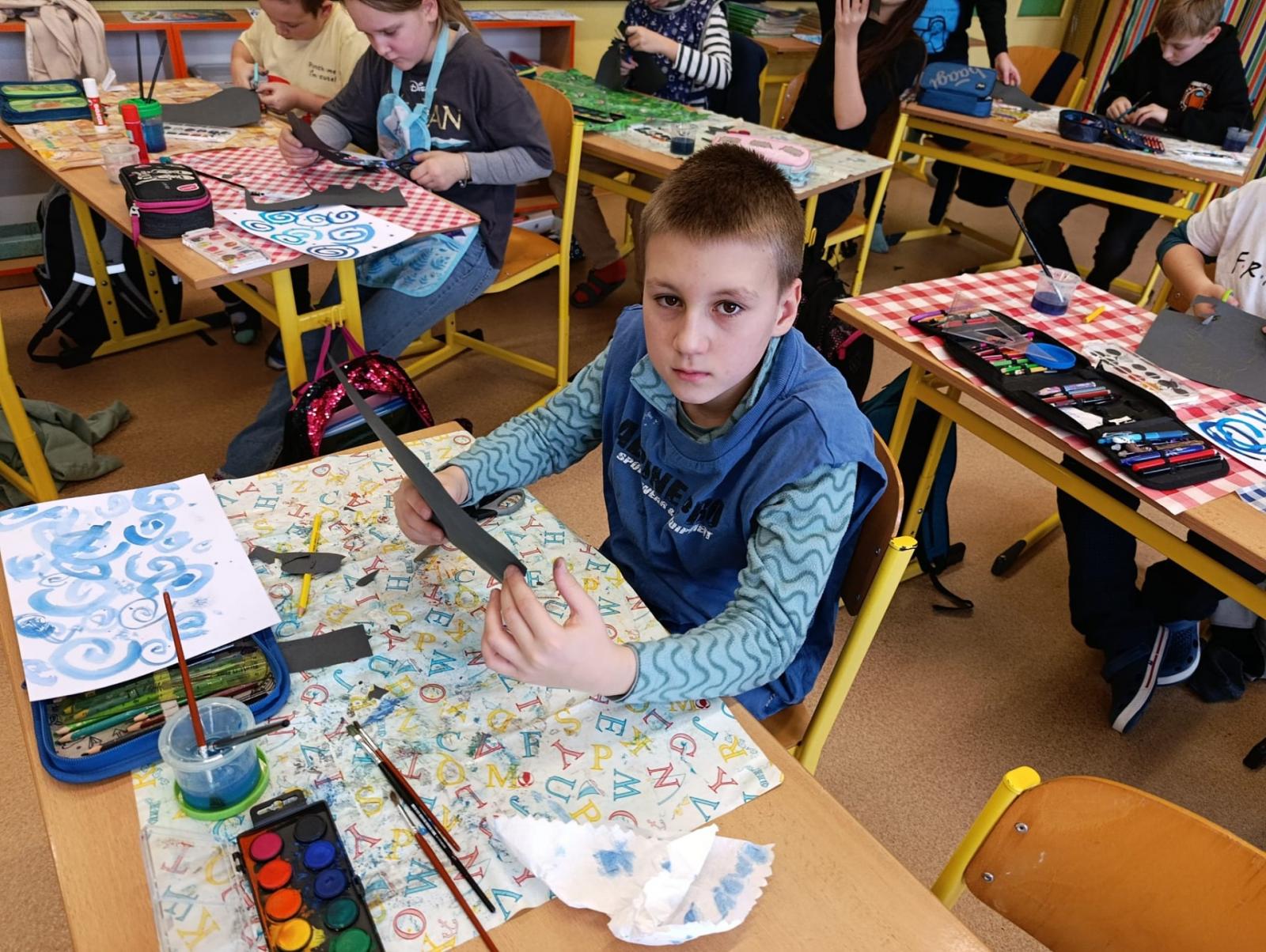 Silných studených větrů jsme si užili v poslední době dost a dost. Napadlo nás nakreslit si takovou nefalšovanou zimní bouři v lese. Na závěr jsme nalepili na paspartu a kolem přilepili ledové krystaly. Snad se nás už zima trochu lekne a jaro se přiblíží.