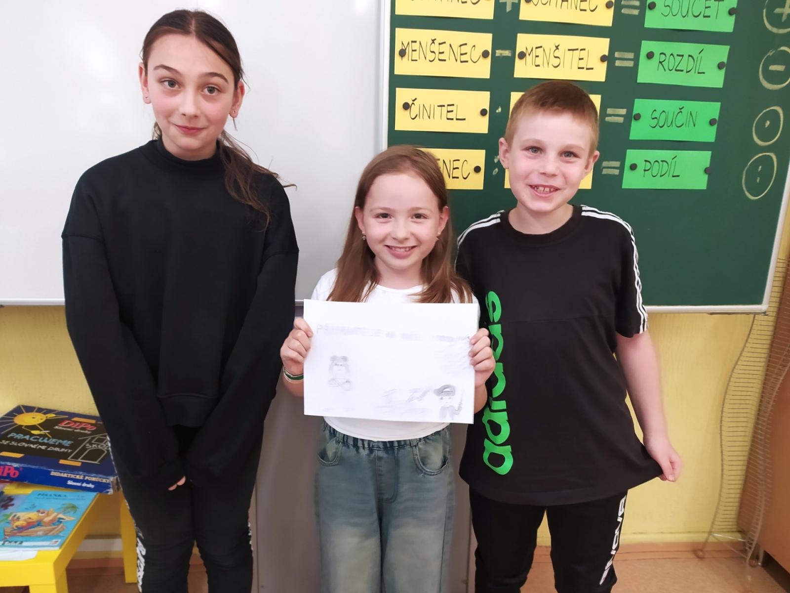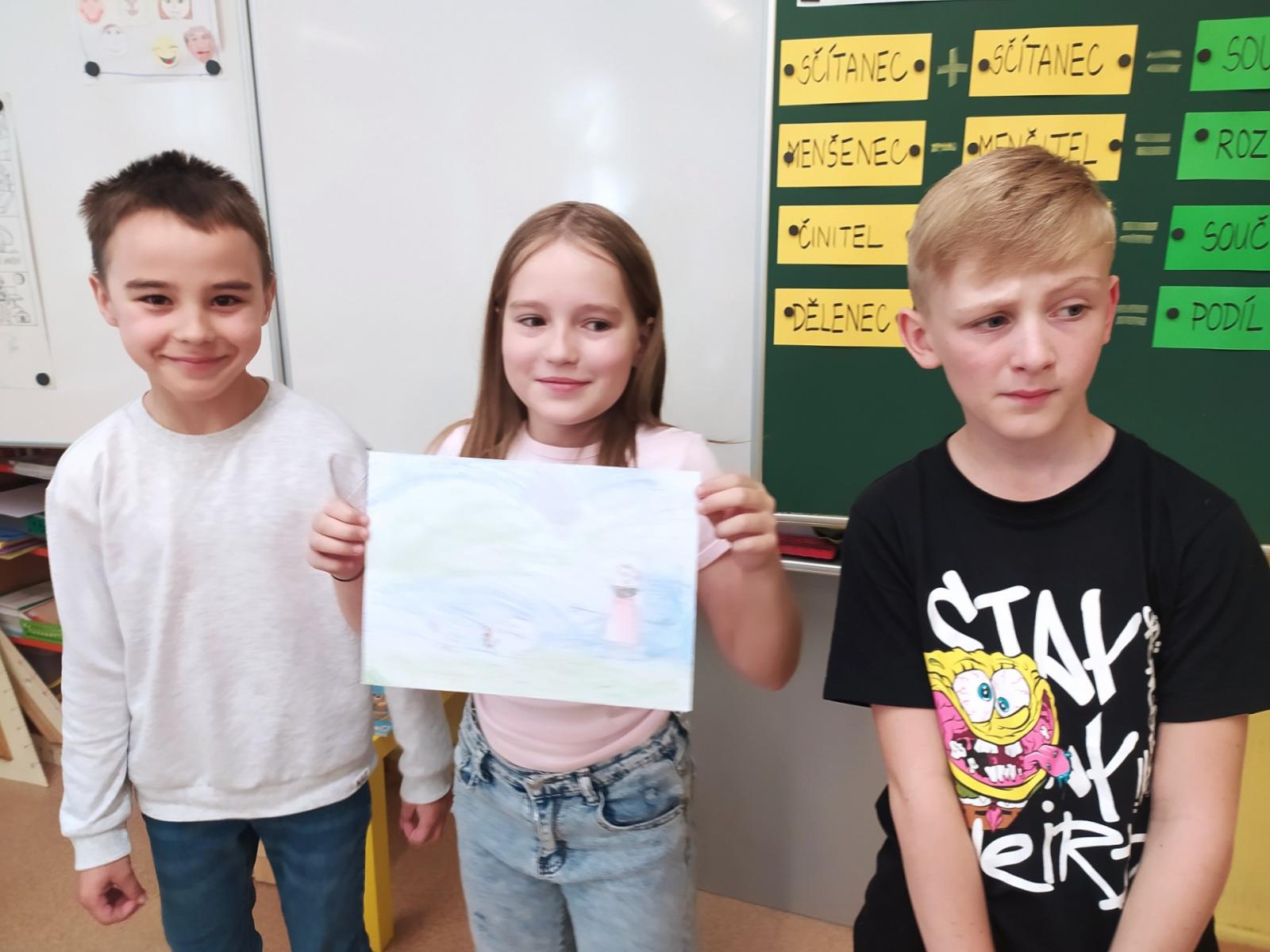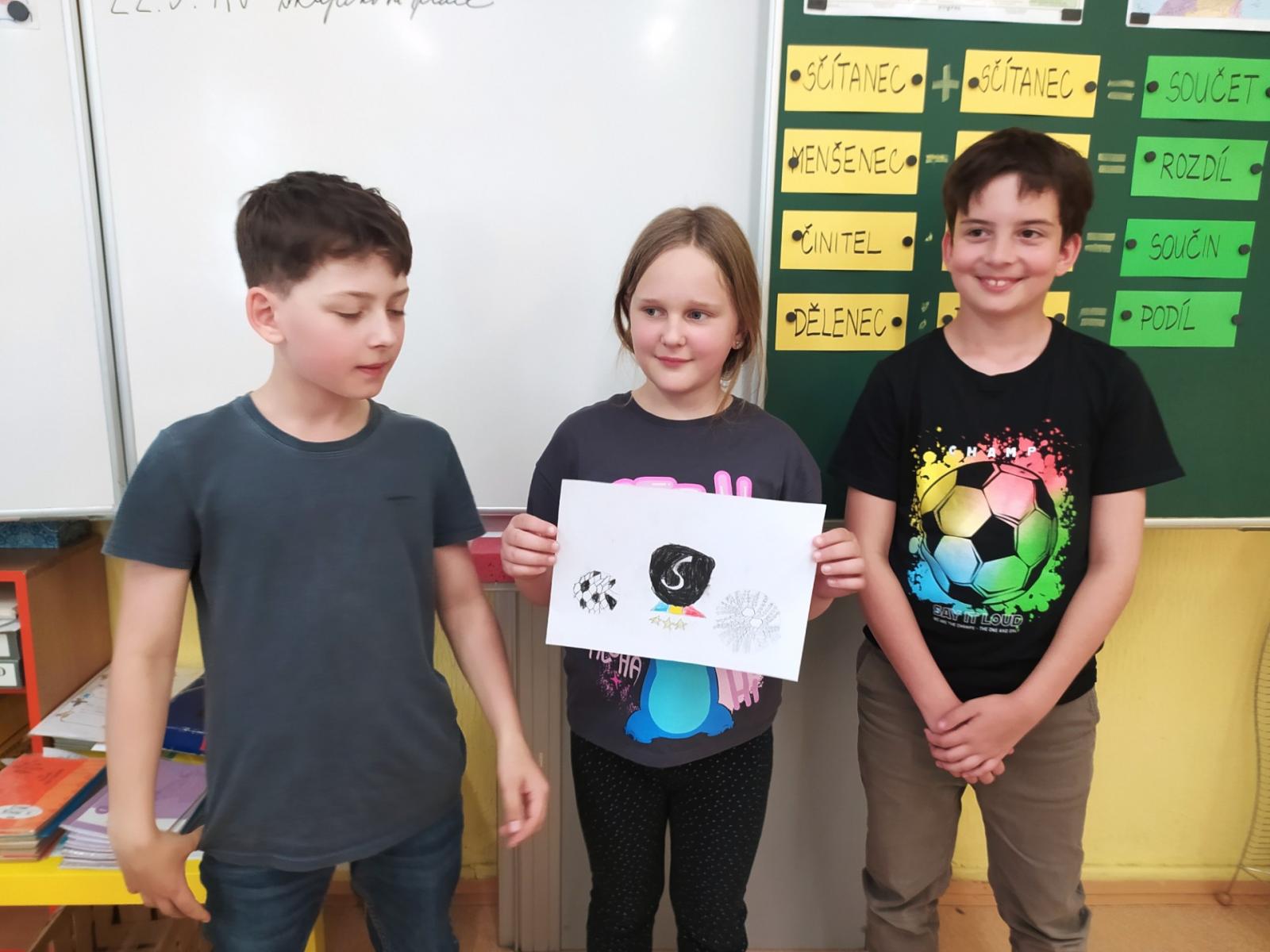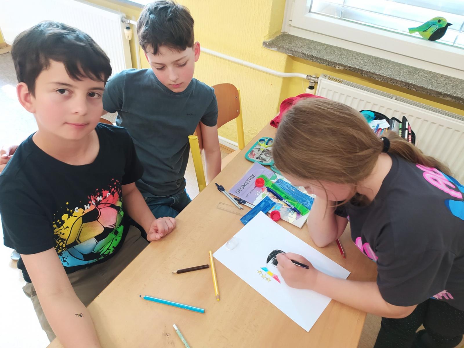V hodinách hudební výchovy nemusíme jenom zpívat, ale také pracovat ve skupinách. Dnes jsme se úplně náhodně rozdělili na skupinky po třech a poté jsme pro své kamarády kreslili hudební hádanky. Nakreslili jsme co možná nejpřesnější vyjádření textu písně a kdo uhodl, získal sluníčko.
