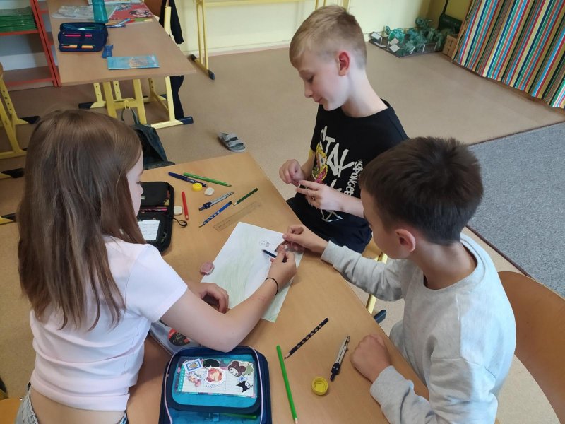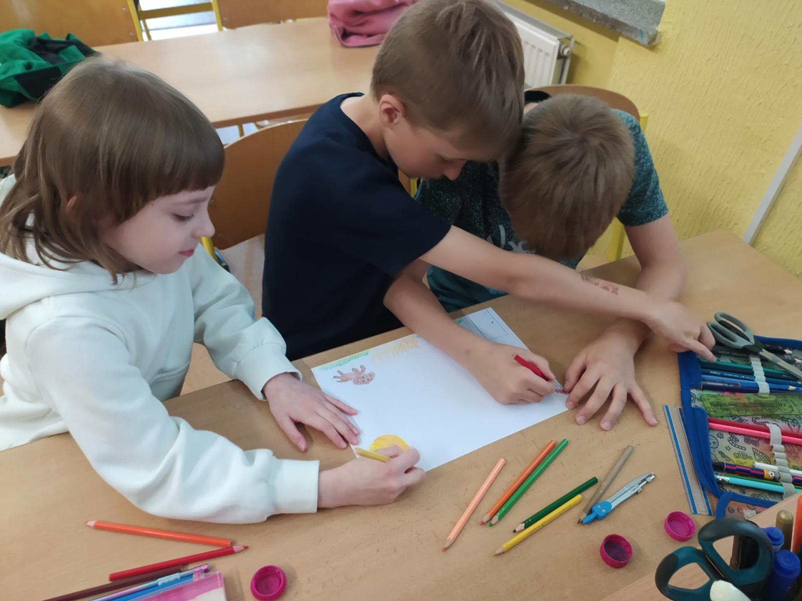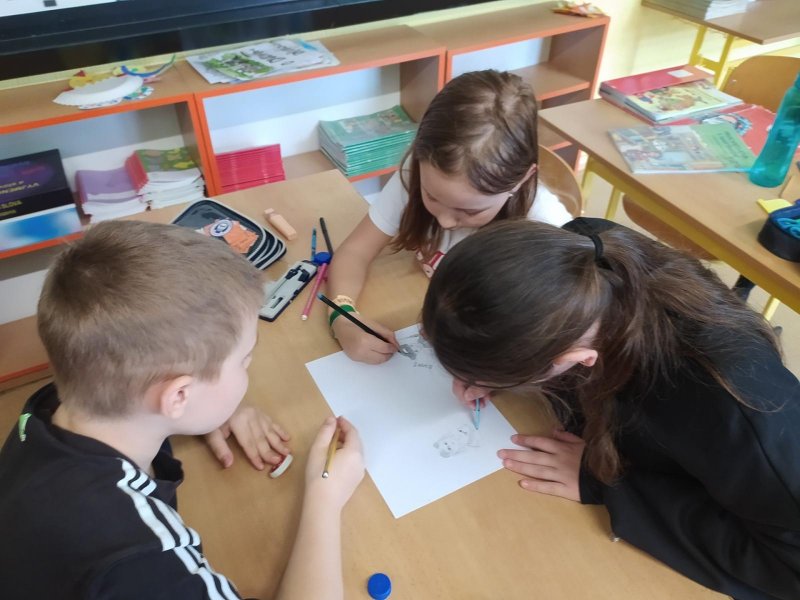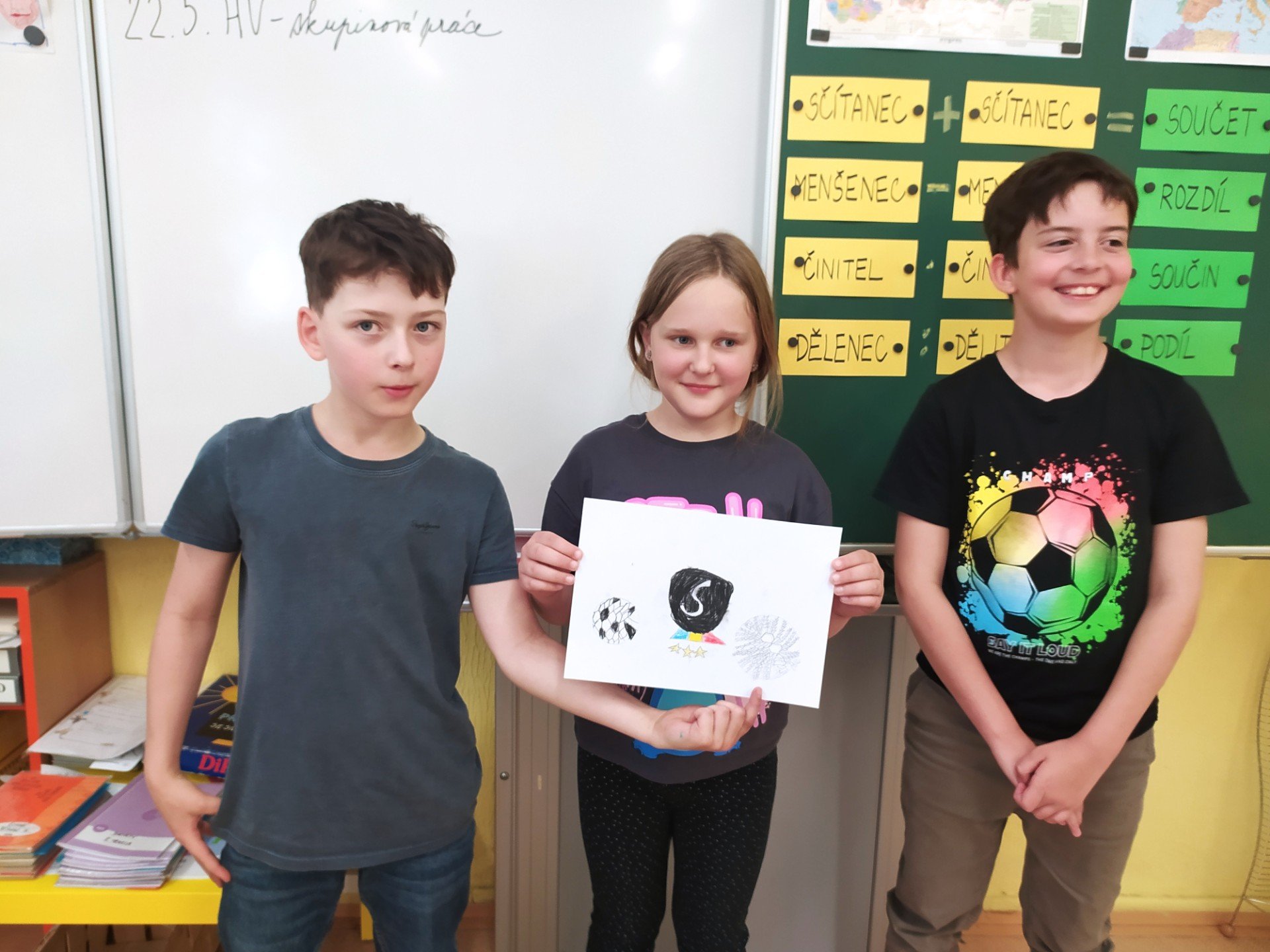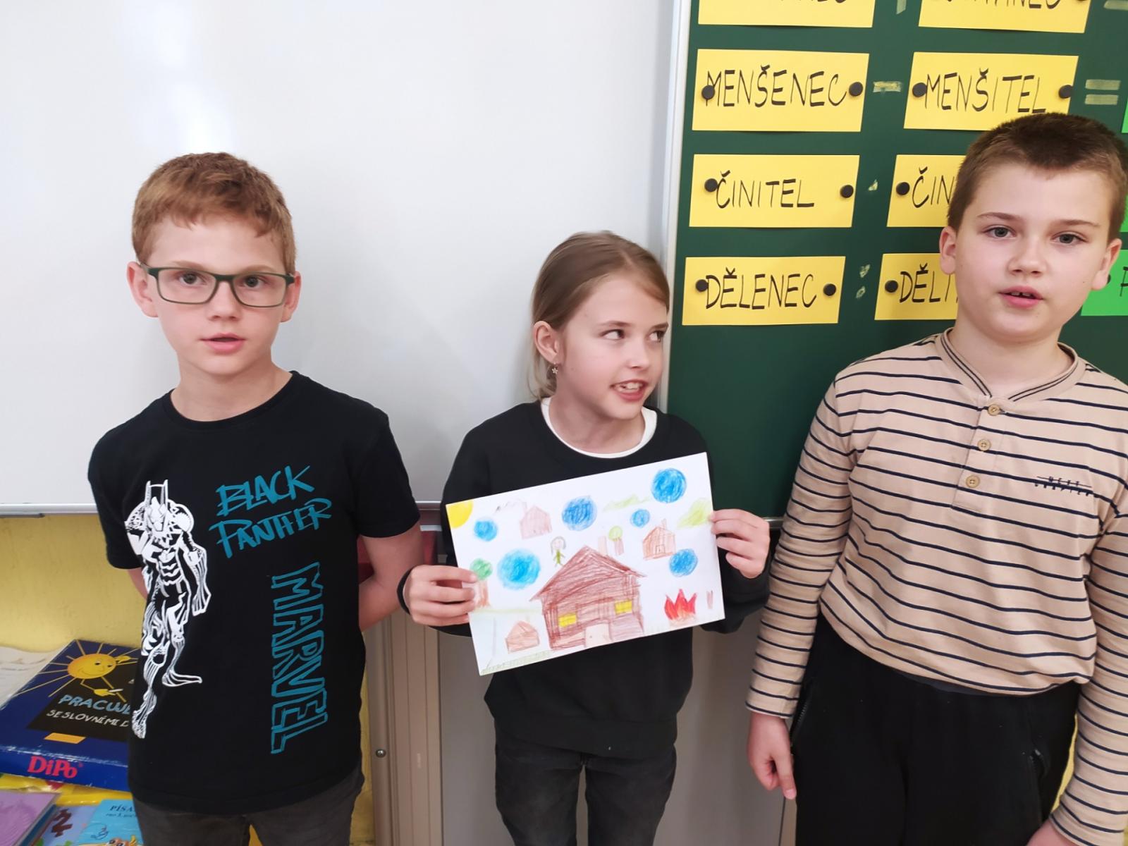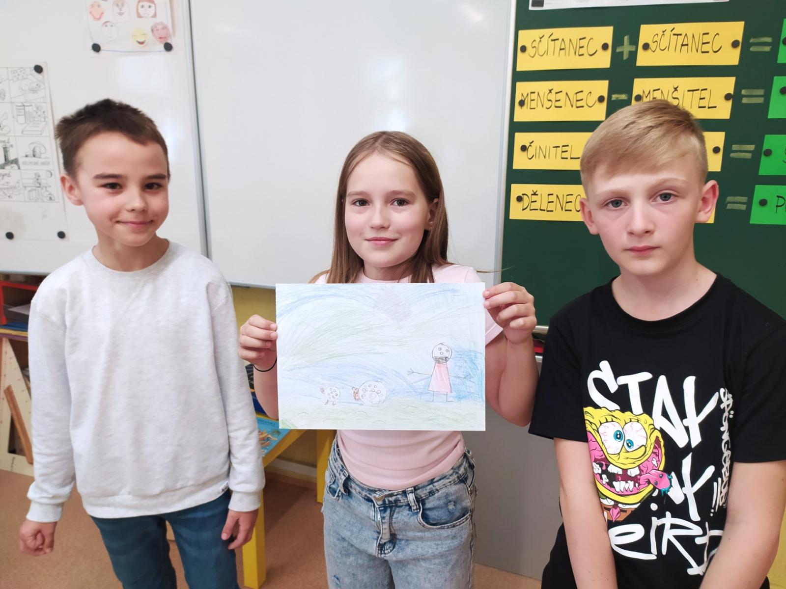 V hodinách hudební výchovy nemusíme jenom zpívat, ale také pracovat ve skupinách. Dnes jsme se úplně náhodně rozdělili na skupinky po třech a poté jsme pro své kamarády kreslili hudební hádanky. Nakreslili jsme co možná nejpřesnější vyjádření textu písně a kdo uhodl, získal sluníčko.