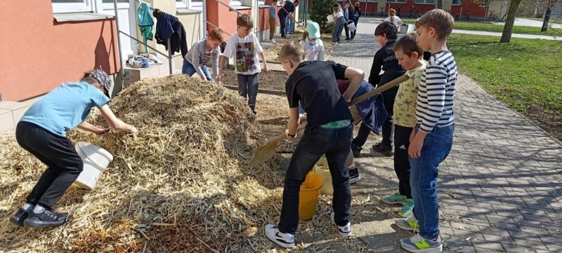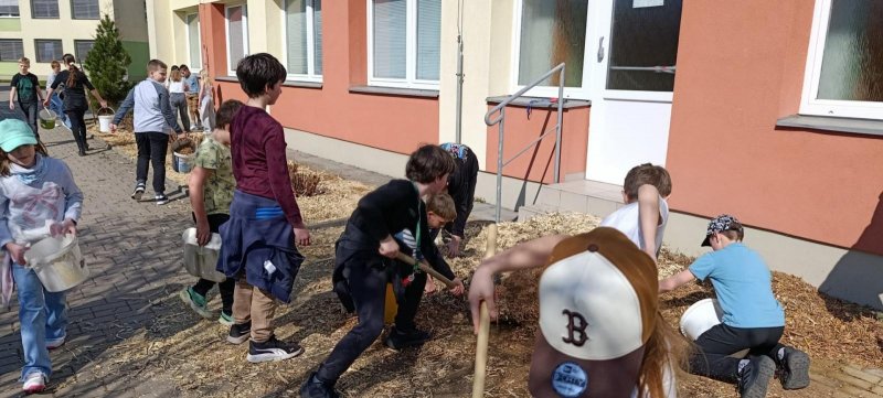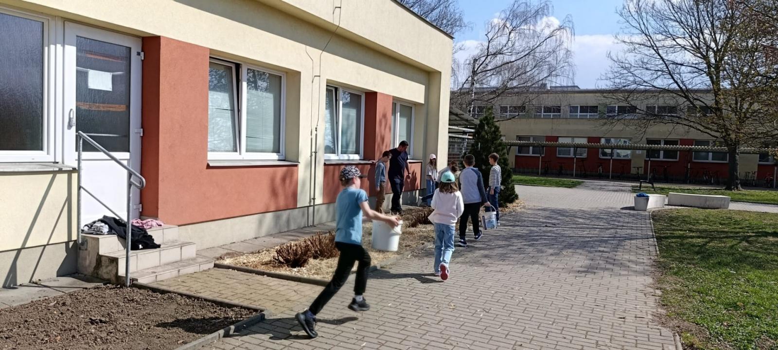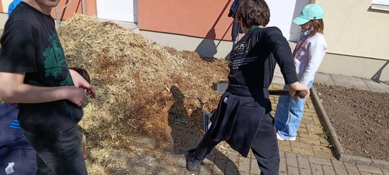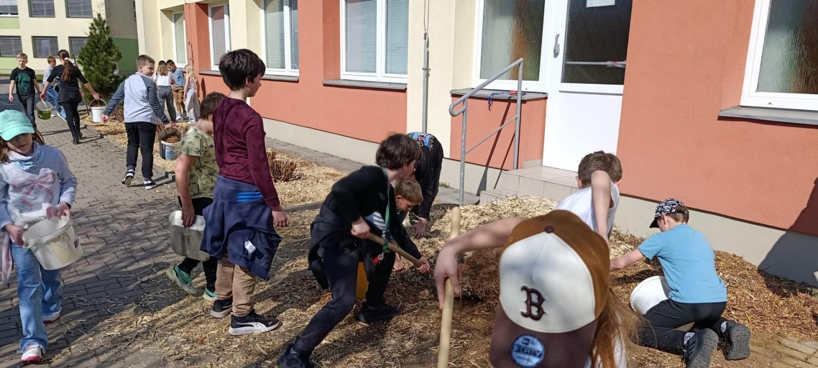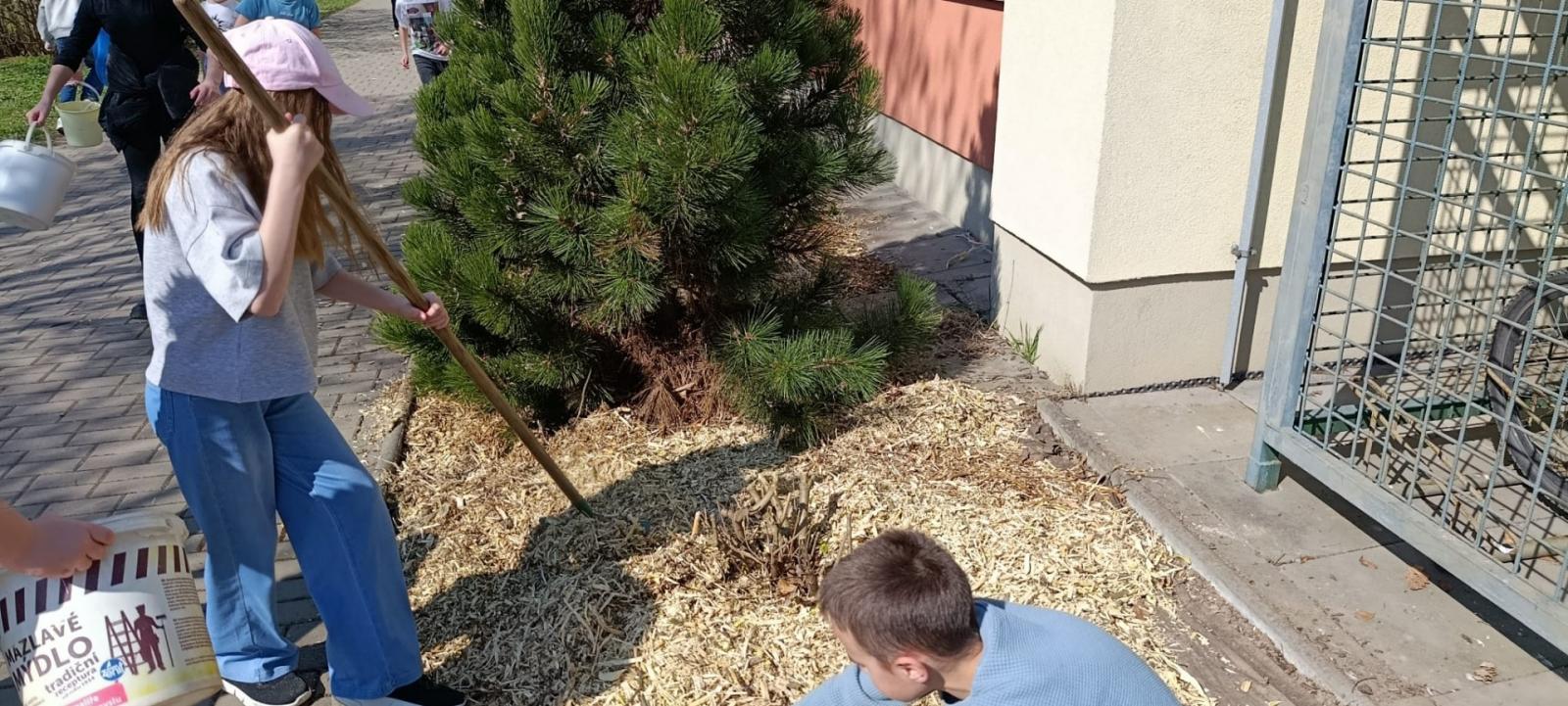 Každé pondělí máme pátou hodinu pracovní činnosti. Stříháme, lepíme, obkreslujeme a případně tvoříme ve skupinách. Dnes jsme vytvořili jednu velkou pracovní skupinu, která měla za úkol rozdělit poměrně vysokou hromadu štěpky na vyčištěné záhony před šatnami. Štěpka je vlastně nadrcená směs větví a kůry z keřů, které nám rostou před školou. Pan školník celou práci řídil.