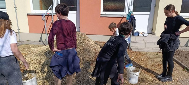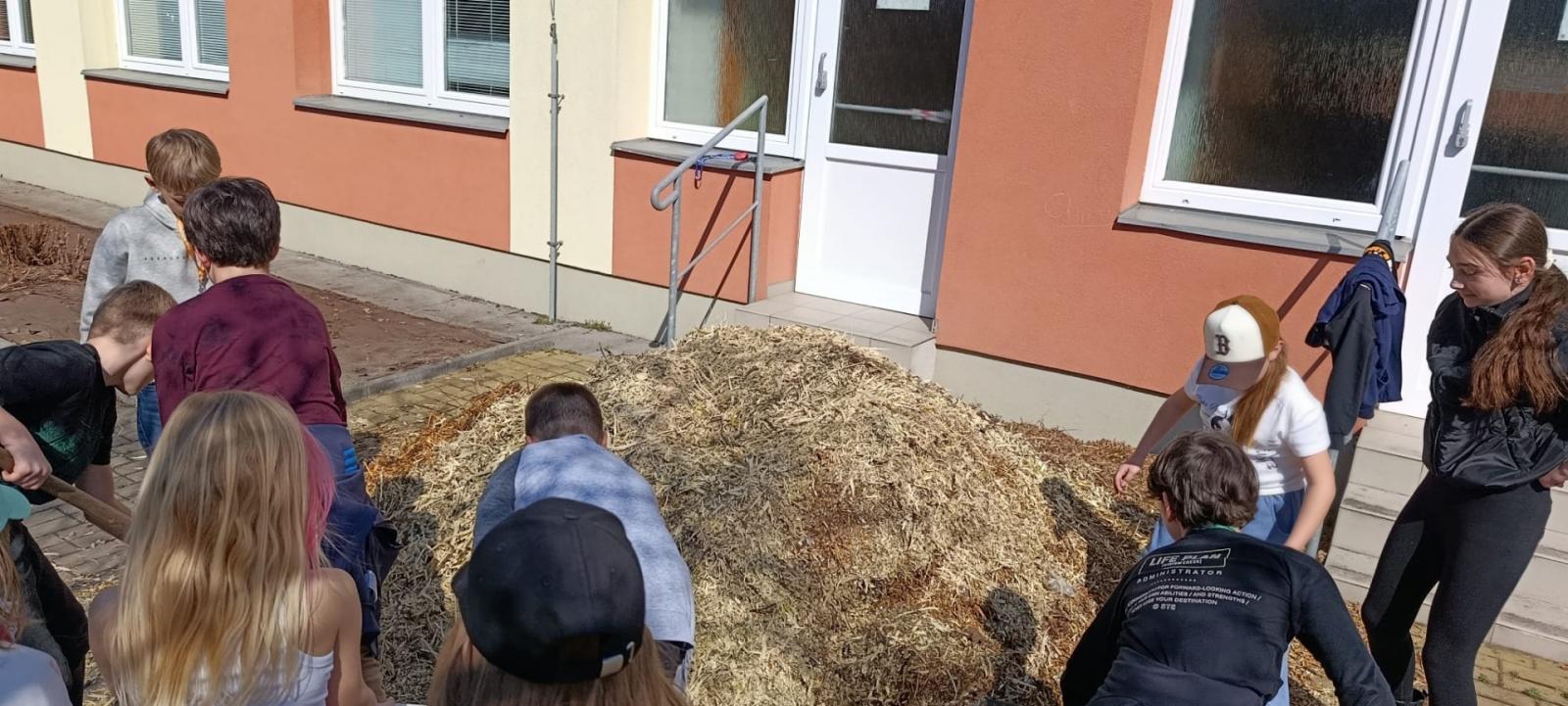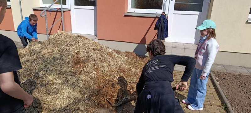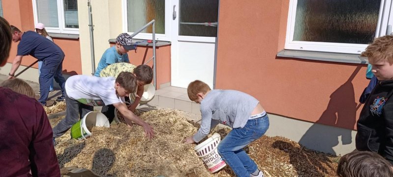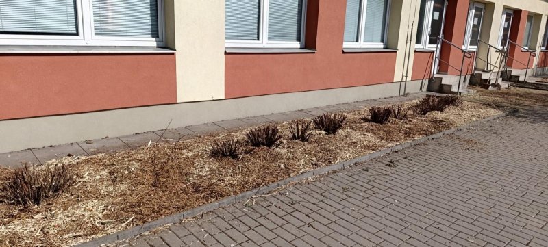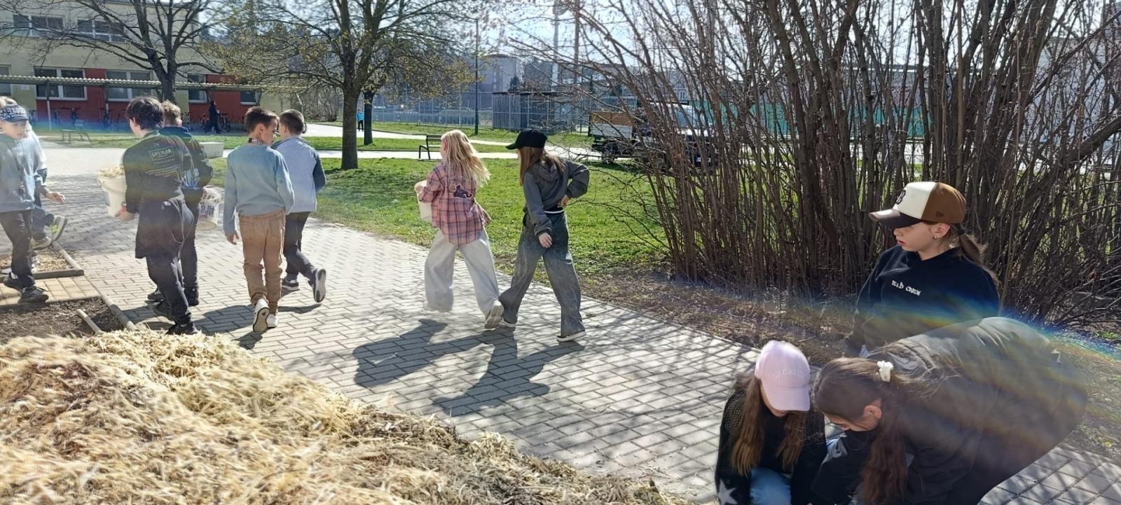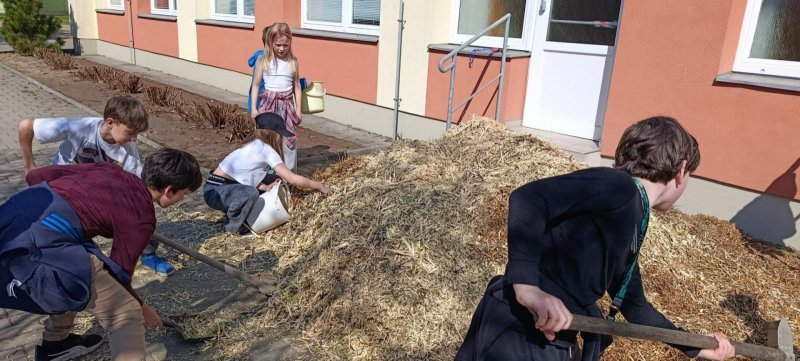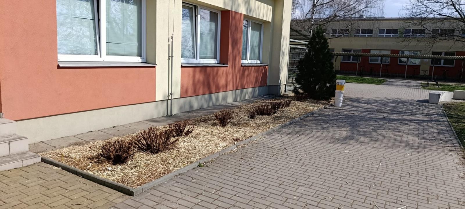 Každé pondělí máme pátou hodinu pracovní činnosti. Stříháme, lepíme, obkreslujeme a případně tvoříme ve skupinách. Dnes jsme vytvořili jednu velkou pracovní skupinu, která měla za úkol rozdělit poměrně vysokou hromadu štěpky na vyčištěné záhony před šatnami. Štěpka je vlastně nadrcená směs větví a kůry z keřů, které nám rostou před školou. Pan školník celou práci řídil.