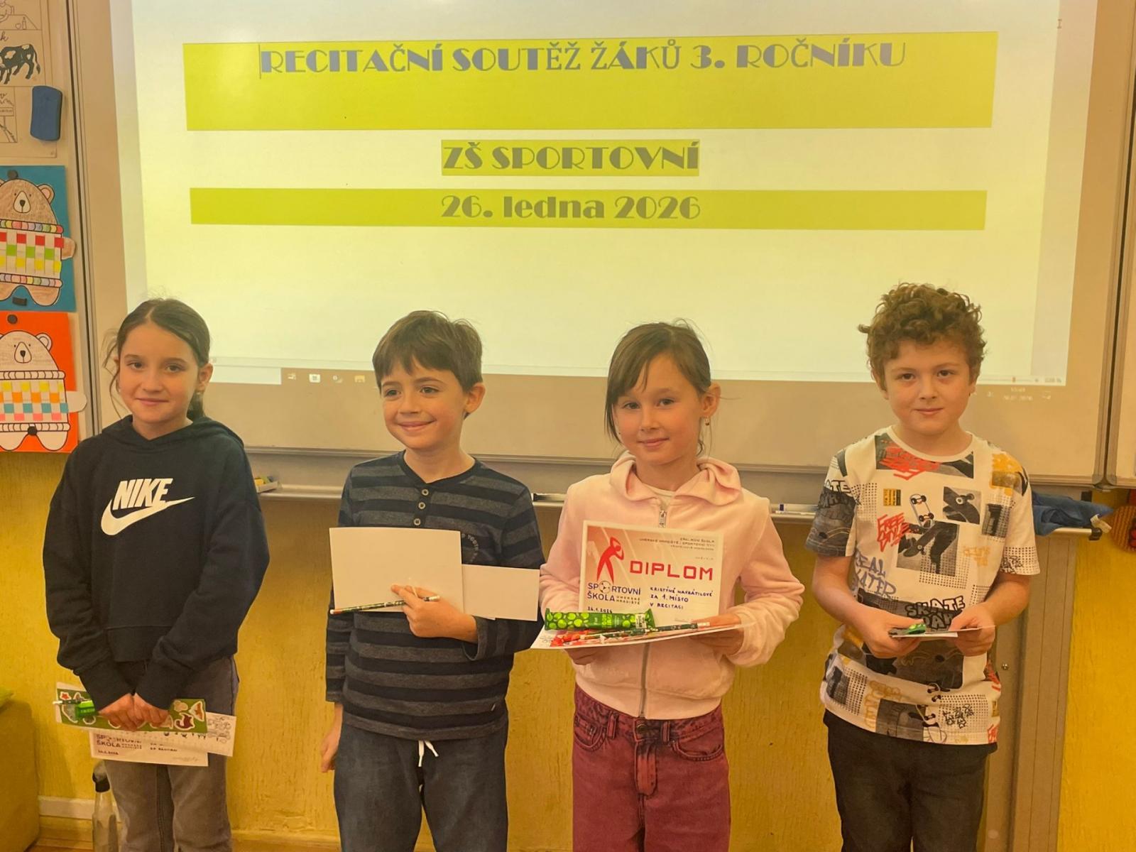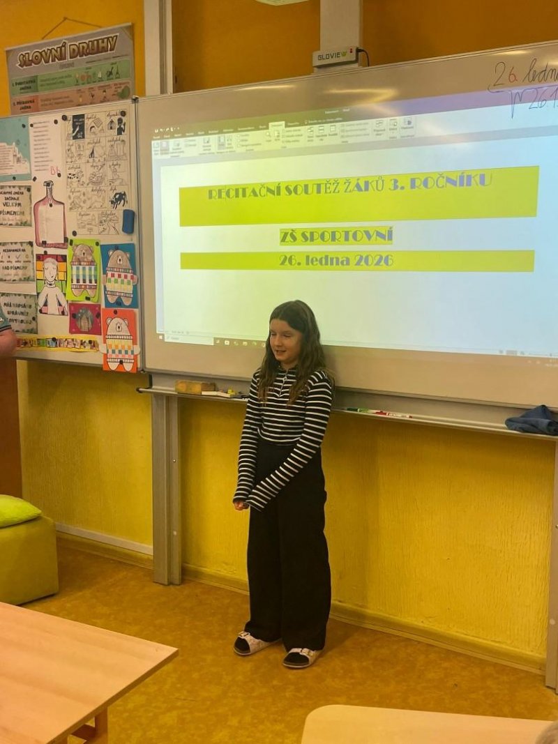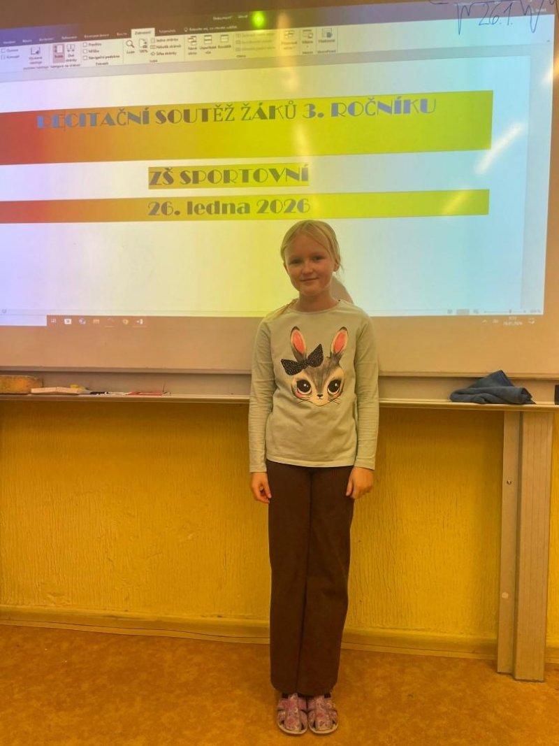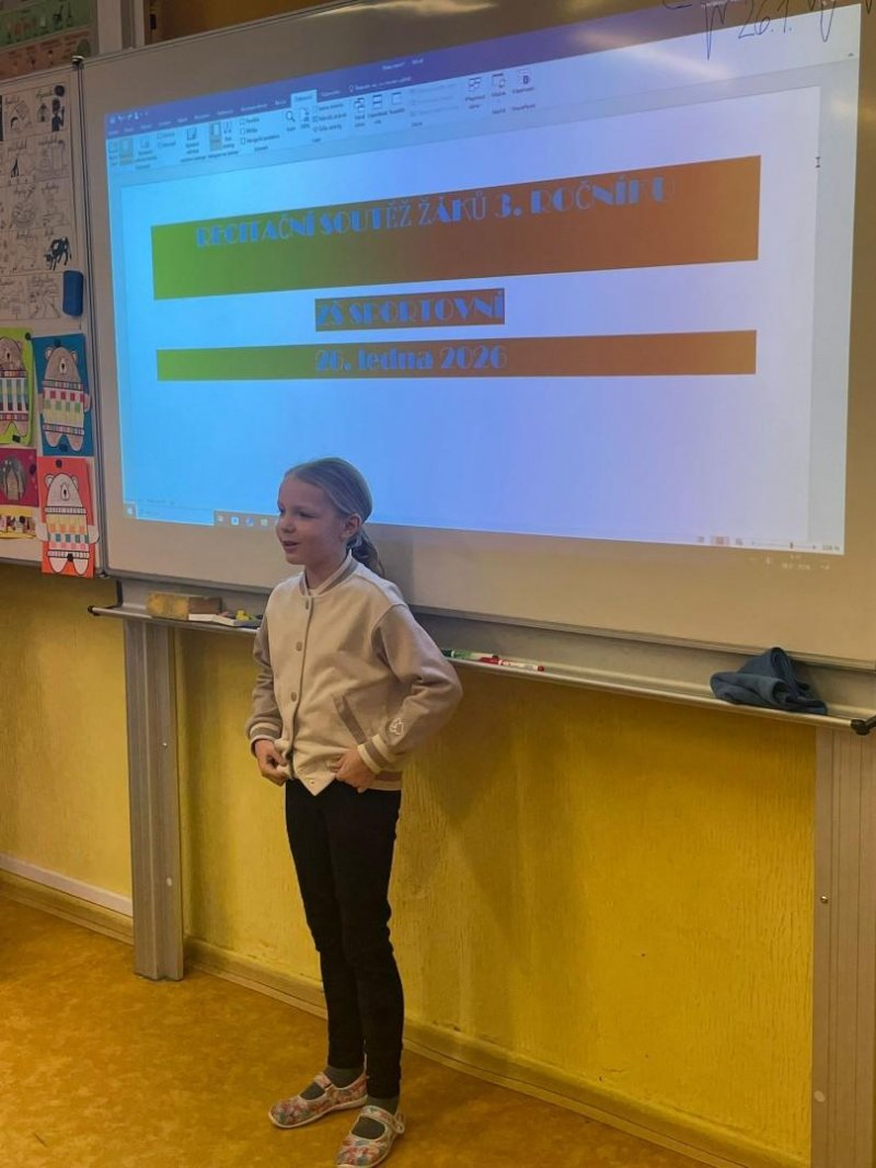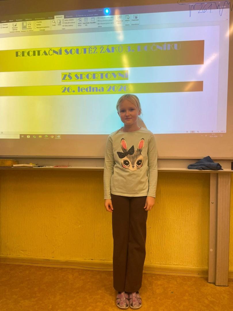 V pondělí 26. ledna jsme se potkali s ostatními třeťáky a jednu hodinu jsme strávily poslechem recitace našich spolužáků. Z naší třídy recitovali Eliška Čierná, Marktétka Inderková, Monika Polčíková, Klárka Tomečková a Táďa Nosterský. Tadeáš se umístil na třetím místě. Gratulujeme!