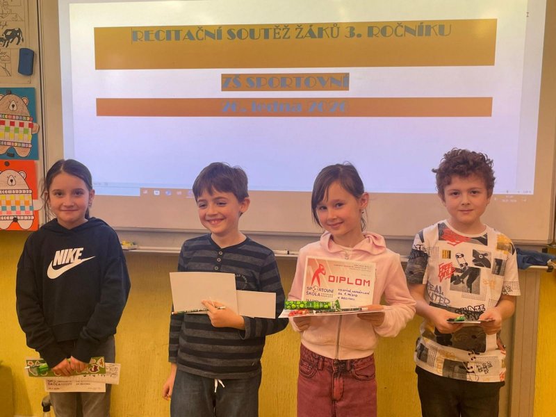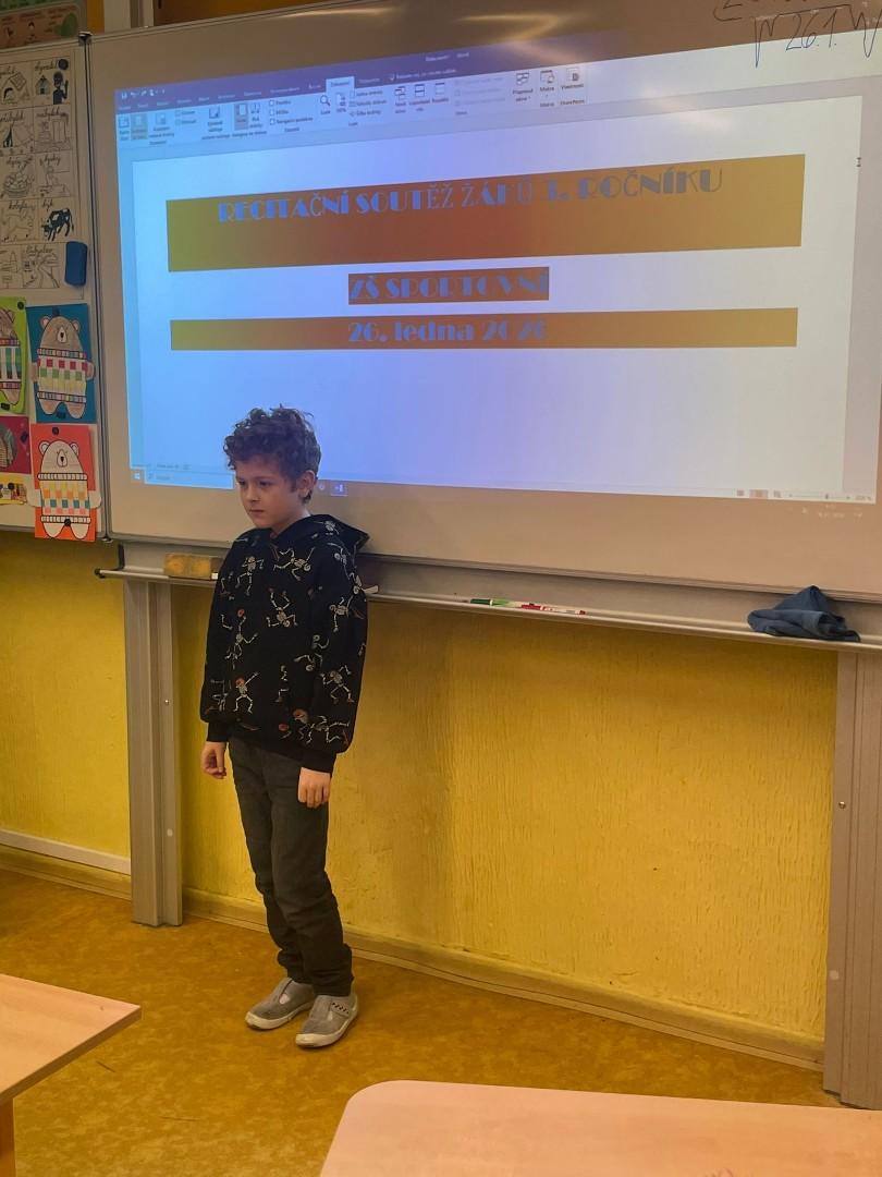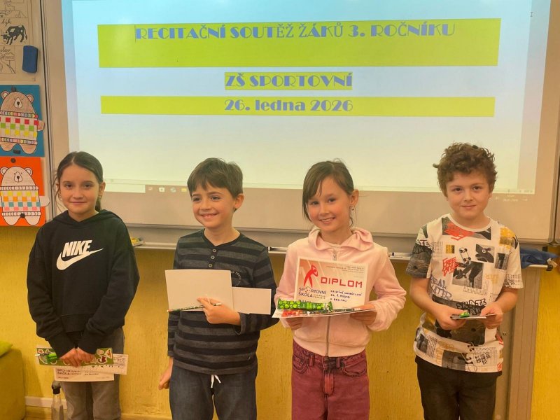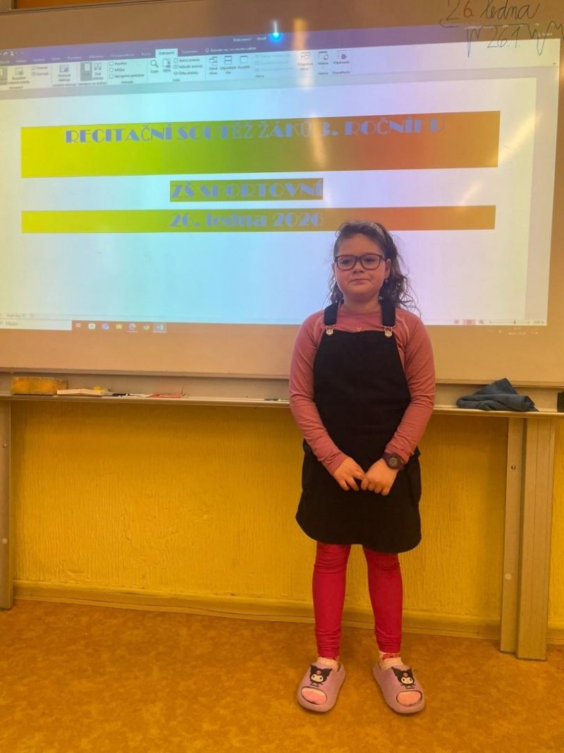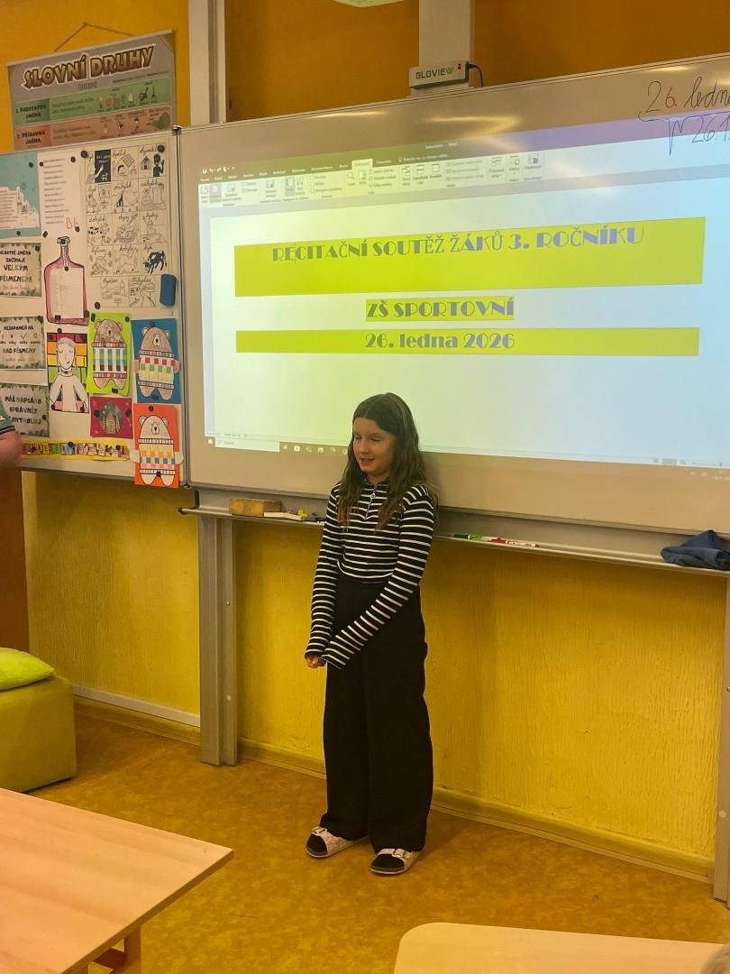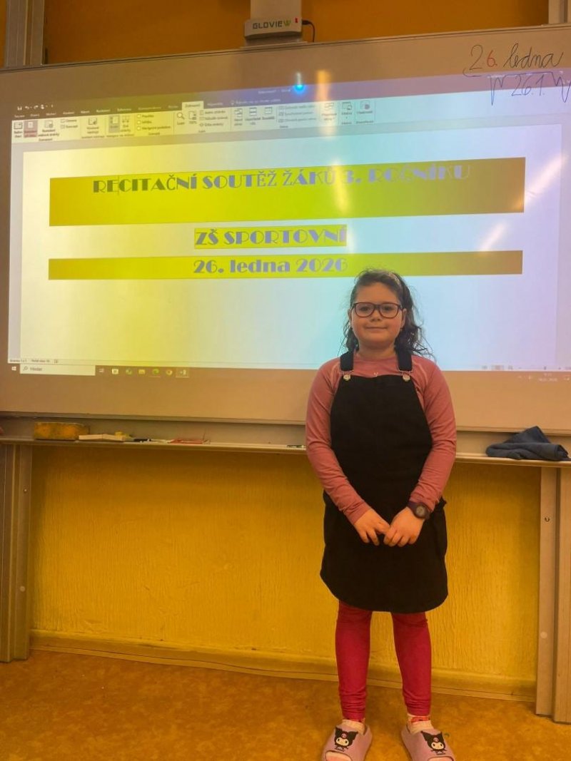 V pondělí 26. ledna jsme se potkali s ostatními třeťáky a jednu hodinu jsme strávily poslechem recitace našich spolužáků. Z naší třídy recitovali Eliška Čierná, Marktétka Inderková, Monika Polčíková, Klárka Tomečková a Táďa Nosterský. Tadeáš se umístil na třetím místě. Gratulujeme!