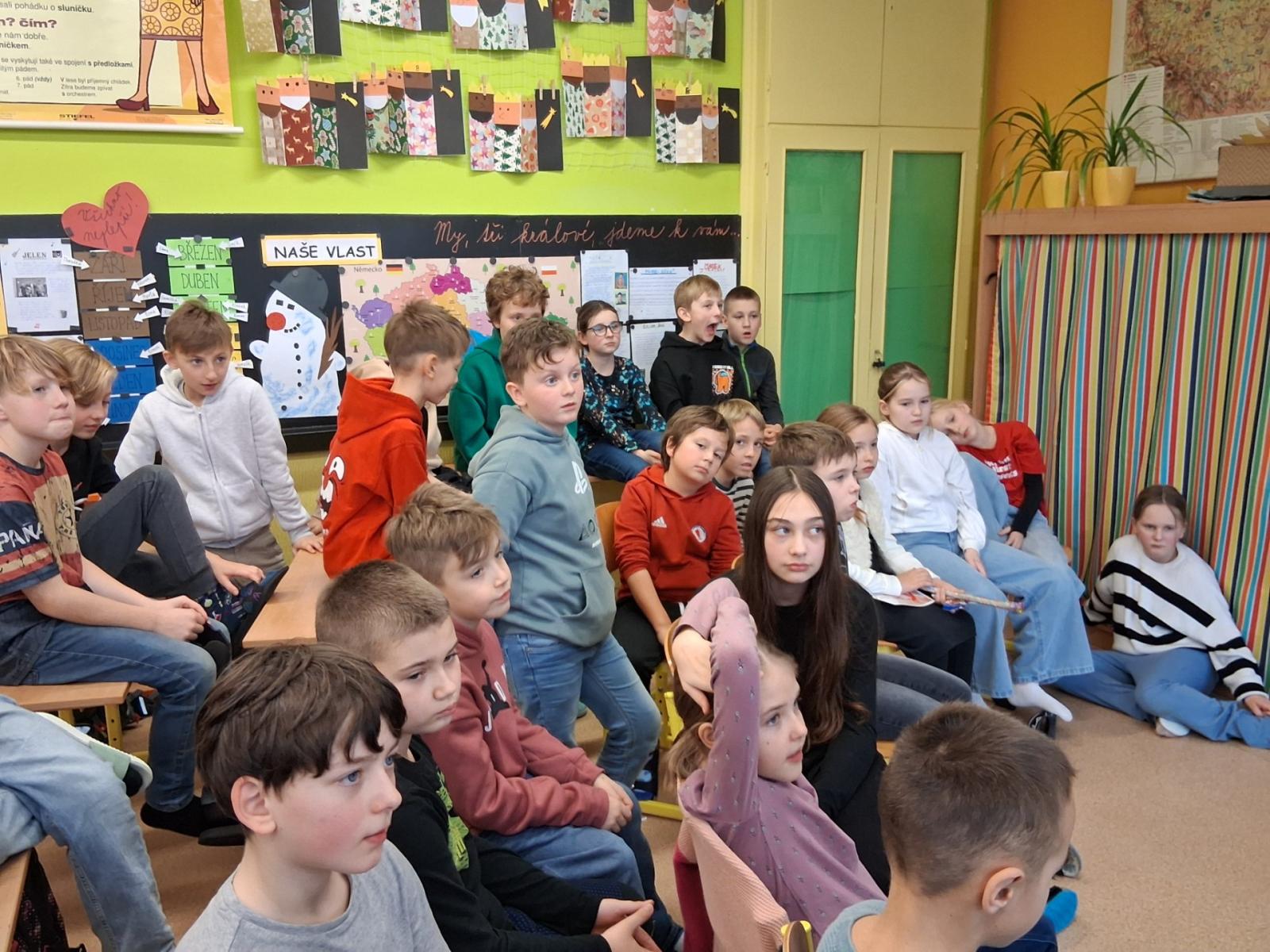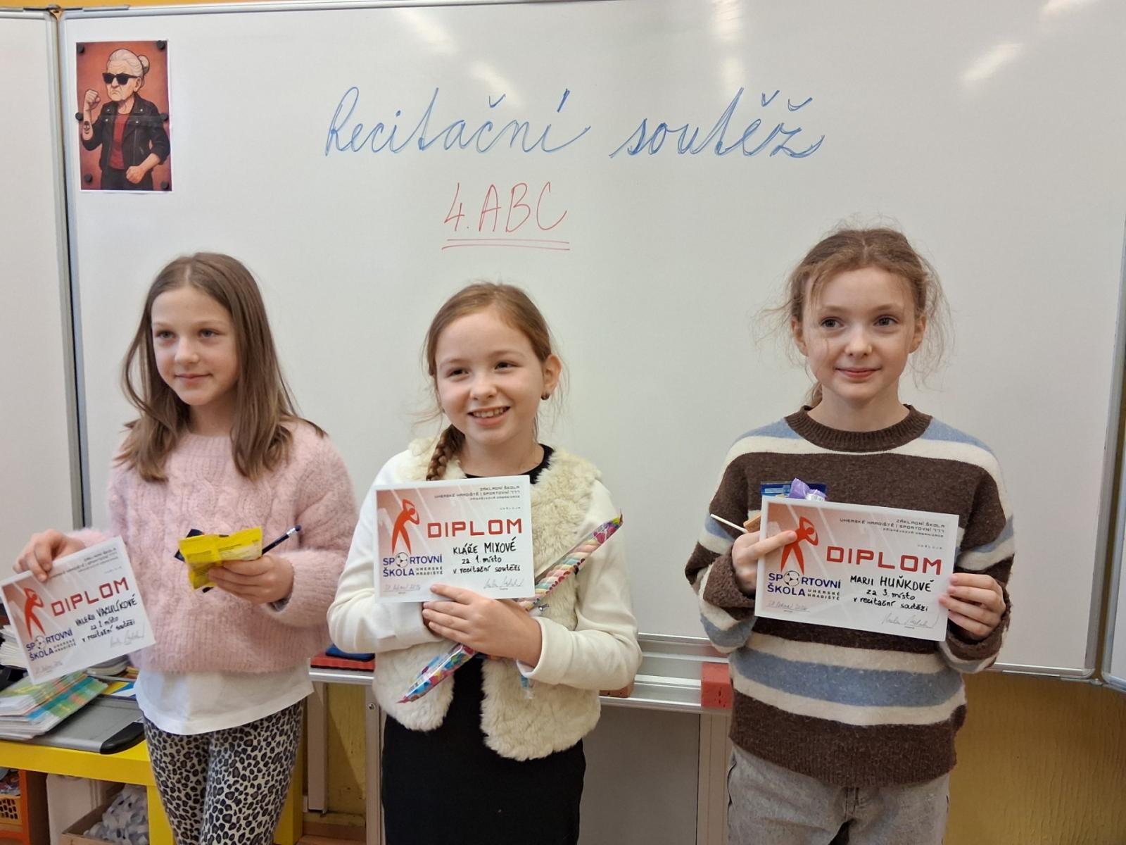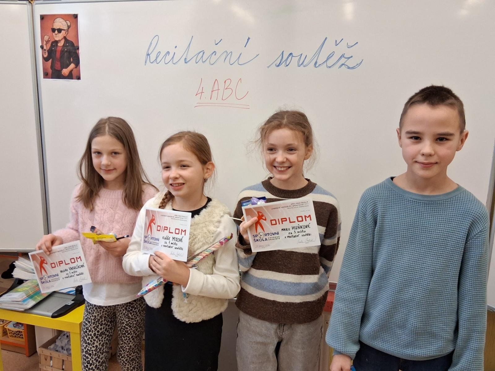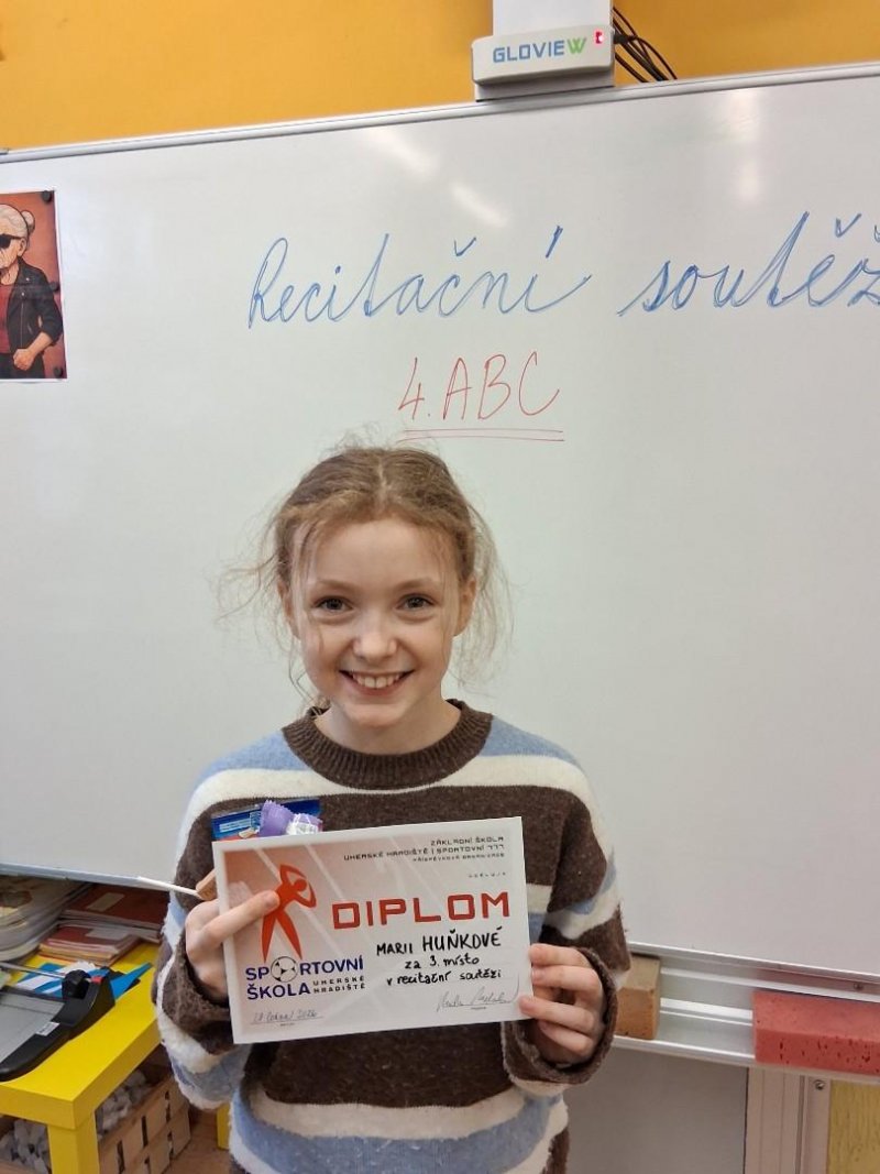 Ve středu proběhla ročníková recitační soutěž. Z naší třídy postoupili Adam Rádl, Bětuška Šupková, Anička Šulcová a Mája Huňková. Konkurence byla veliká, výkony skvělé. Přesto jsme museli rozhodnout, kdo svou básní nejvíce zaujal - jak obsahem, tak i přednesem.