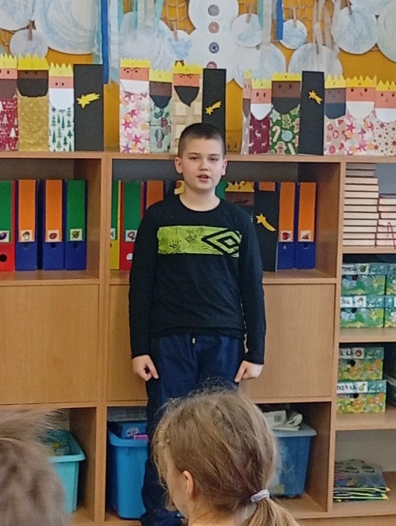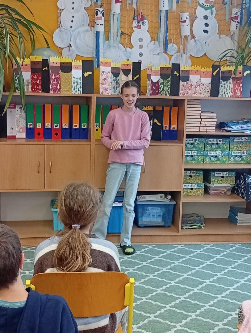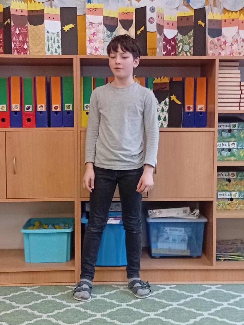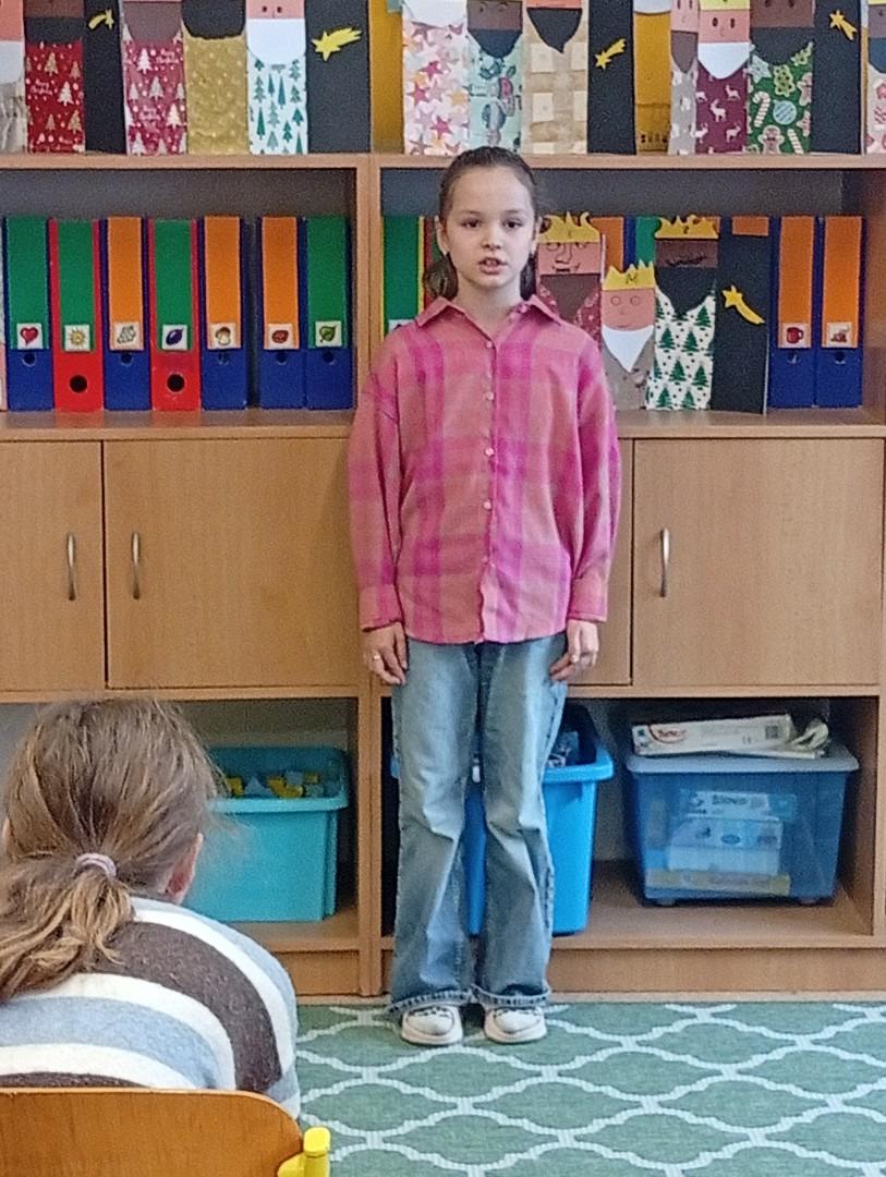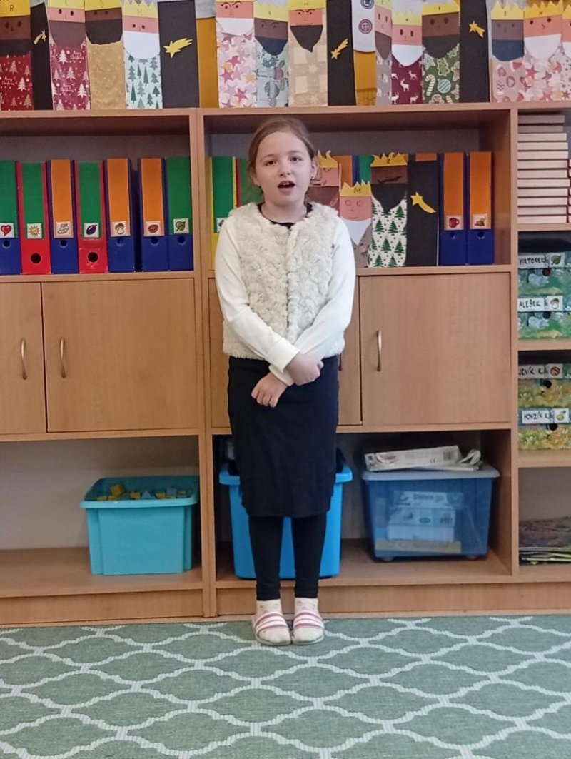 Následovala recitační soutěž. Letos naši třídu reprezentovala Valča, Vili, Verča, Jony, Renatka a Tom. Jako každý rok soutěžili všechny čtvrté ročníky, proto bylo těžké vybrat tři nejlepší. Nakonec se paní učitelky dohodly následovně: