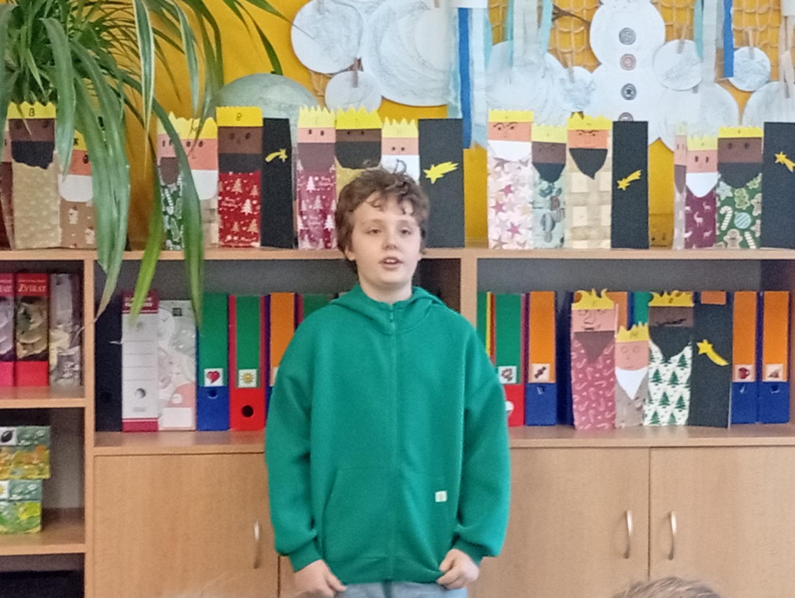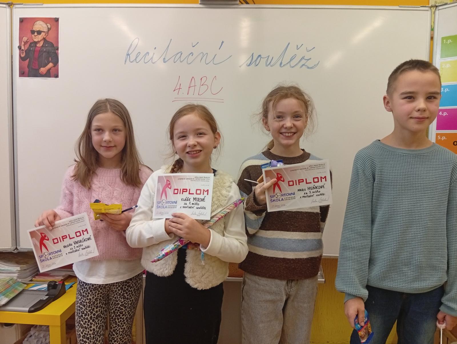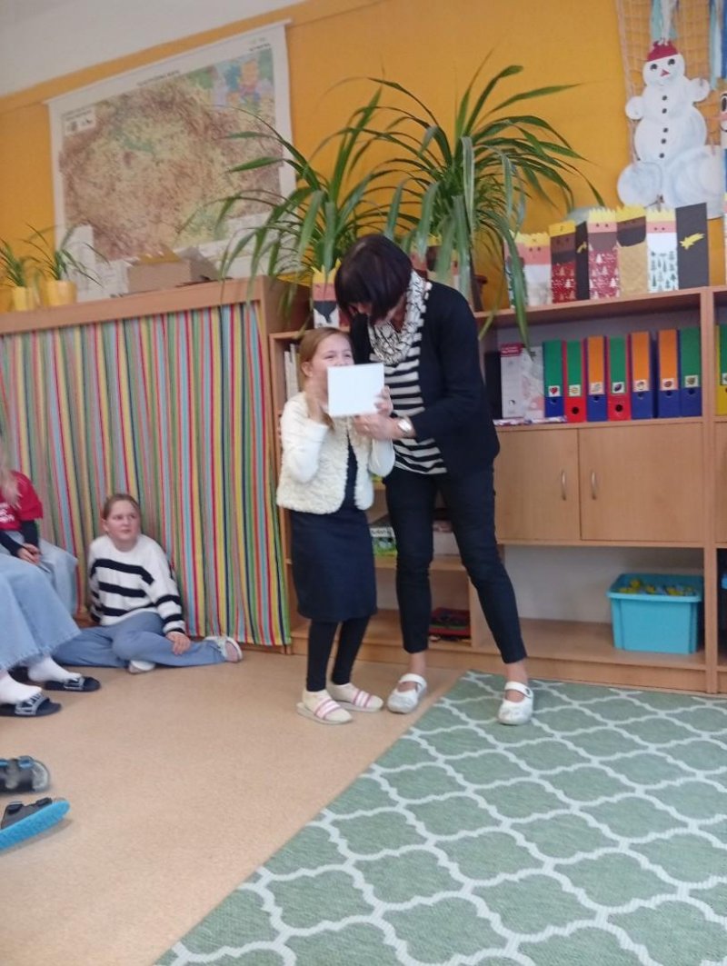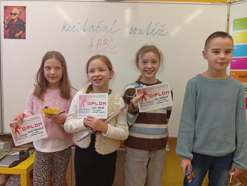 Následovala recitační soutěž. Letos naši třídu reprezentovala Valča, Vili, Verča, Jony, Renatka a Tom. Jako každý rok soutěžili všechny čtvrté ročníky, proto bylo těžké vybrat tři nejlepší. Nakonec se paní učitelky dohodly následovně: