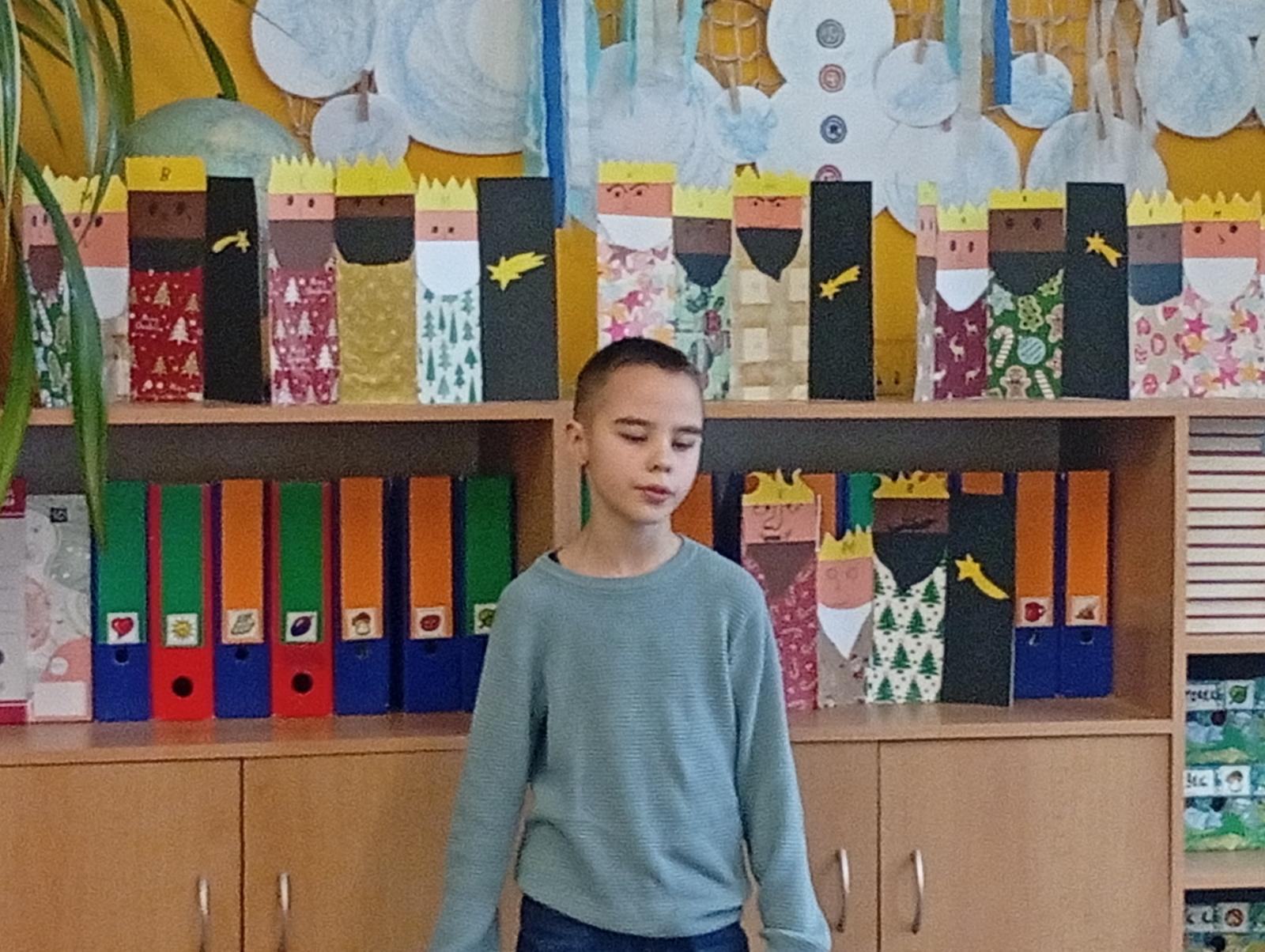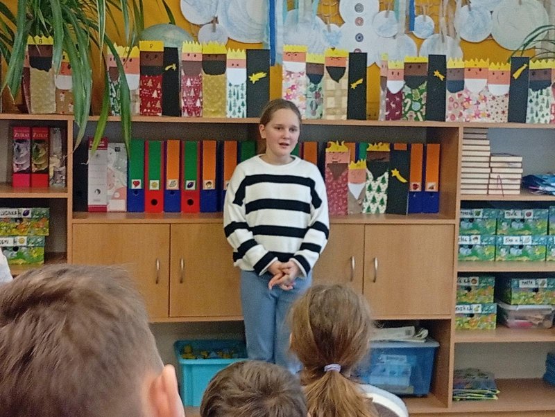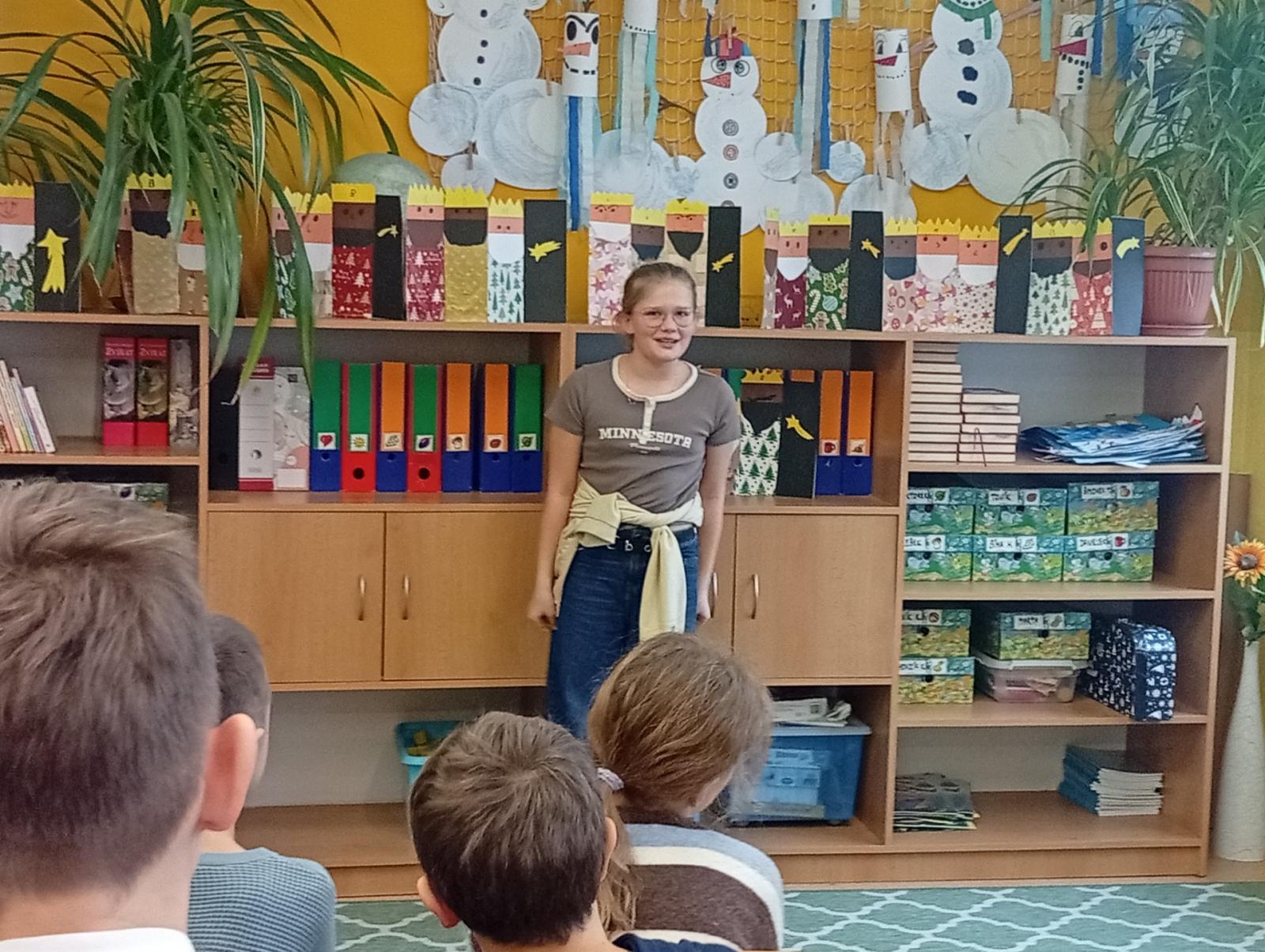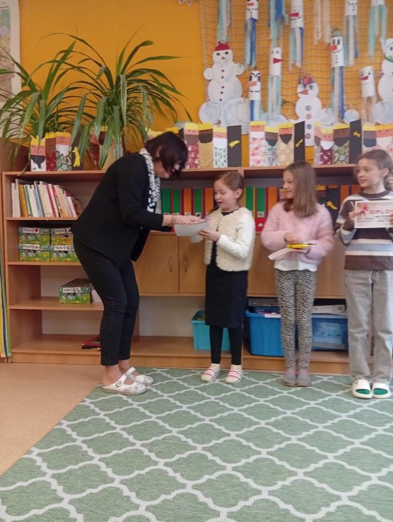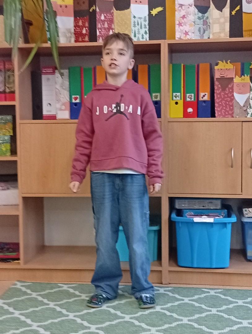 Následovala recitační soutěž. Letos naši třídu reprezentovala Valča, Vili, Verča, Jony, Renatka a Tom. Jako každý rok soutěžili všechny čtvrté ročníky, proto bylo těžké vybrat tři nejlepší. Nakonec se paní učitelky dohodly následovně: