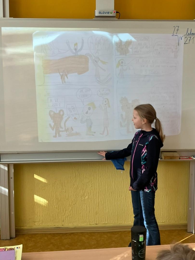 V úterý jsme se v rámci relaxačních dnů vydali, i když v malém počtu, na Rovninu. Zimní příroda nám připravila malá překvapení: klouzačky a zamrzlé kaluže, což jsme jaksepatří využili. Také jsme si společně popovídali a "zablbli". Ve škole nám Eliška ještě představila svůj komiks.