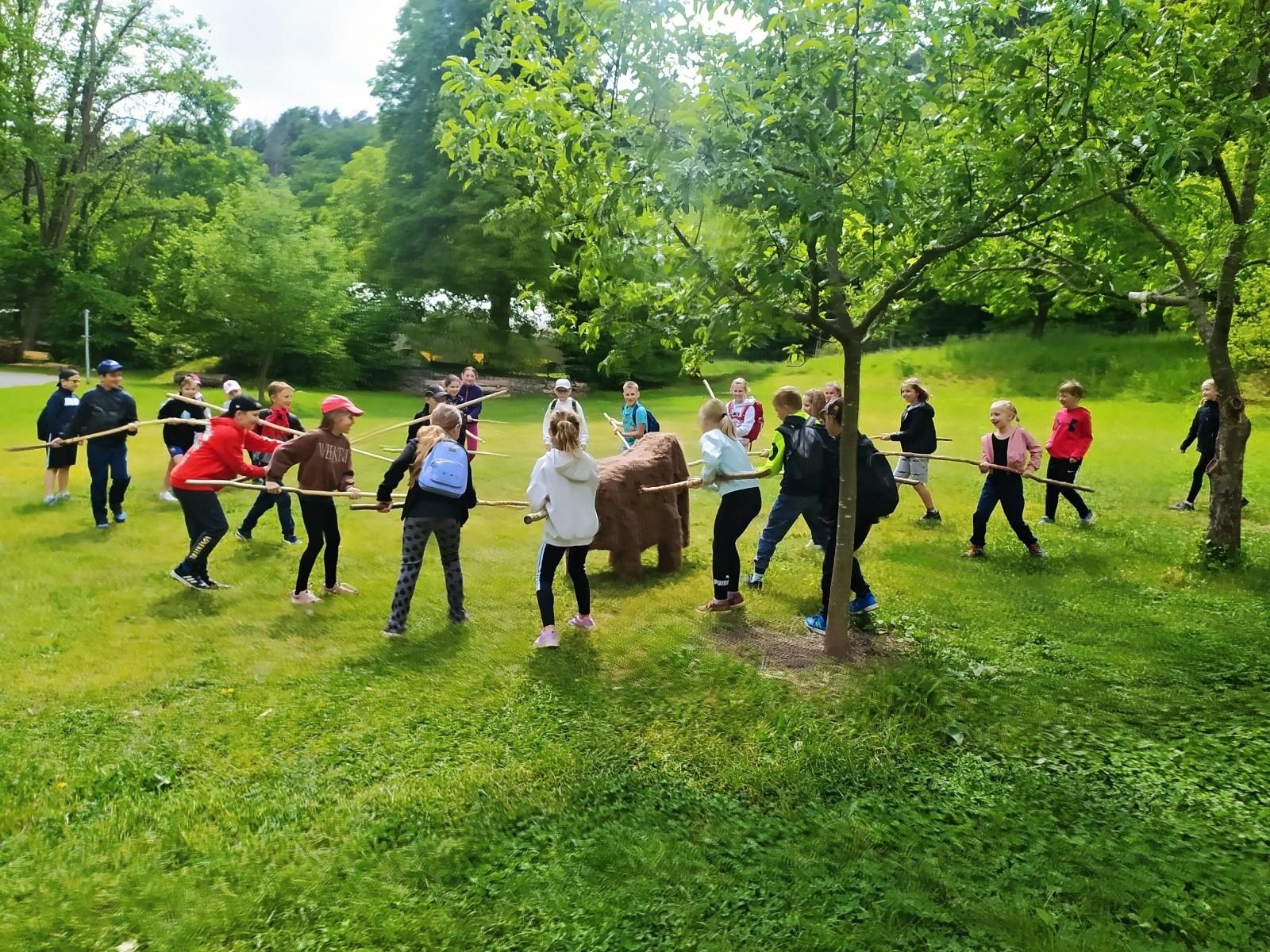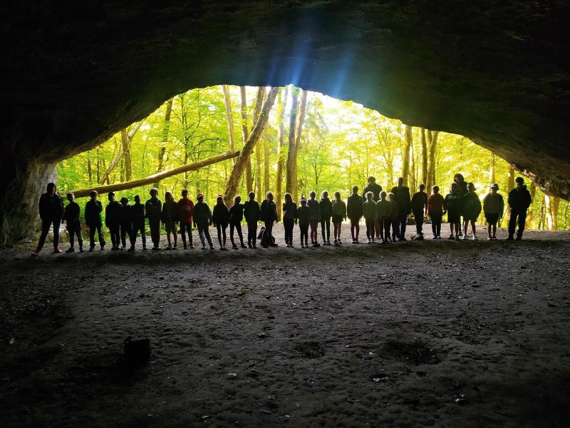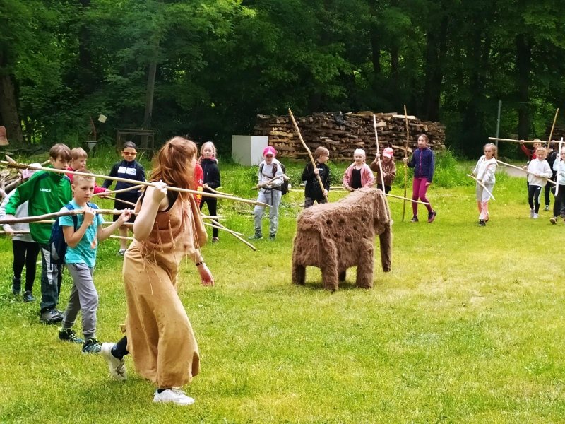Protože je oblast Moravského krasu územím pravěkých lovců jelenů a koní, mohli jsme navštívit jeskyni Pekárna, kde byly objeveny i nástěnné malby, poslechnout si zvuky netopýrů v Ochozské jeskyni a prolézt jeskyní Netopýrka. Taky jsme jako pravěká tlupa ulovili mládě mamuta.