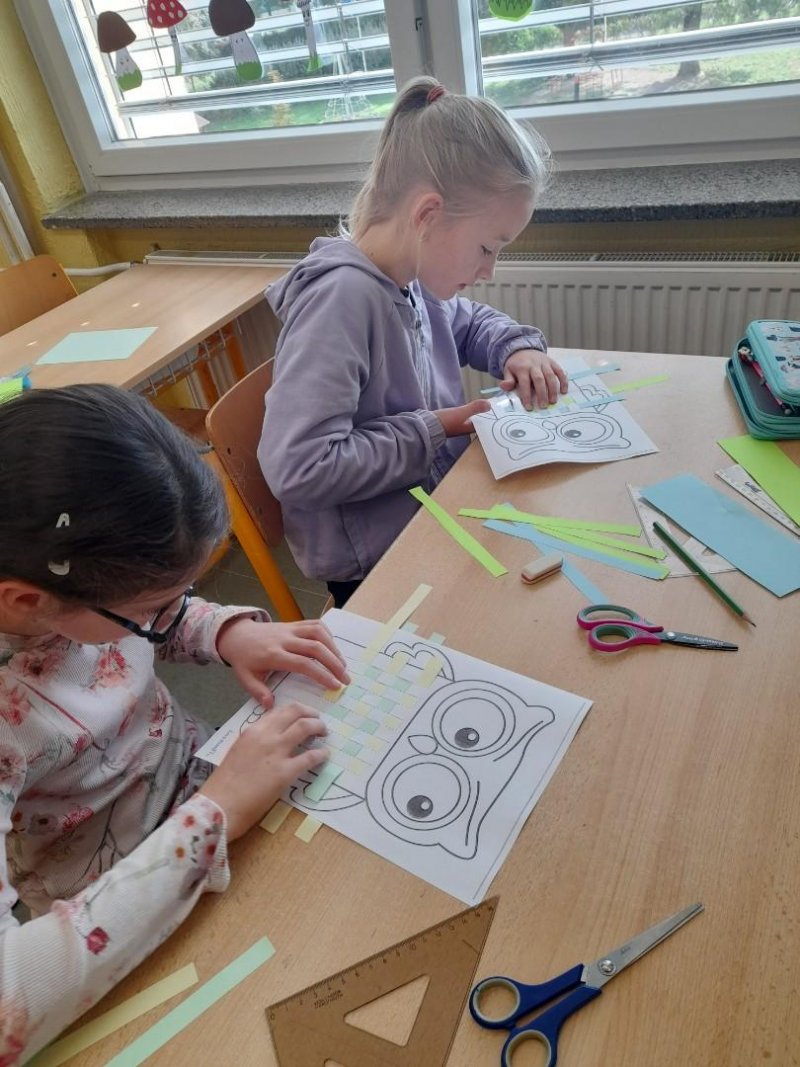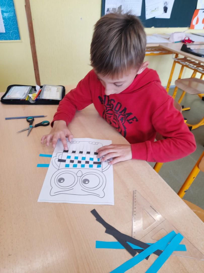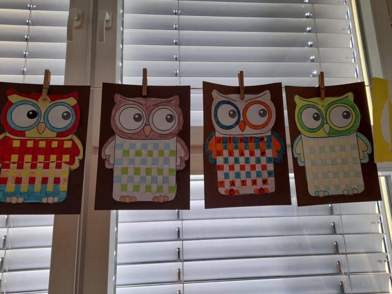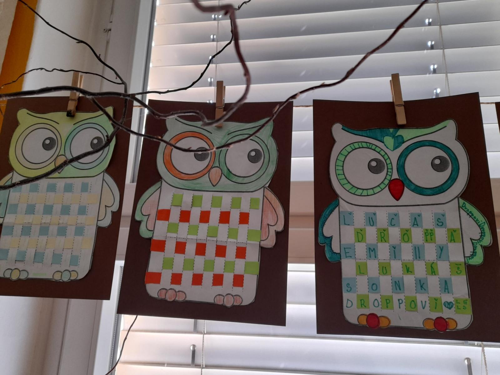 V pracovních činnostech jsme z papíru utkali sovu - proplétali jsme barevné proužky papíru do připravené osnovy. Nebylo to jednoduché, ale zvládli jsme to. A sovy na nás teď dohlíží.