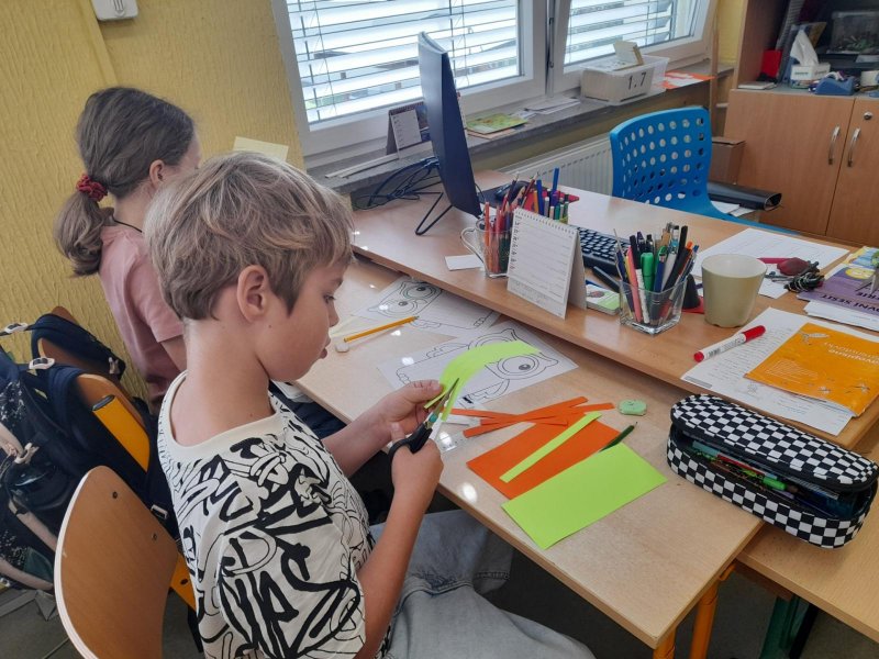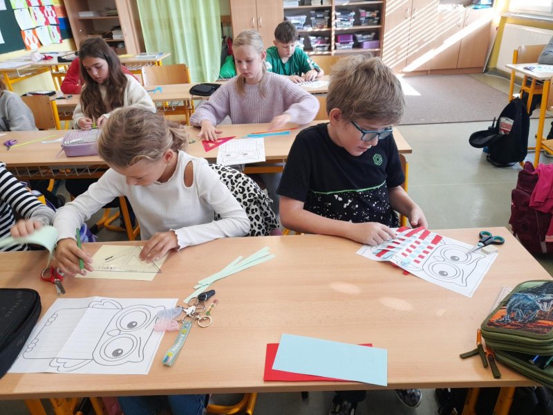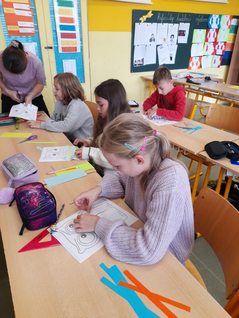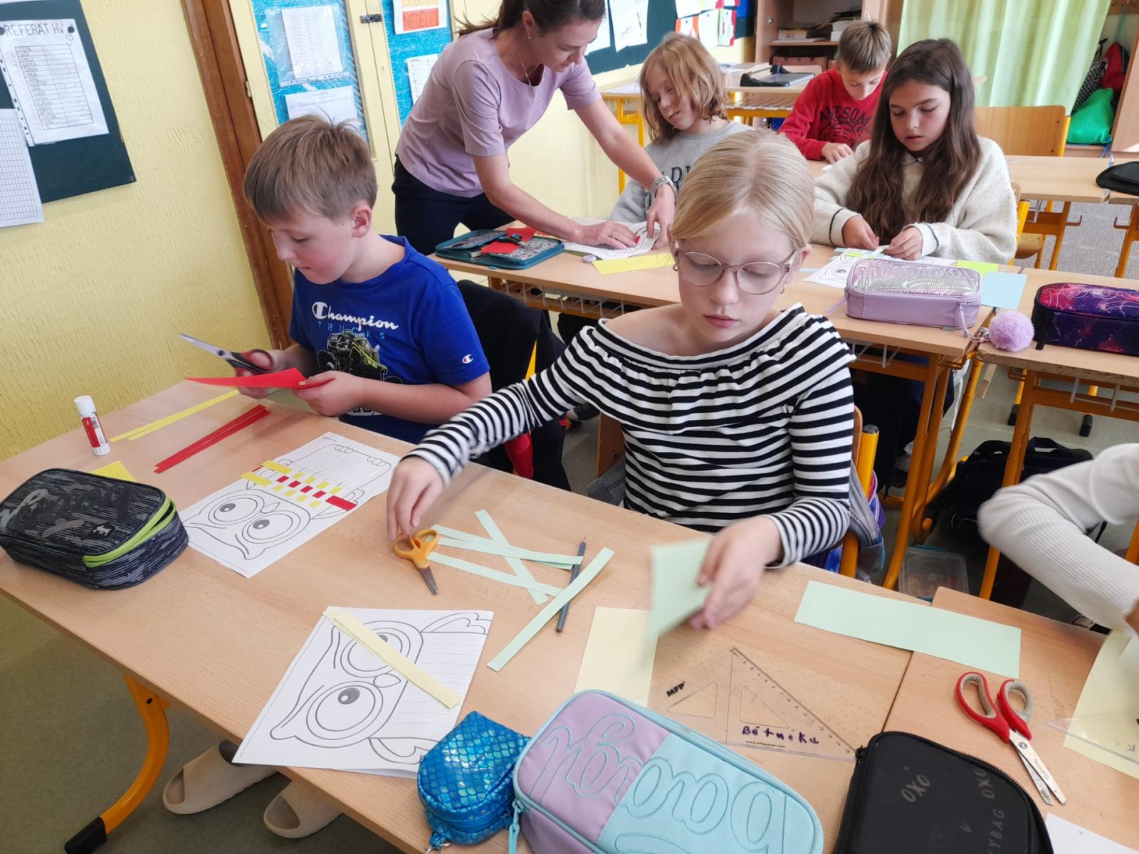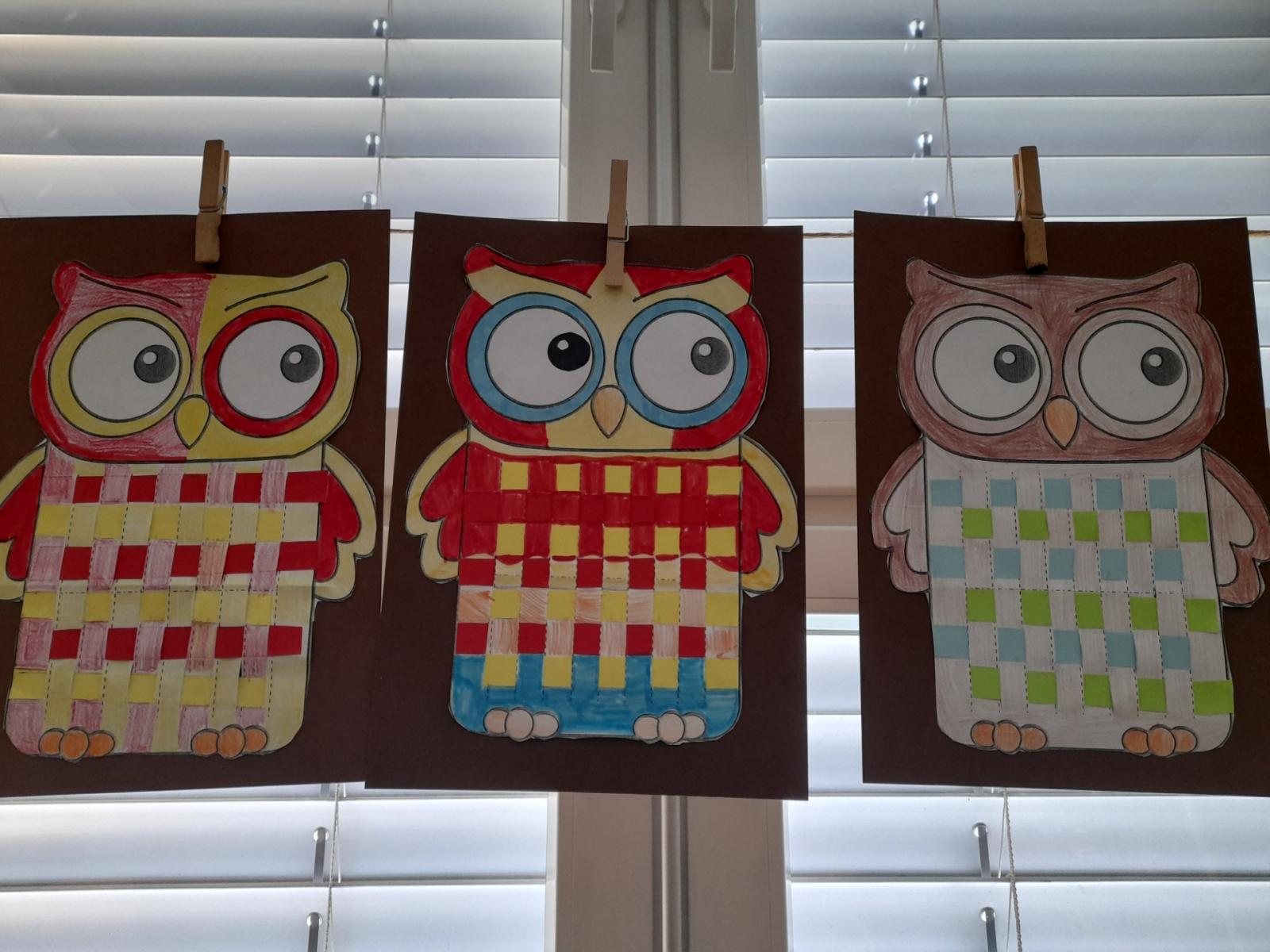 V pracovních činnostech jsme z papíru utkali sovu - proplétali jsme barevné proužky papíru do připravené osnovy. Nebylo to jednoduché, ale zvládli jsme to. A sovy na nás teď dohlíží.