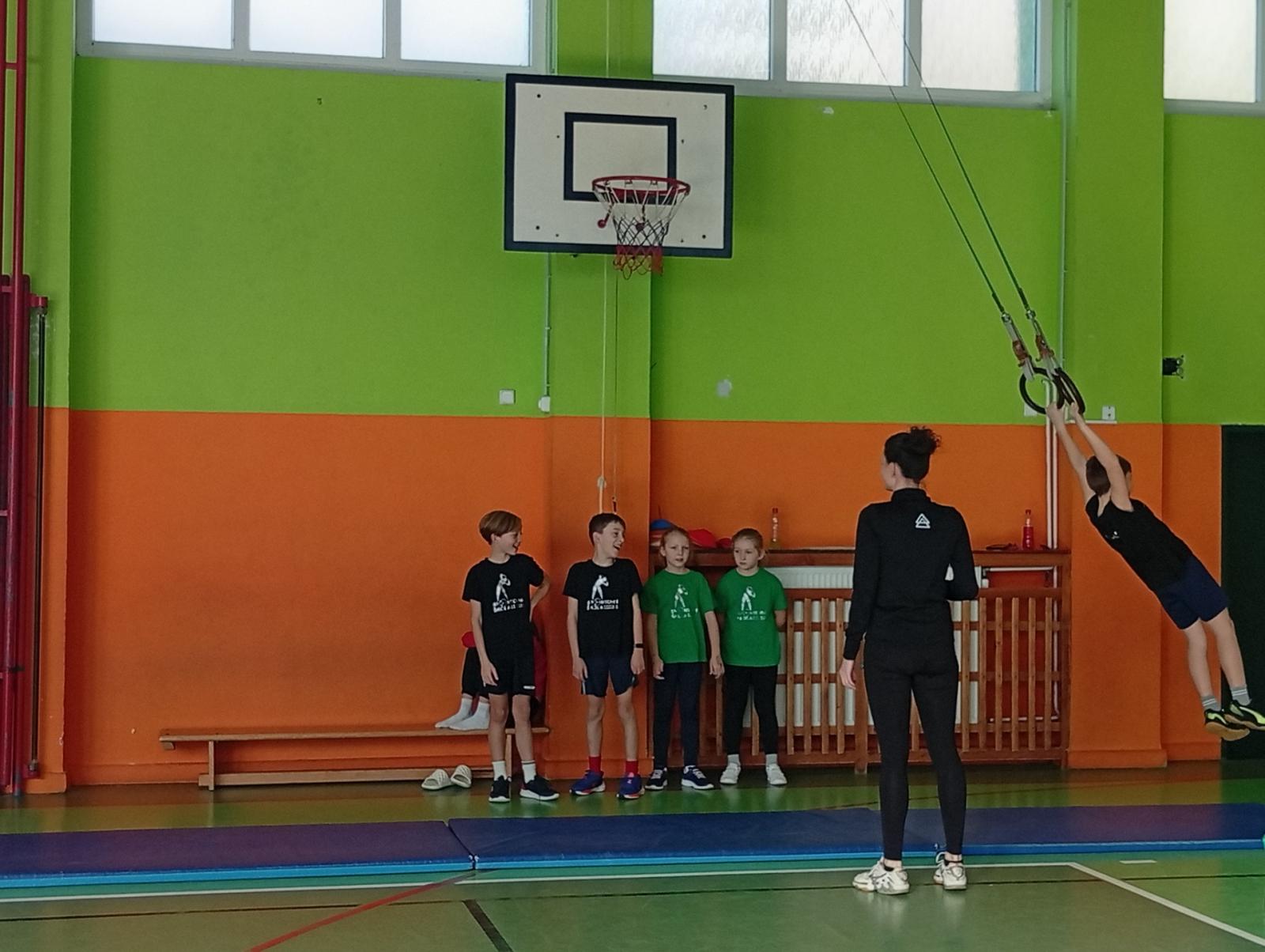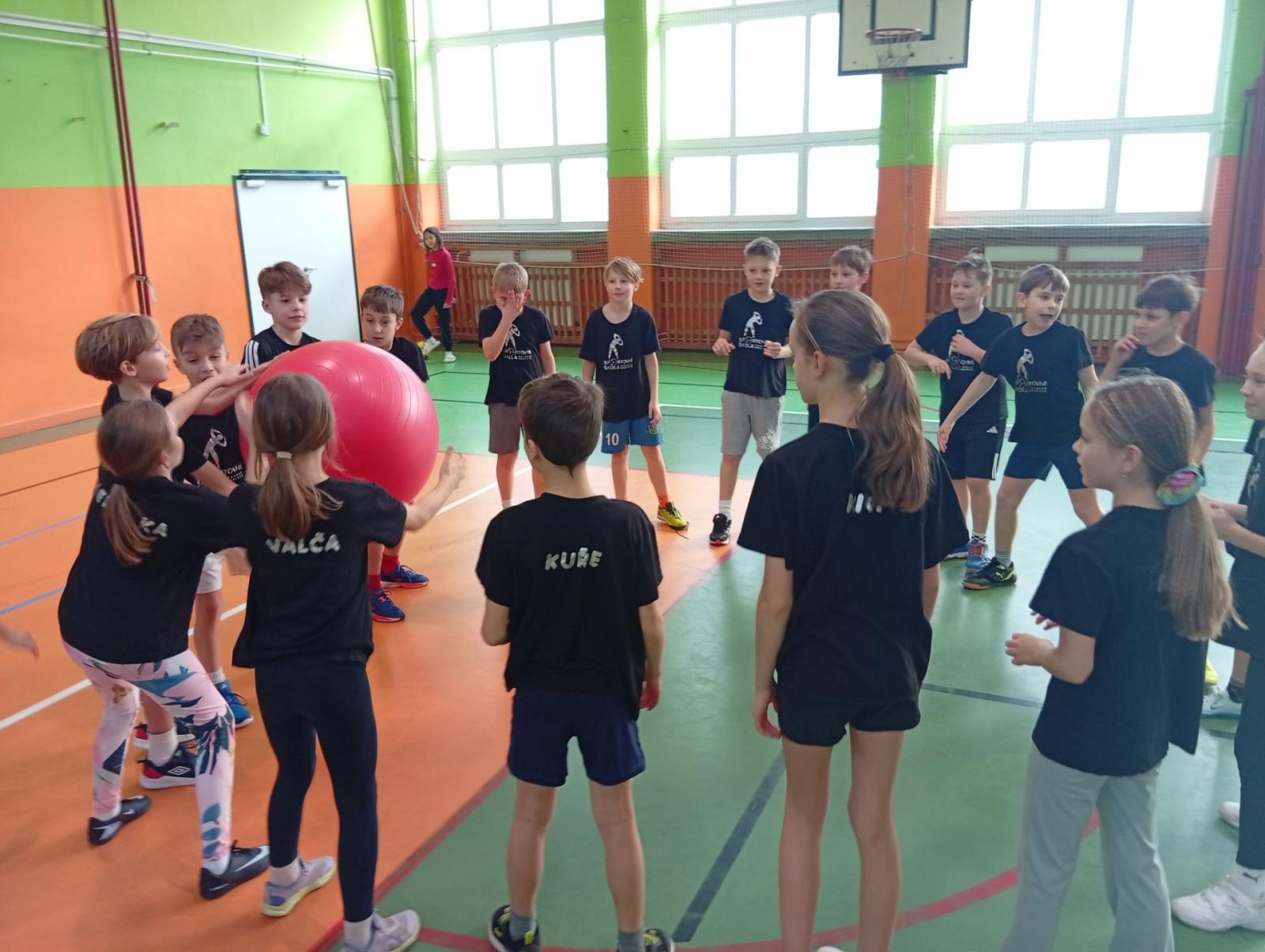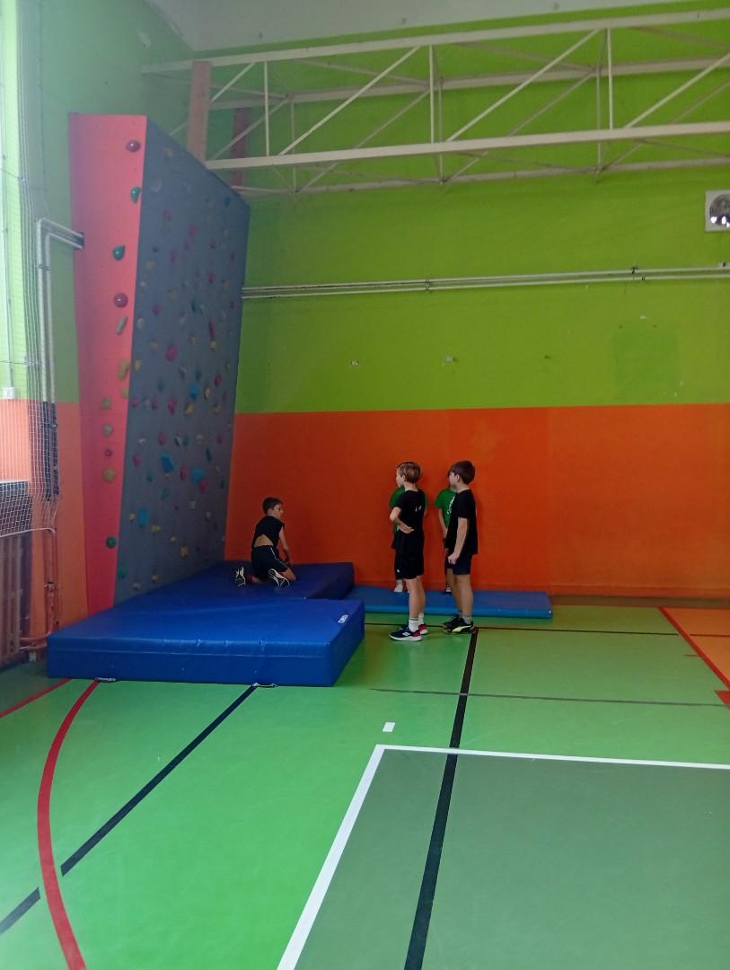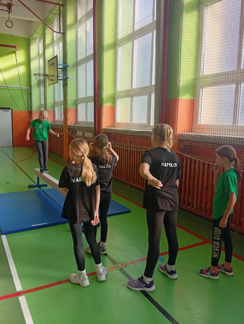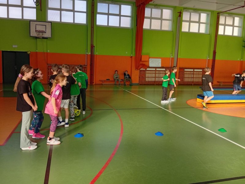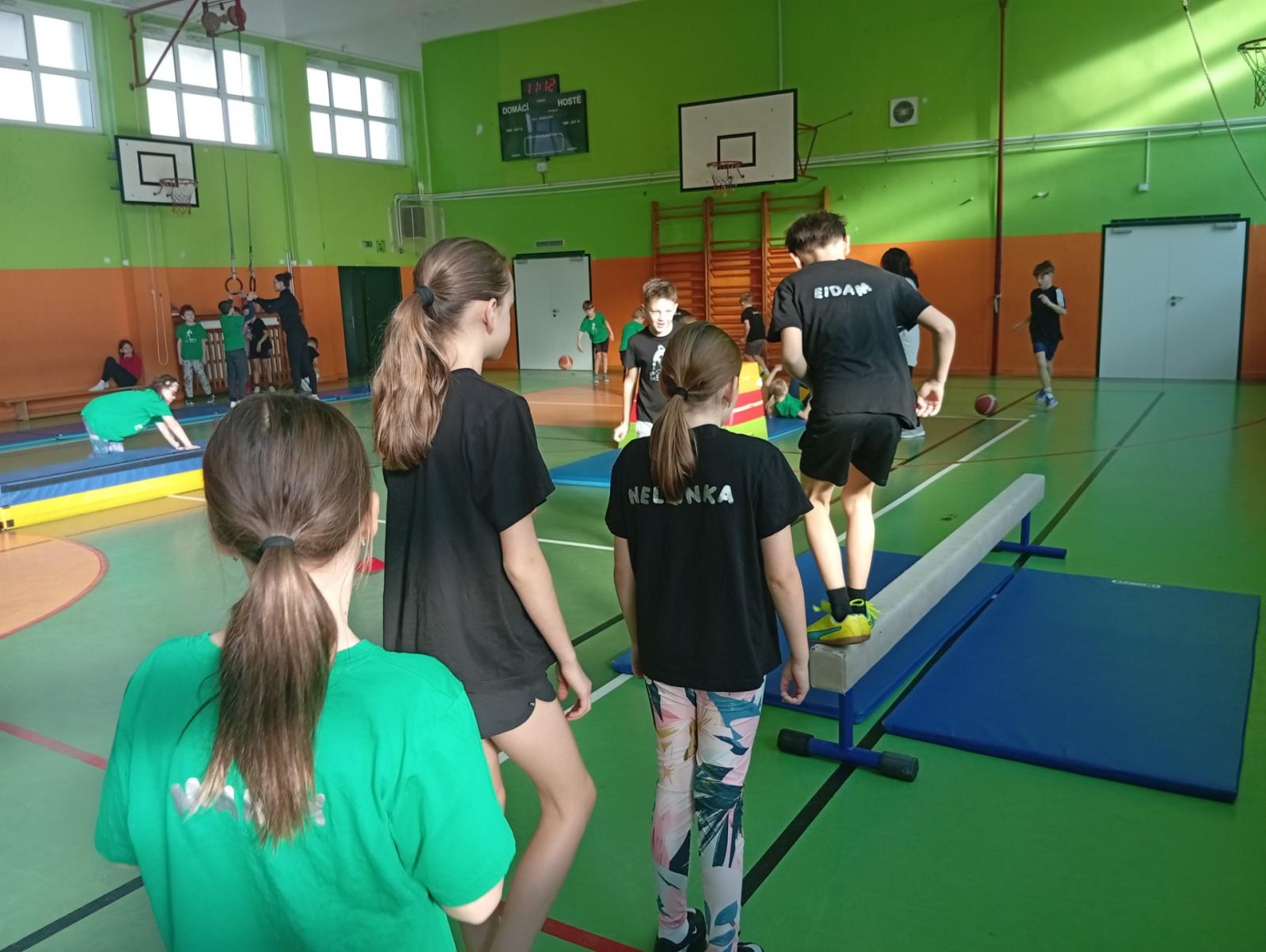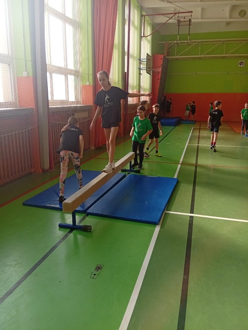 Se třídou 3. B si děti vytvořily 7 různých stanovišť a ve skupinách plnily jednotlivé sportovní disciplíny. Čtvrťáci pomáhali třeťákům, vzájemně spolupracovali a všichni si to užili. Zejména na kruzích a lezecké stěně. Nakonec si každá třída zvlášť ještě zahrála rychlostní hru Dohoníš míč? a pak už jsme museli uvolnit tělocvičnu dalším třídám:)