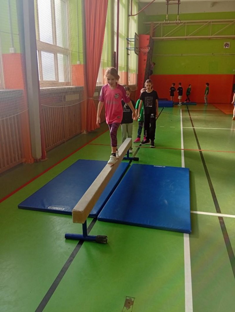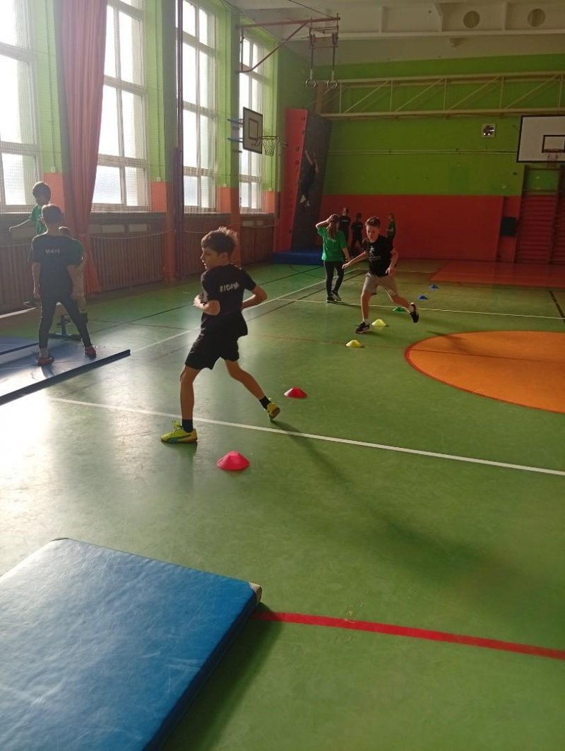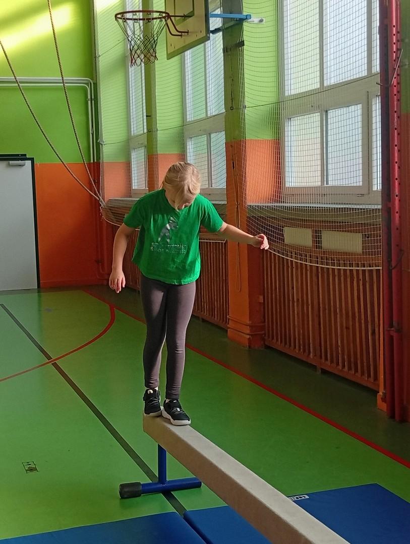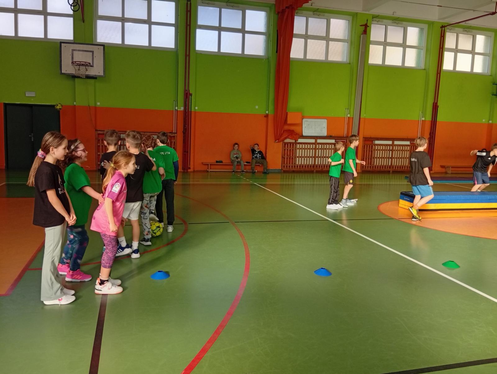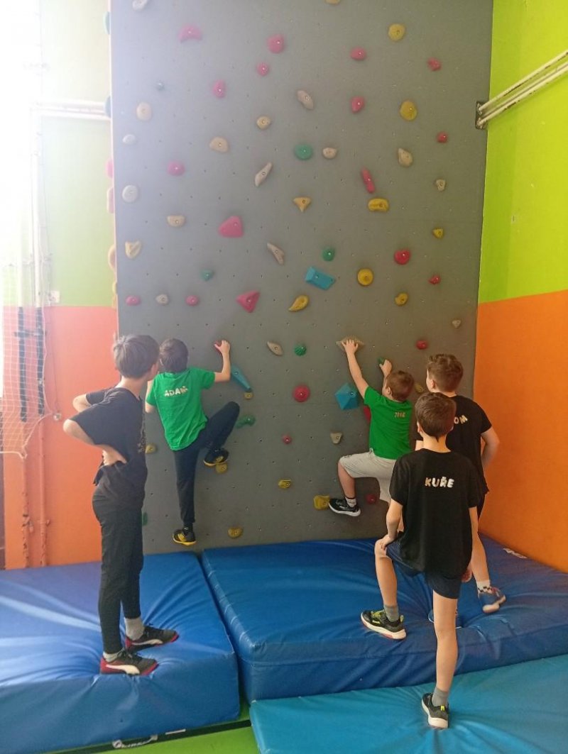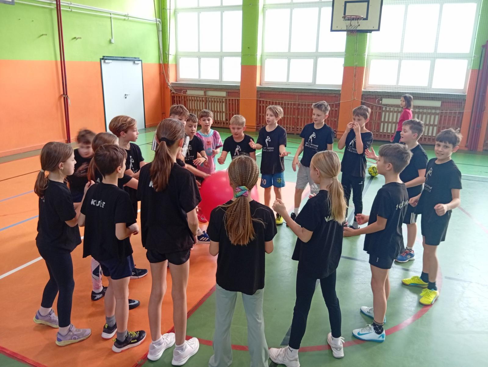 Se třídou 3. B si děti vytvořily 7 různých stanovišť a ve skupinách plnily jednotlivé sportovní disciplíny. Čtvrťáci pomáhali třeťákům, vzájemně spolupracovali a všichni si to užili. Zejména na kruzích a lezecké stěně. Nakonec si každá třída zvlášť ještě zahrála rychlostní hru Dohoníš míč? a pak už jsme museli uvolnit tělocvičnu dalším třídám:)
