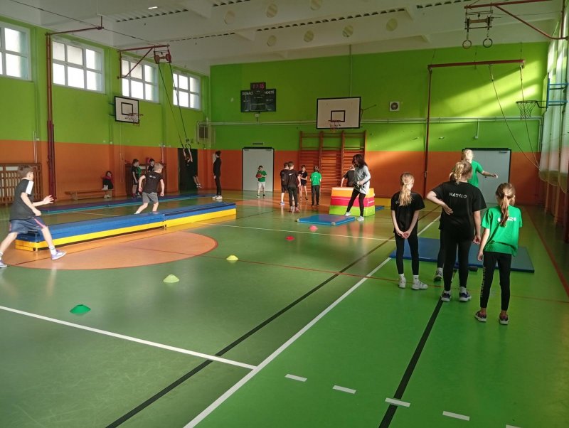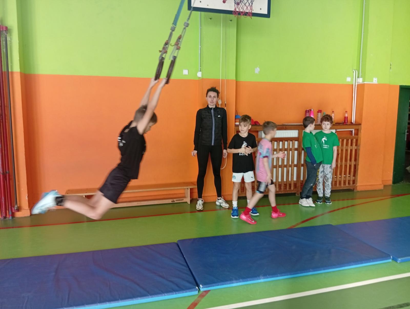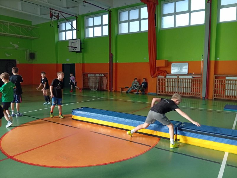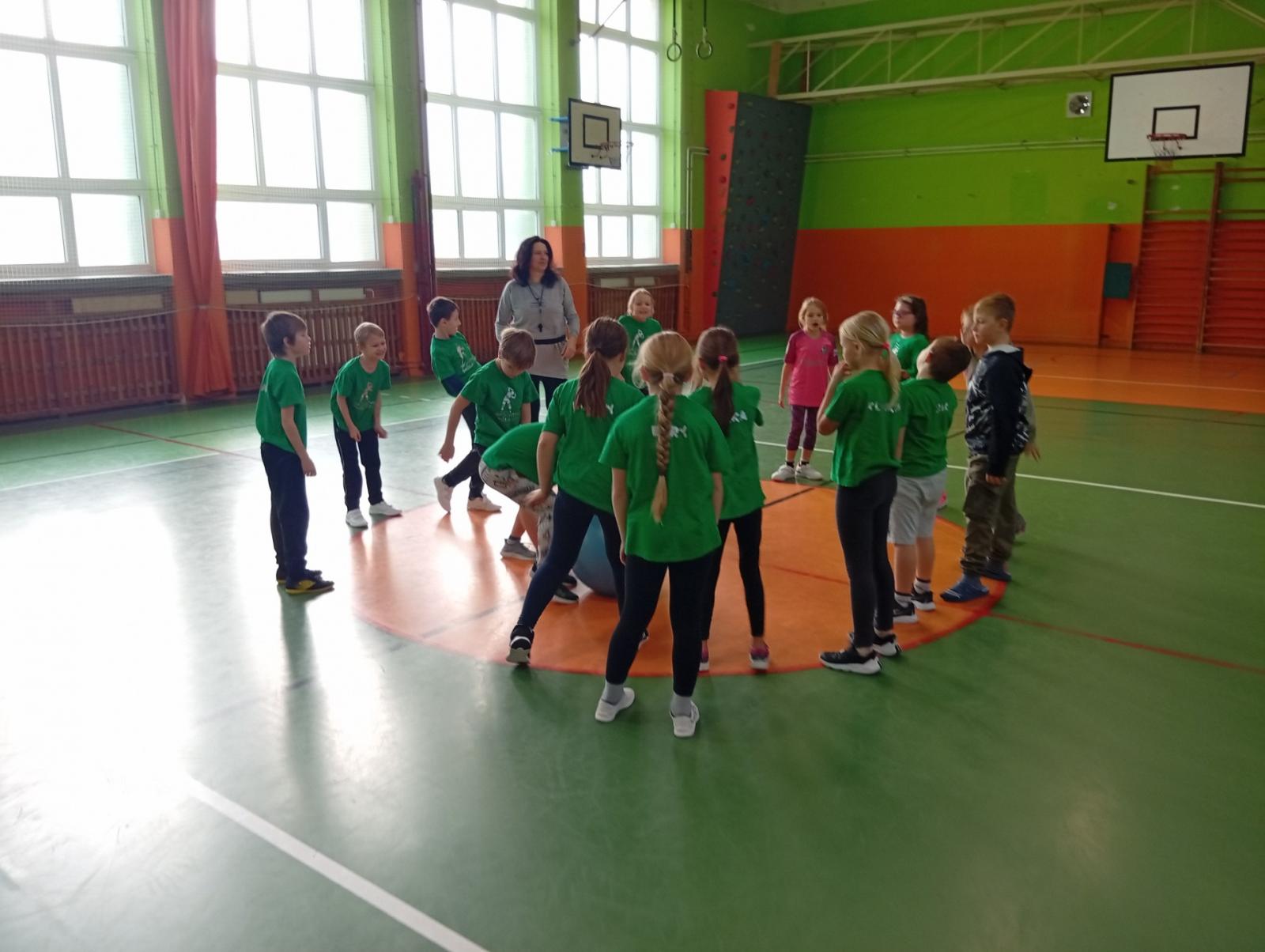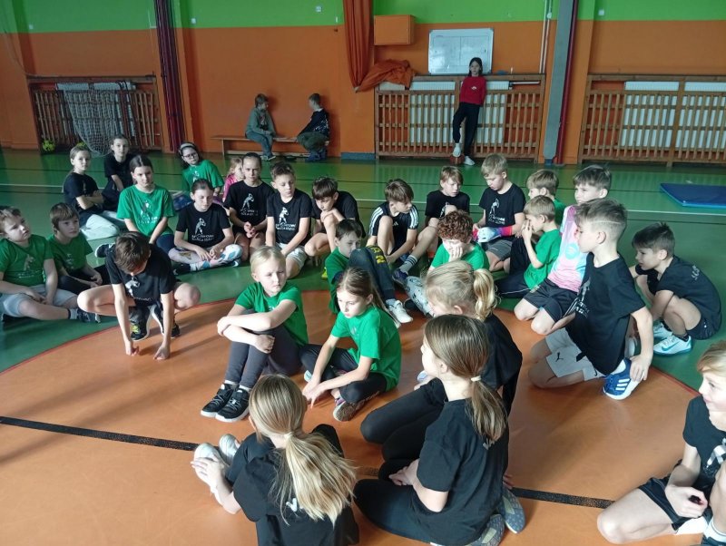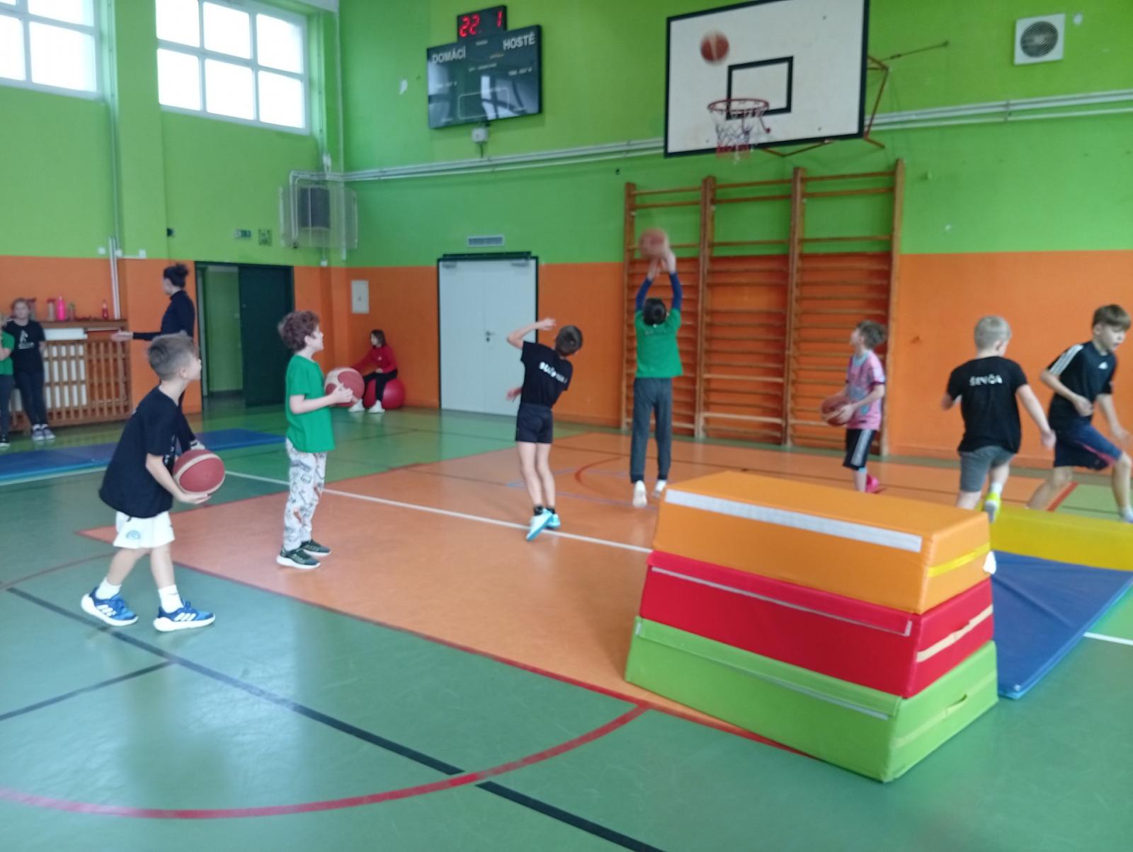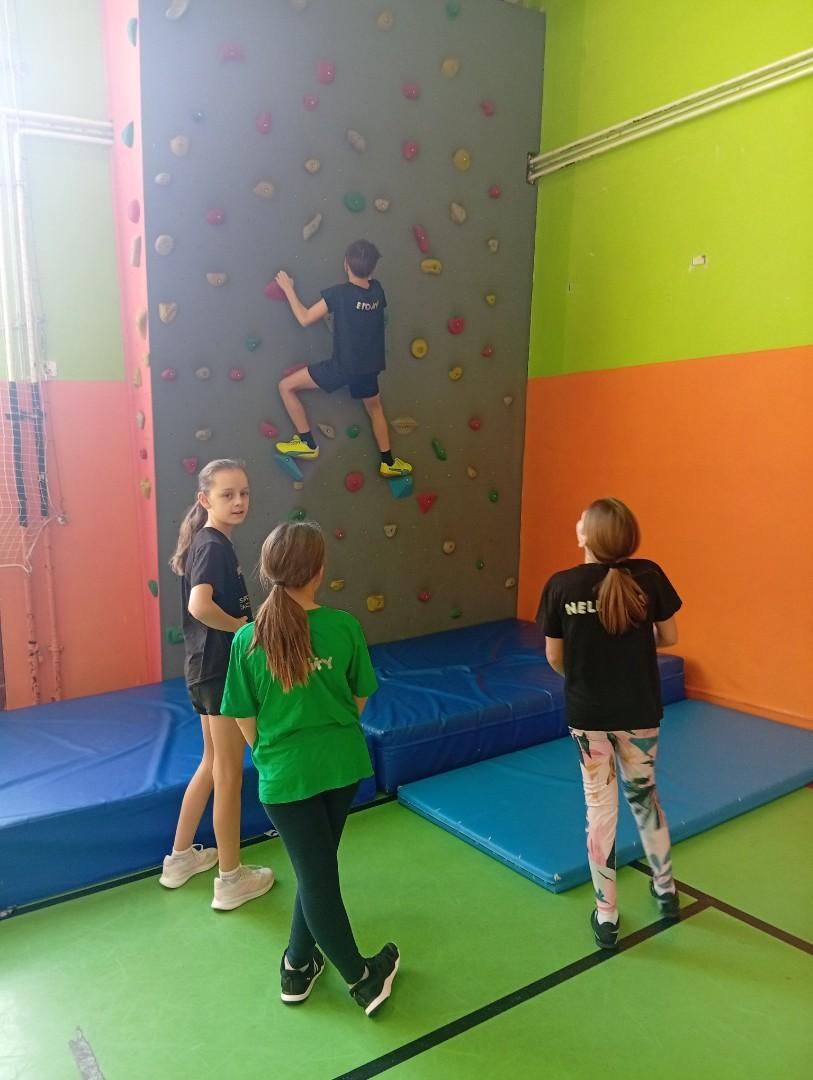 Se třídou 3. B si děti vytvořily 7 různých stanovišť a ve skupinách plnily jednotlivé sportovní disciplíny. Čtvrťáci pomáhali třeťákům, vzájemně spolupracovali a všichni si to užili. Zejména na kruzích a lezecké stěně. Nakonec si každá třída zvlášť ještě zahrála rychlostní hru Dohoníš míč? a pak už jsme museli uvolnit tělocvičnu dalším třídám:)