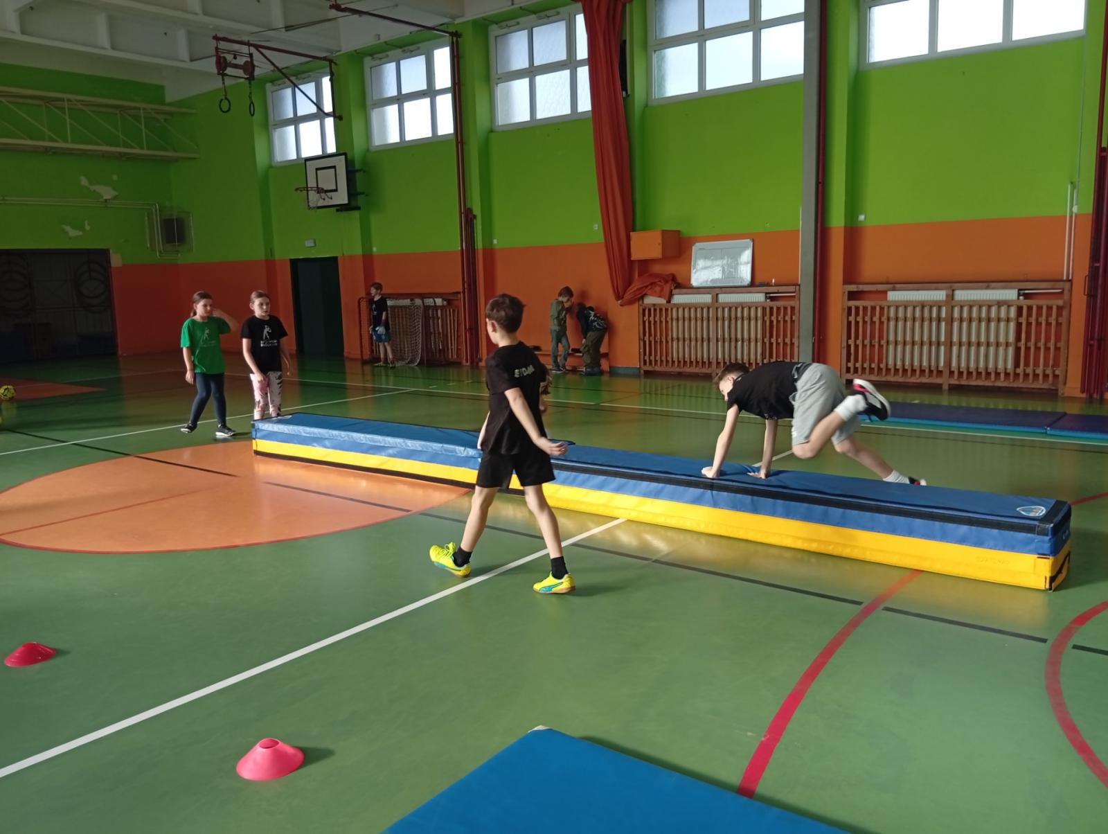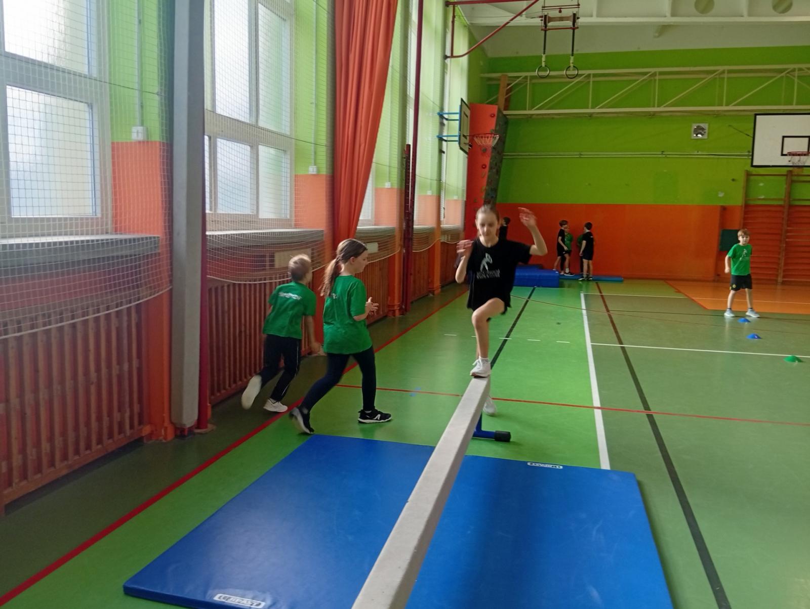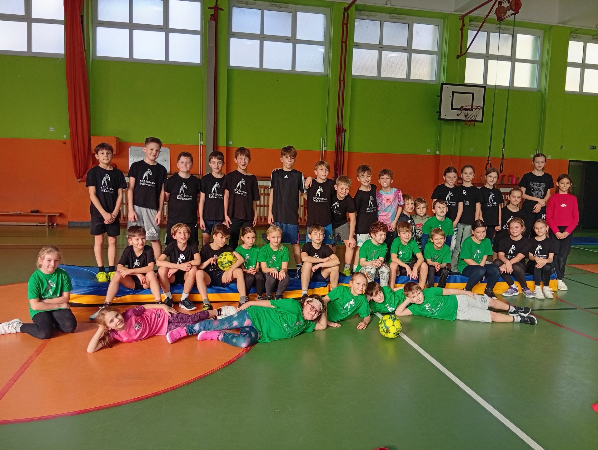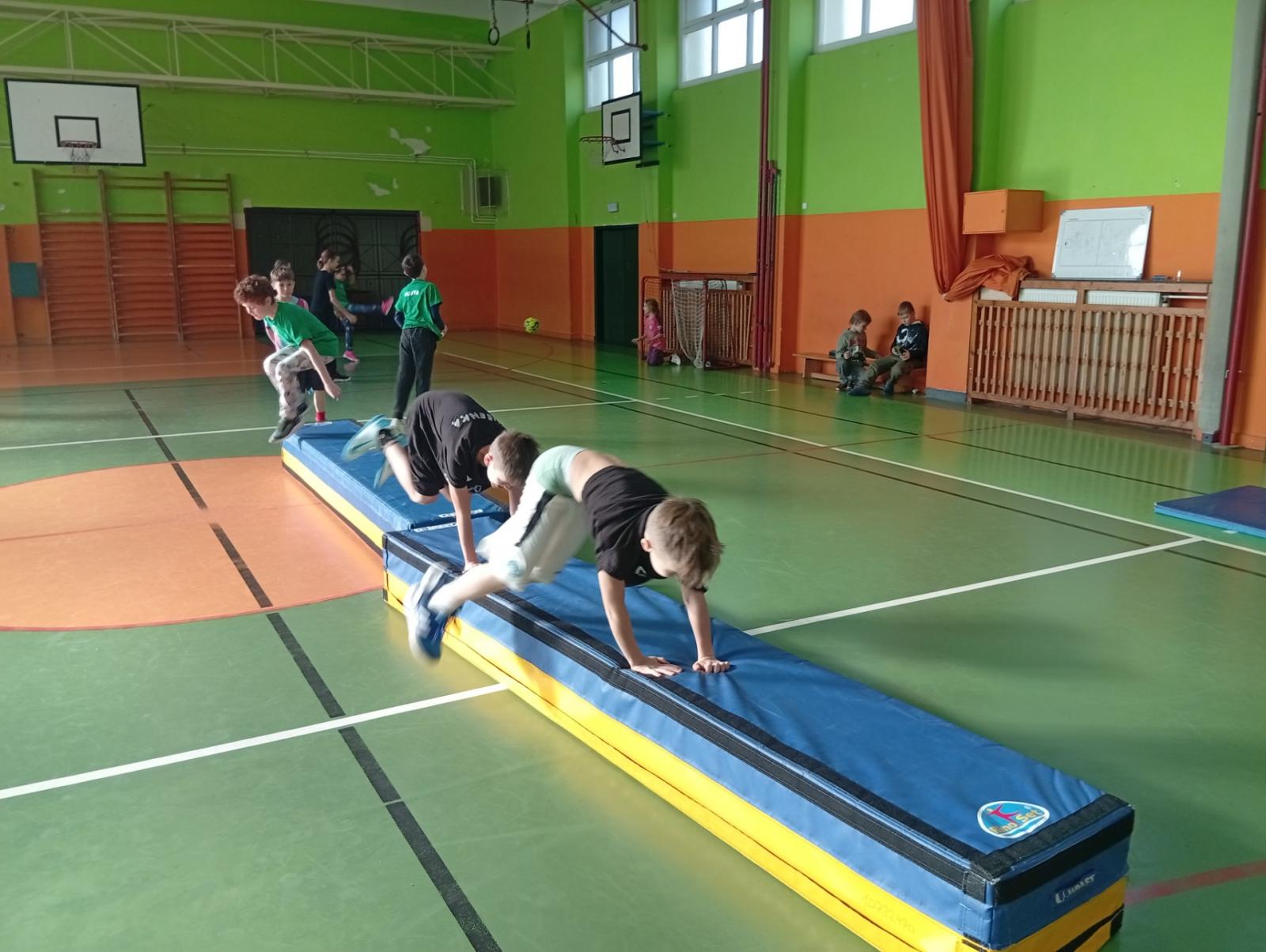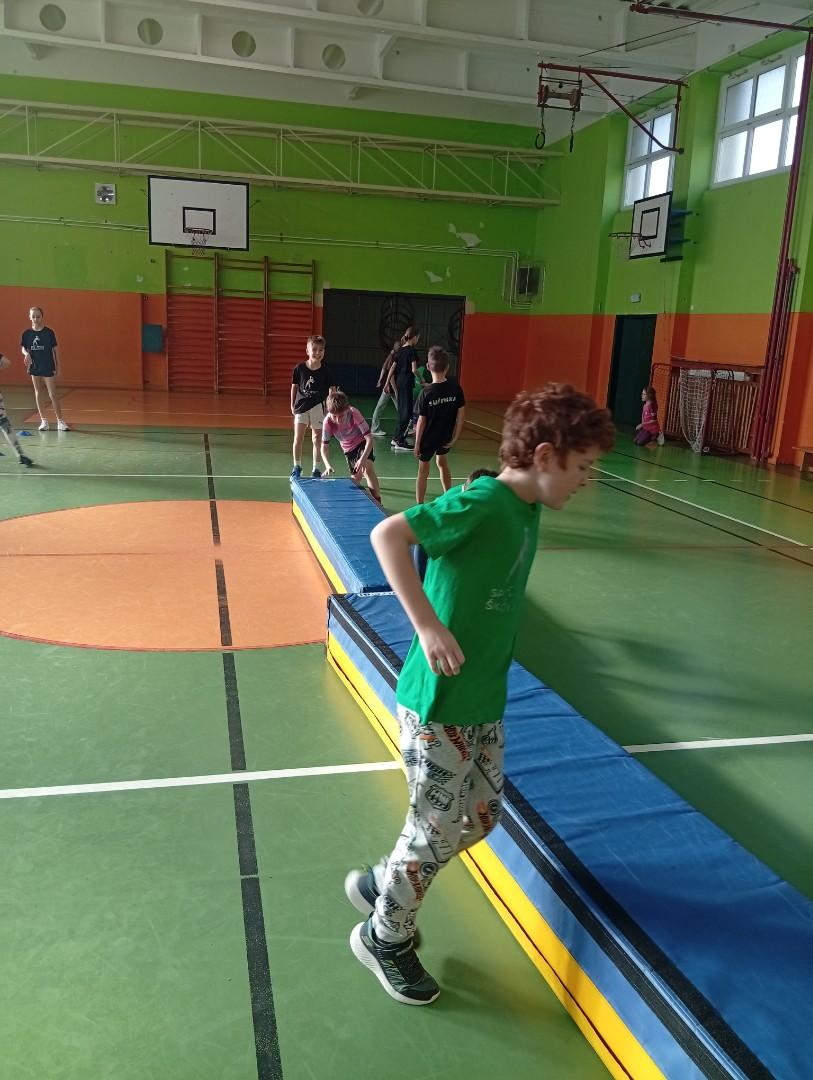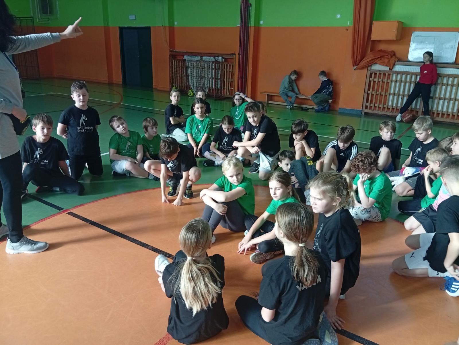 Se třídou 3. B si děti vytvořily 7 různých stanovišť a ve skupinách plnily jednotlivé sportovní disciplíny. Čtvrťáci pomáhali třeťákům, vzájemně spolupracovali a všichni si to užili. Zejména na kruzích a lezecké stěně. Nakonec si každá třída zvlášť ještě zahrála rychlostní hru Dohoníš míč? a pak už jsme museli uvolnit tělocvičnu dalším třídám:)