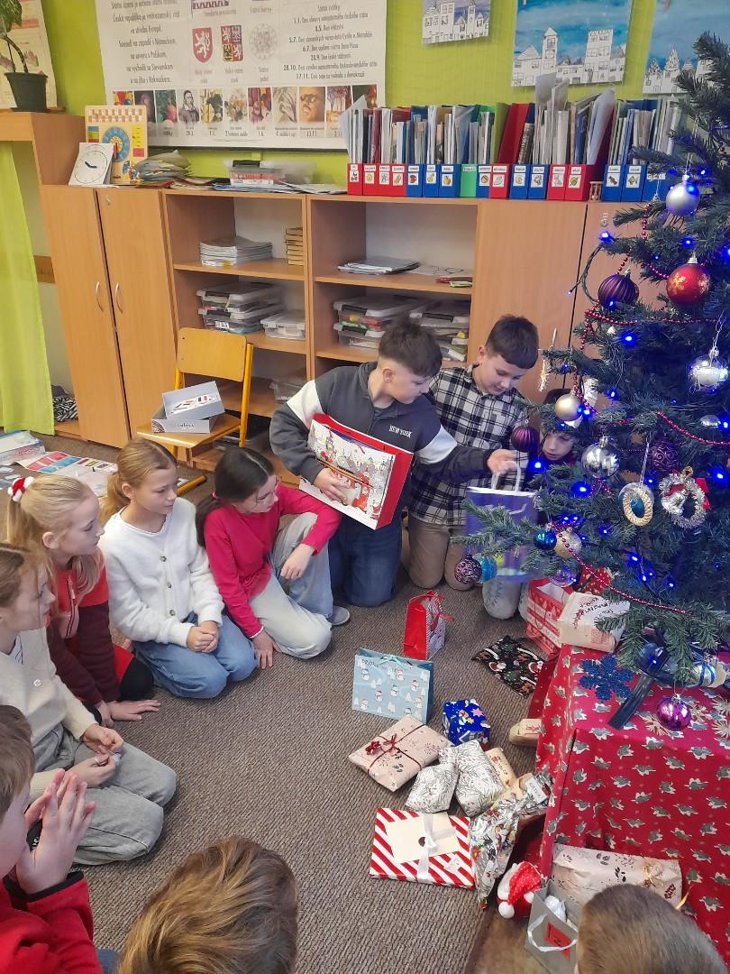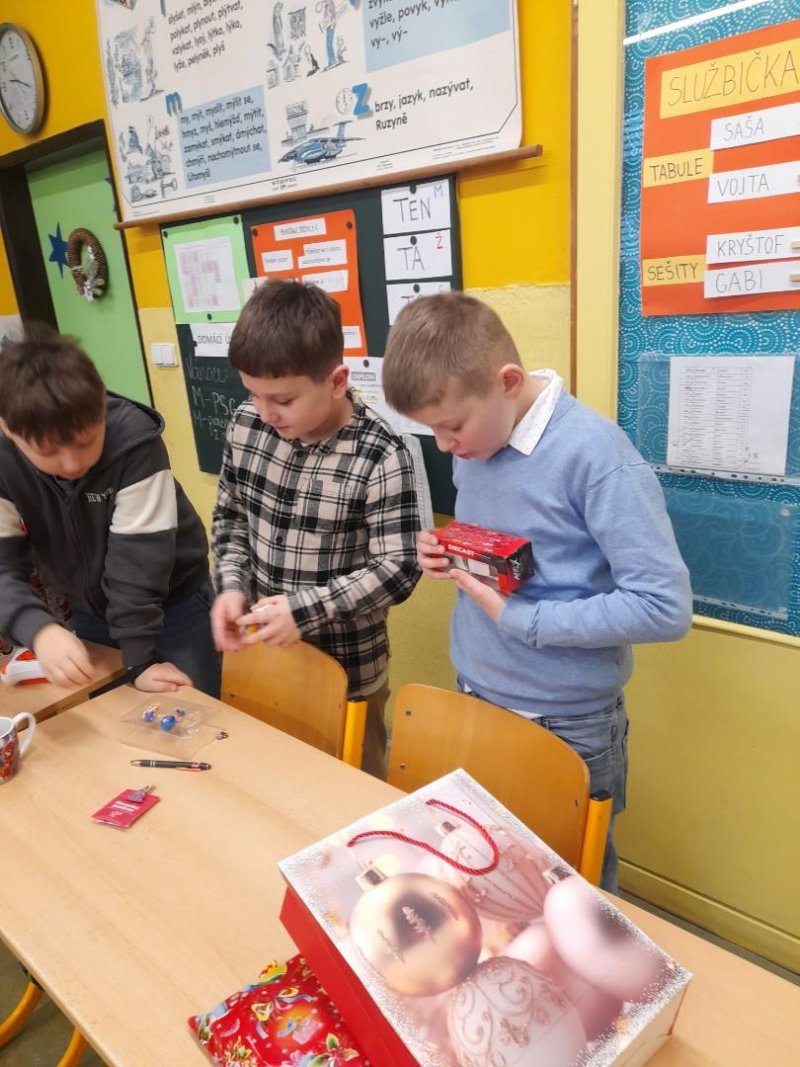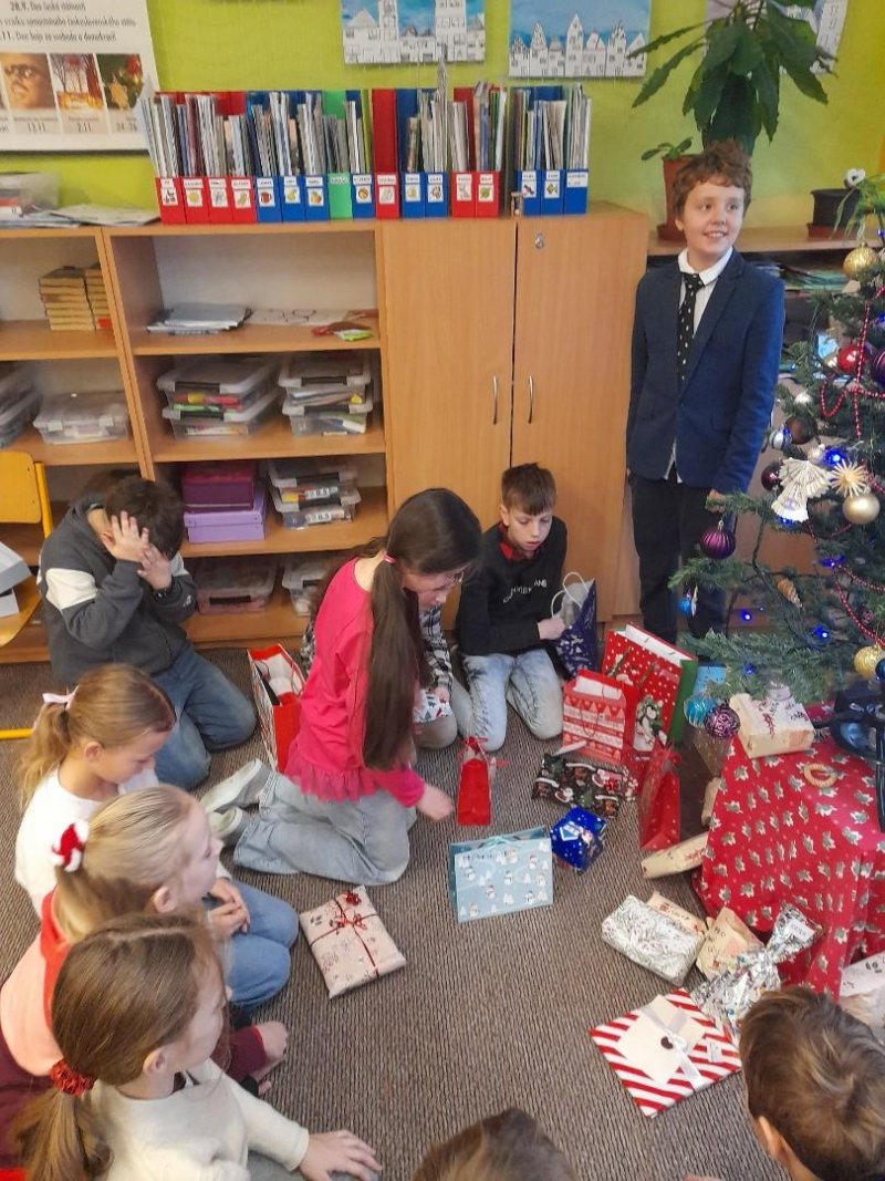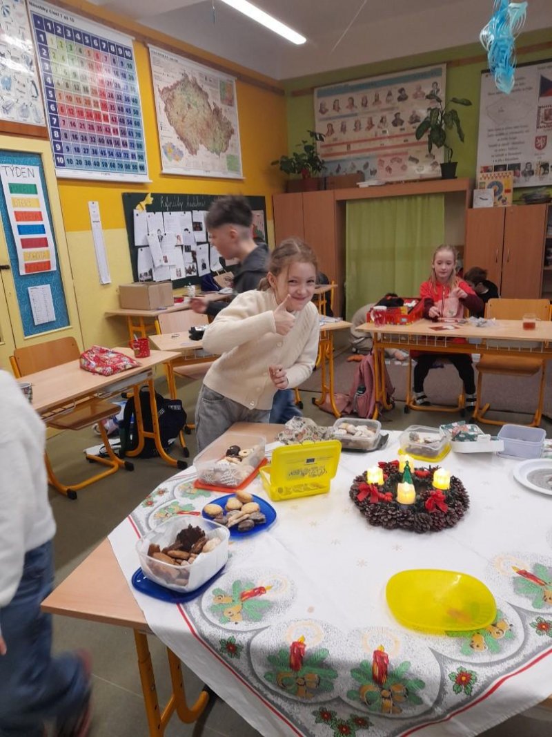 V pátek 19.prosince nás ve třídě přivítala vůně cukroví a čaje, Místo učení jsme si zazpívali, rozdali dárečky a pak se přesunuli na chodbu k vyhodnocení soutěže o nej sněhuláka. Na závěr jsme si společně zakoledovali a poslechli vinšování od pana ředitele.