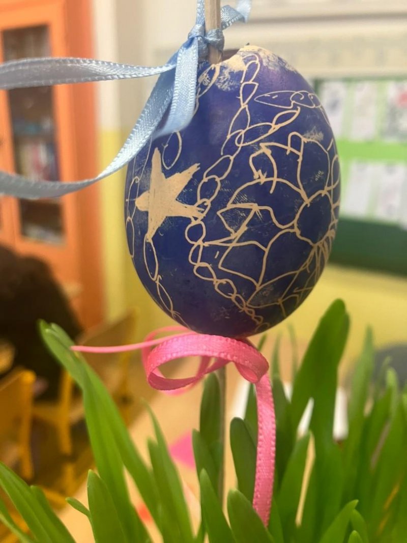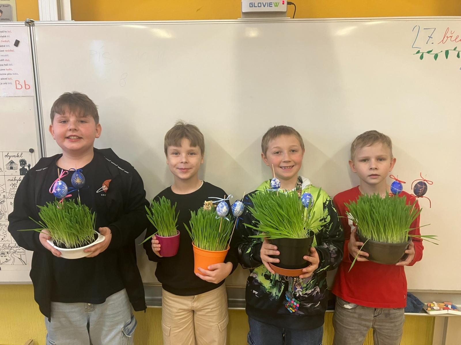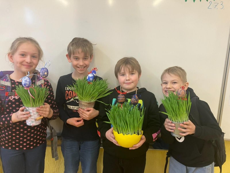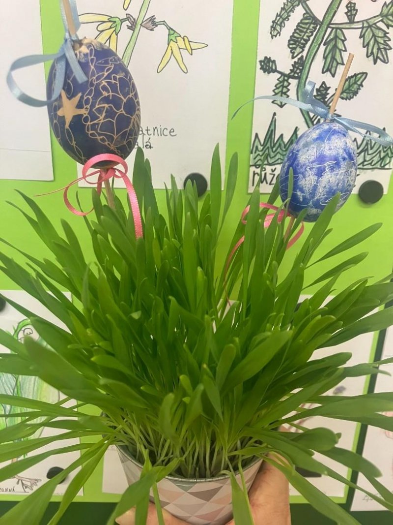 Na letošní svátky jara jsme si vytvořili aranžmá z vysetého osení a kraslic. K výzdobě vajíček jsme se inspirovali u lidových maléreček. Zaujala nás přesnost a preciznost vyškrabávaných motivů. I my jsme se položili do jemné práce, ale mnozí z nás bojovali se zavázáním zdobných mašliček. Všem přejeme veselé Velikonoce !