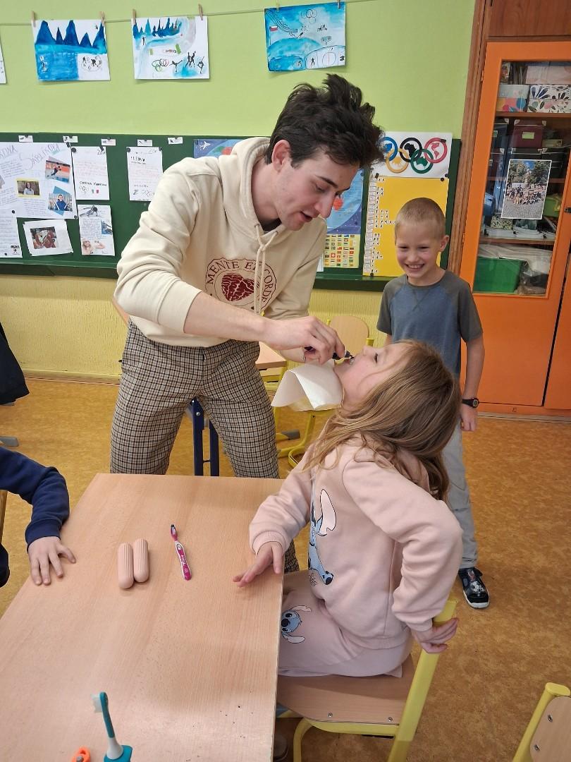 V minulých dnech měli žáci nižších ročníků možnost zúčastnit se zajímavé a velmi poučné přednášky zaměřené na zdraví zubů a správnou péči o ústní dutinu. Přednášku pro děti připravili studenti Lékařské fakulty Univerzity Palackého v Olomouci, kteří k nám přijeli, aby dětem přiblížili, jak důležité je starat se o své zuby už od útlého věku.