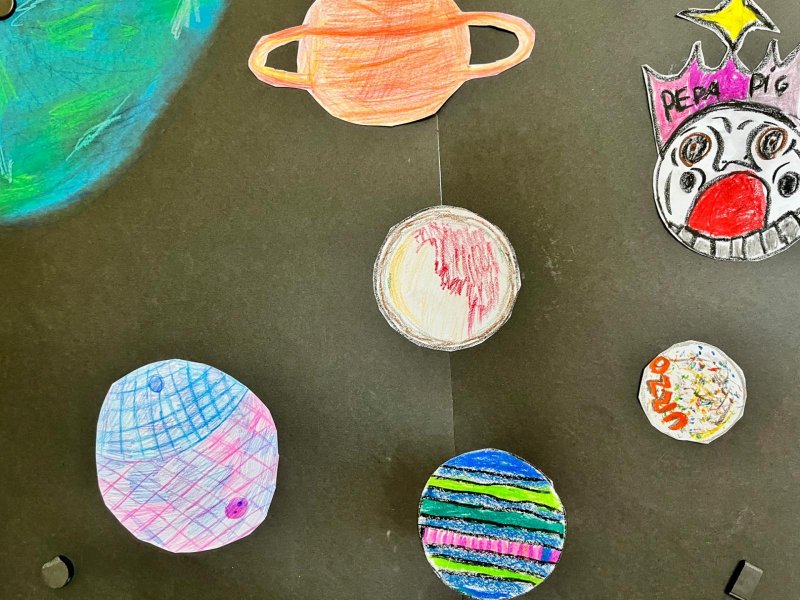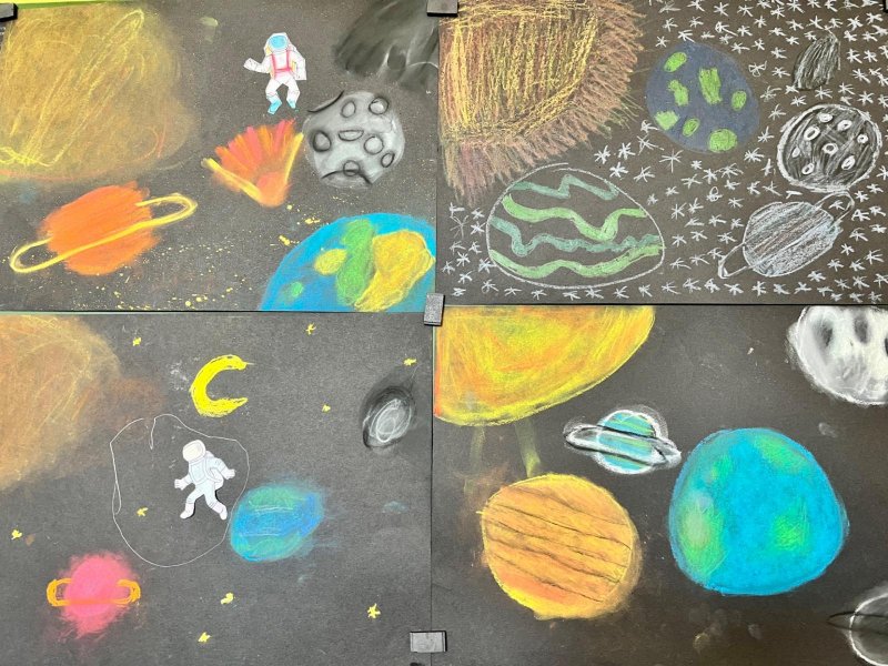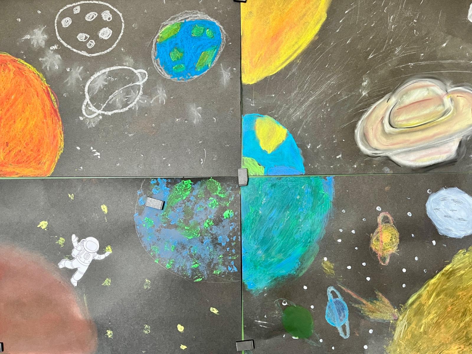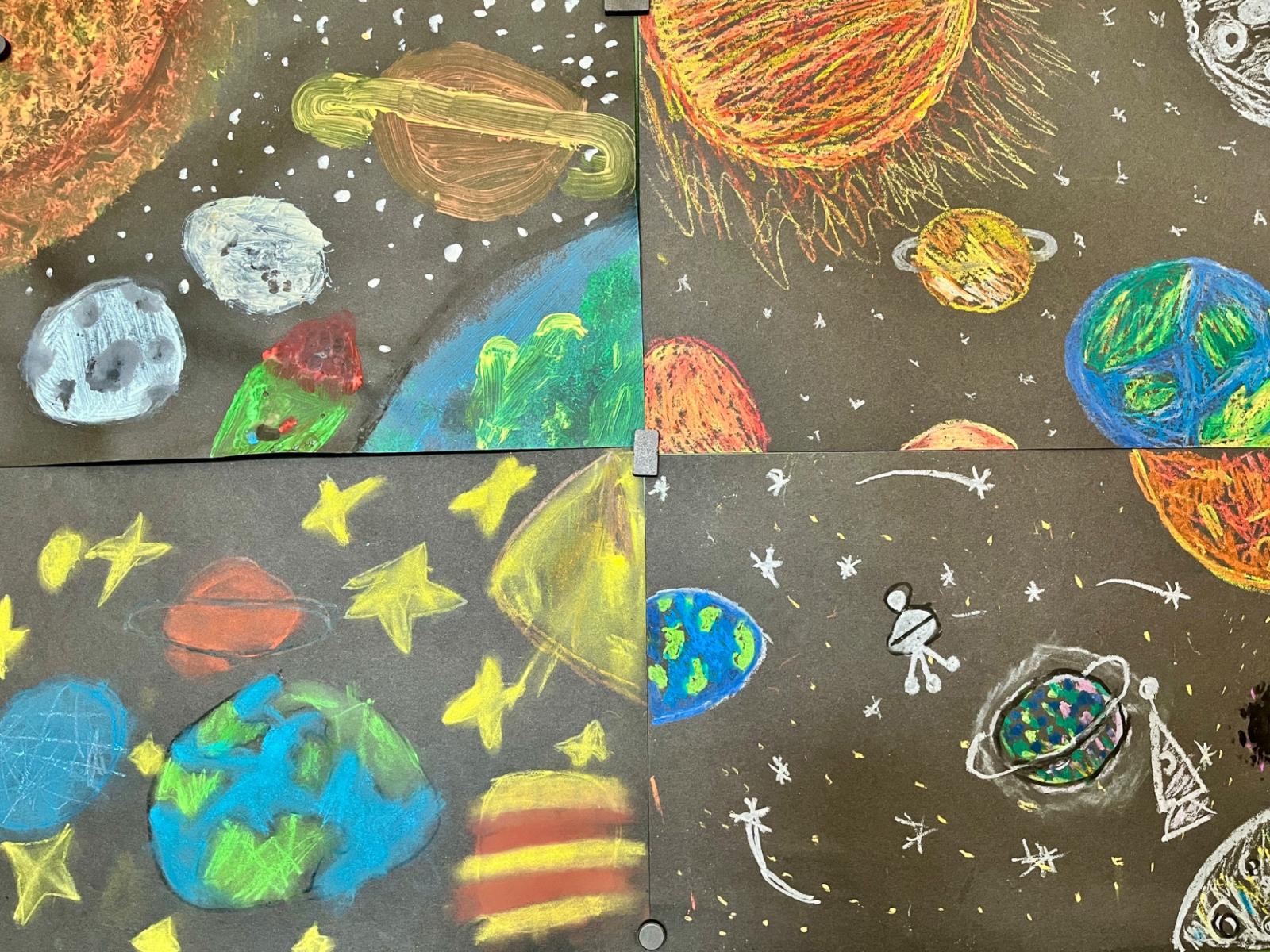 V předmětu Člověk a svět jsme se věnovali Sluneční soustavě. Moc nás toto téma bavilo a zajímalo, a tak jsme se mu věnovali i ve výtvarné výchově.