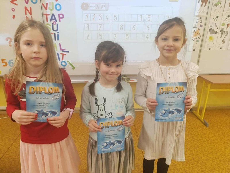 Výsledky plavecké soutěže v naší třídě - 1. místo Majda Píchová, 2. místo Adélka Švajdová, 3. místo Zoe Remešová - Gratulujeme