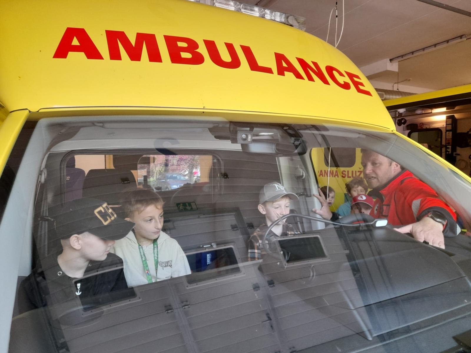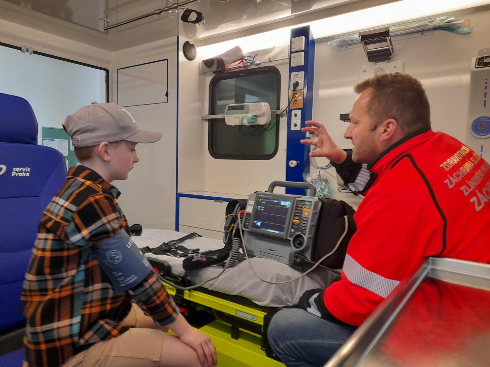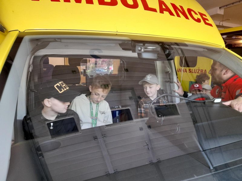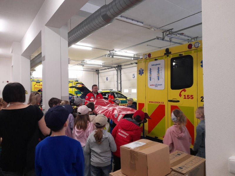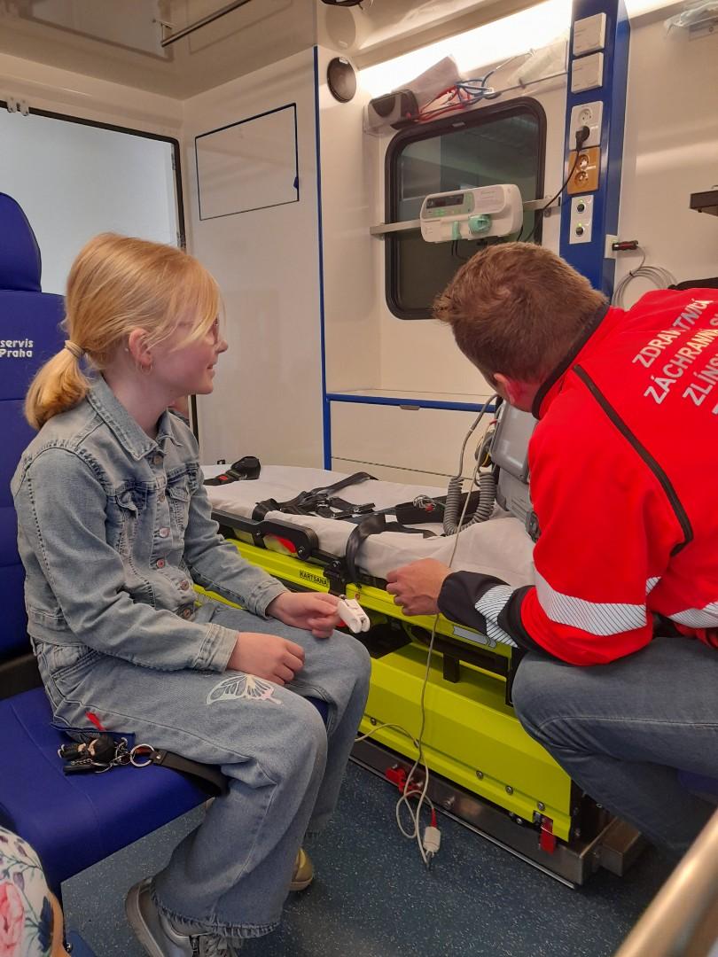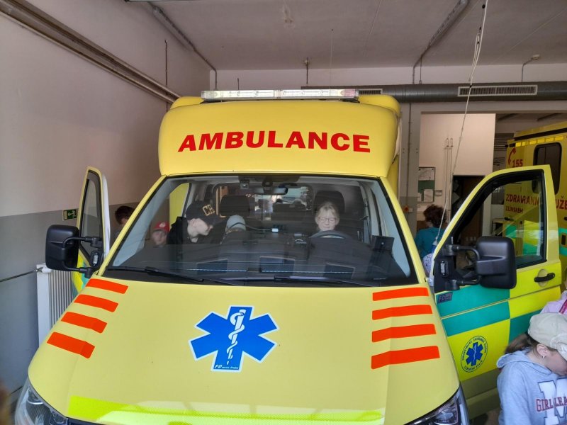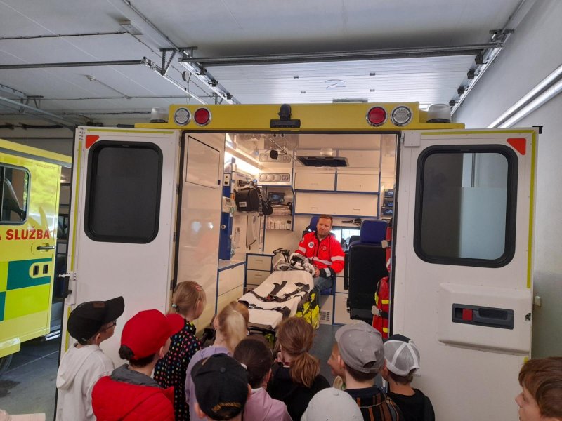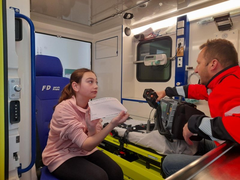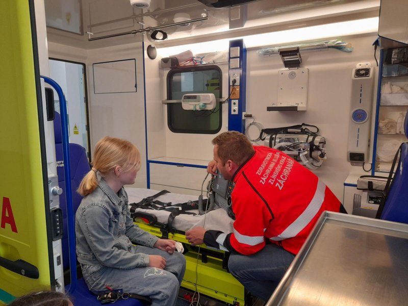 Přivítal nás milý záchranář, pan Jiří Vašica, také absolvent naší školy. Představil nám vybavení a přístroje, které zachraňují lidské životy. Sami jsme si vyzkoušeli roli pacienta, kdy nám měřil puls, EKG či nás transportoval na nosítkách.