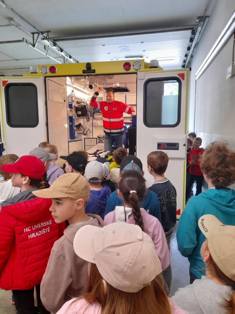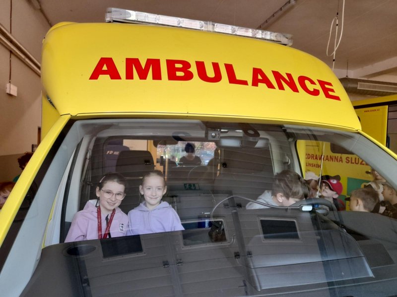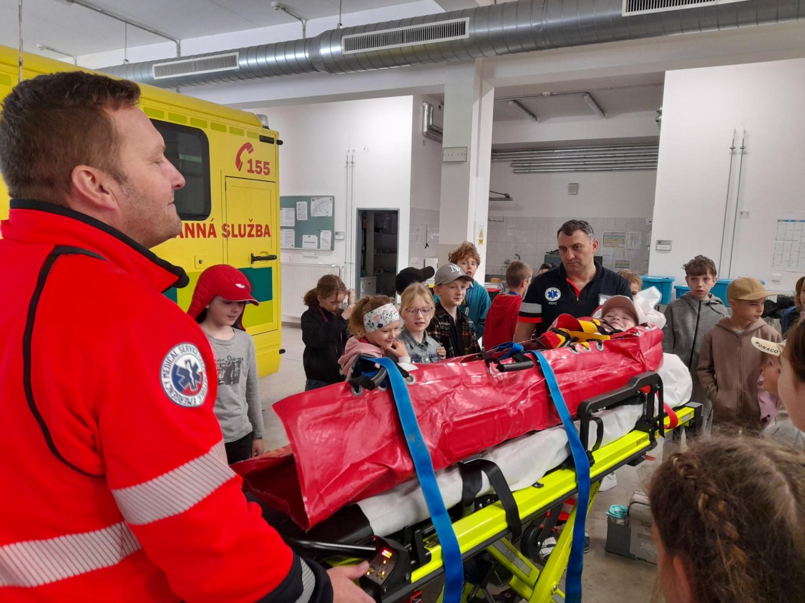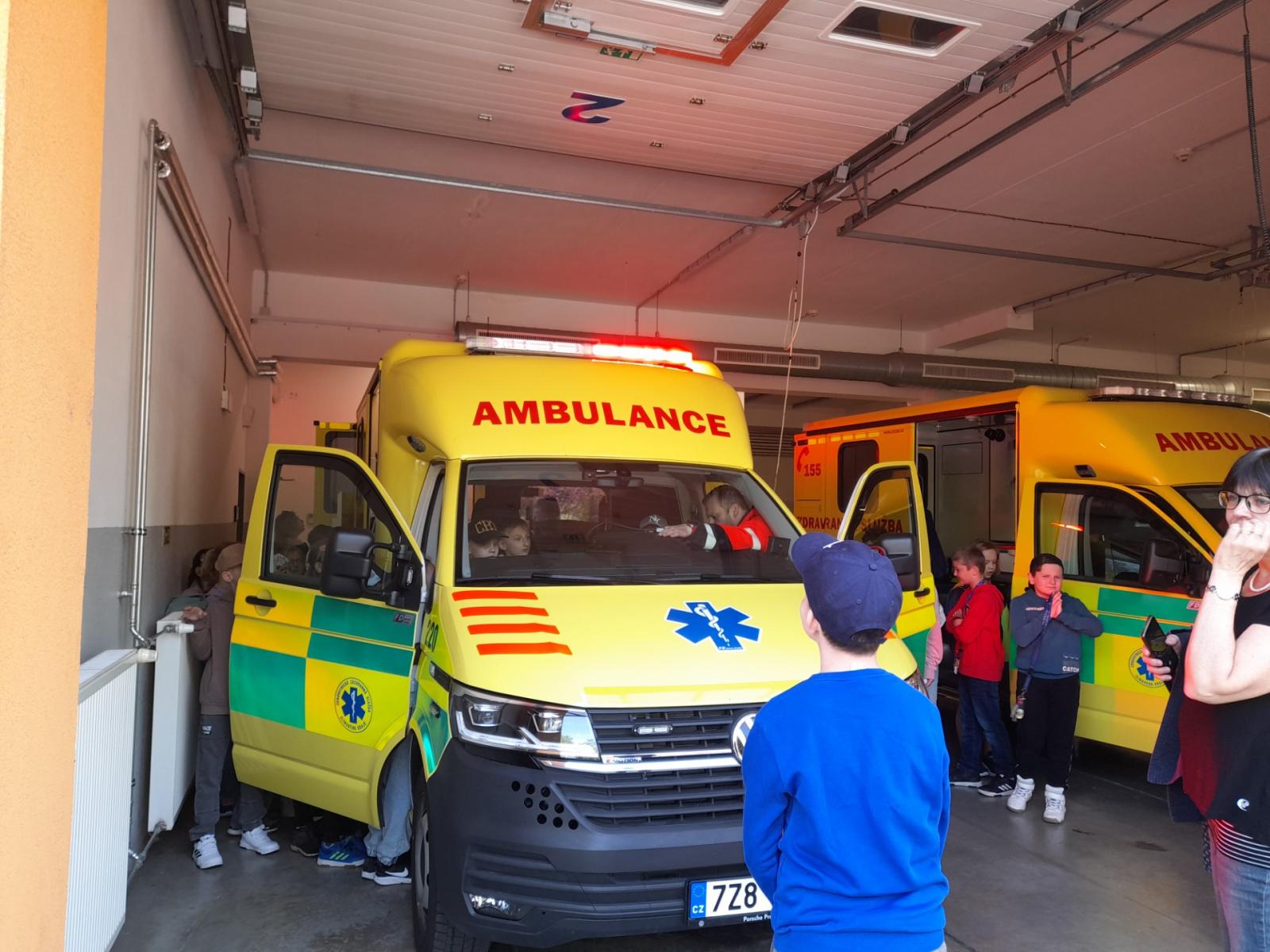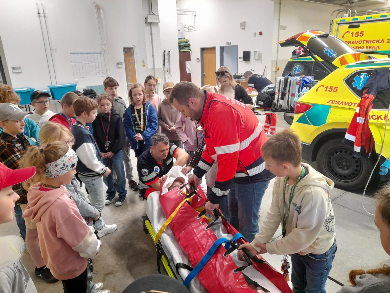 Přivítal nás milý záchranář, pan Jiří Vašica, také absolvent naší školy. Představil nám vybavení a přístroje, které zachraňují lidské životy. Sami jsme si vyzkoušeli roli pacienta, kdy nám měřil puls, EKG či nás transportoval na nosítkách.