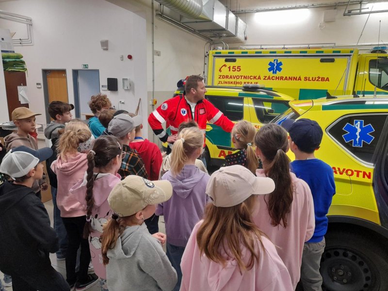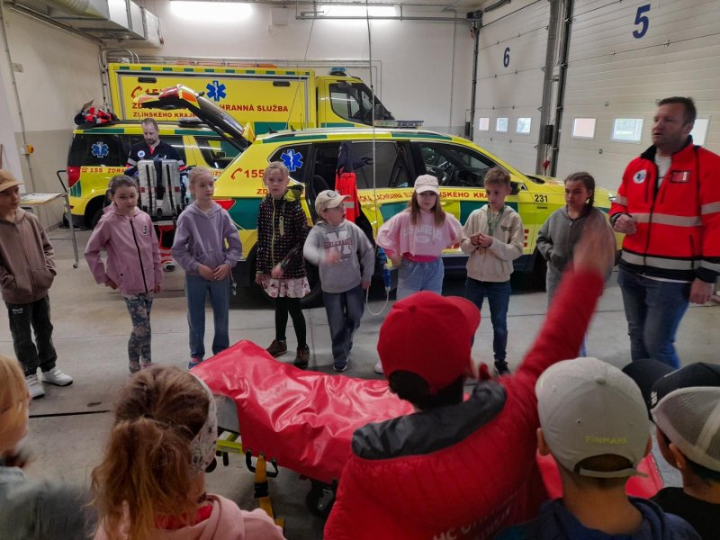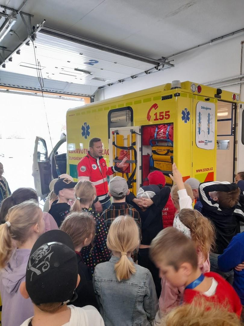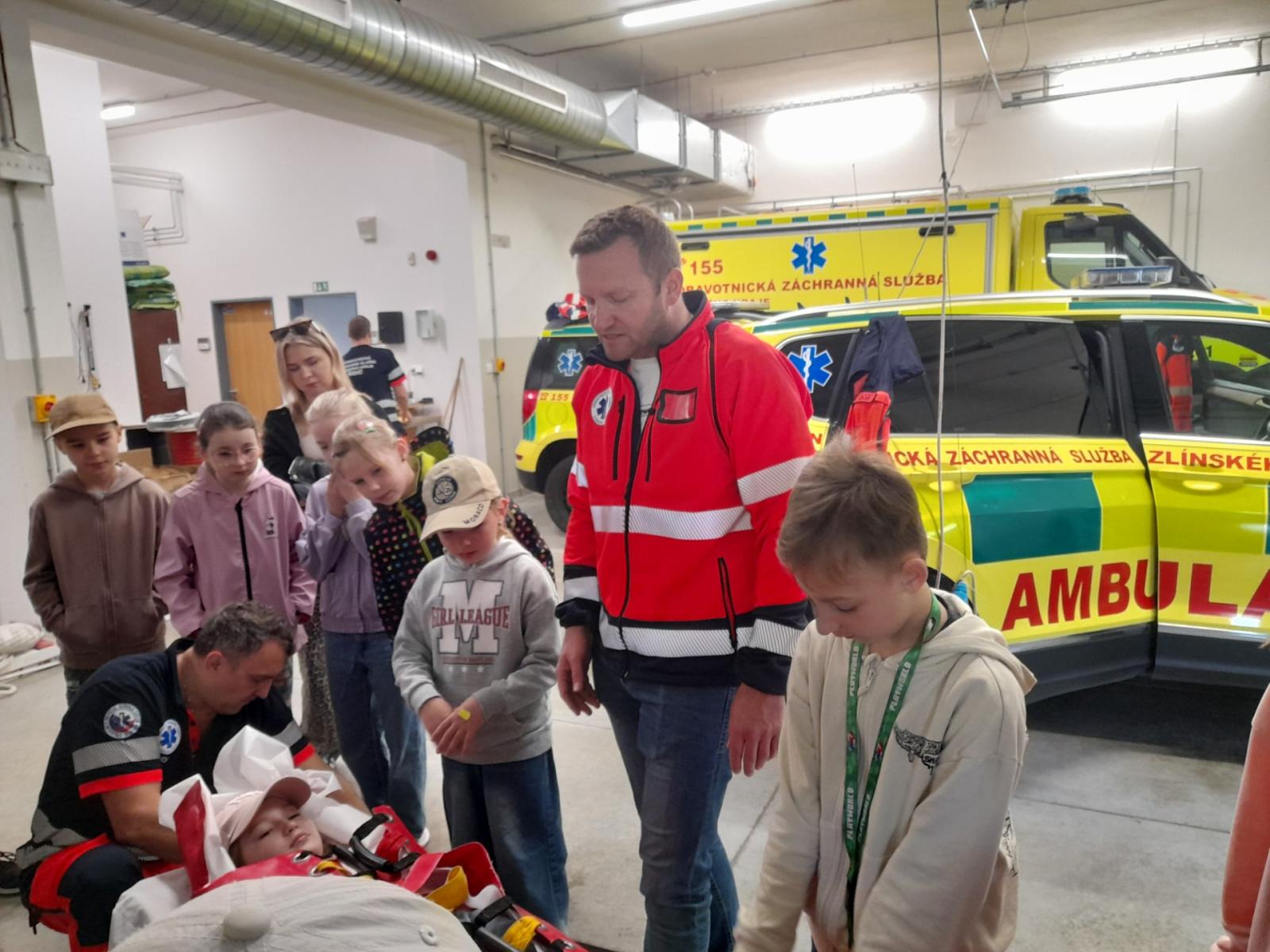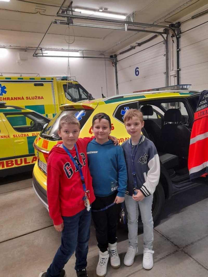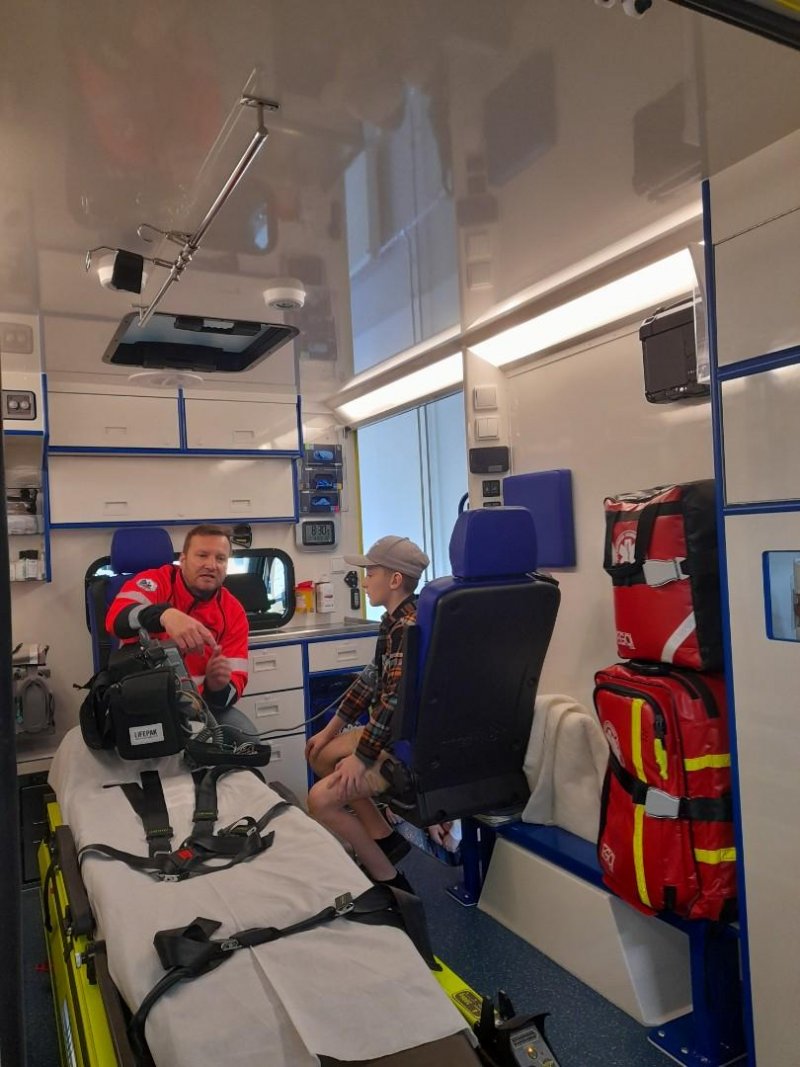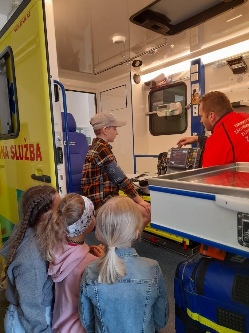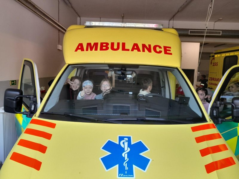 Přivítal nás milý záchranář, pan Jiří Vašica, také absolvent naší školy. Představil nám vybavení a přístroje, které zachraňují lidské životy. Sami jsme si vyzkoušeli roli pacienta, kdy nám měřil puls, EKG či nás transportoval na nosítkách.